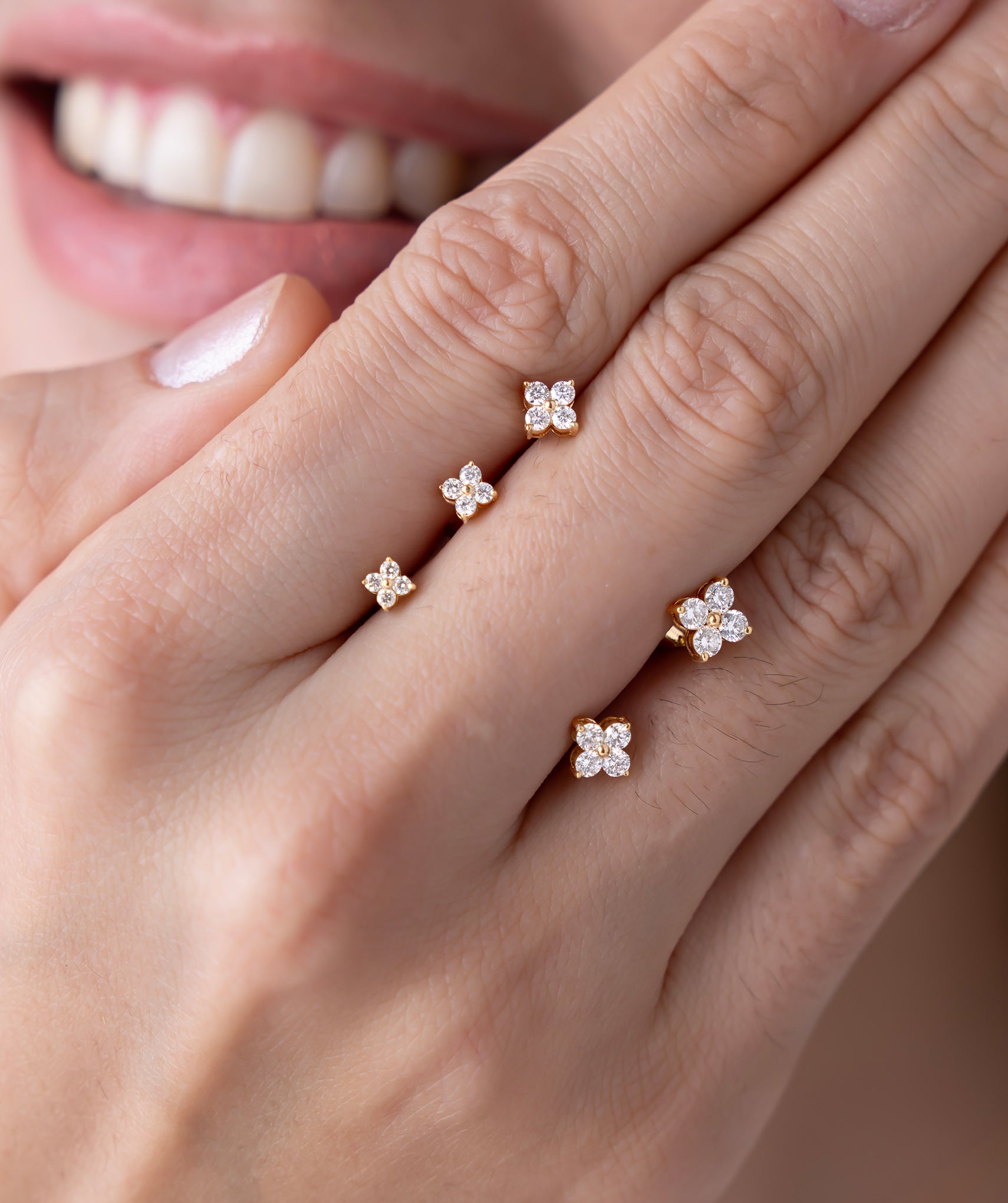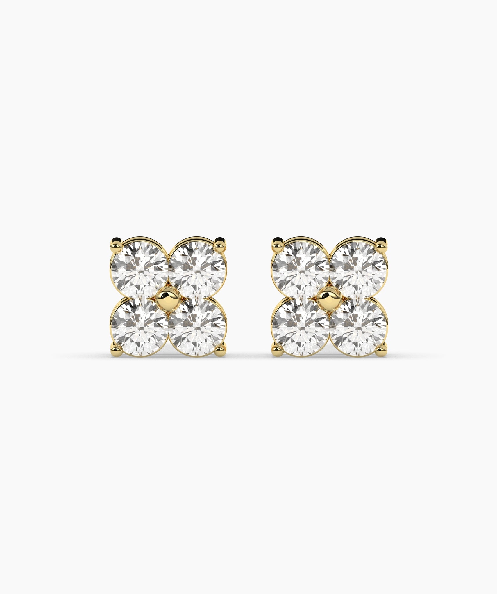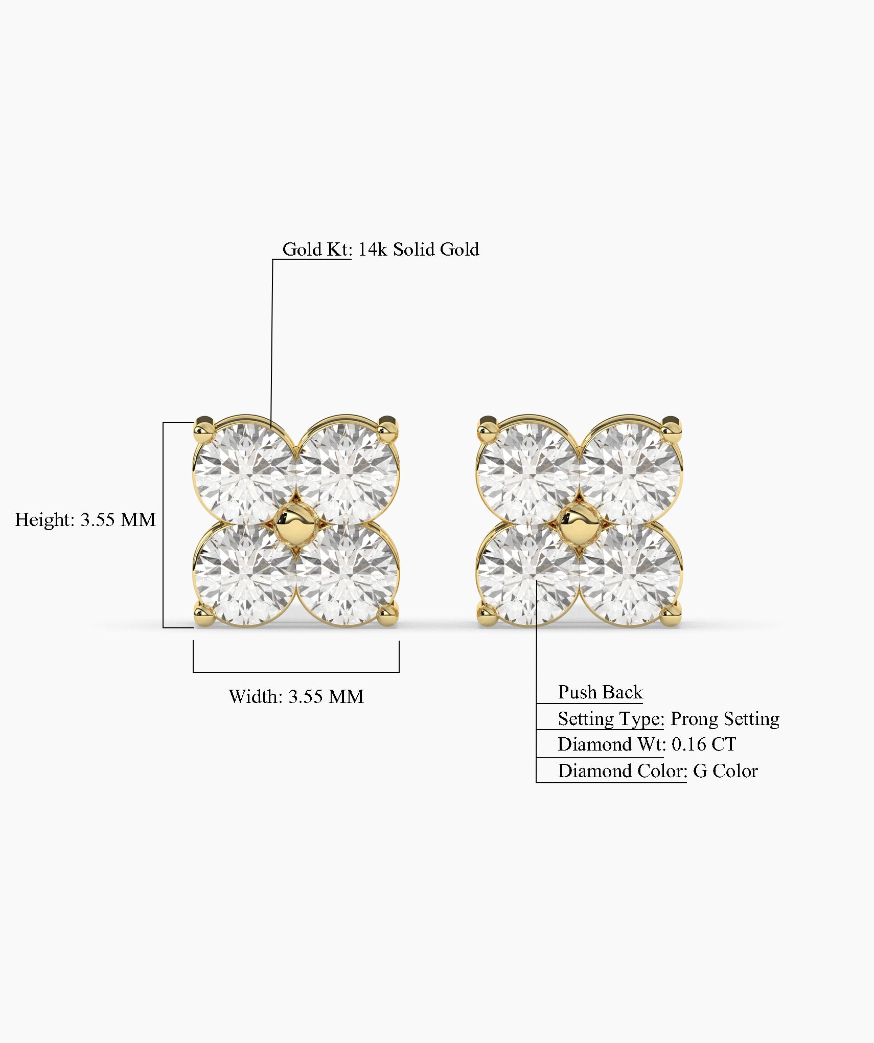 These elegant 14K gold stud earrings feature a dazzling floral cluster design, created with four brilliant round diamonds in each stud. Timeless and radiant, they add a sophisticated sparkle to any look — perfect for daily elegance or special occasions.