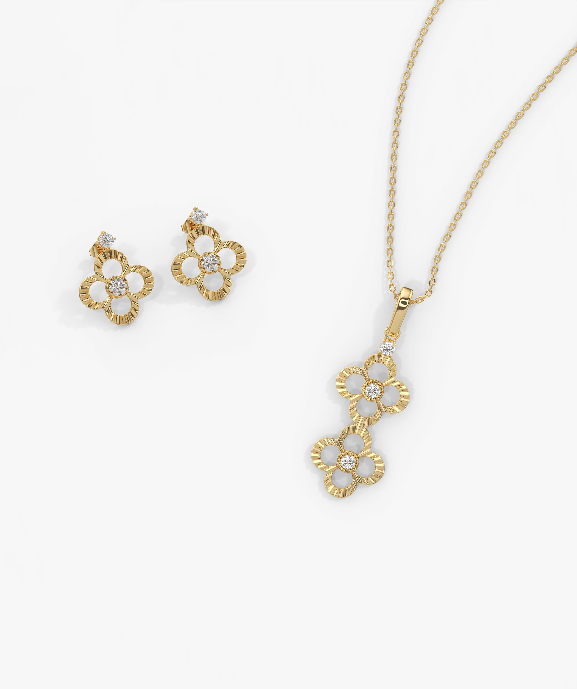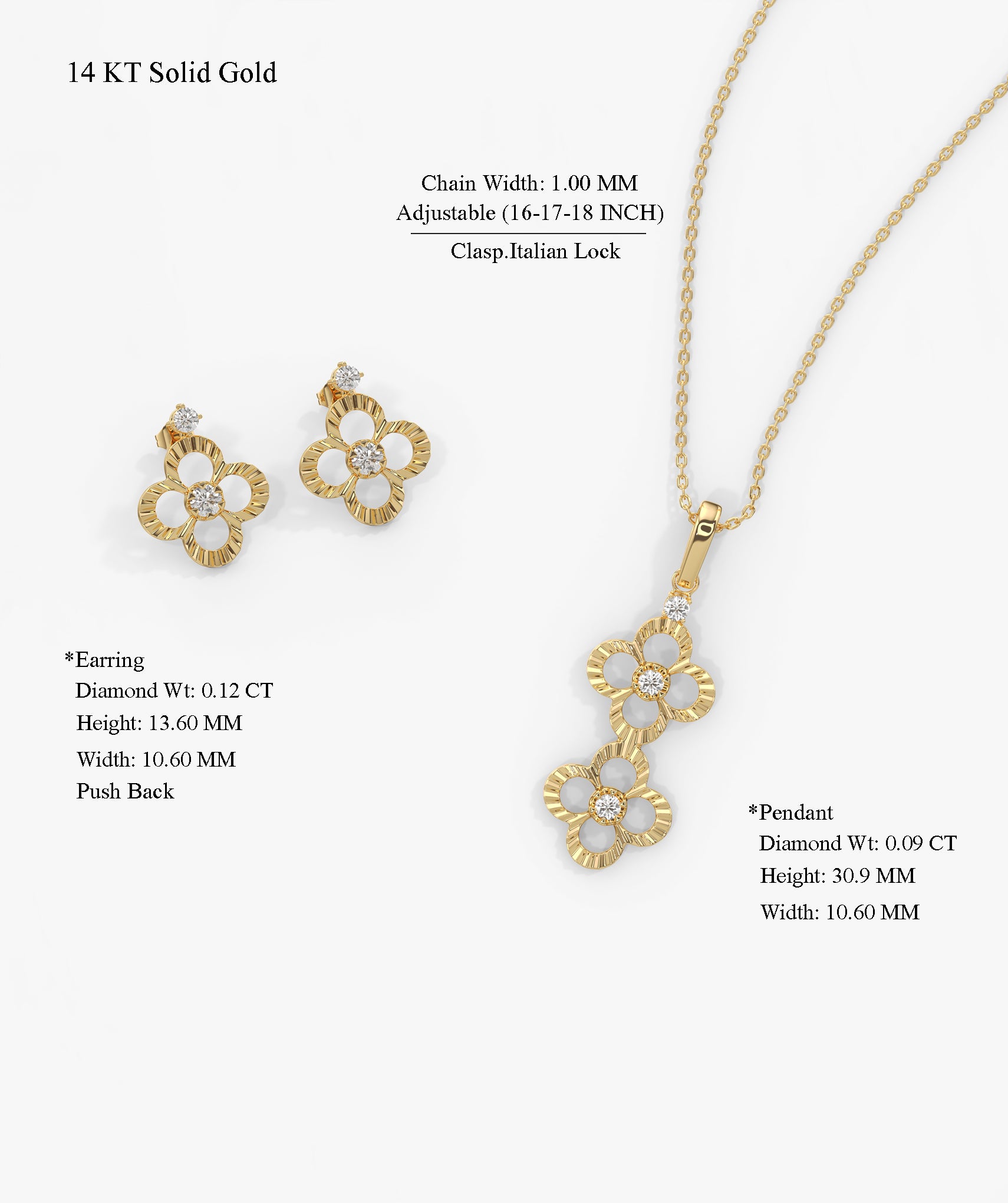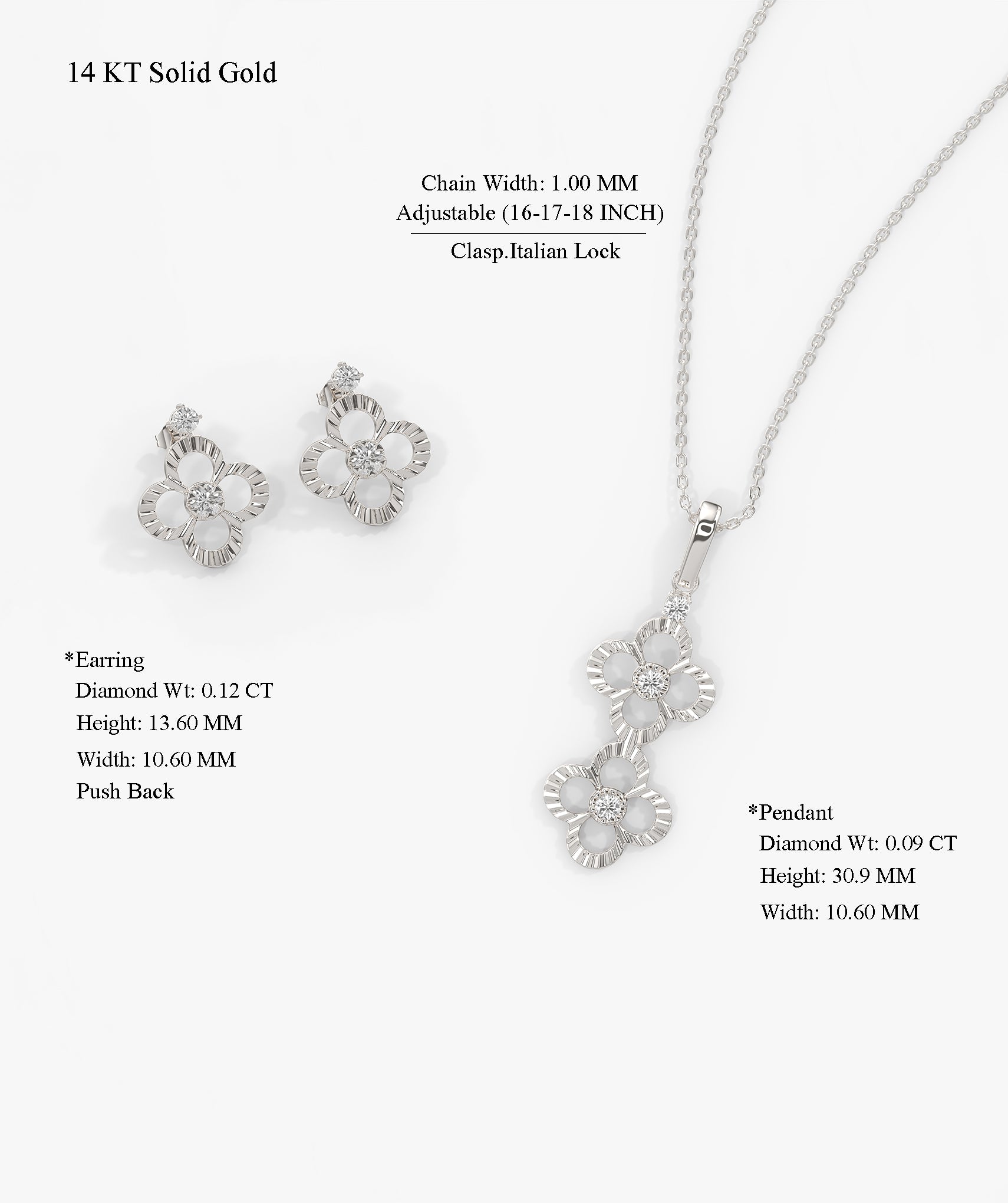 This solid 14K gold jewelry set features a delicate floral motif adorned with natural round diamonds. The set includes a long floral pendant necklace with adjustable 16–18” chain and matching stud earrings, making it perfect for everyday elegance, weddings, anniversaries, or bridesmaid gifts.