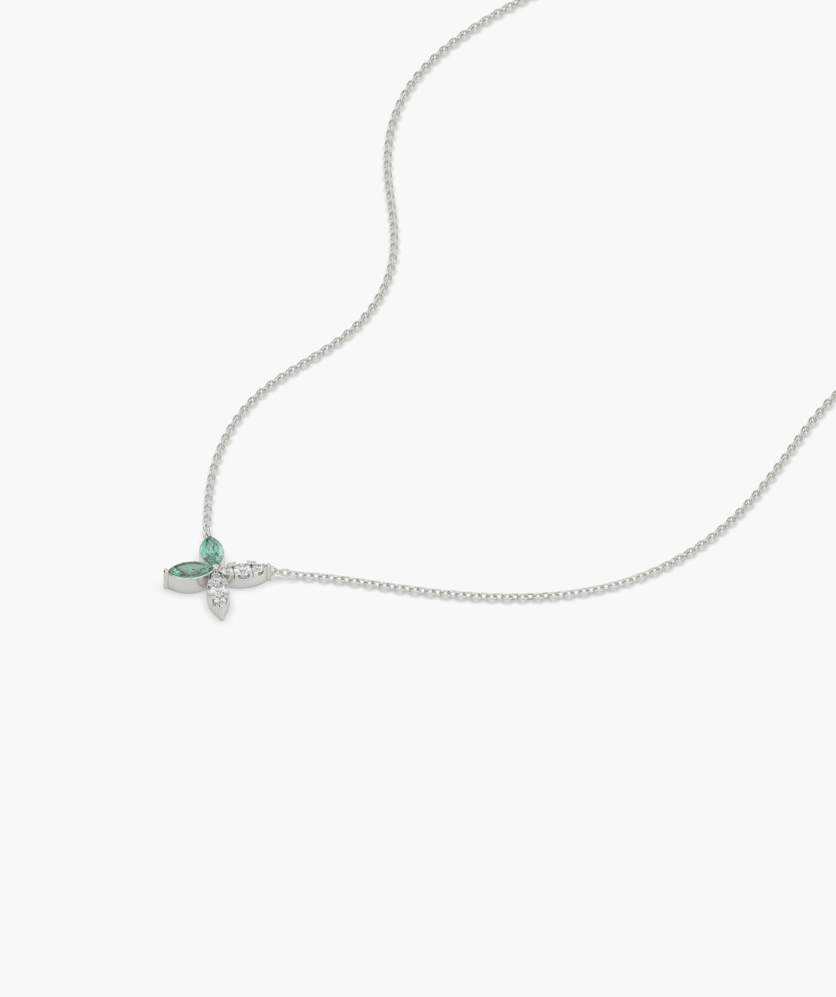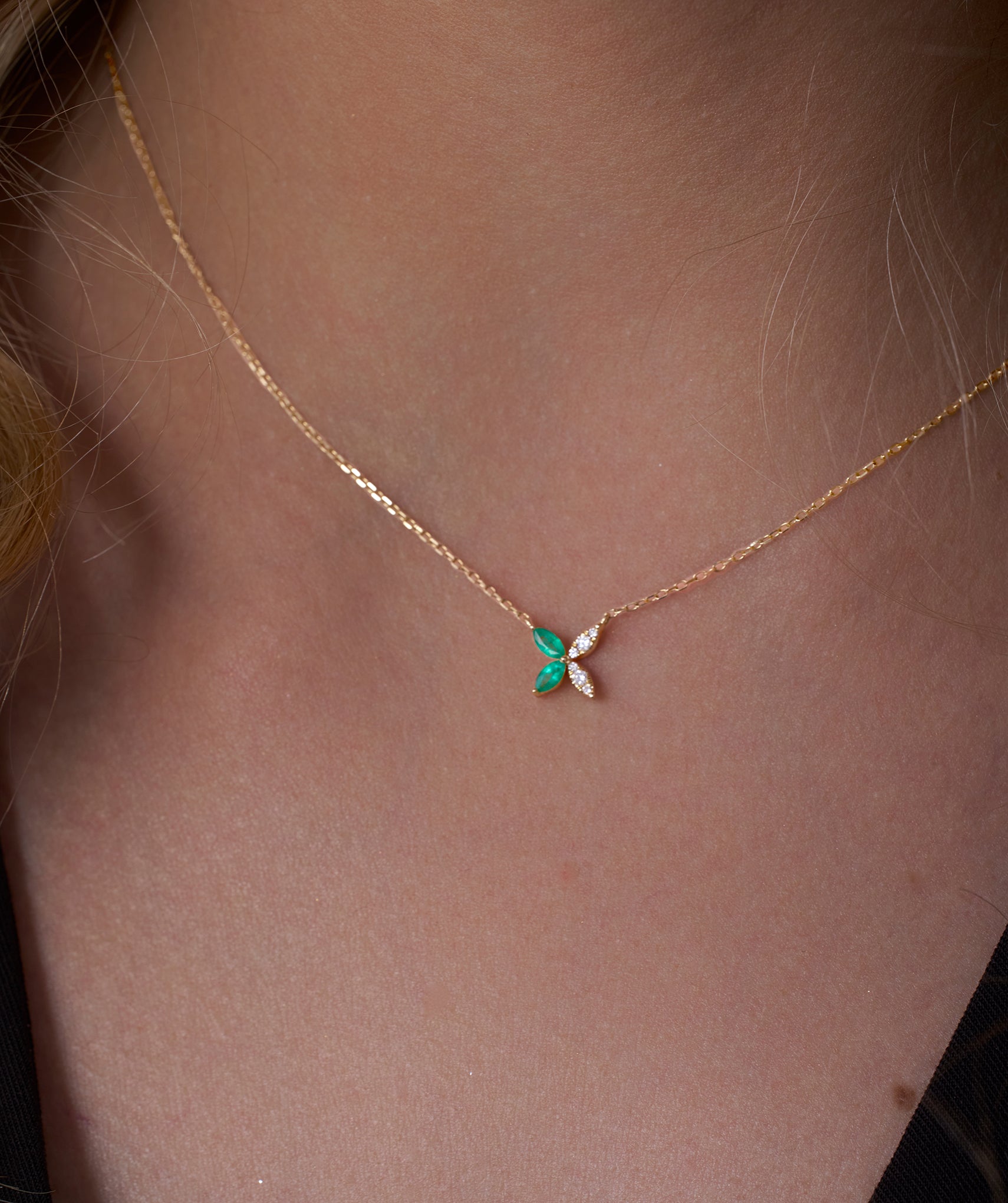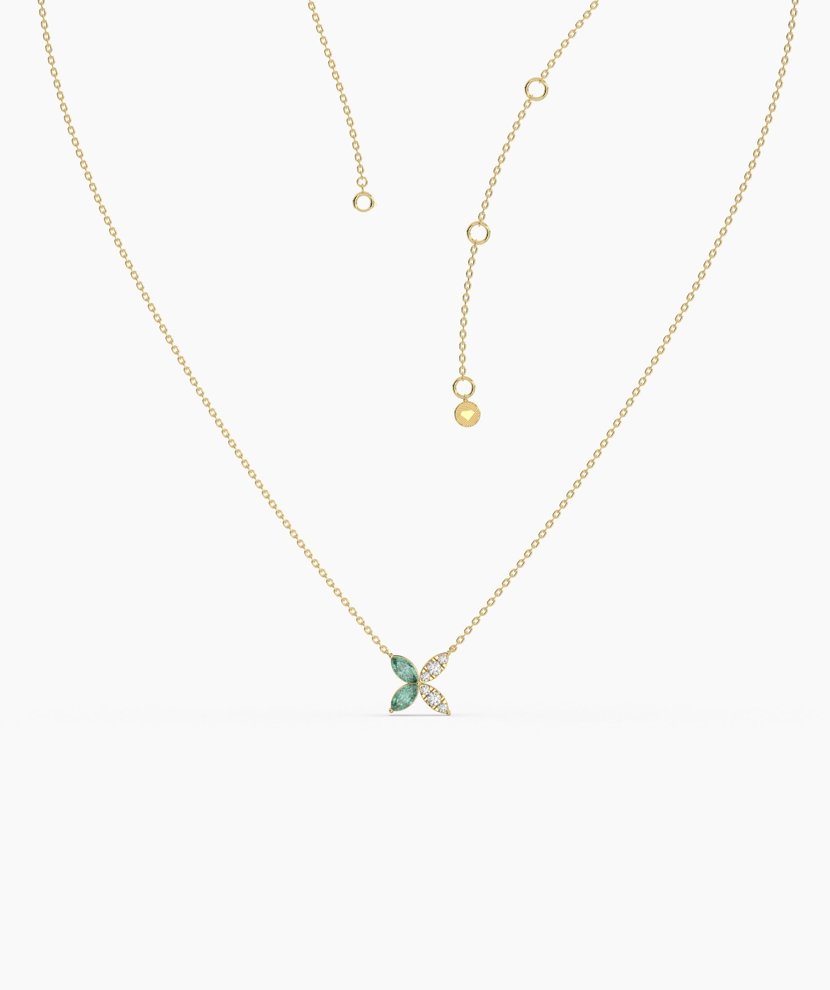 A delicate 14K solid gold necklace featuring a floral-inspired pendant adorned with marquise-cut diamonds and sparkling round diamonds.