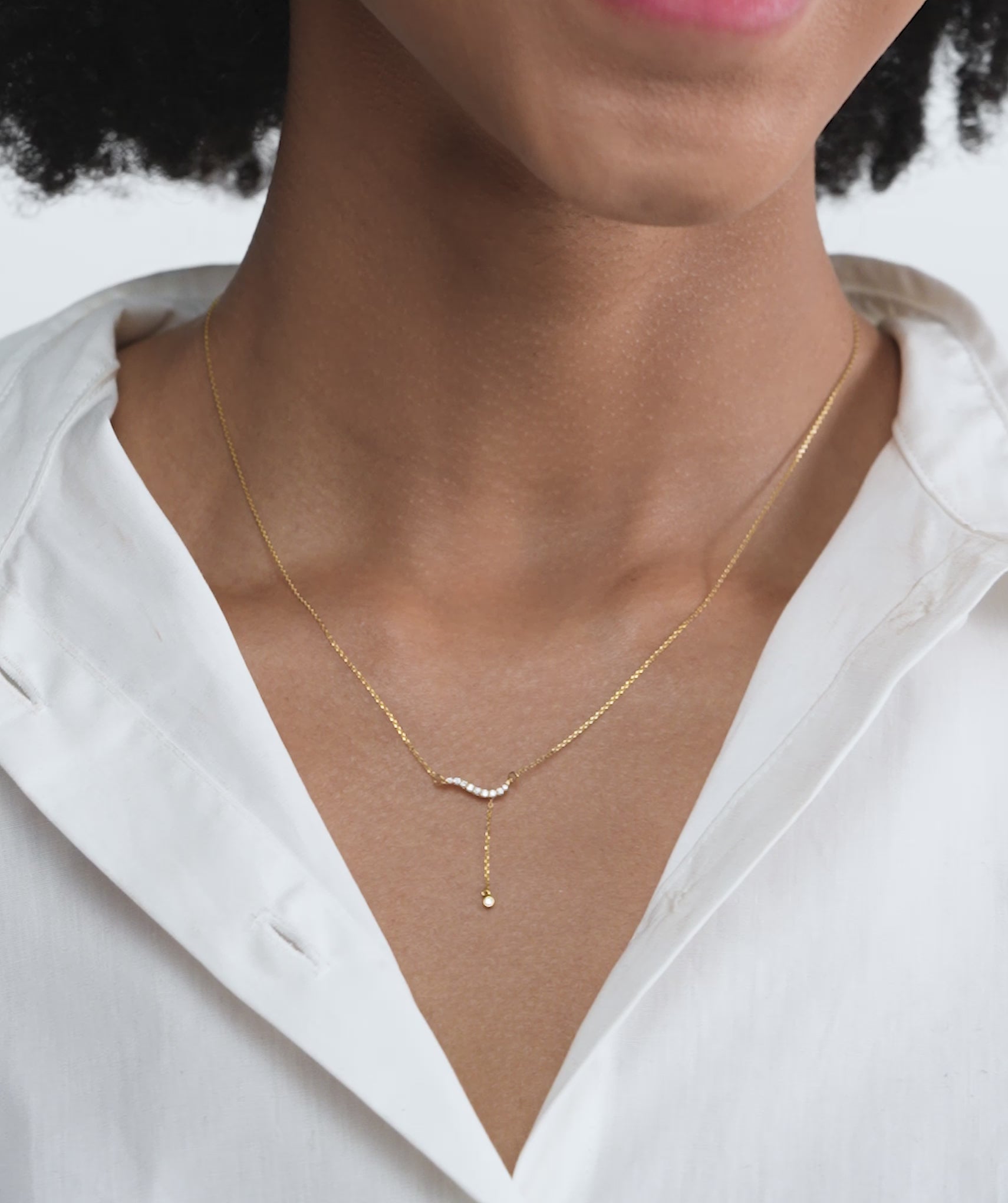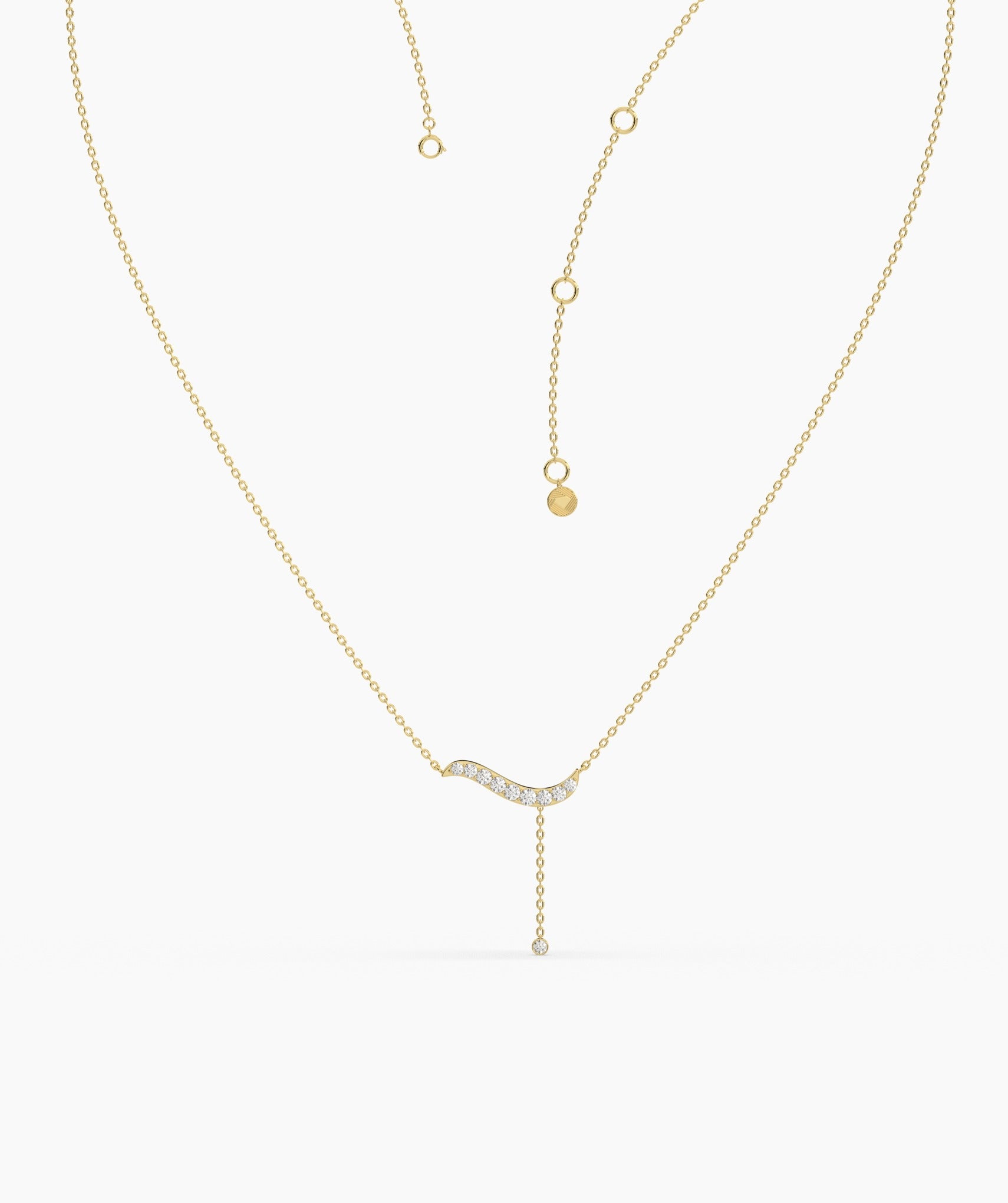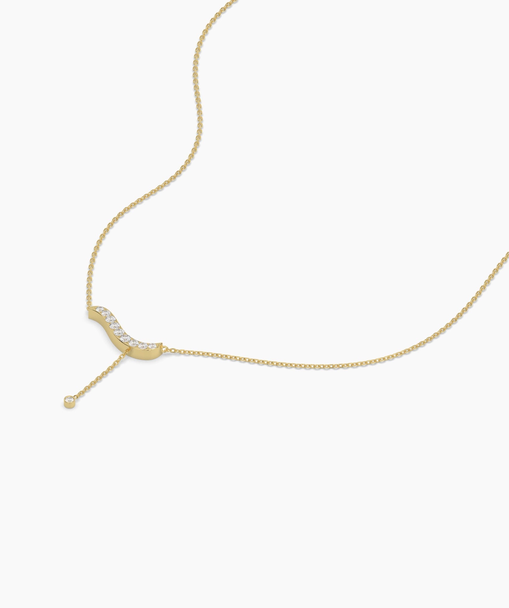 Inspired by the beauty of flowing waves, this gold necklace features sparkling diamonds and a dangling accent.