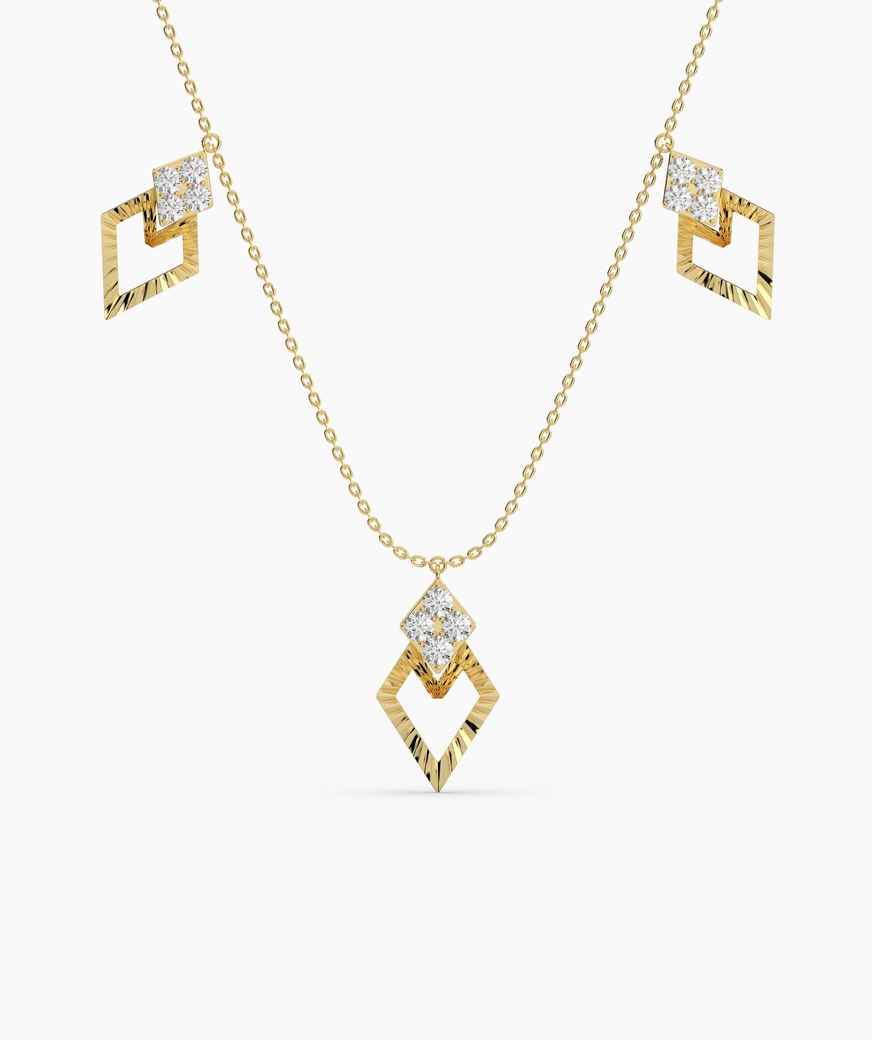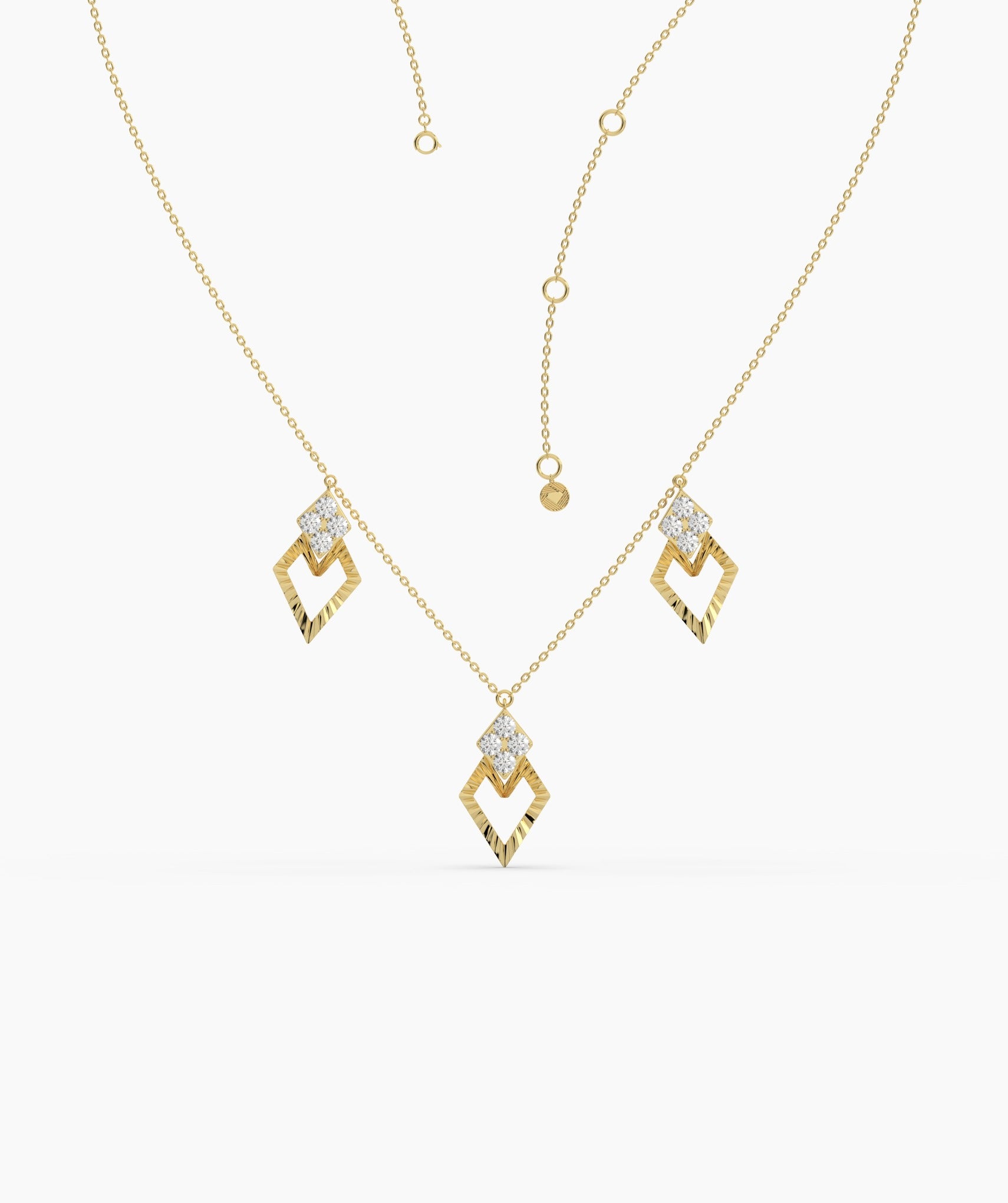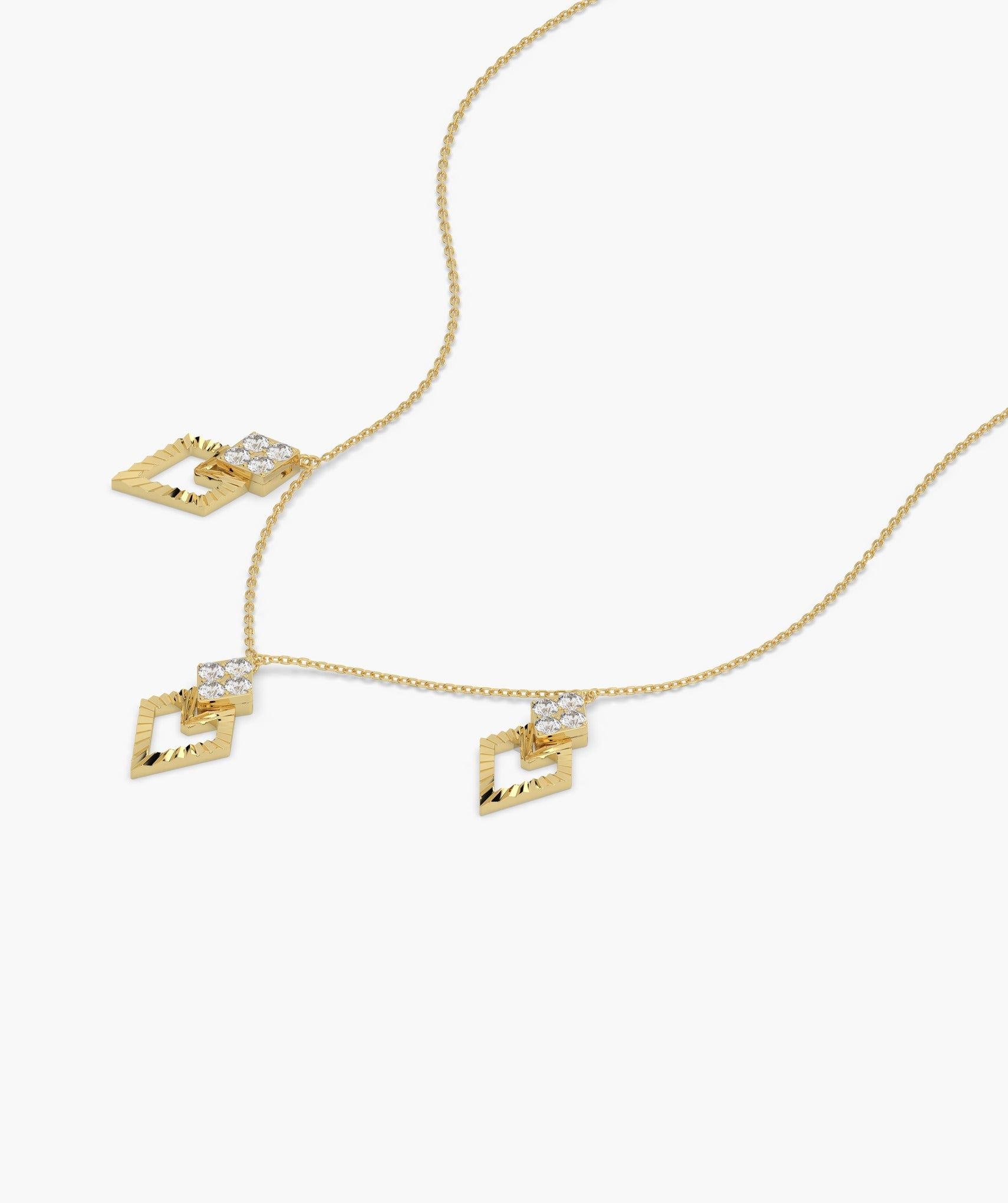 This 14K solid gold necklace features a trio of intricate geometric charms, each adorned with sparkling diamonds.