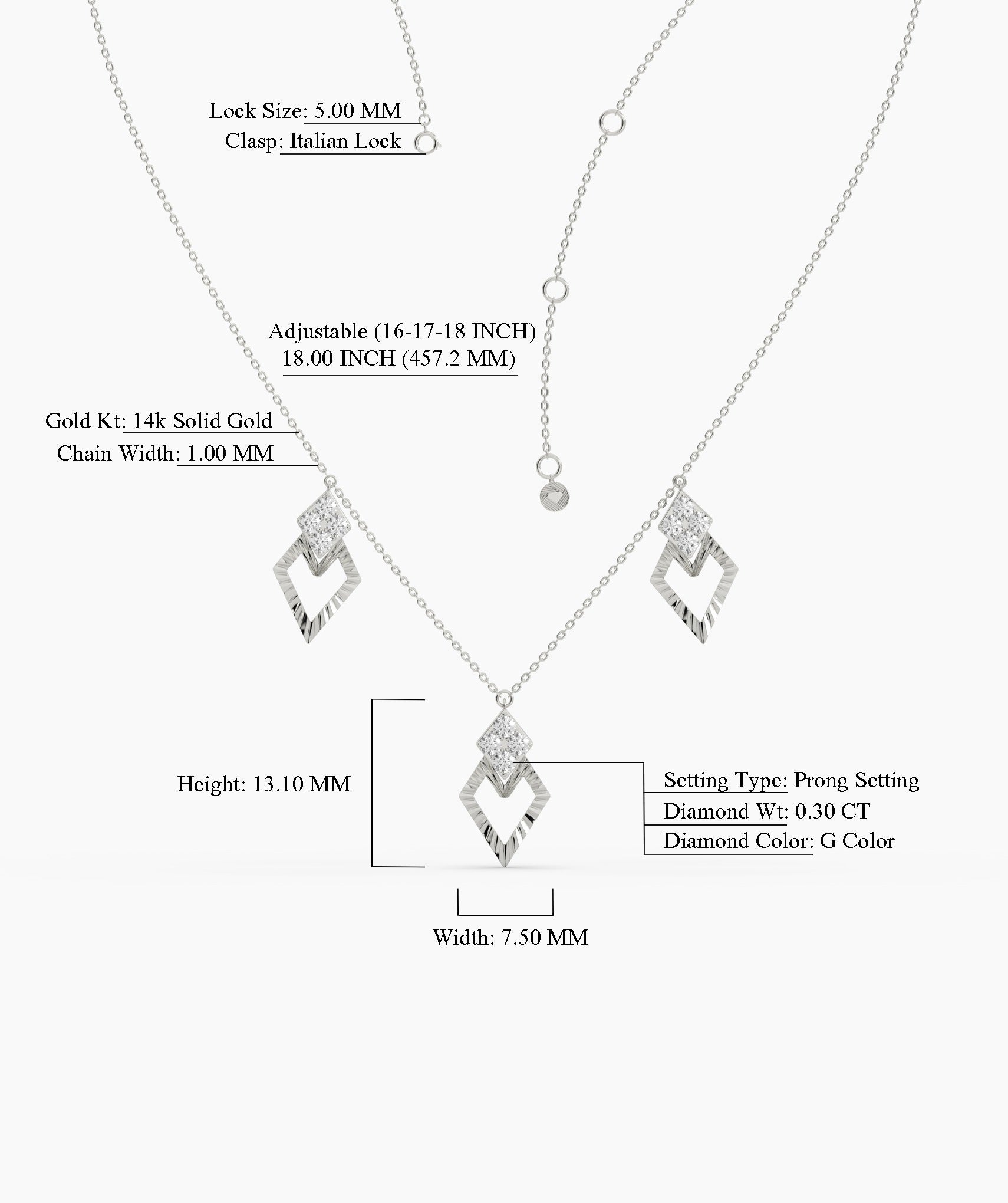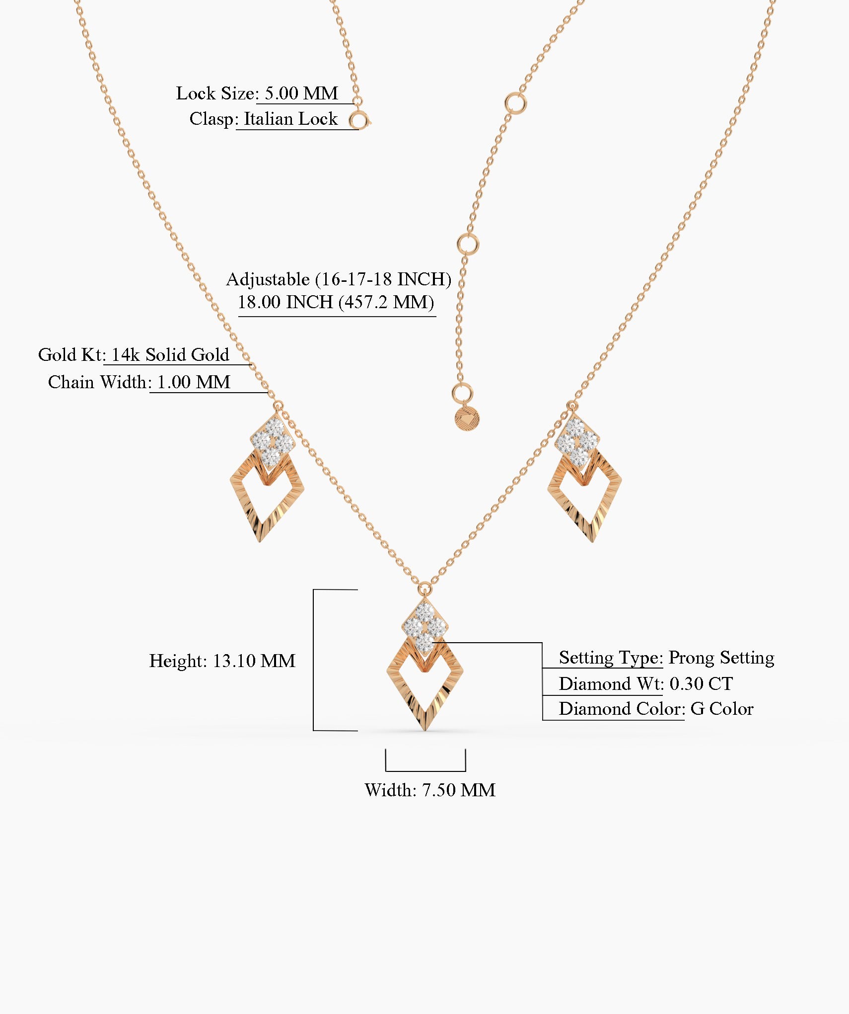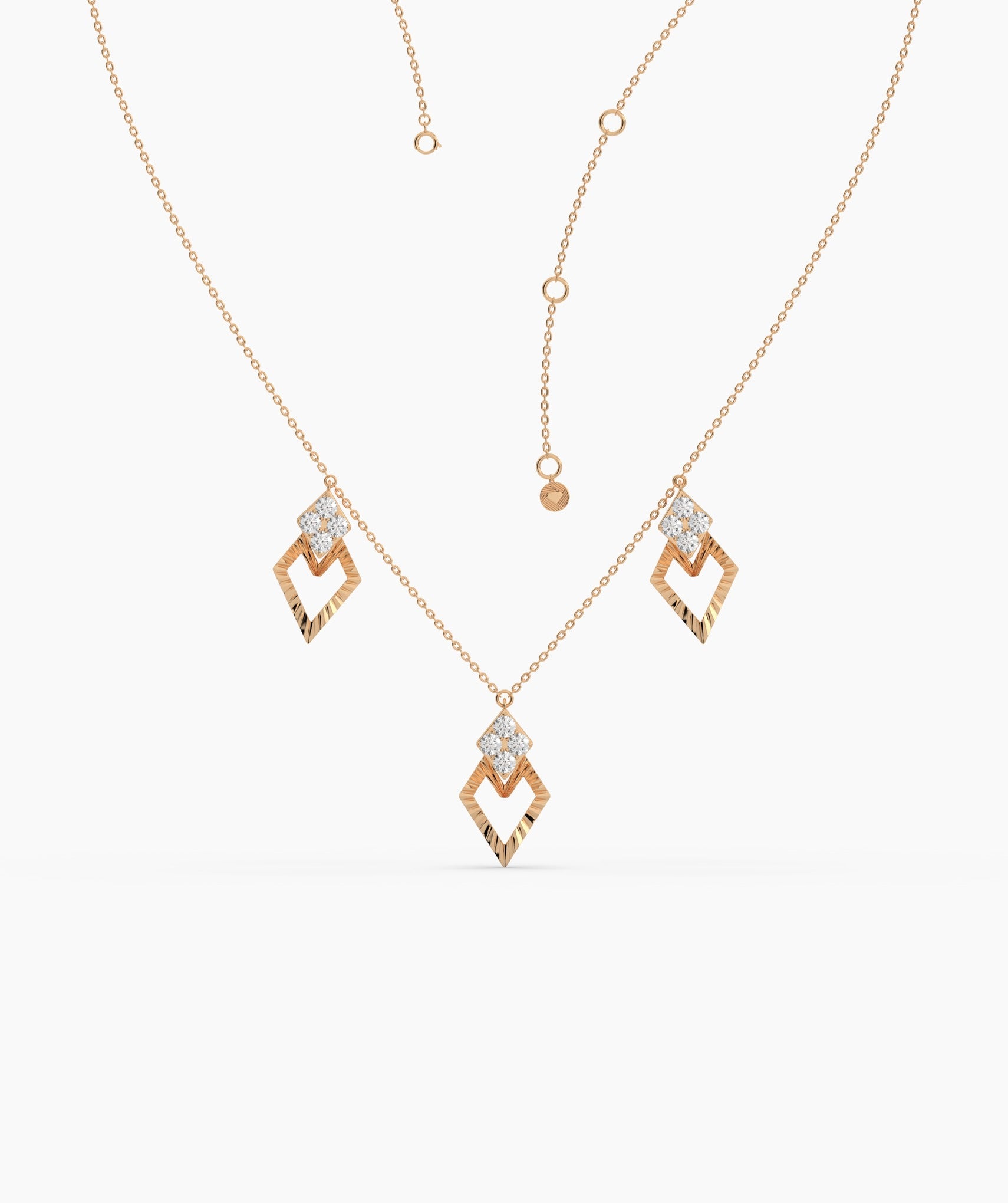 This 14K solid gold necklace features a trio of intricate geometric charms, each adorned with sparkling diamonds.
