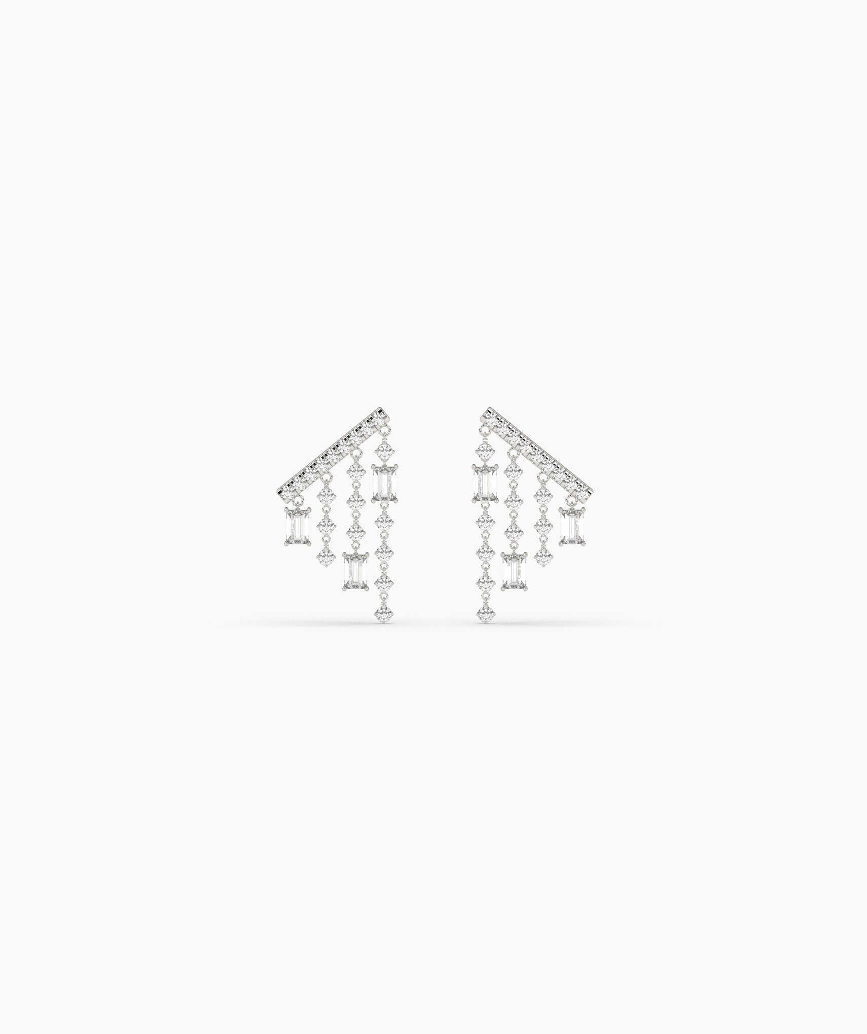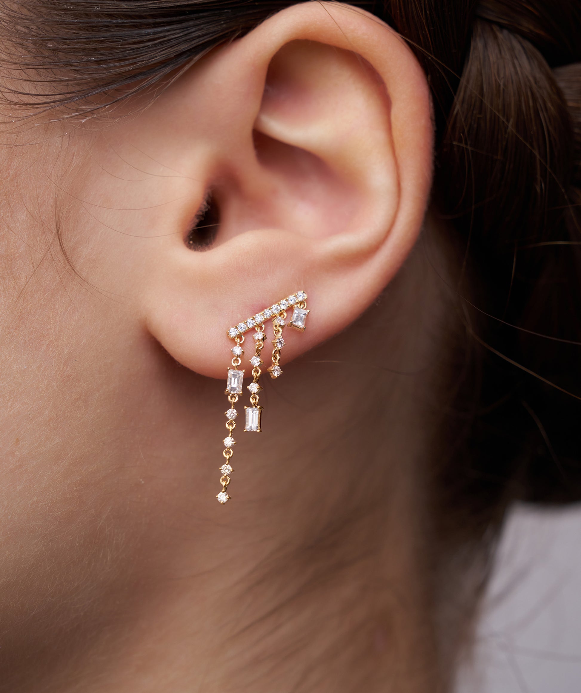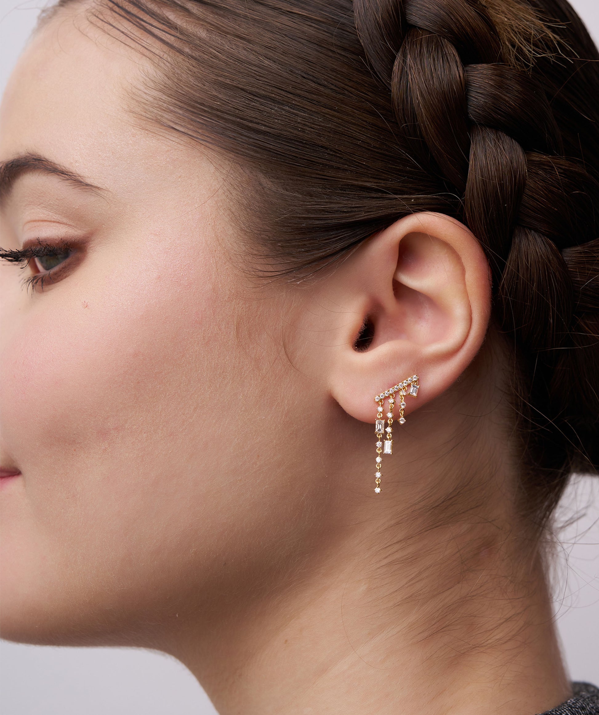 A stunning blend of sophistication and sparkle, these climber earrings drape beautifully with shimmering diamond strands.