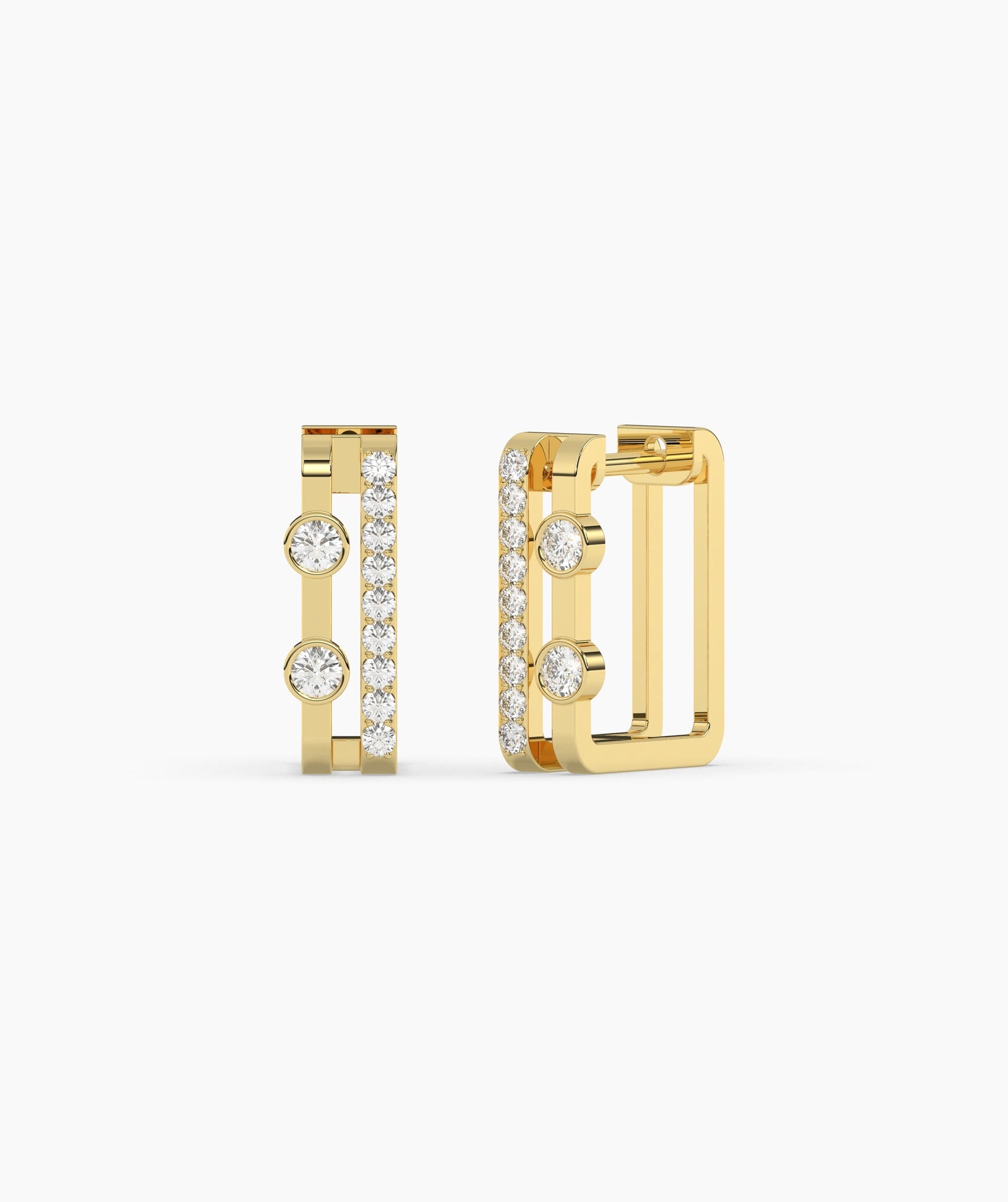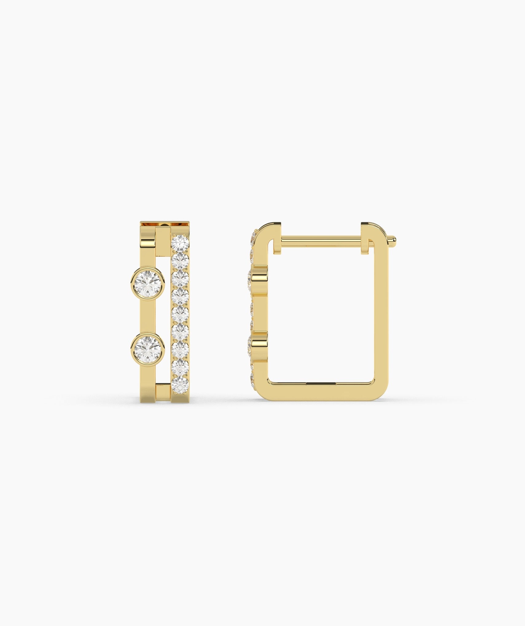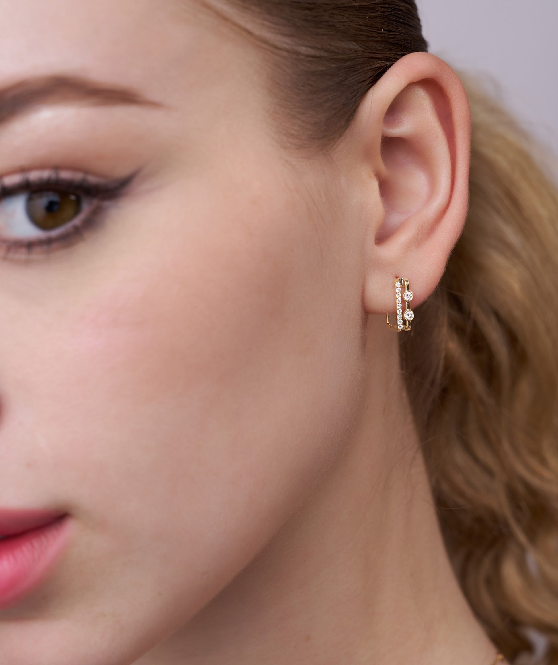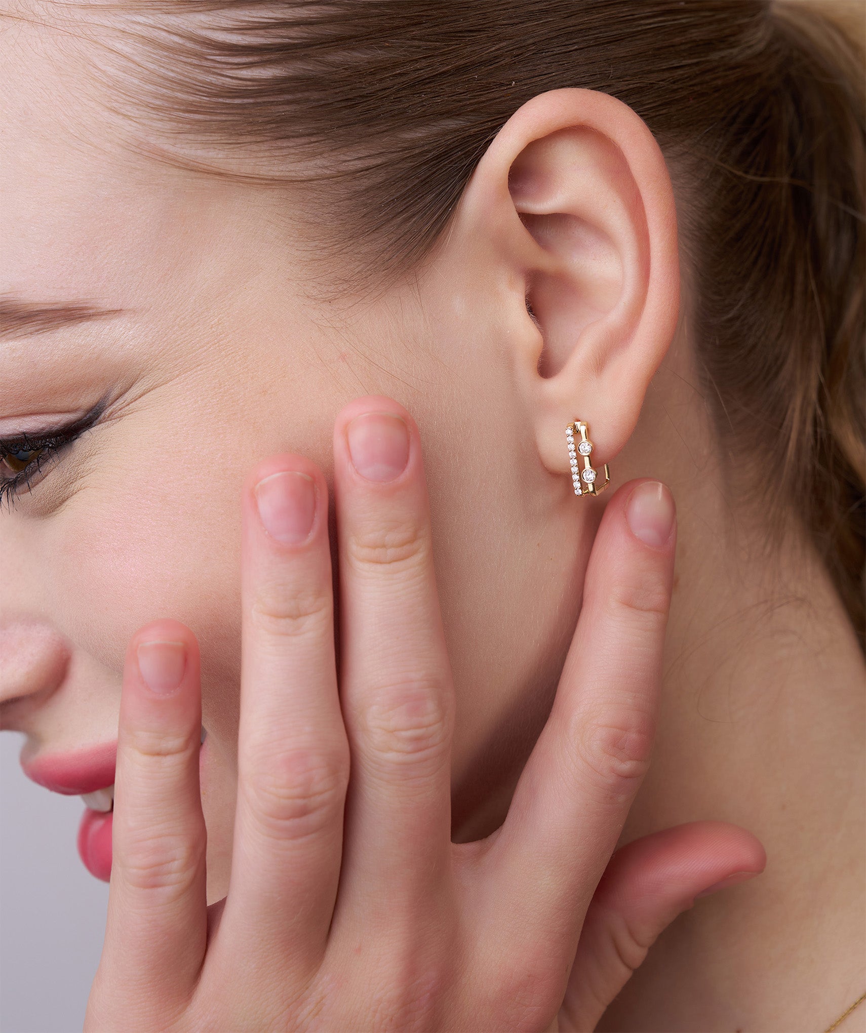 Designed for the modern jewelry lover, these gold & diamond huggie hoops combine a structured shape with brilliant diamonds, perfect for everyday elegance.