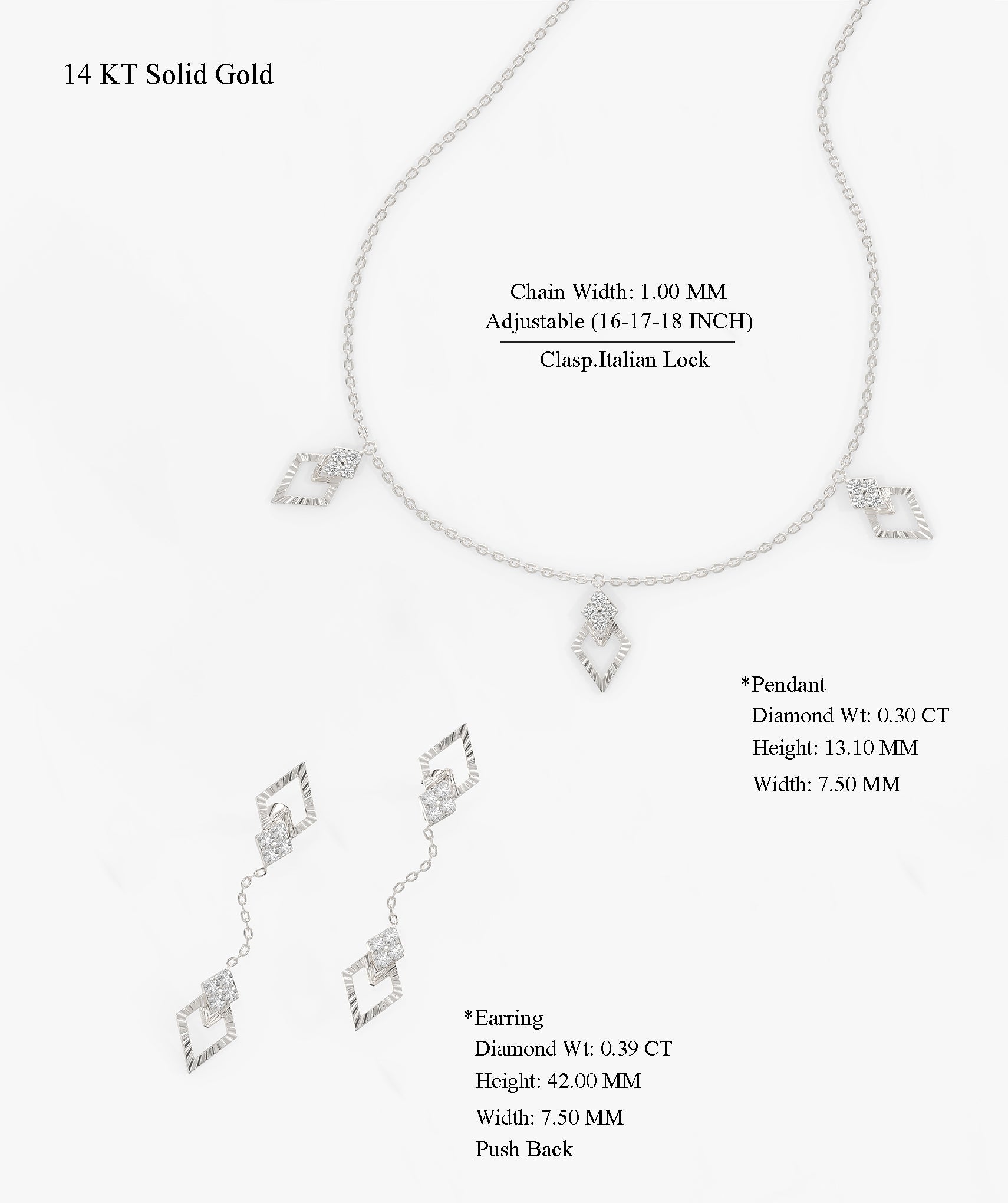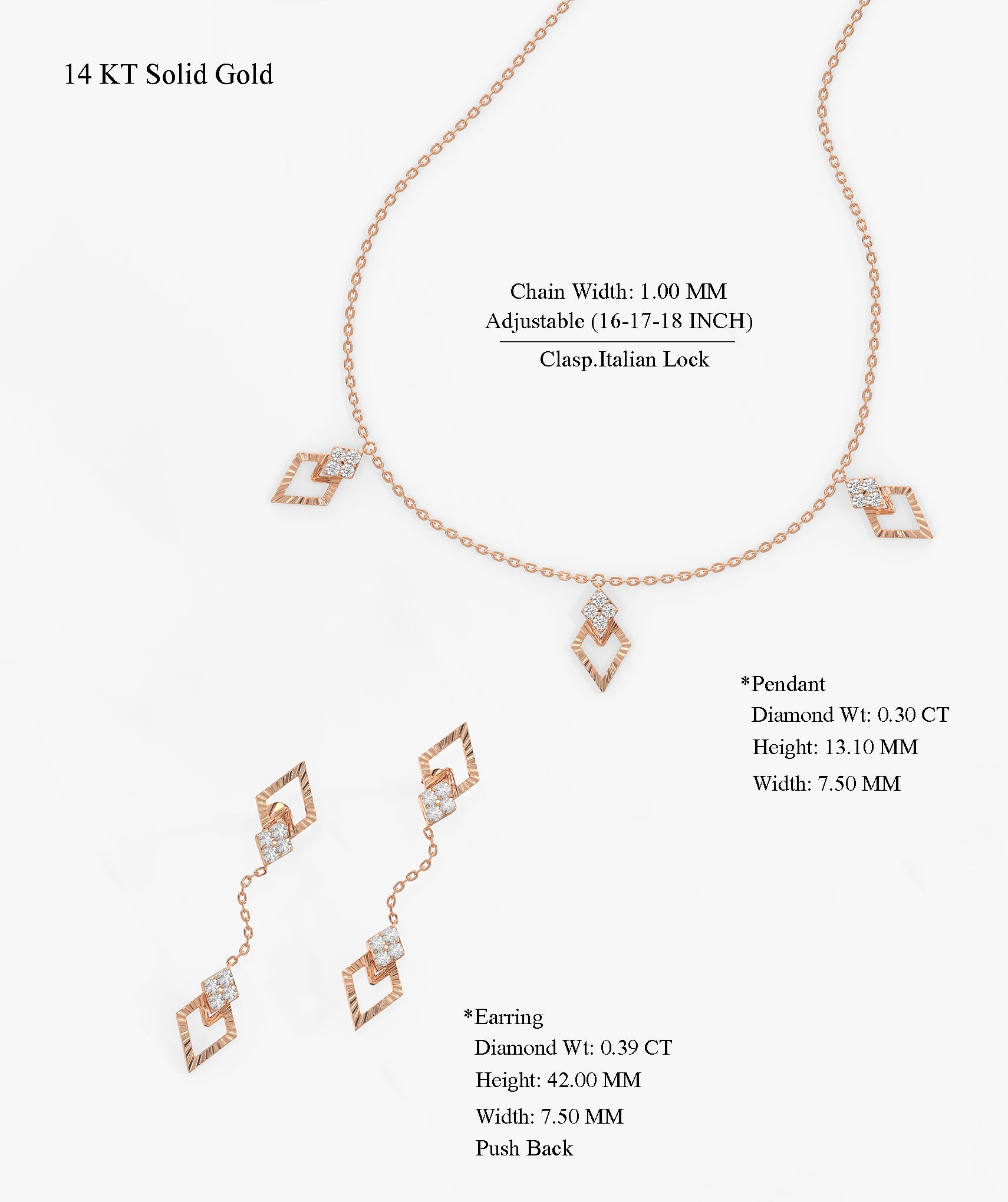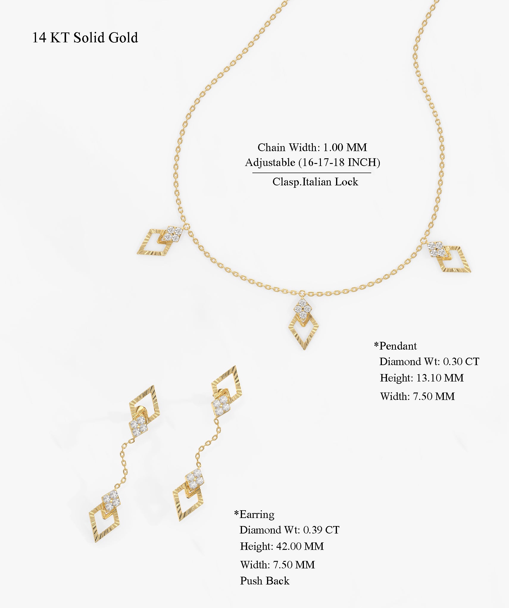 This 14K solid gold jewelry set features a sleek geometric motif, blending modern design with timeless sparkle. Adorned with natural round diamonds, the set includes a minimalist charm necklace with an adjustable 16–18” chain and coordinating drop earrings. Perfect for everyday luxury, birthdays, or bridesmaid gifts.
