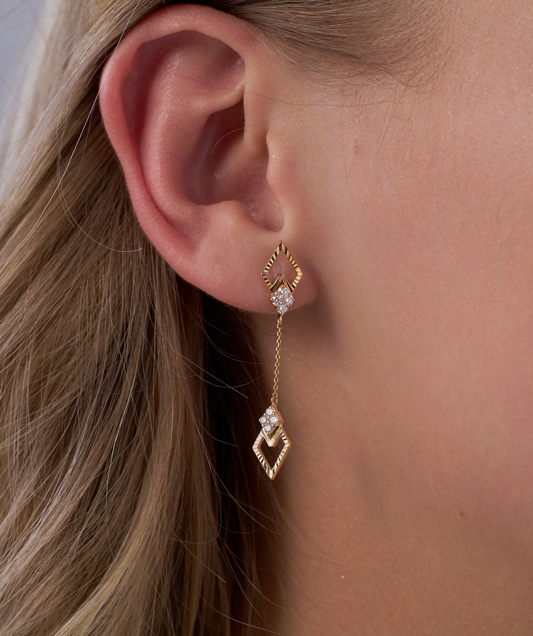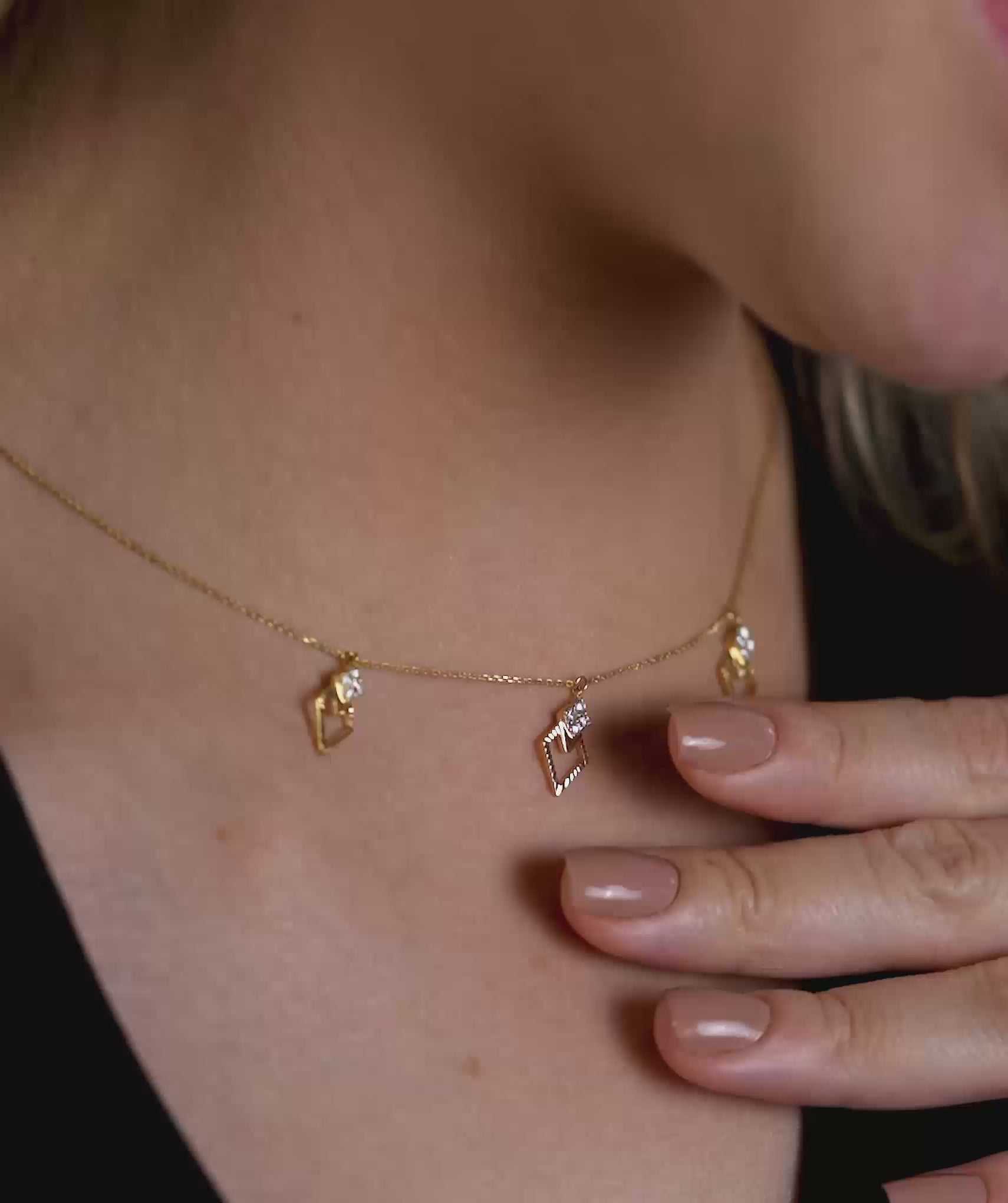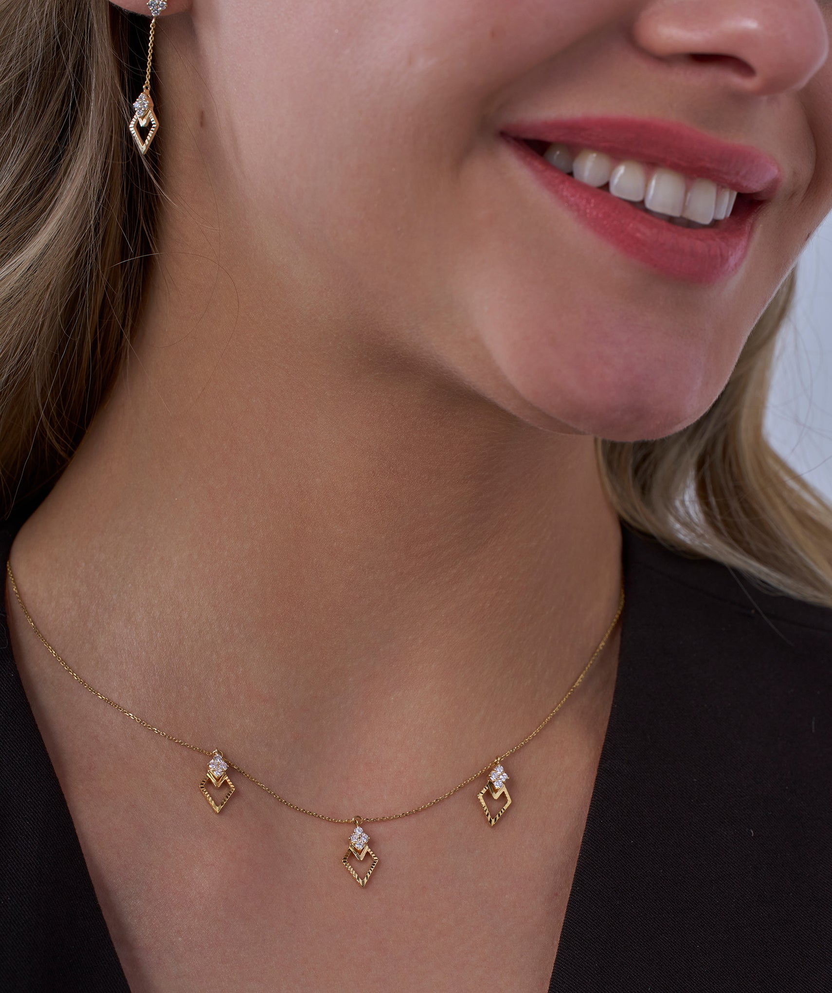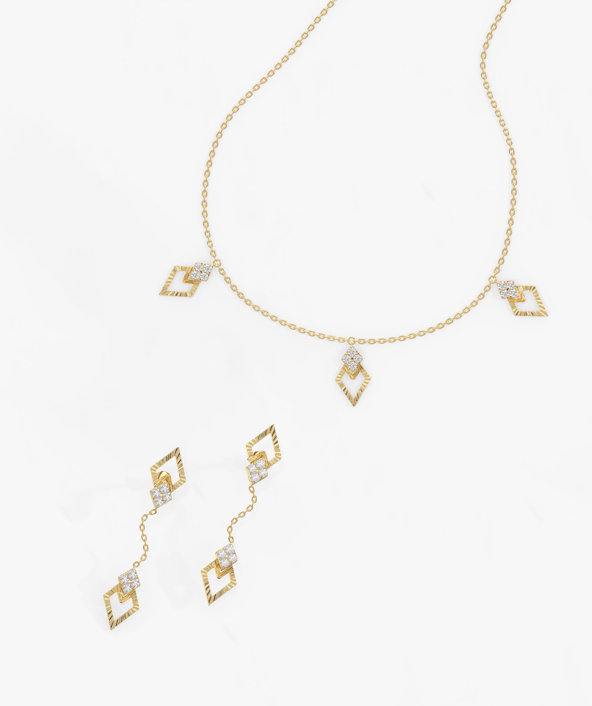 This 14K solid gold jewelry set features a sleek geometric motif, blending modern design with timeless sparkle. Adorned with natural round diamonds, the set includes a minimalist charm necklace with an adjustable 16–18” chain and coordinating drop earrings. Perfect for everyday luxury, birthdays, or bridesmaid gifts.