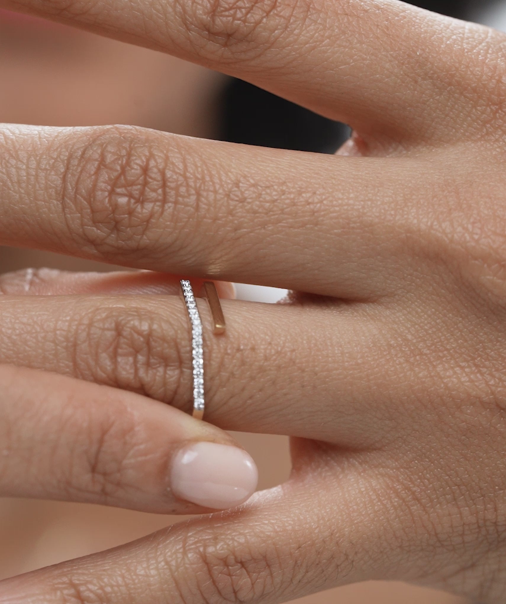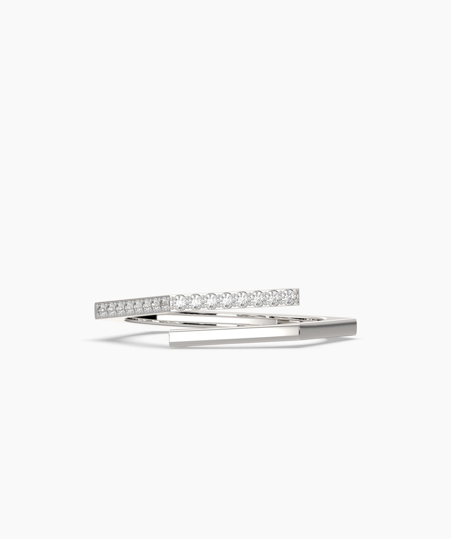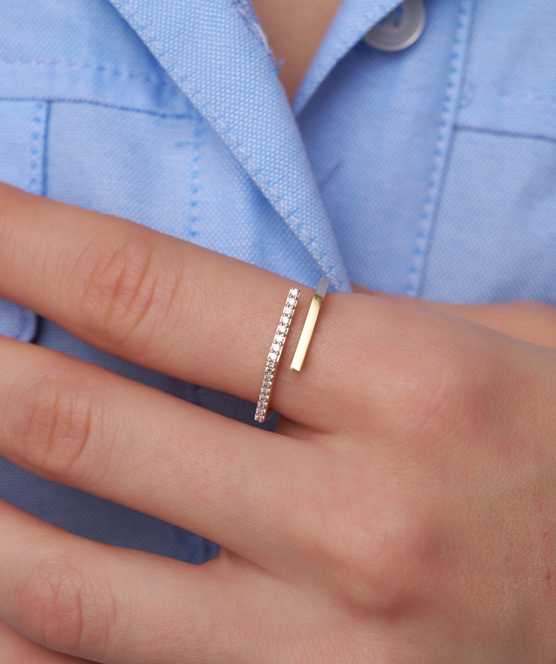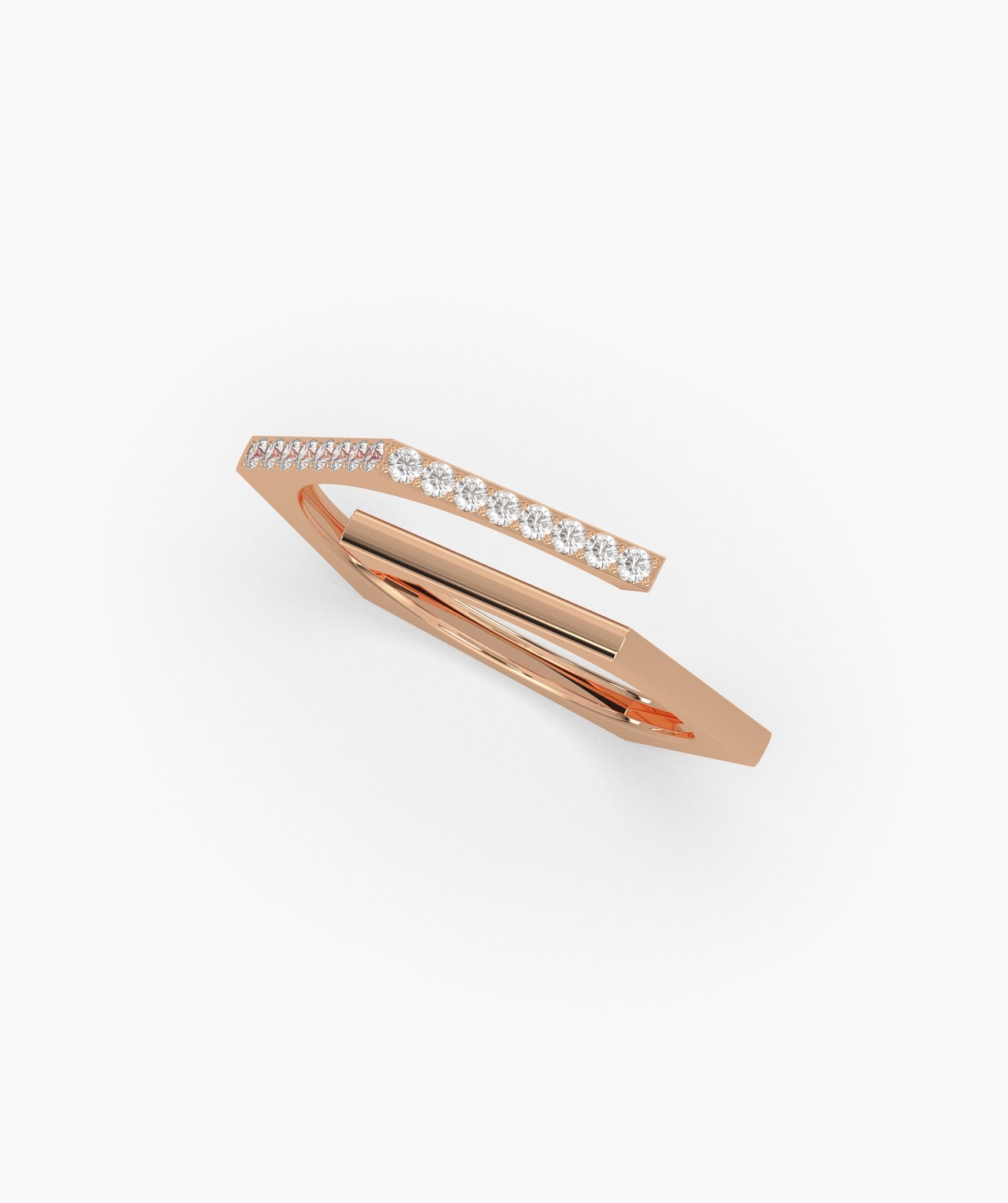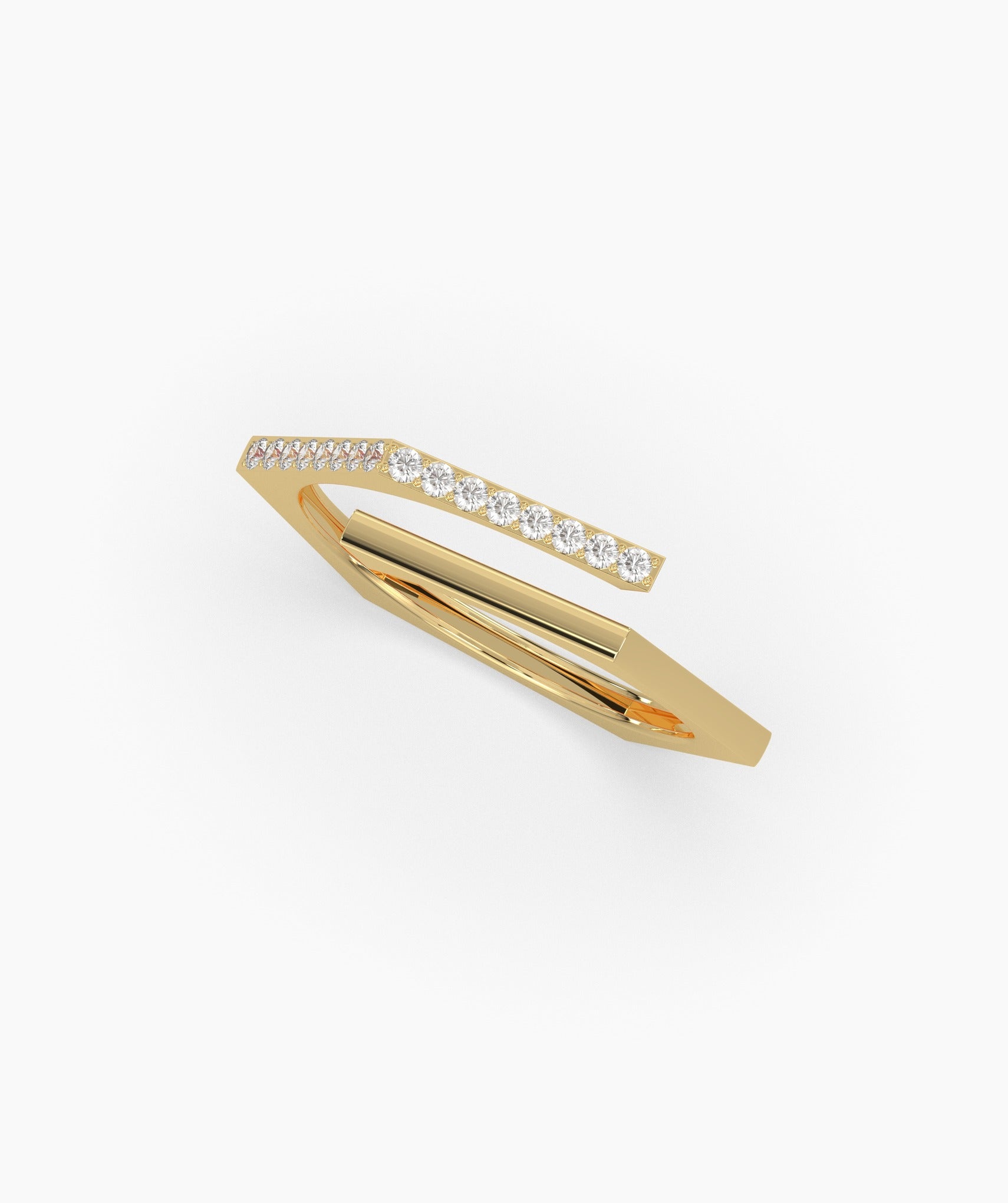 This 14K gold wrap ring showcases a minimalist open design with a diamond-studded bar for a stylish, sophisticated finish.