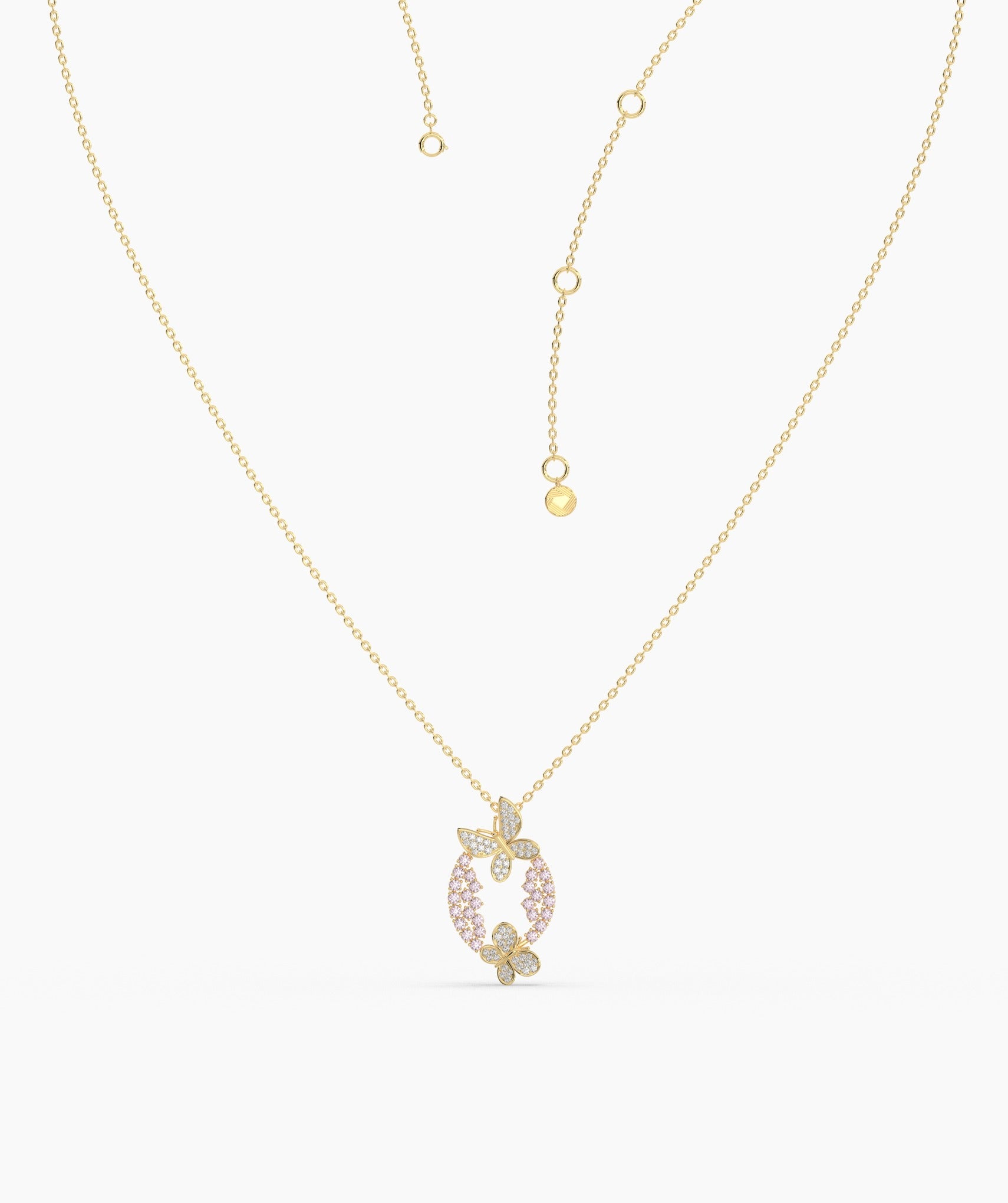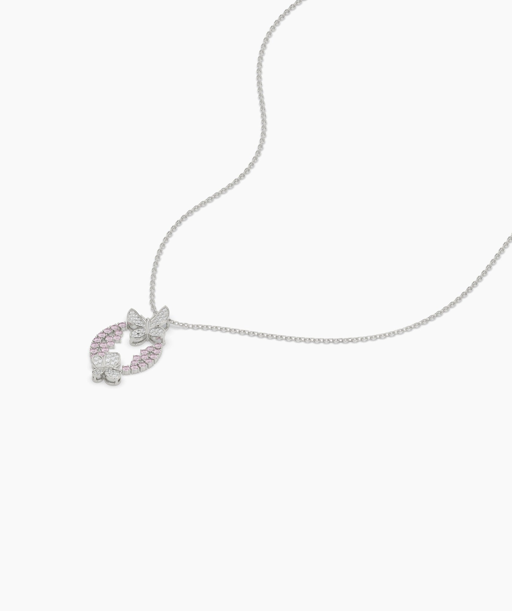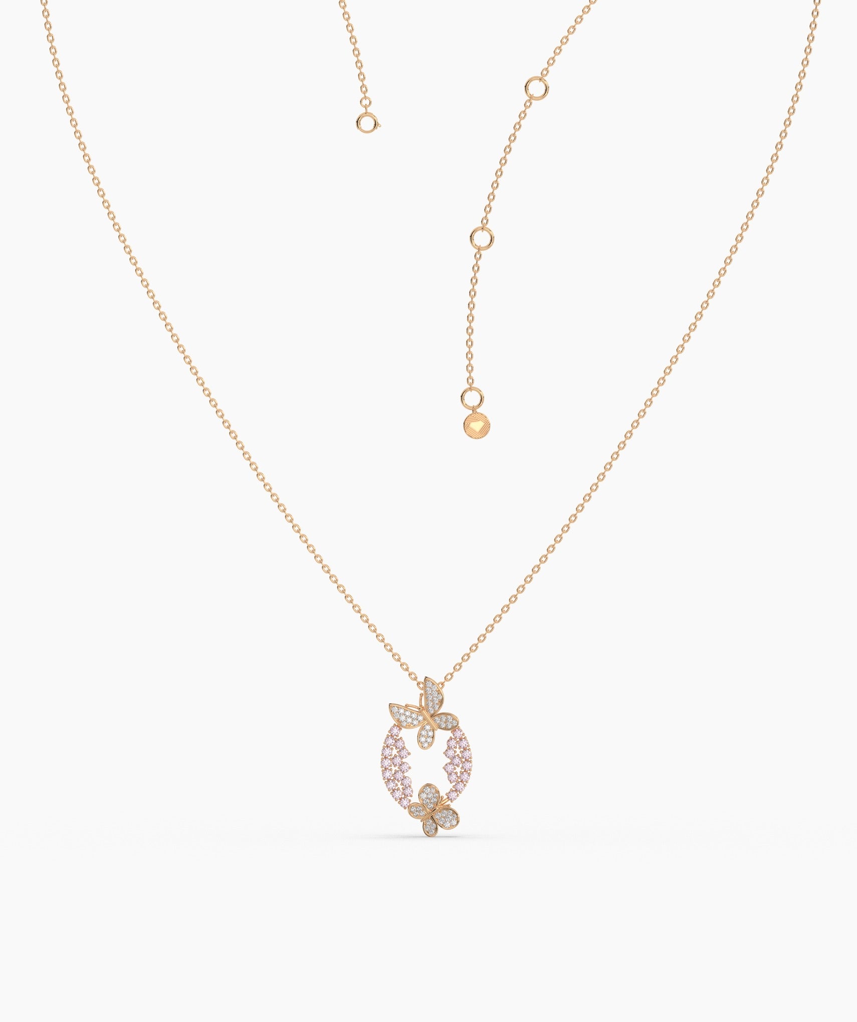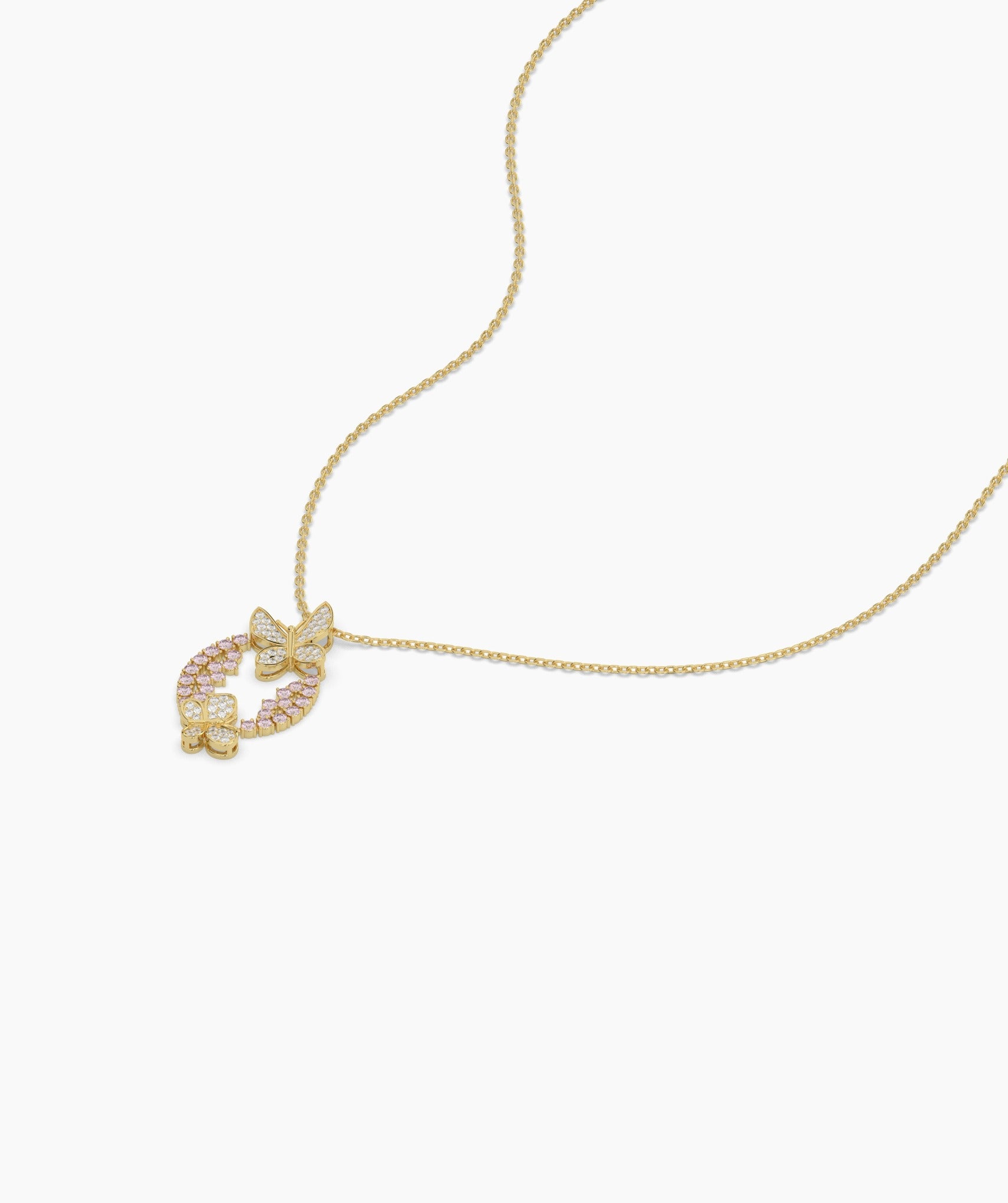 Celebrate nature's beauty with this exquisite butterfly wreath pendant, crafted in gold and adorned with pink and white gemstones.