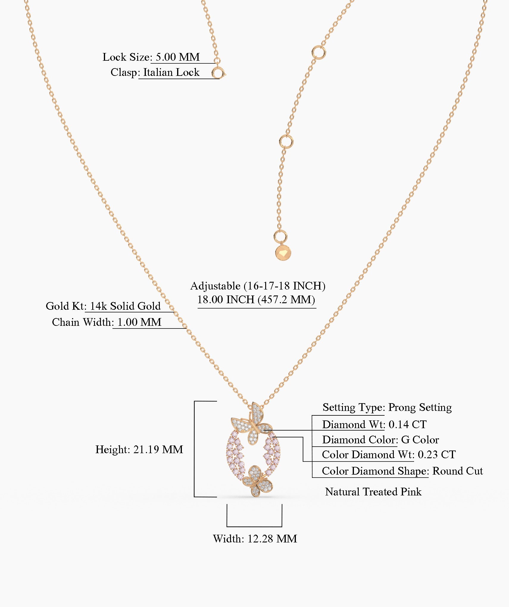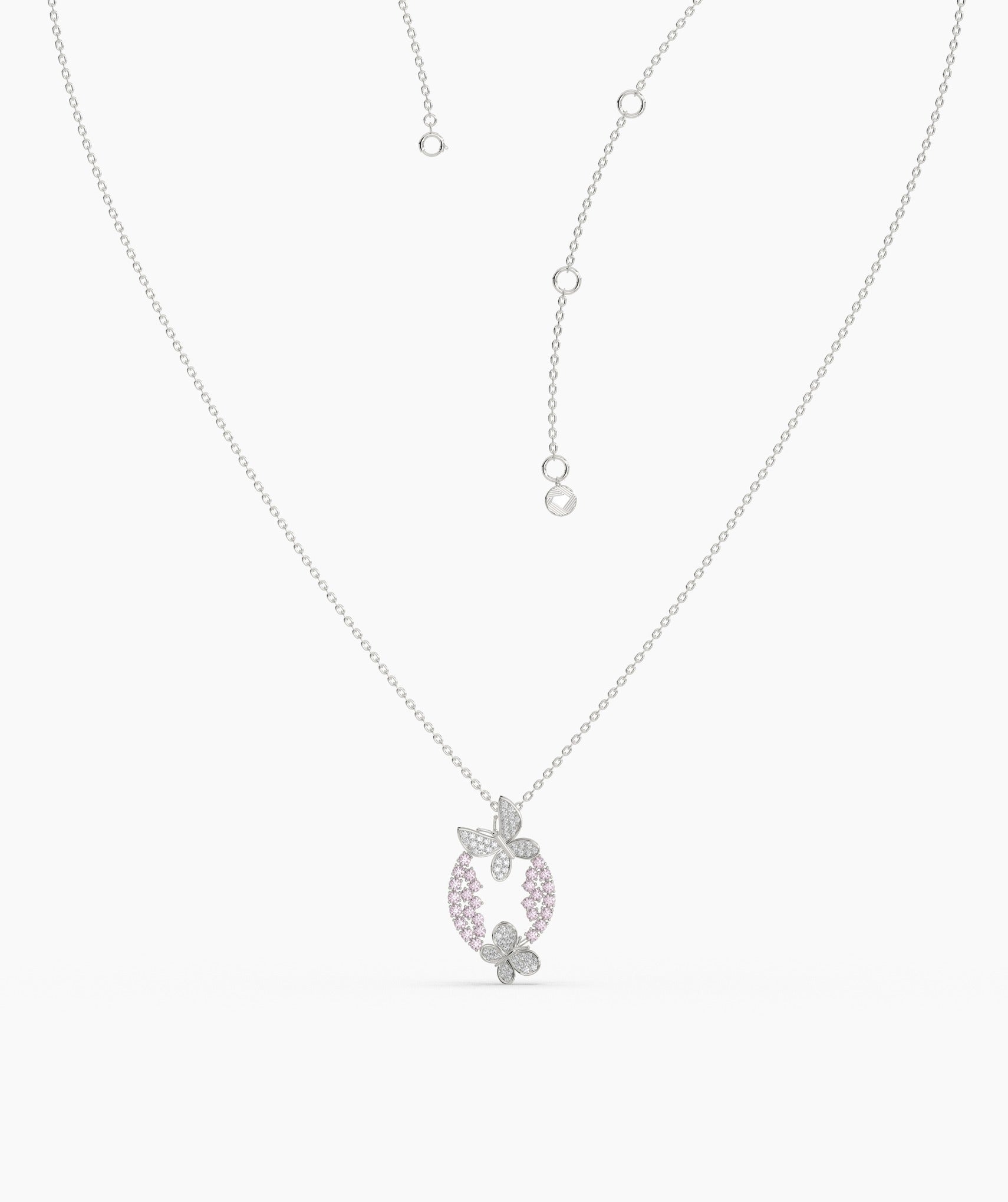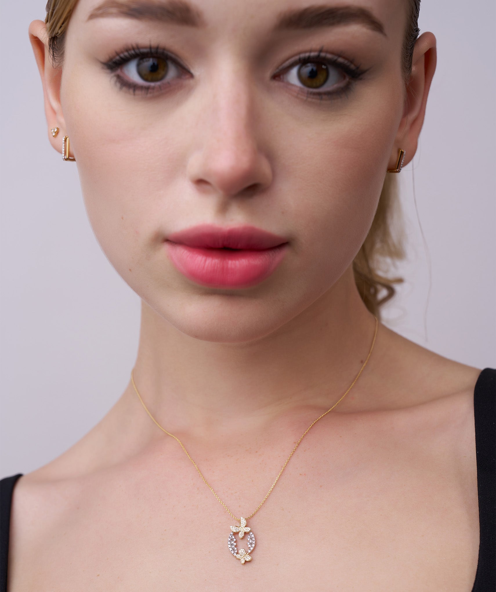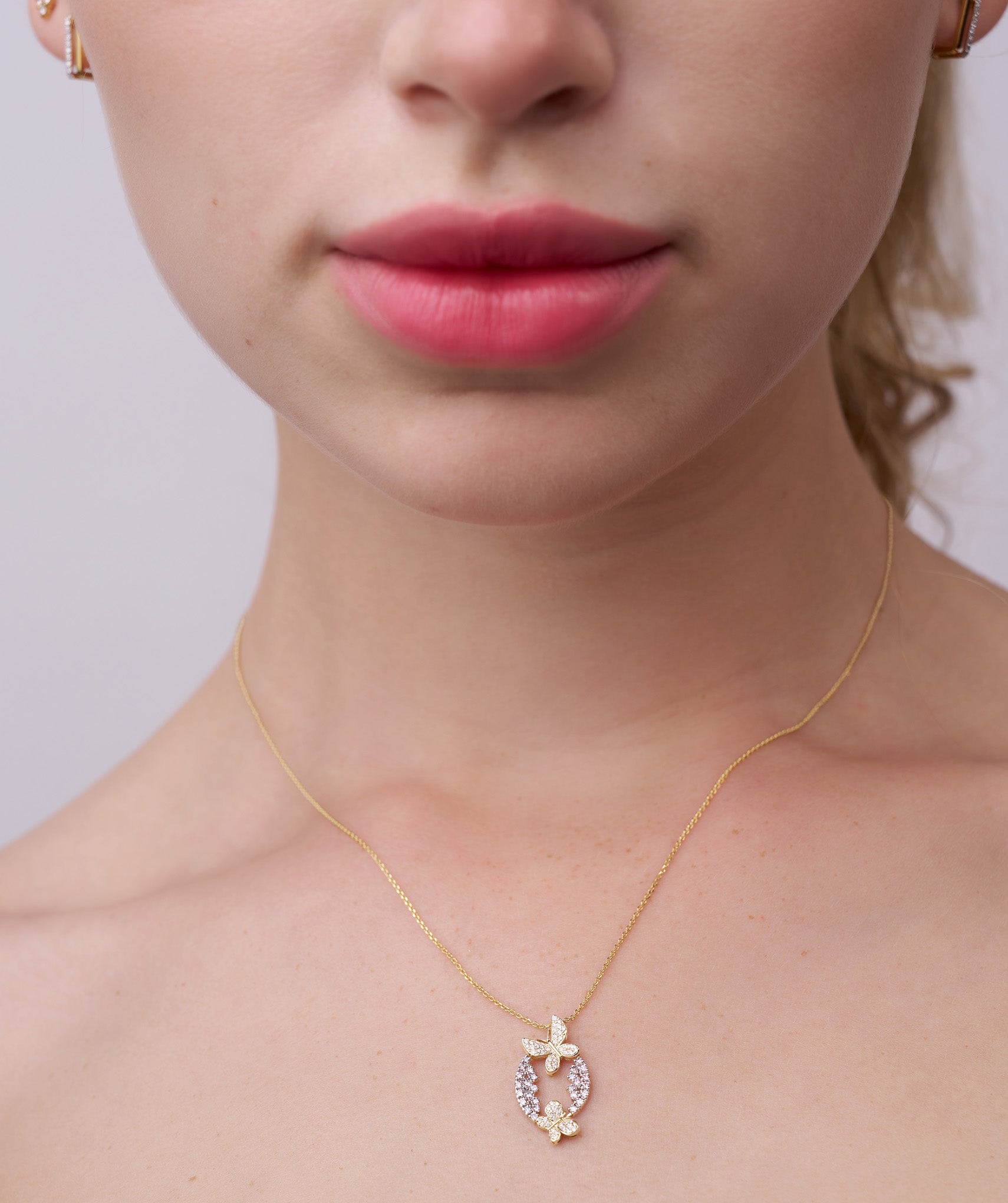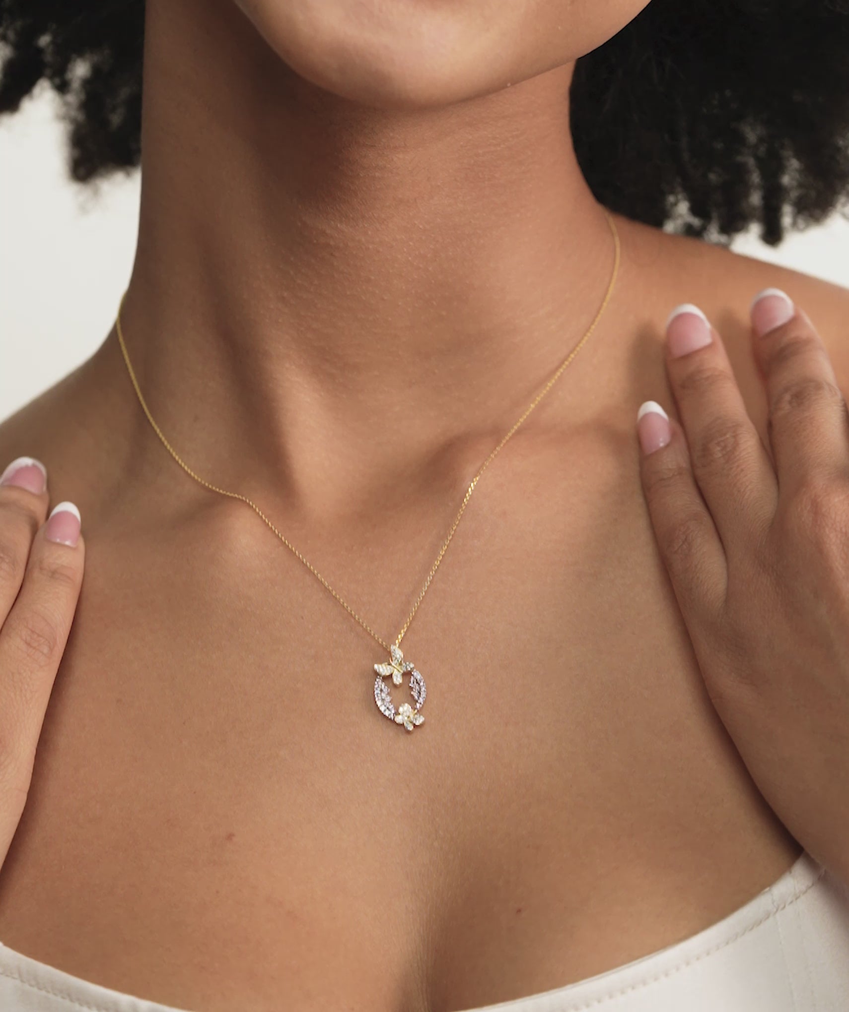 Celebrate nature's beauty with this exquisite butterfly wreath pendant, crafted in gold and adorned with pink and white gemstones.