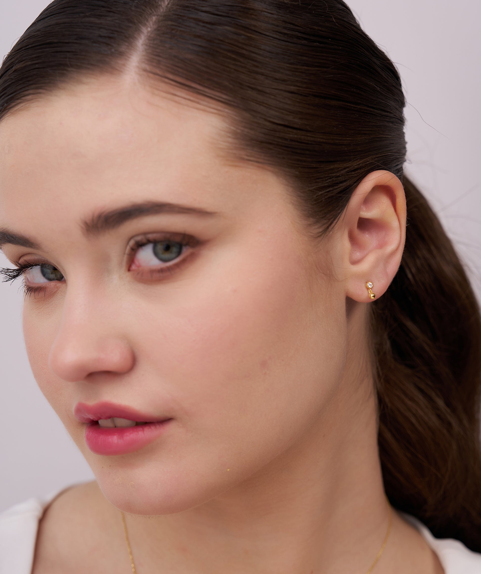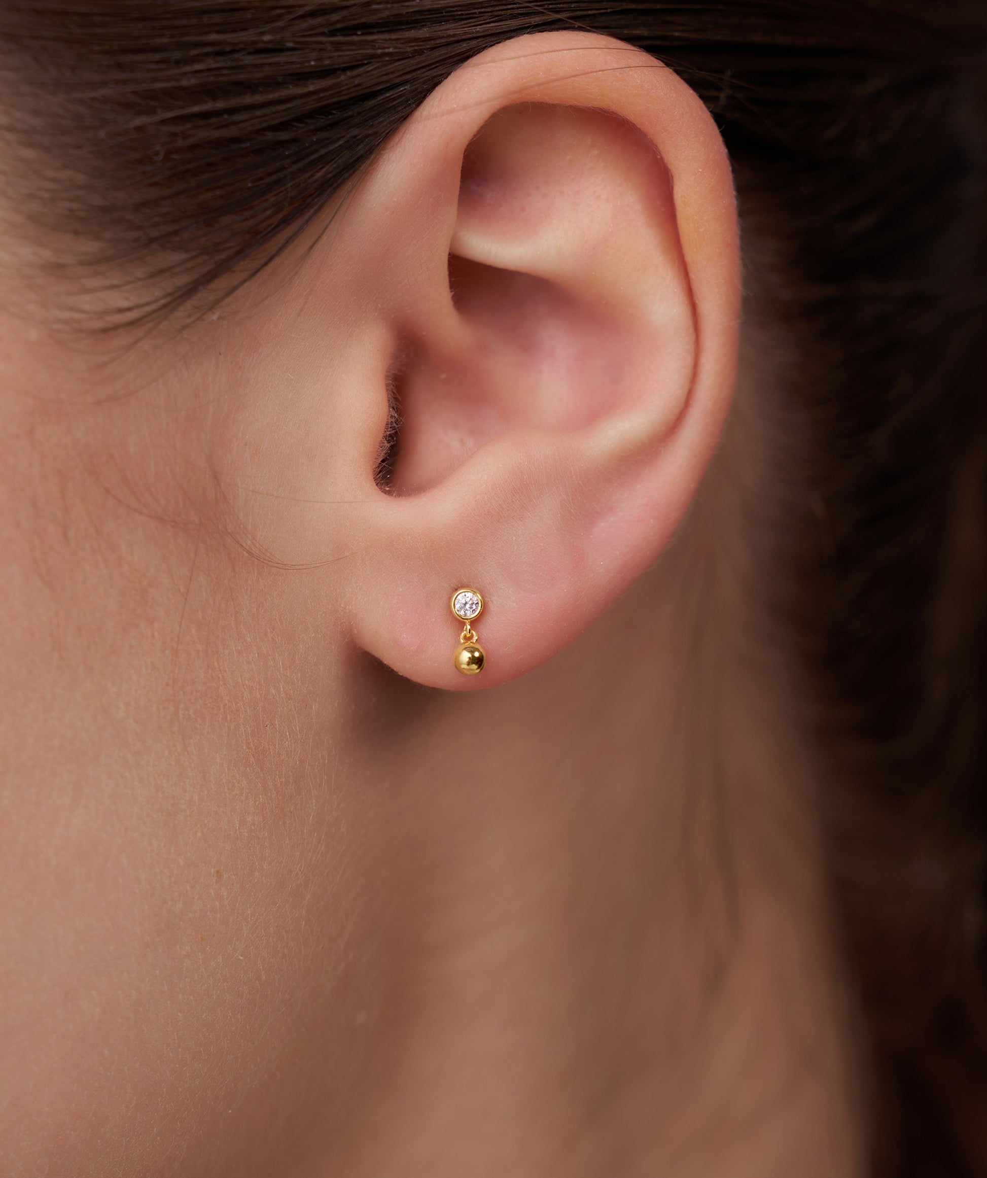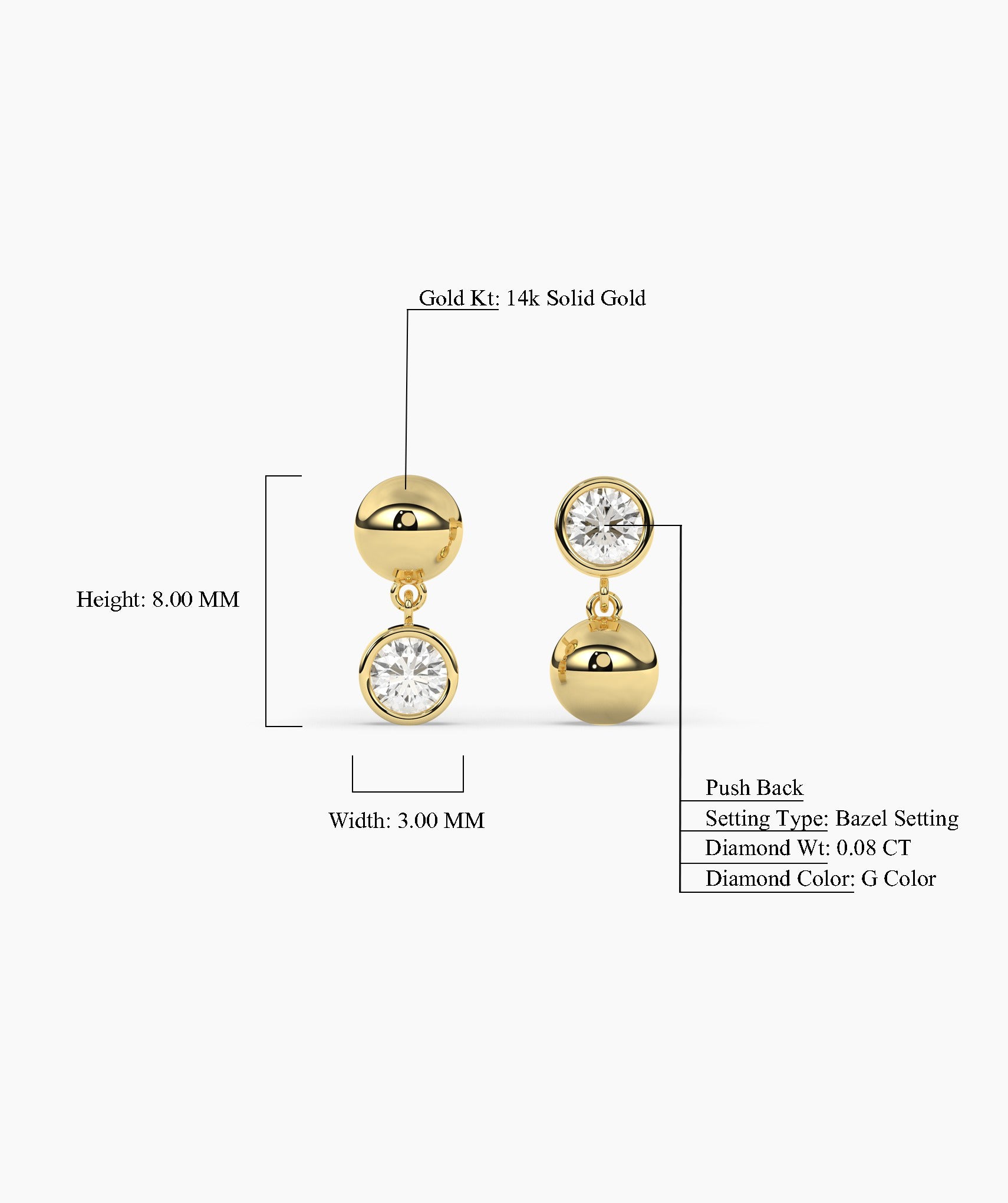 A playful study in gravity and light, these earrings prove that minimal design can still have major personality. The silhouette features a lustrous, high polish gold sphere that sits at the ear, suspending a petite bezel-set diamond that dances freely below. Crafted in 14K solid gold with approximately 0.08 carats of natural G color diamonds, they measure a dainty 8mm in total height making them ideal for a subtle primary lobe look or a textured addition to a second piercing. The bezel setting ensures a smooth, snag-free finish, while the push backs keep them secure for 24/7 wear. Available in yellow, white, and rose gold to effortlessly match your daily stack.