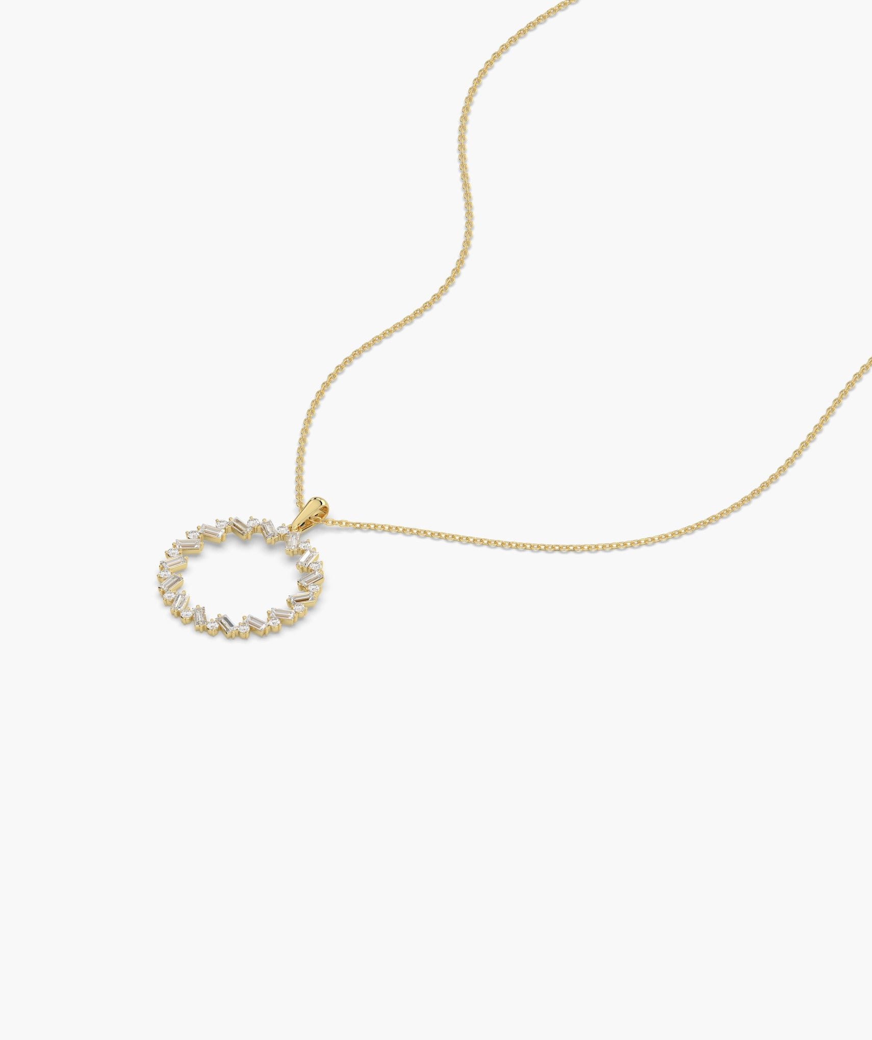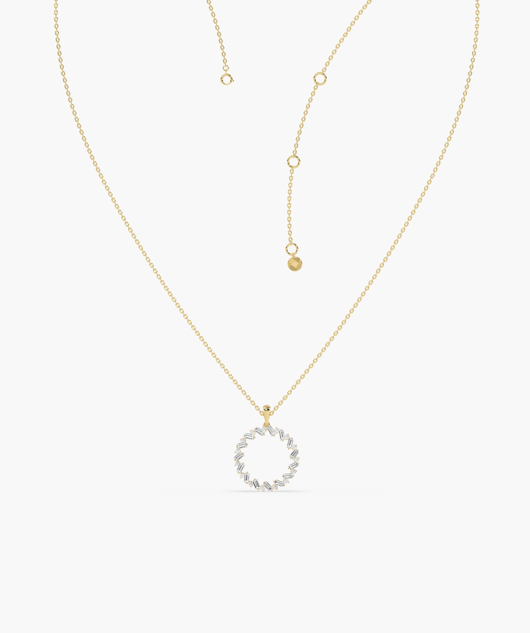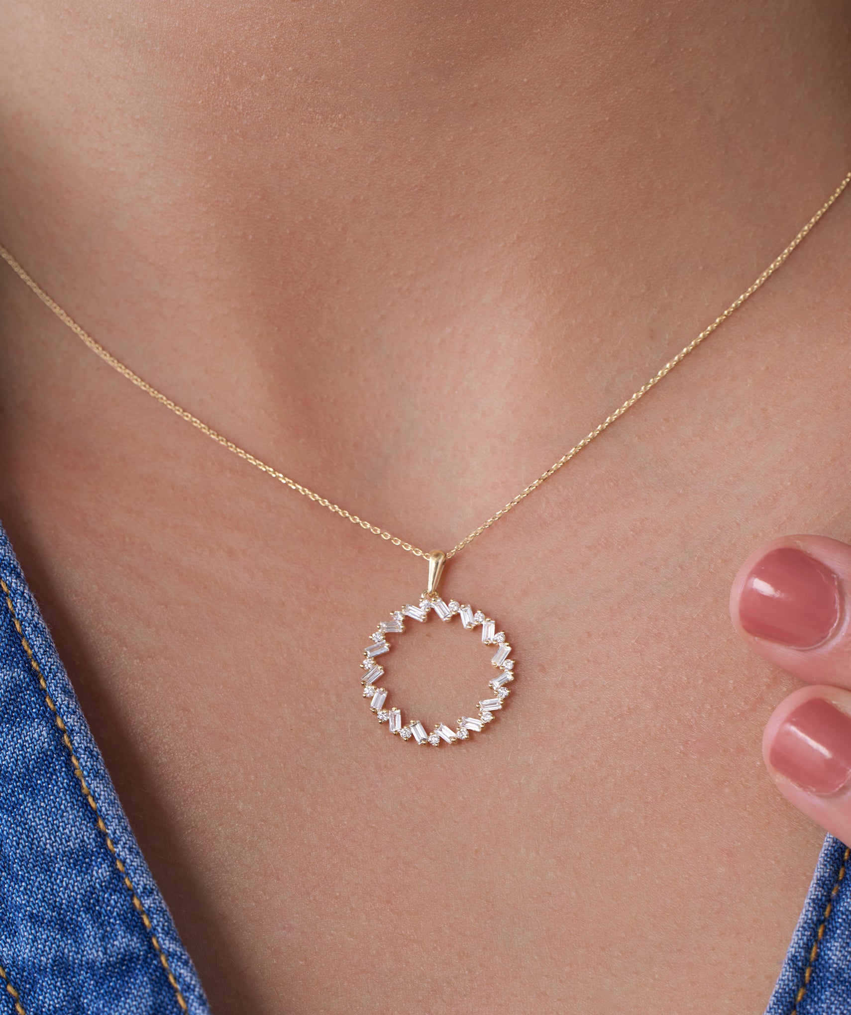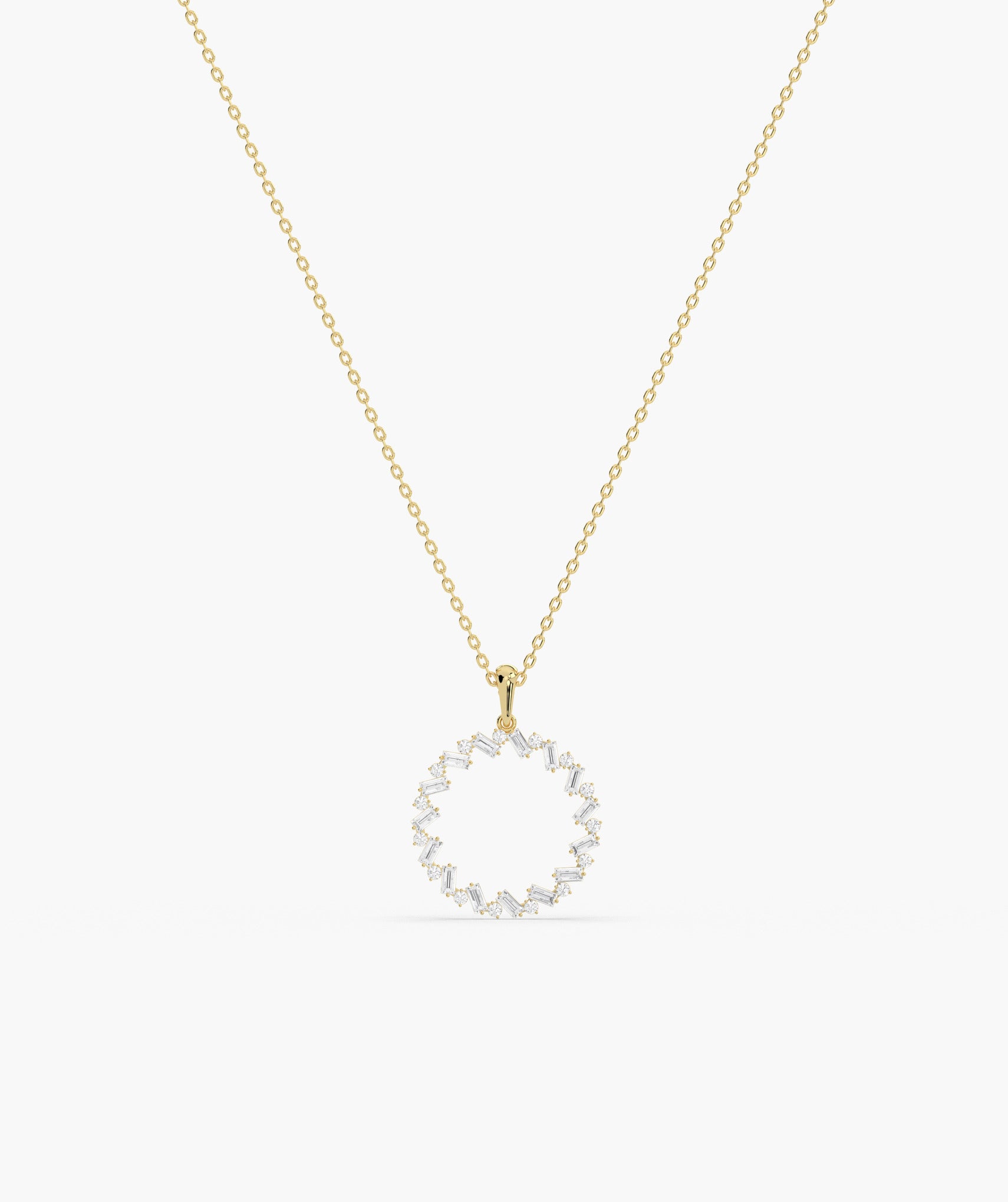 14K gold pendant necklace with a harmonious circle of alternating baguette and round diamonds, offering a touch of timeless sparkle.