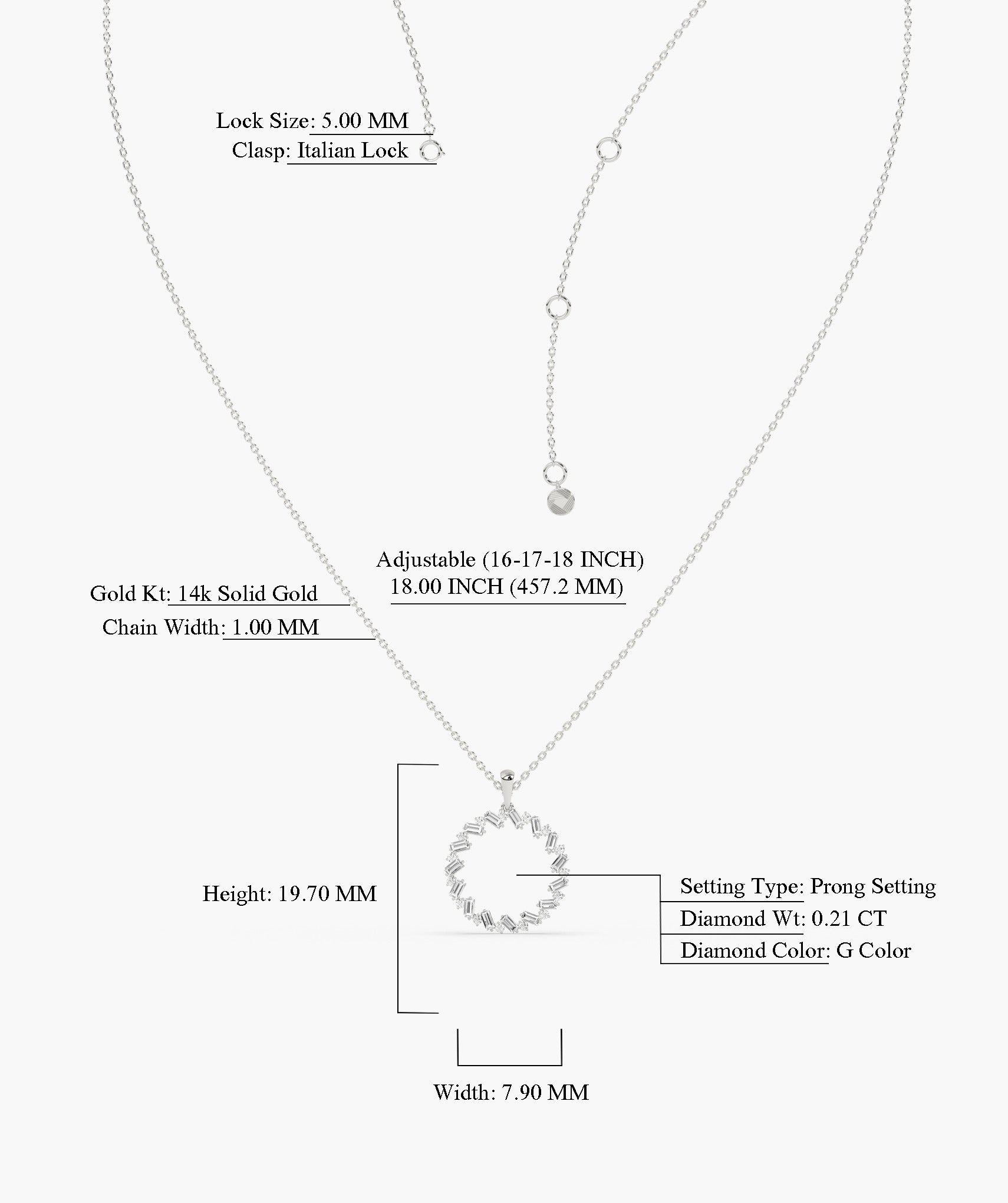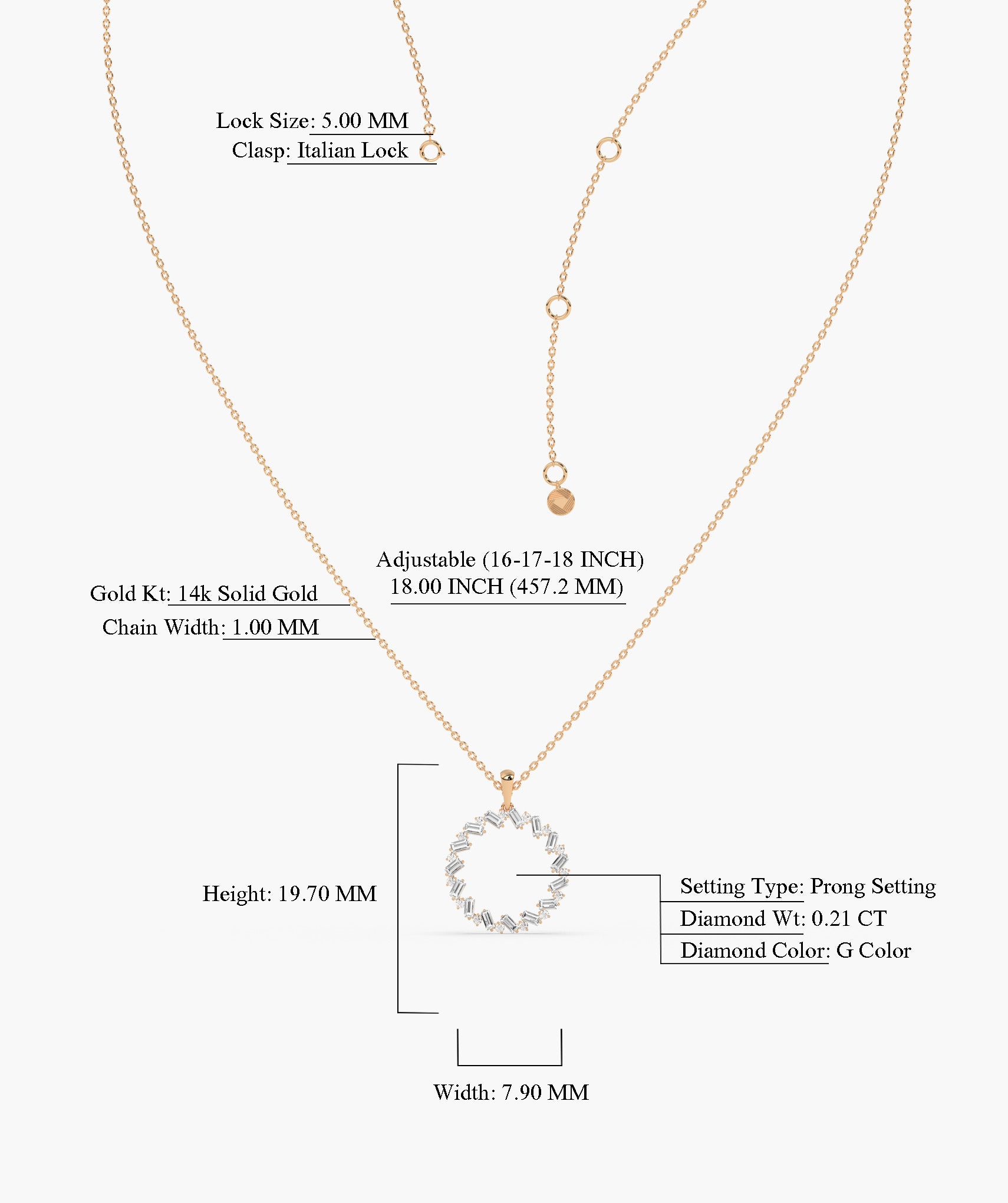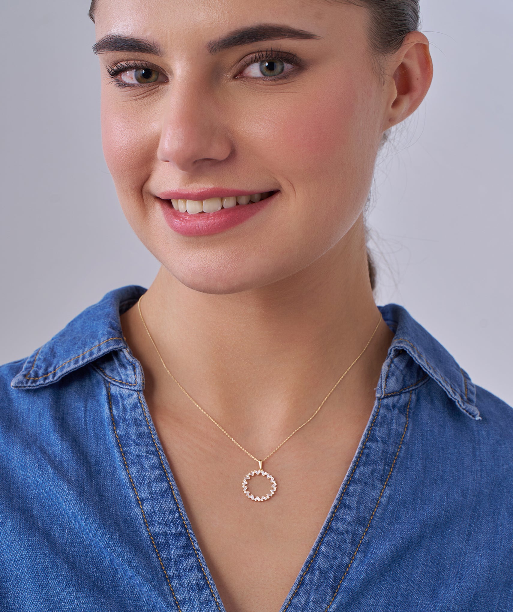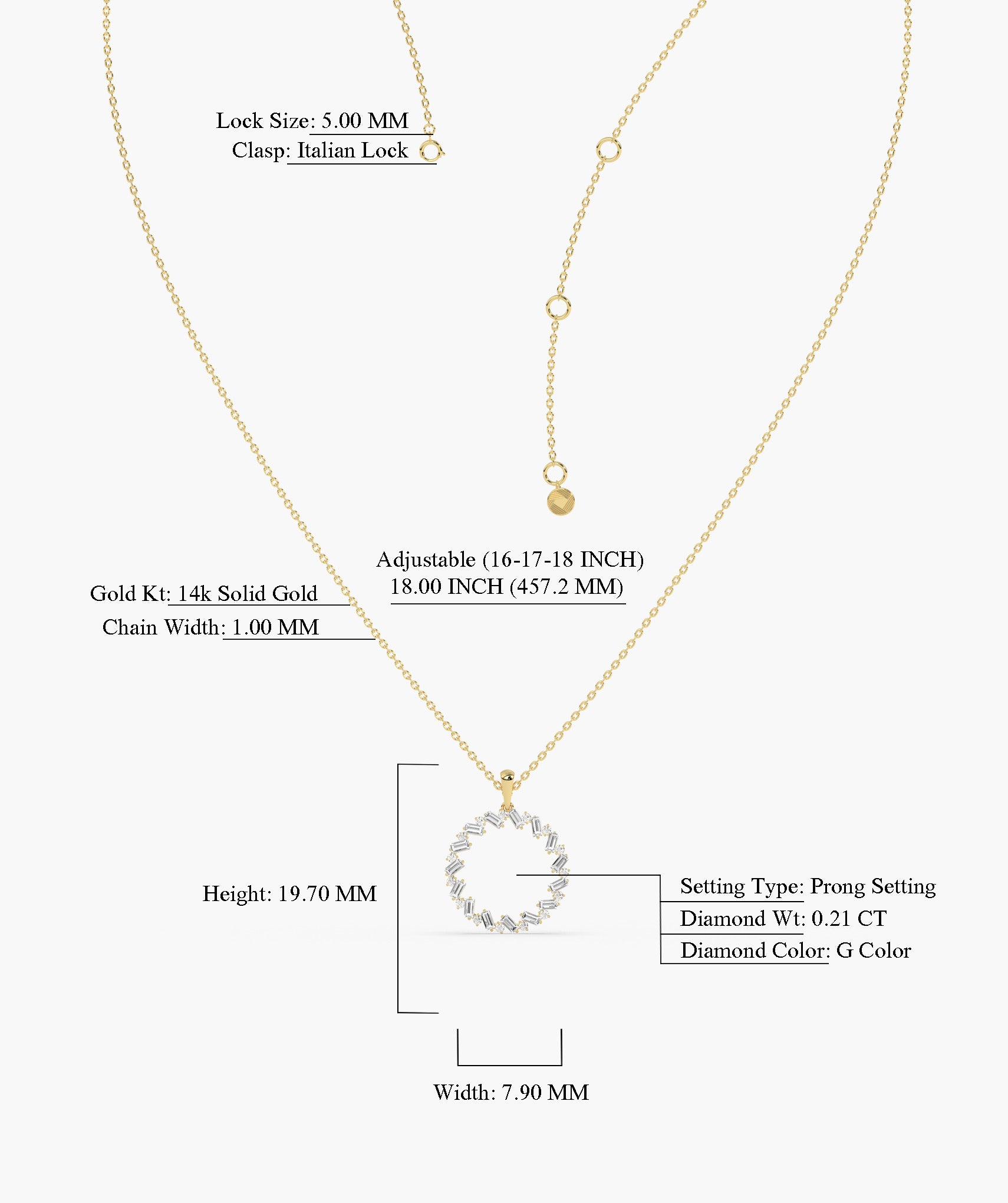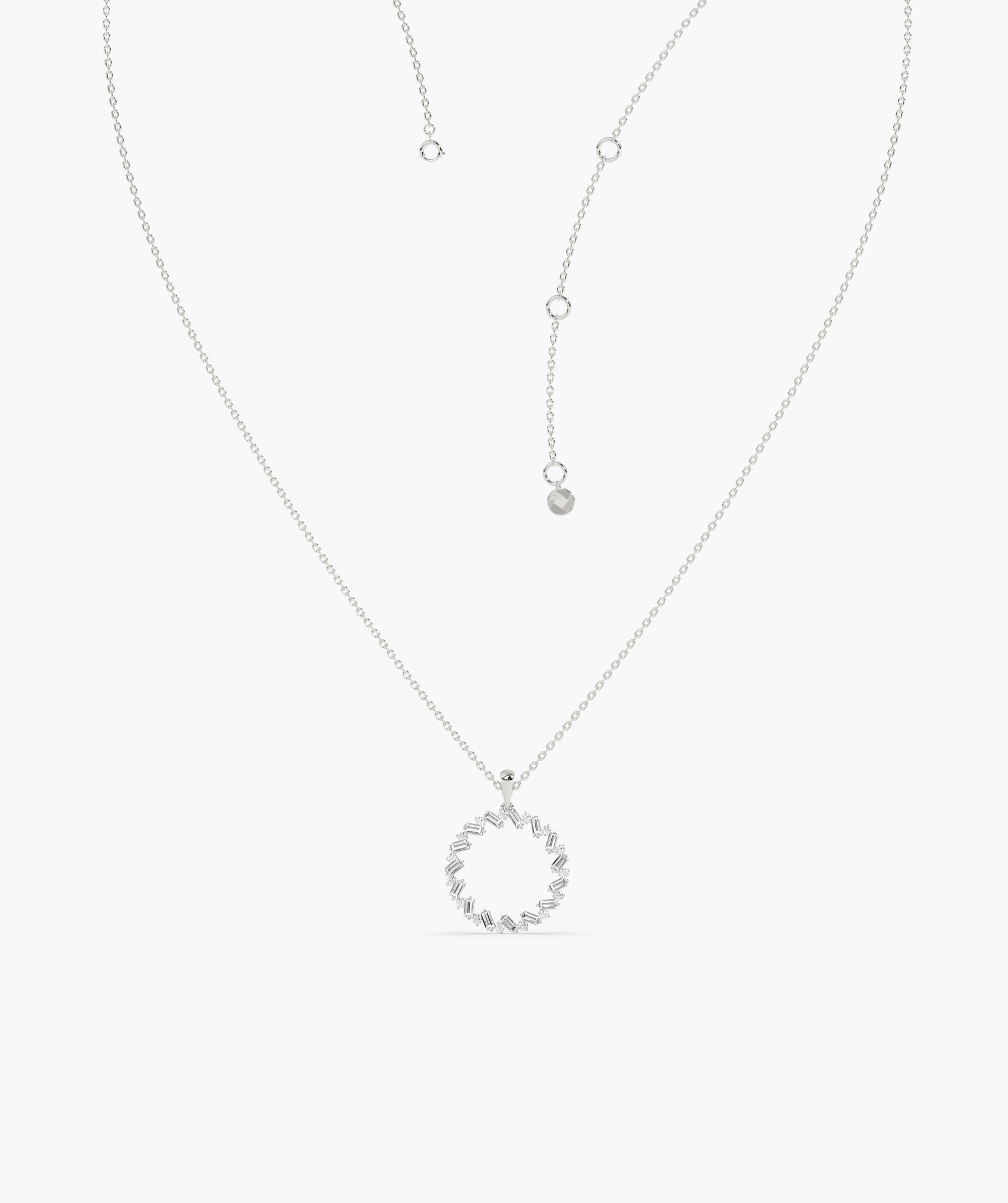 14K gold pendant necklace with a harmonious circle of alternating baguette and round diamonds, offering a touch of timeless sparkle.