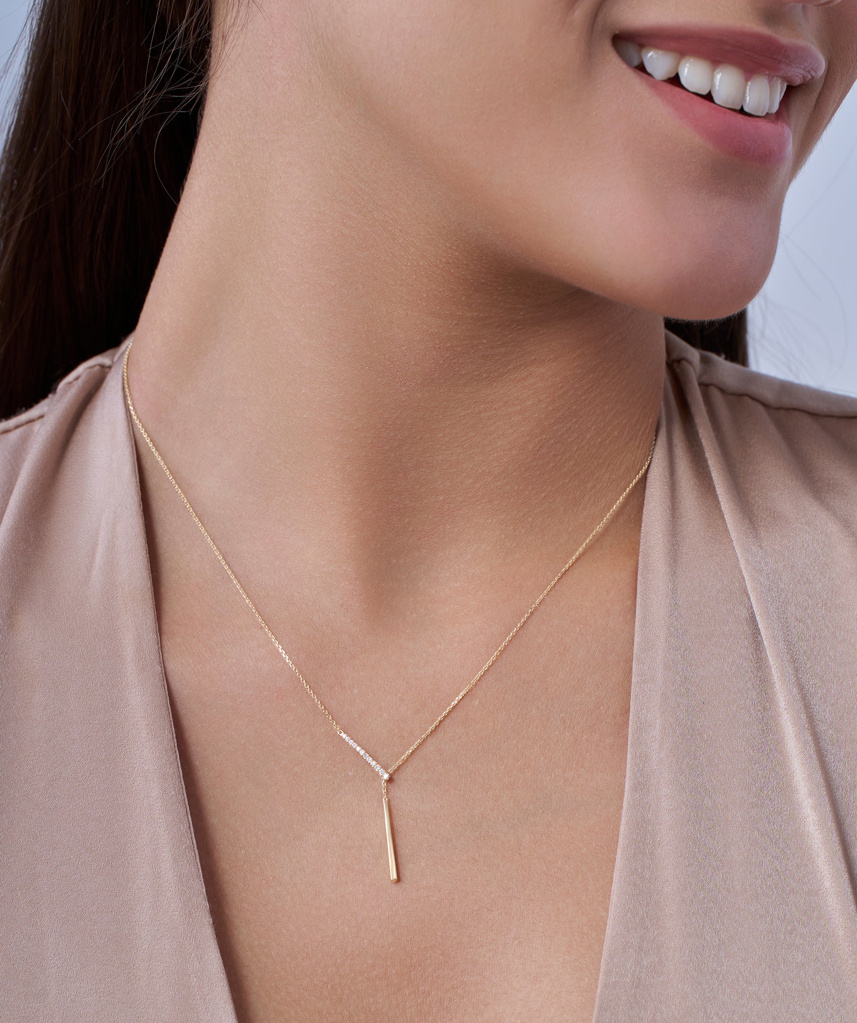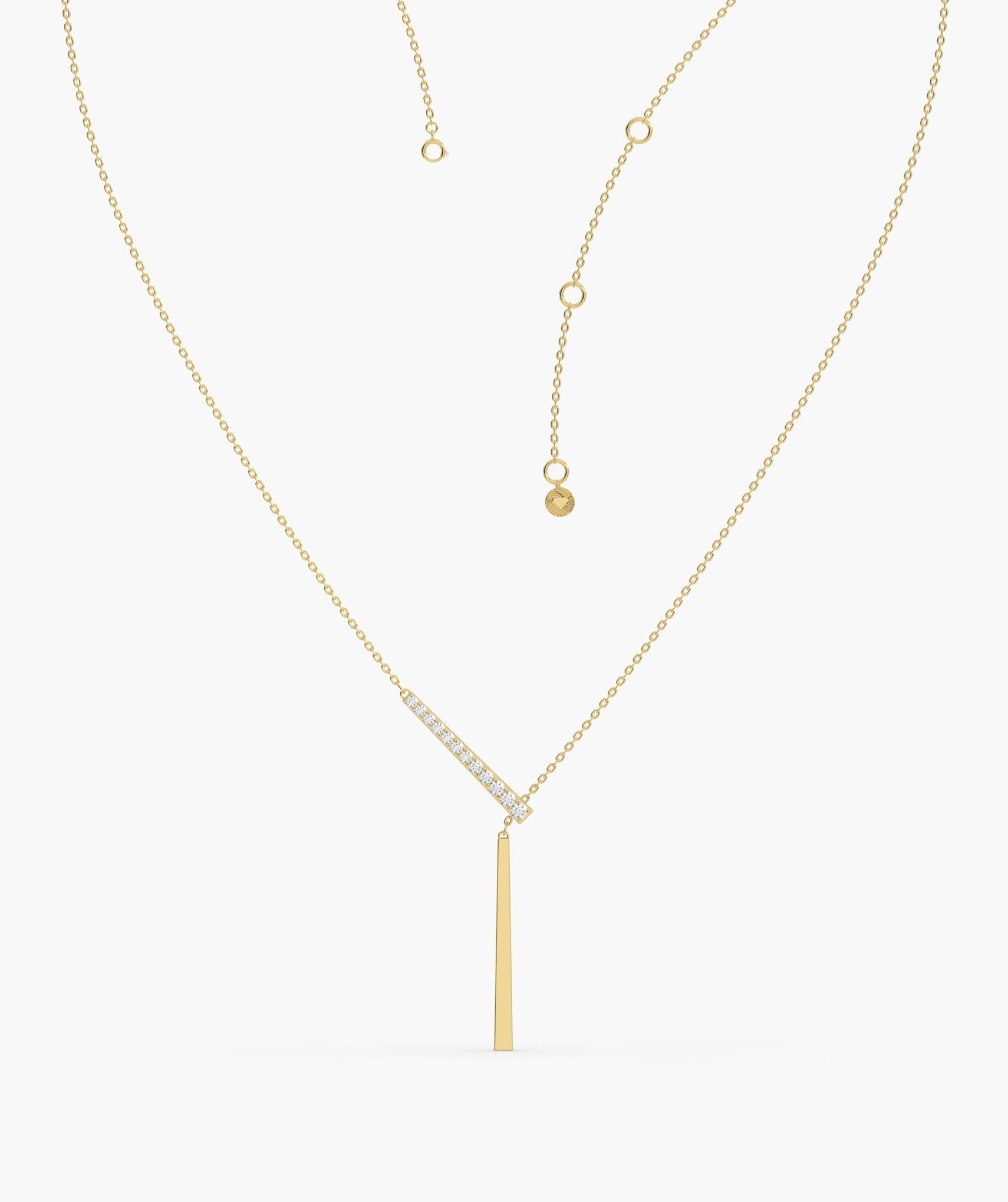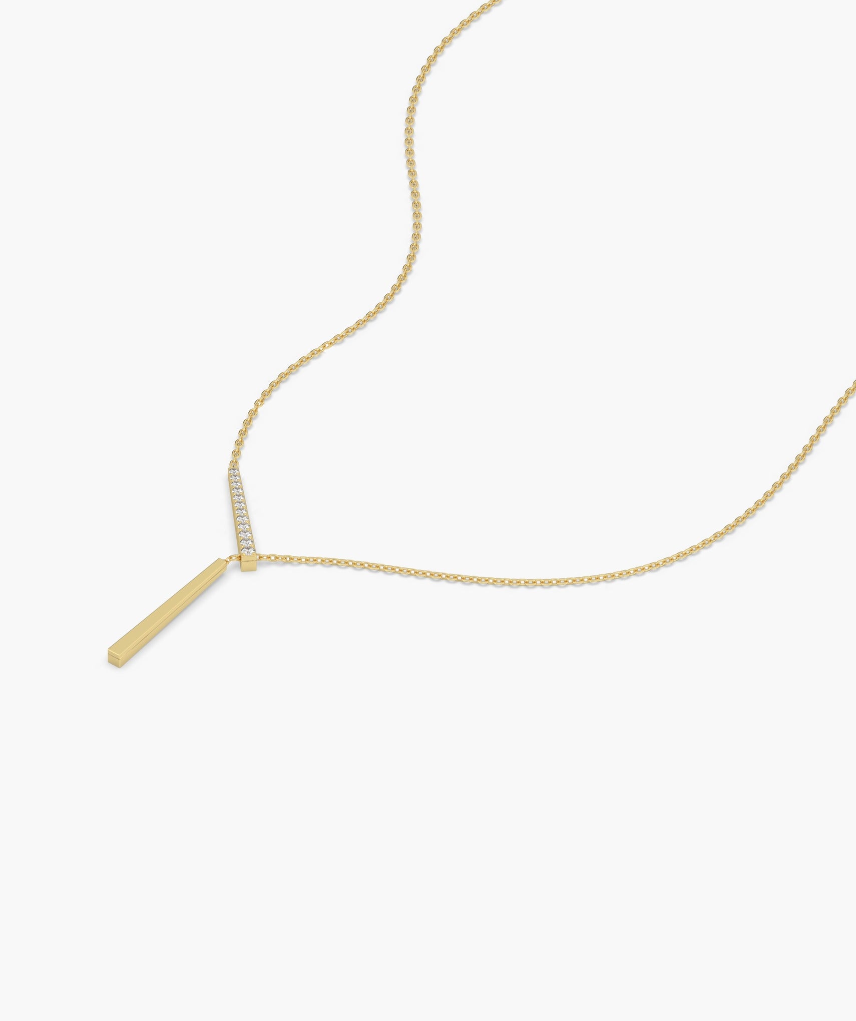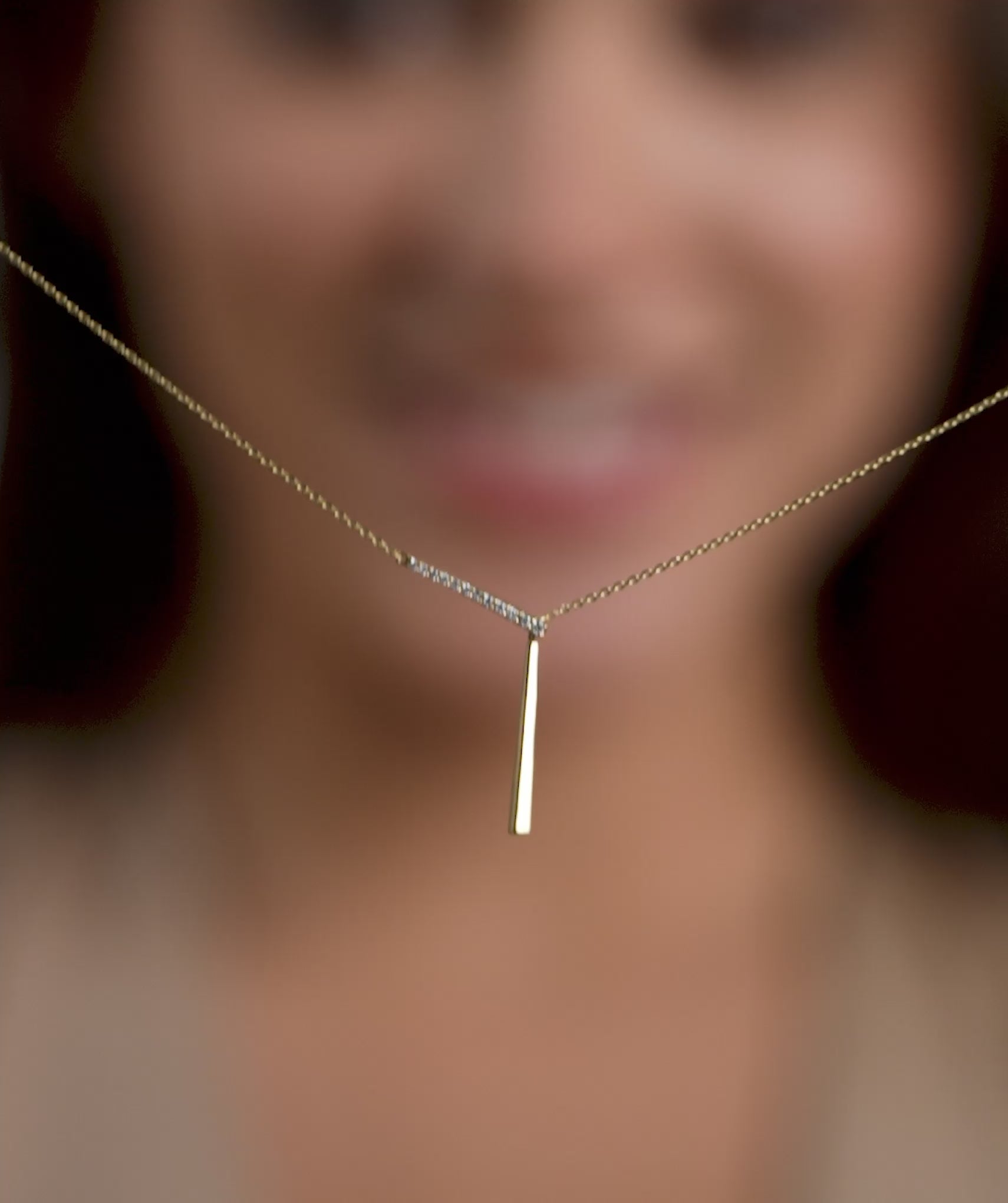 This sophisticated 14K gold necklace showcases a sleek gold bar pendant, suspended from a diamond-encrusted bail for an added touch of sparkle.
