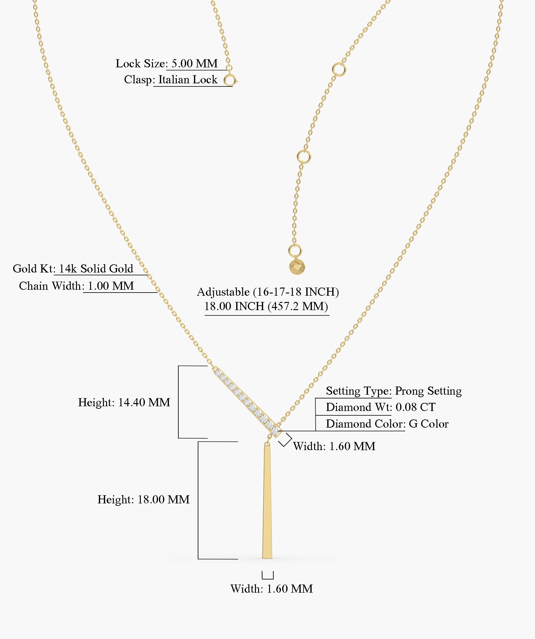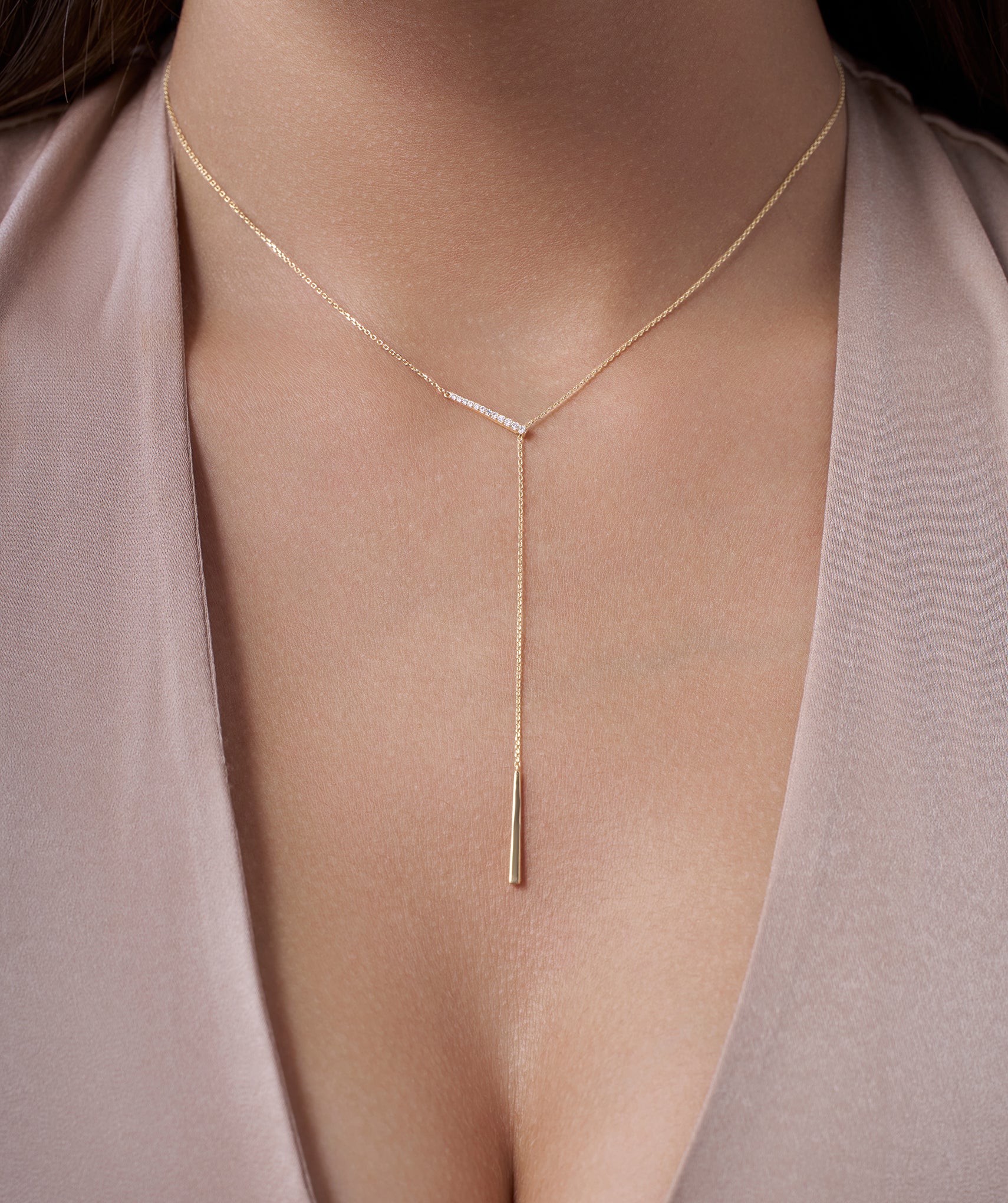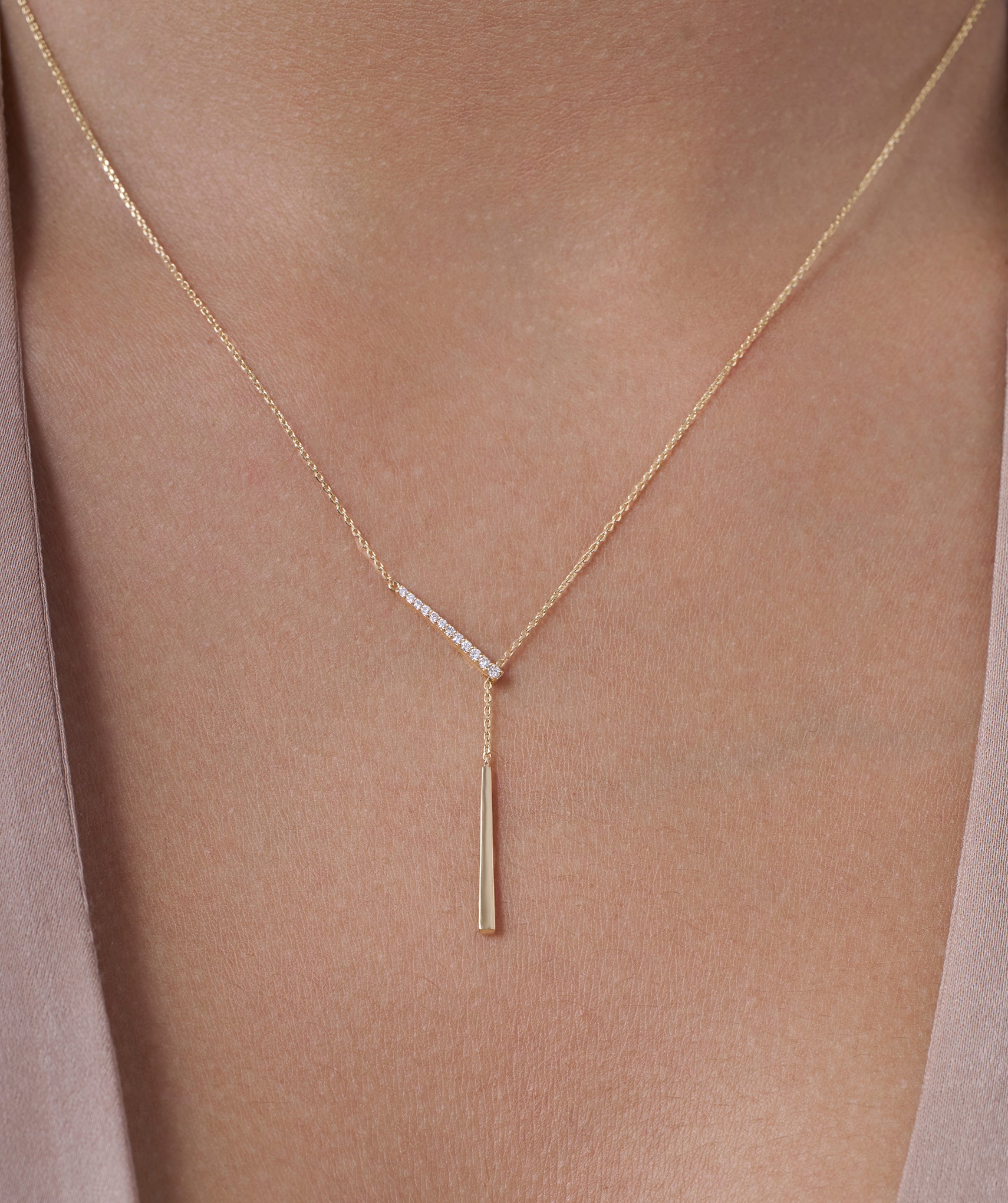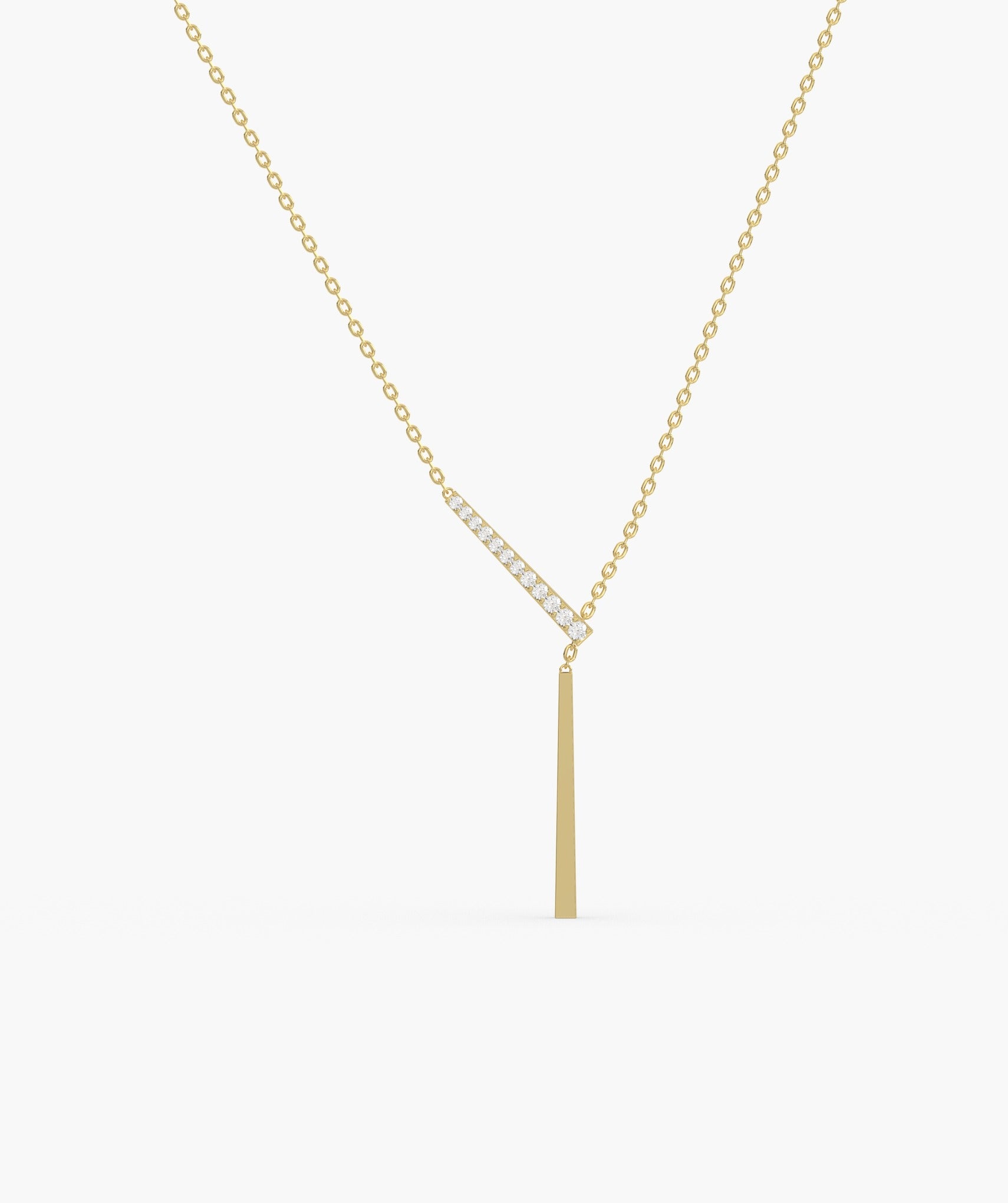 This sophisticated 14K gold necklace showcases a sleek gold bar pendant, suspended from a diamond-encrusted bail for an added touch of sparkle.