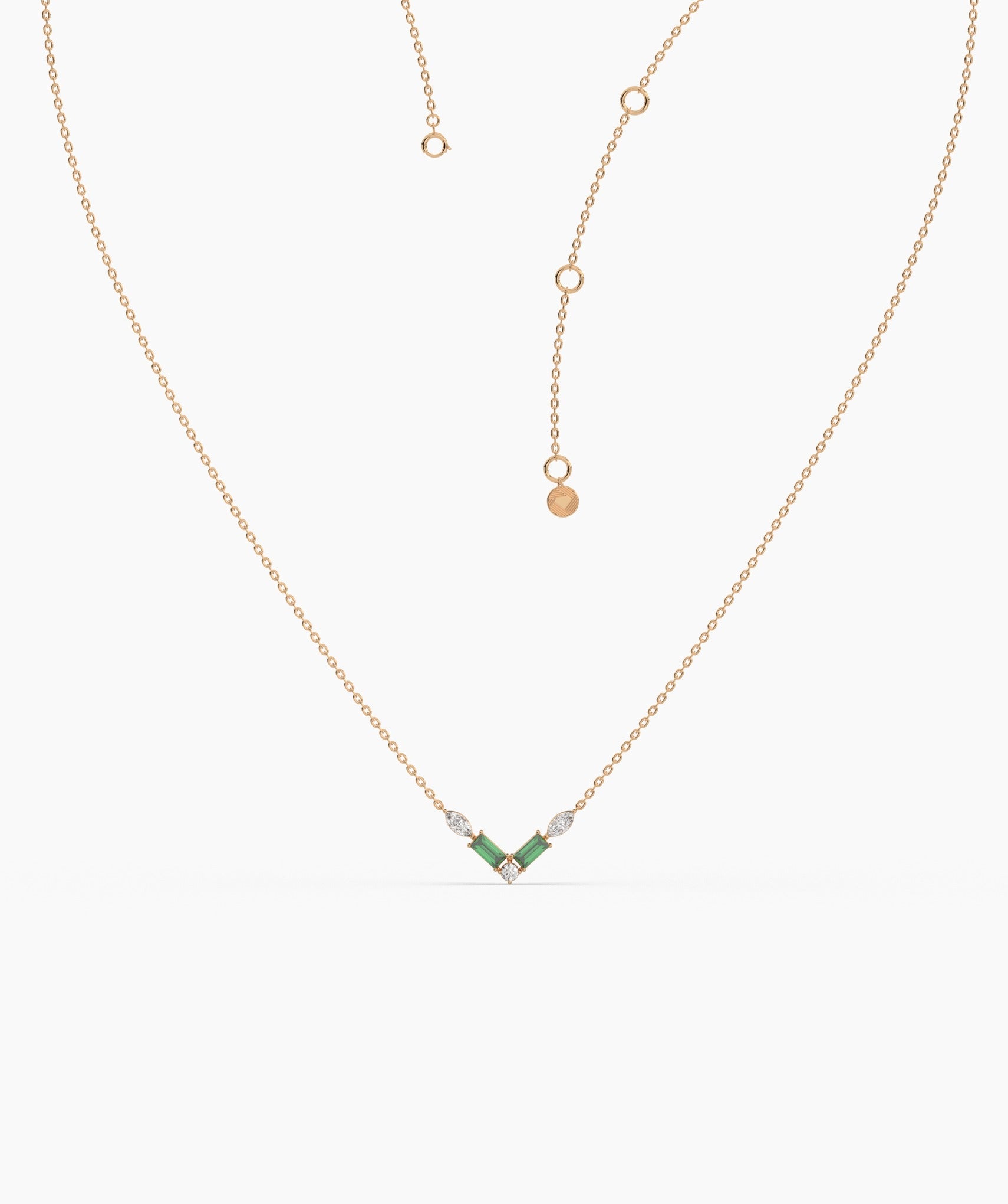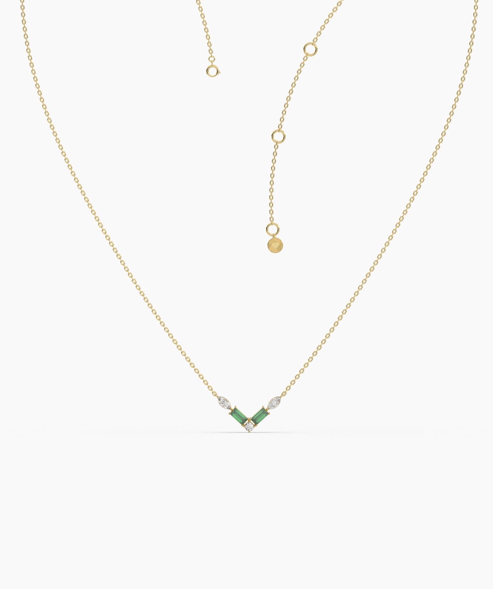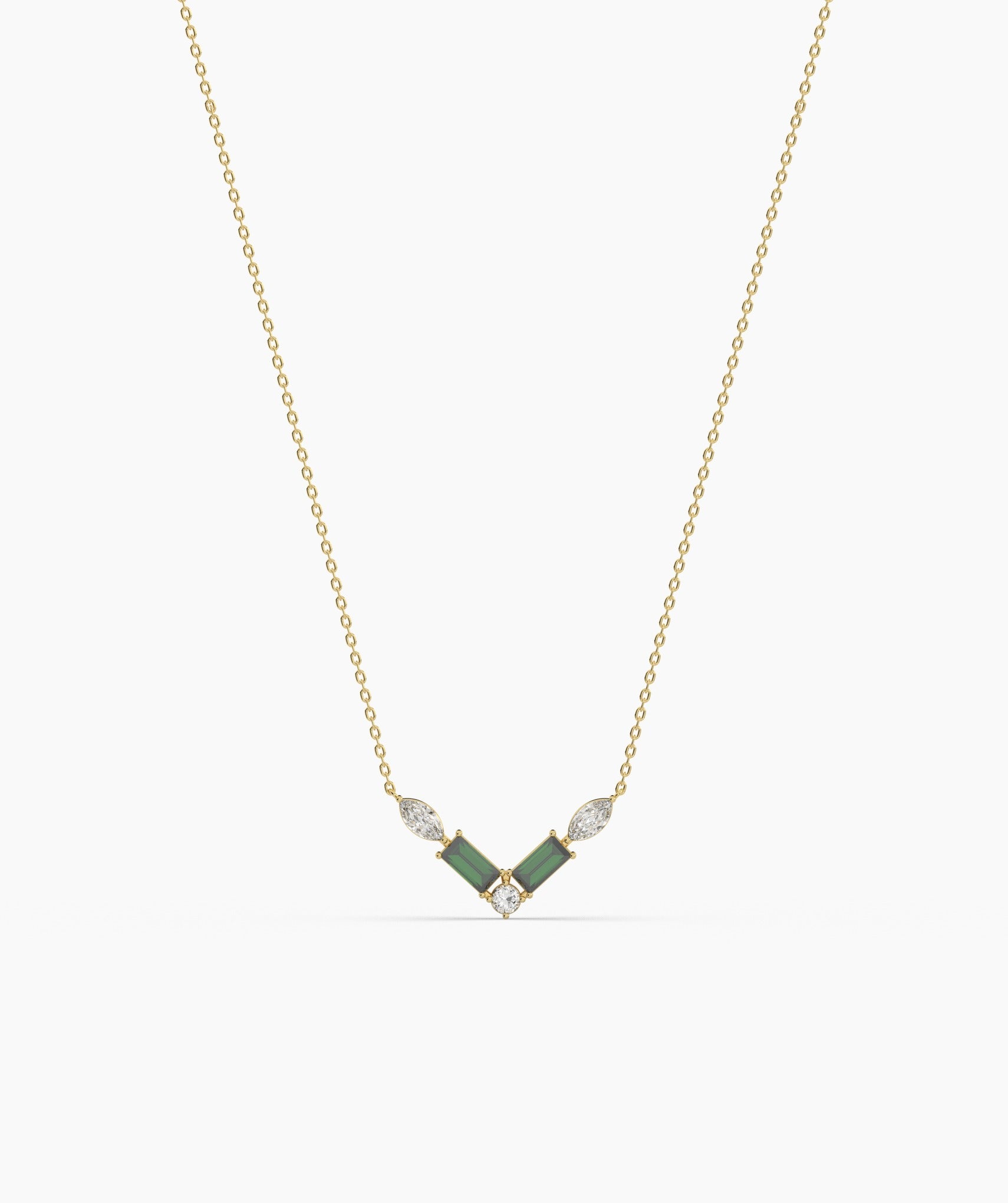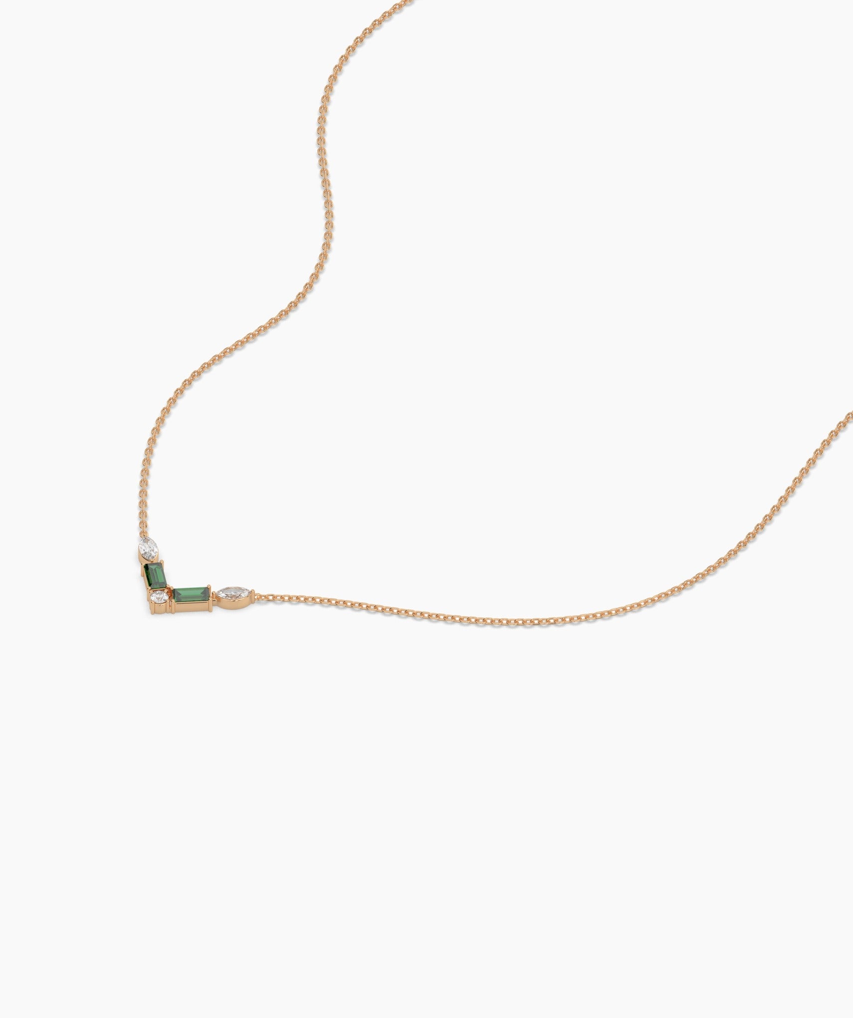 A minimalist yet striking piece, this 14K gold necklace showcases deep green baguette gemstones accented by marquise diamonds in a contemporary V design.
