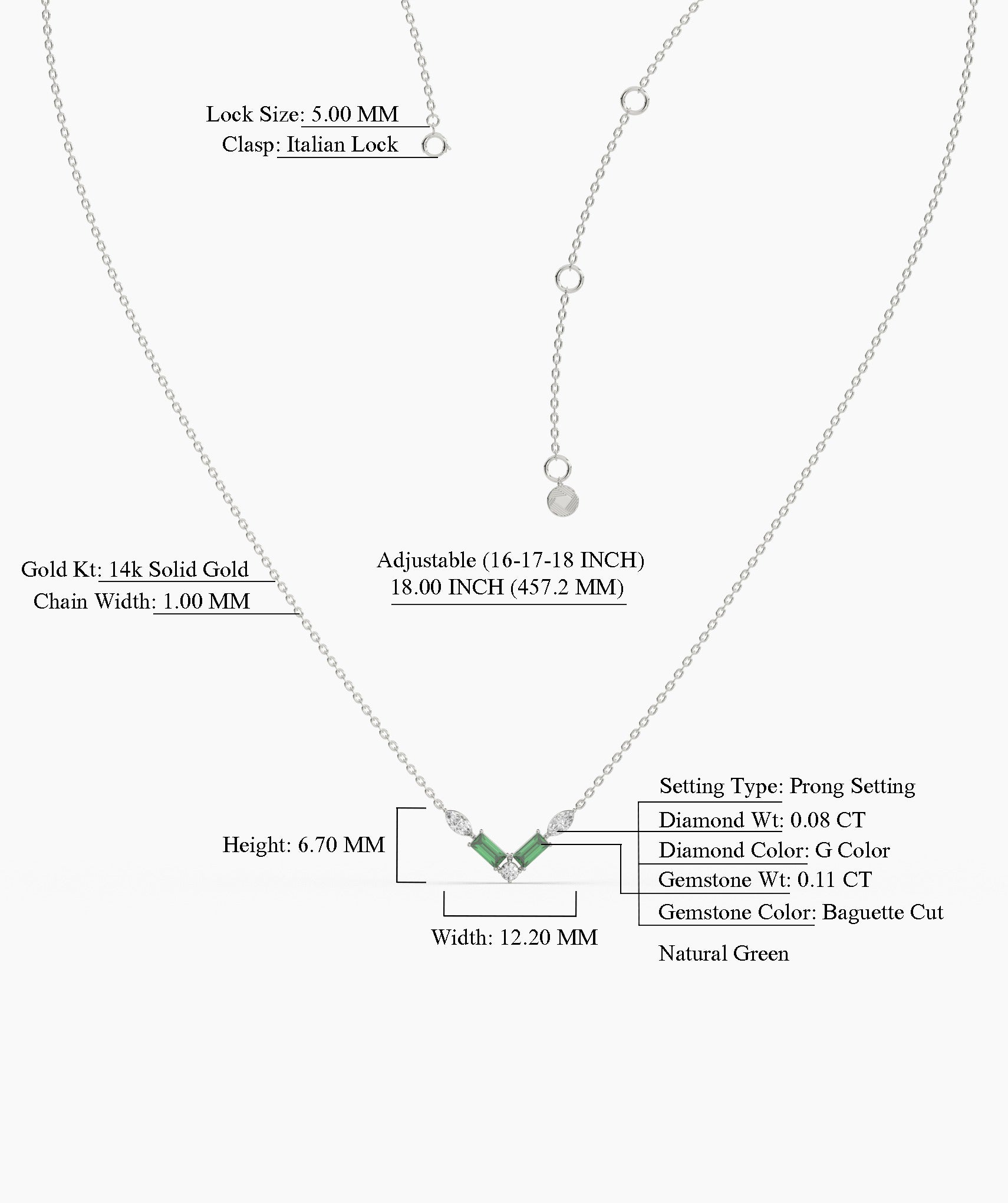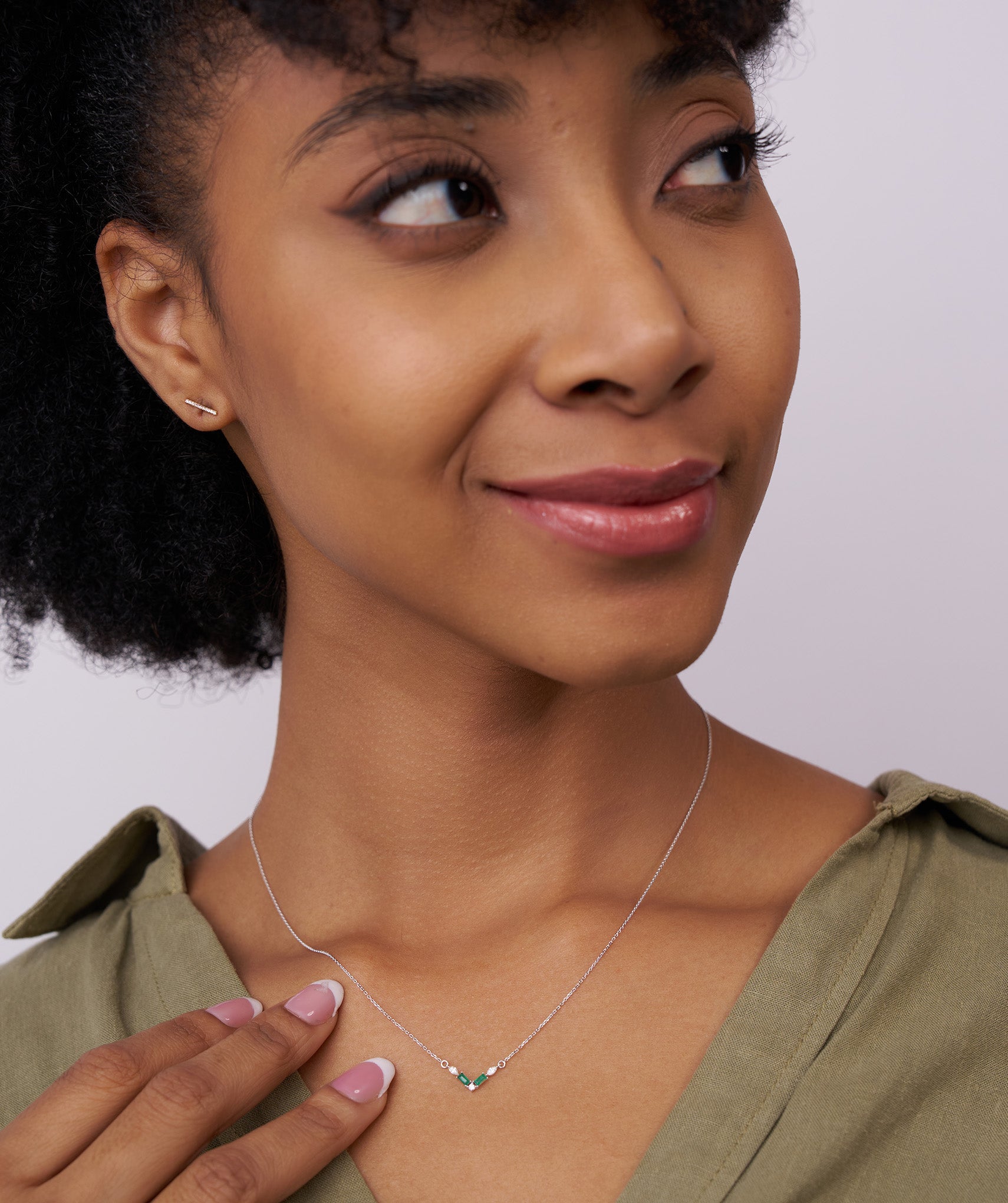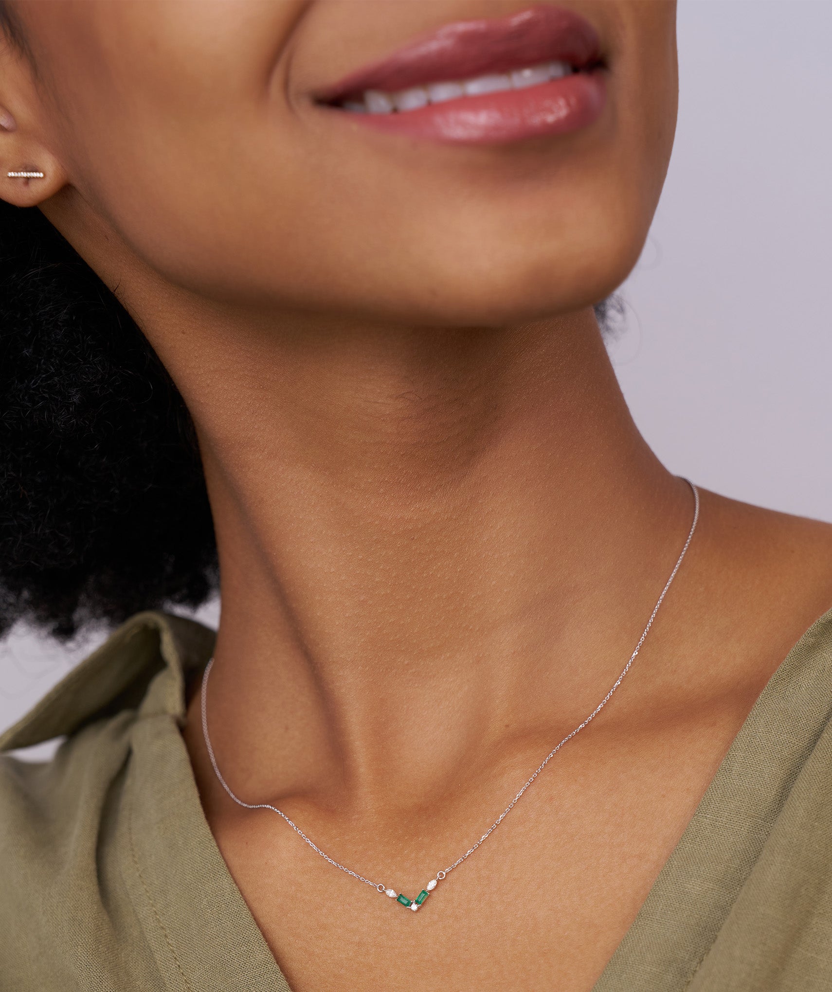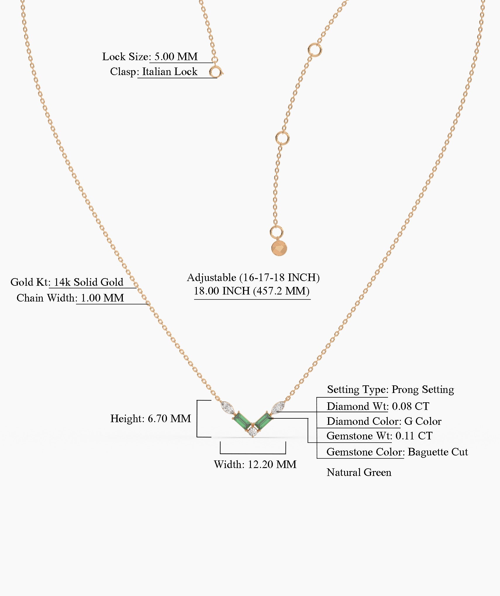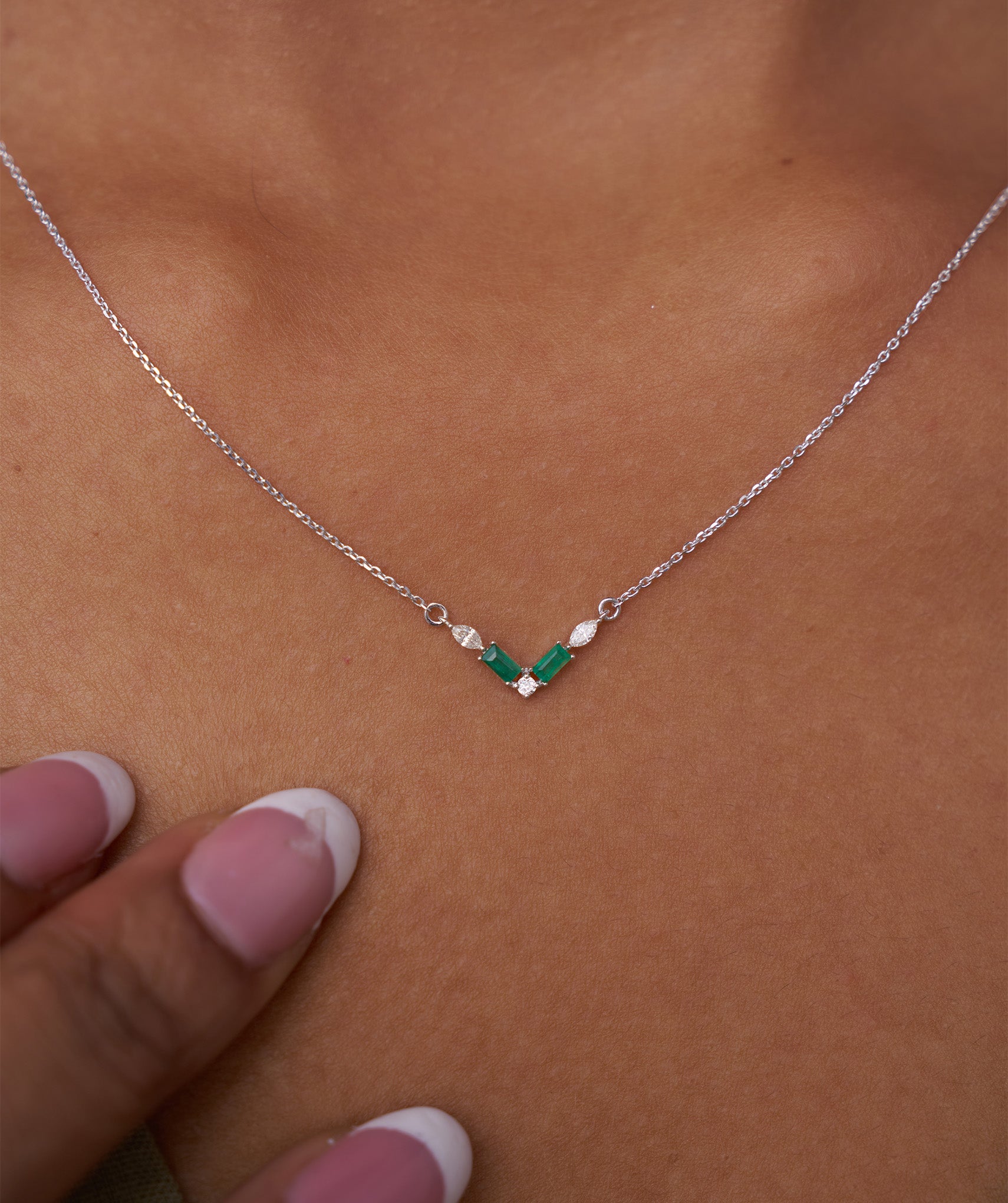 A minimalist yet striking piece, this 14K gold necklace showcases deep green baguette gemstones accented by marquise diamonds in a contemporary V design.