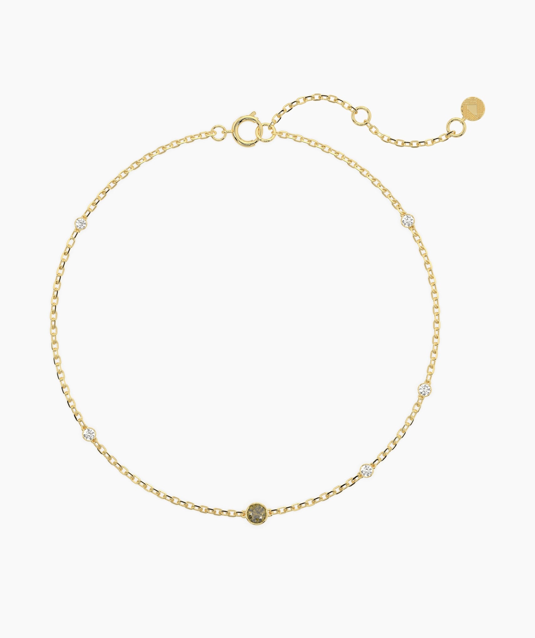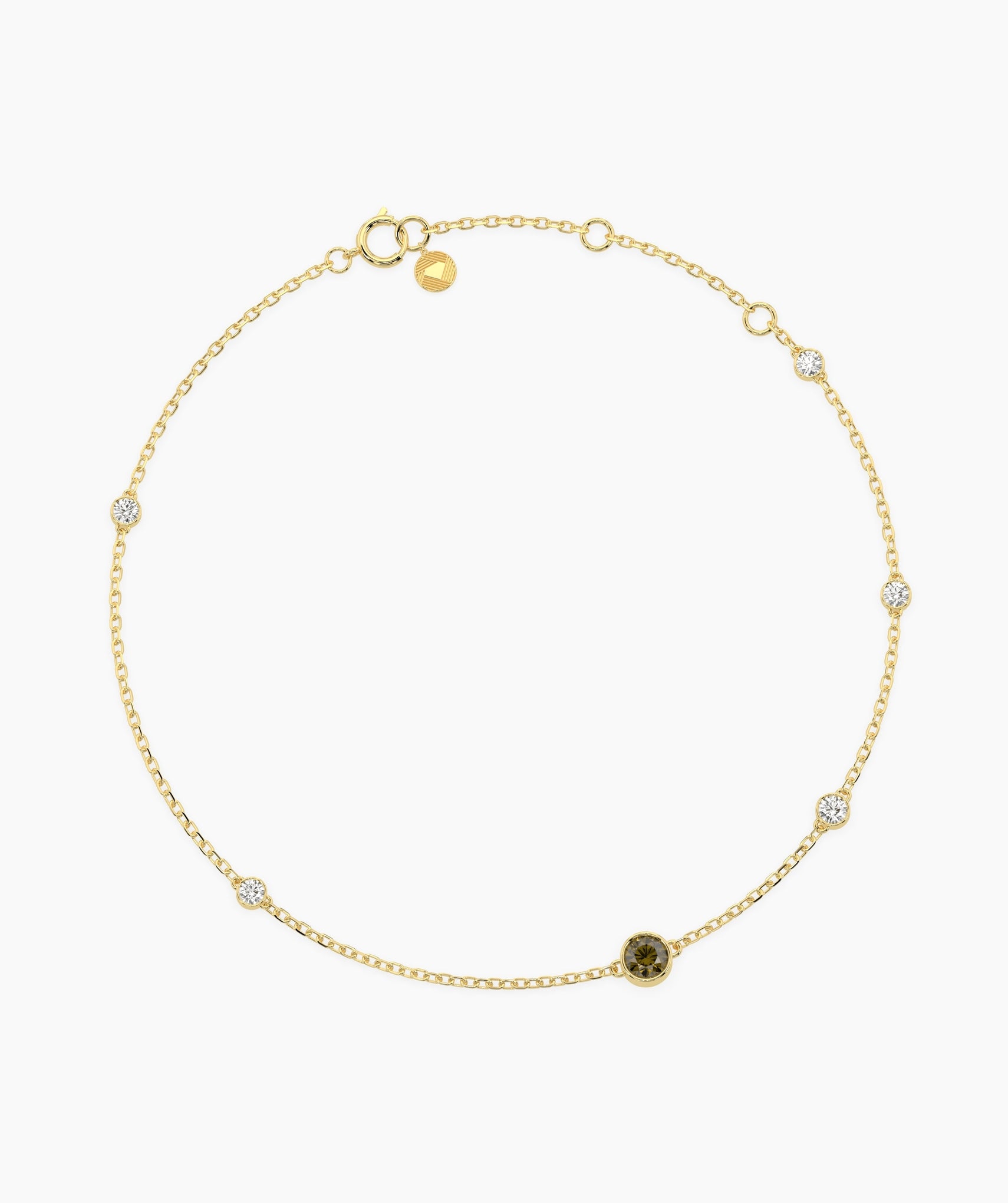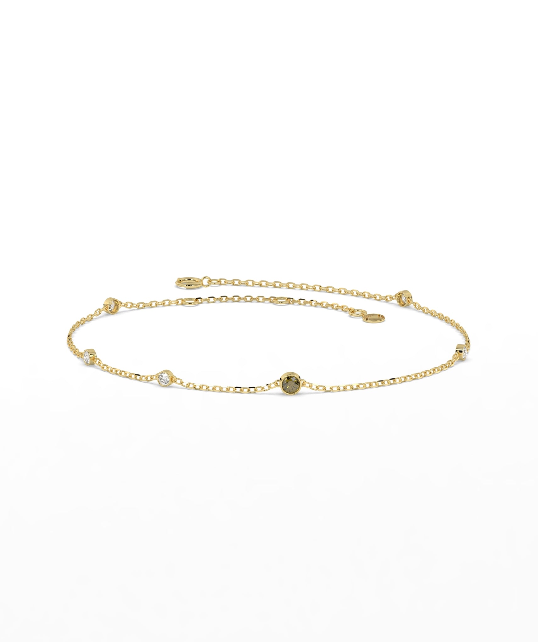 Add a subtle, hypnotic pop of color to your wrist stack. This refined station bracelet centers on a 0.05ct round green diamond natural and treated for a vibrant, earthy hue flanked by sparkling G-color white diamonds (0.08ct total) spaced along the chain. Each stone is securely held in a smooth bezel setting, creating a snag-free, low-profile design that is perfect for wearing underneath sleeves or layering with heavier cuffs. Crafted in 14K solid gold, the delicate 1.00mm chain features an adjustable length from 6 to 7 inches, ensuring a custom fit that stays in place all day. Whether you wear it as a solo statement of calm or mix it into a chaotic gold stack, it brings a fresh, modern edge to fine jewelry. Available in yellow, white, and rose gold.