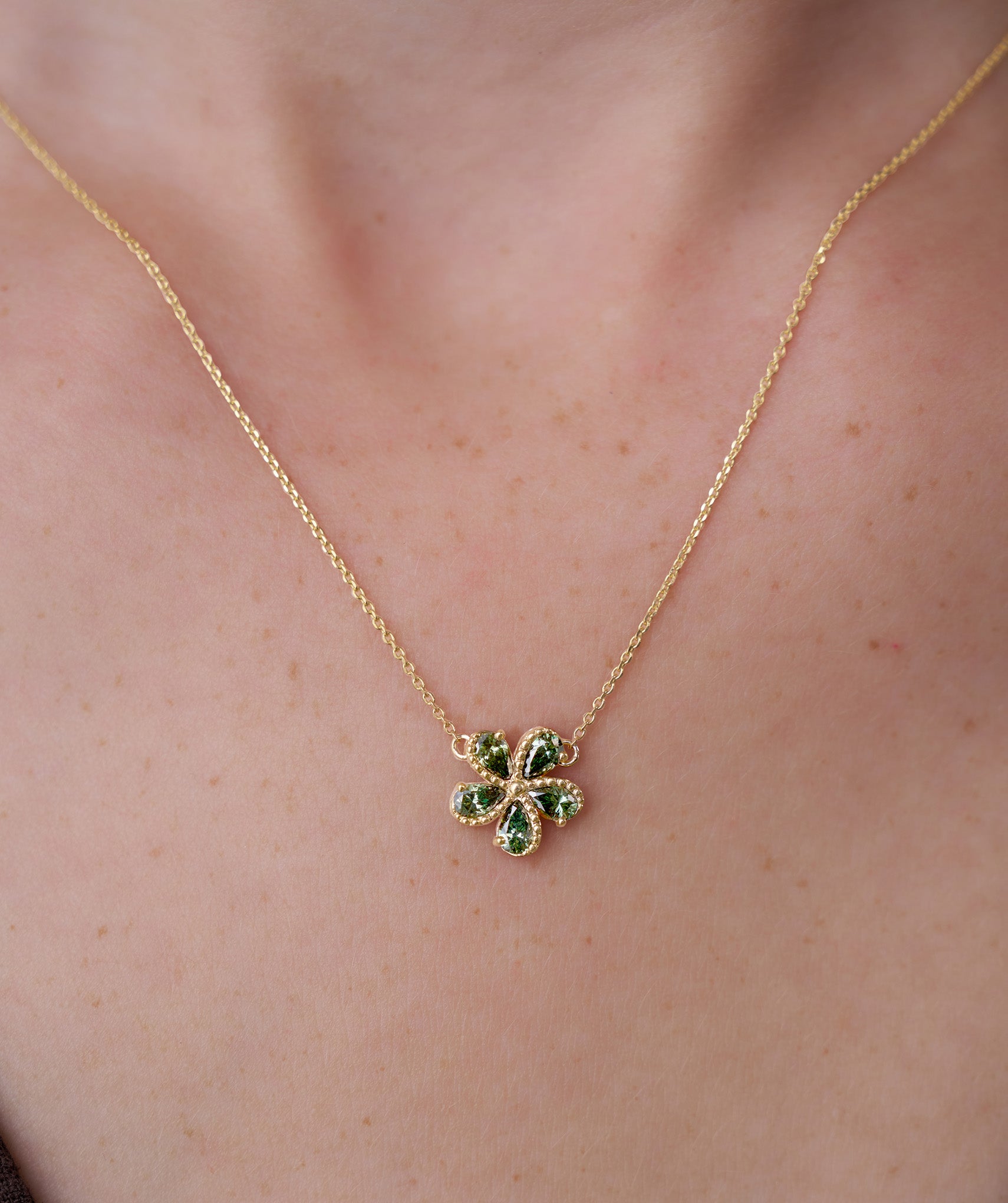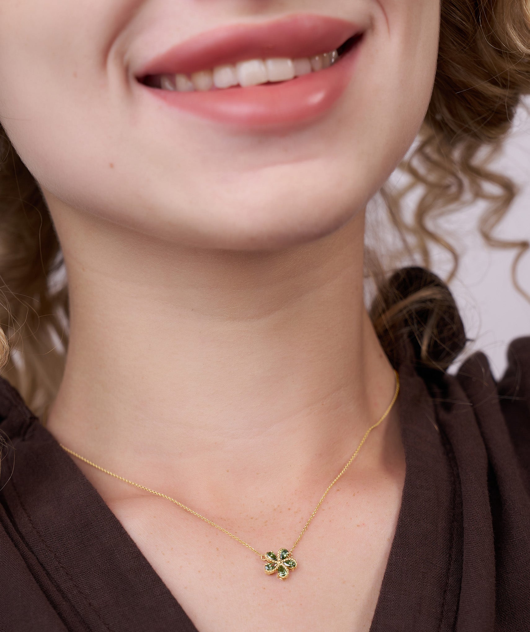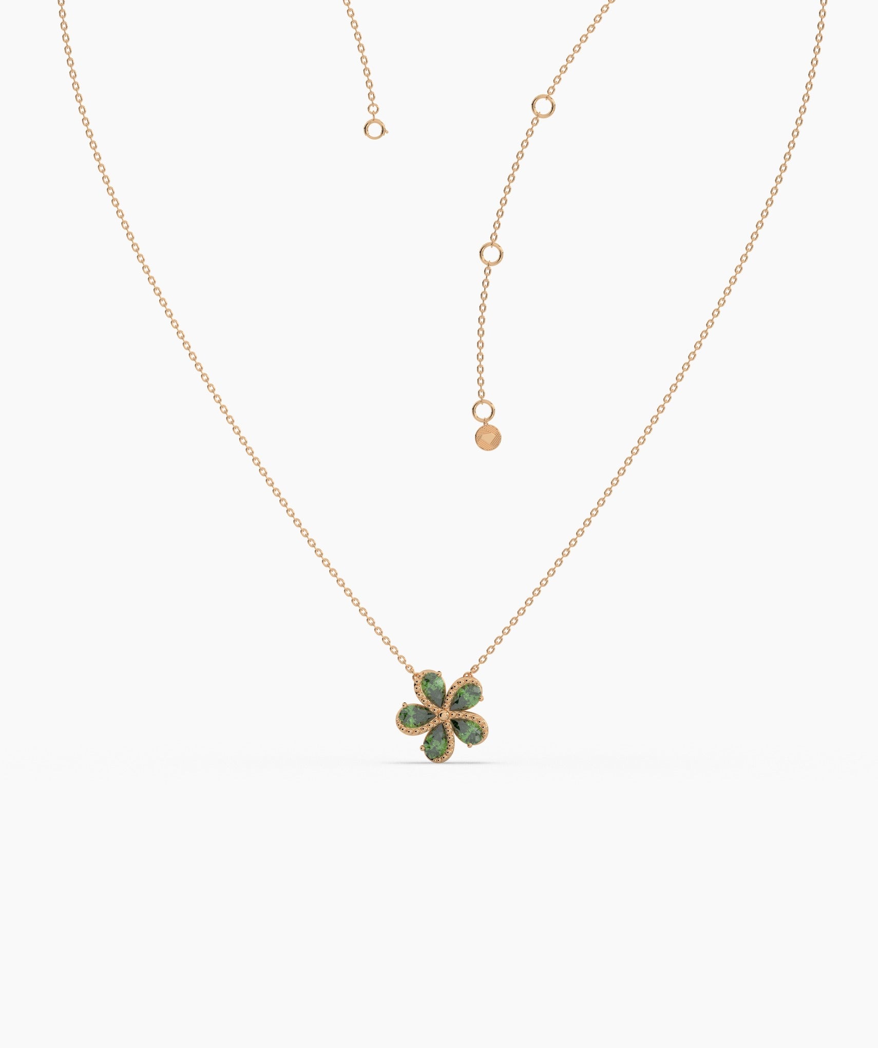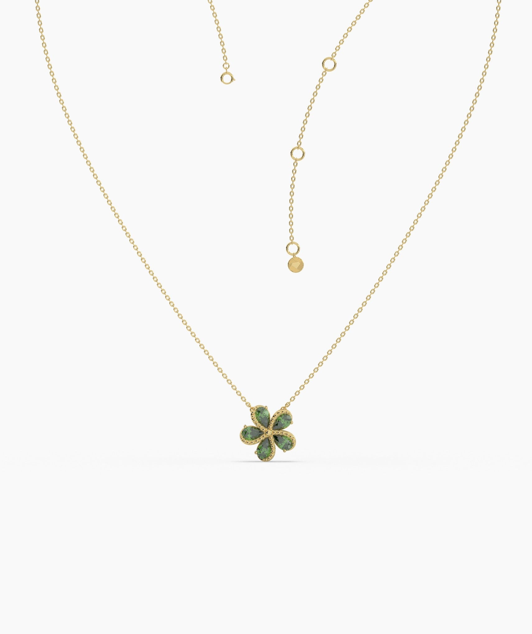 A nature-inspired floral pendant, crafted in solid 14K gold and adorned with vibrant green pear-cut gemstones, creating a timeless and elegant look.