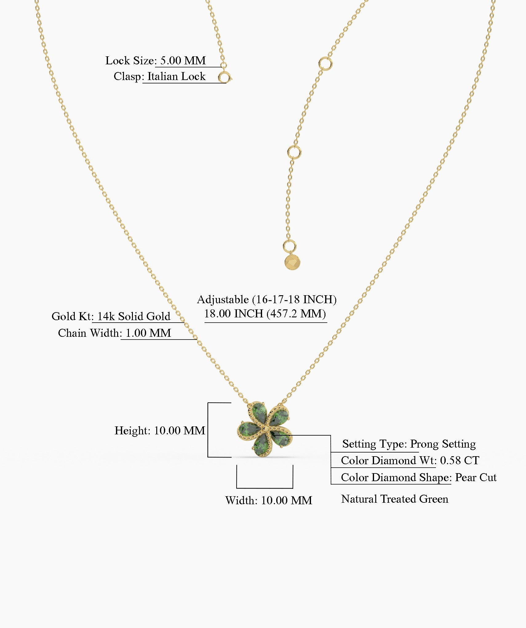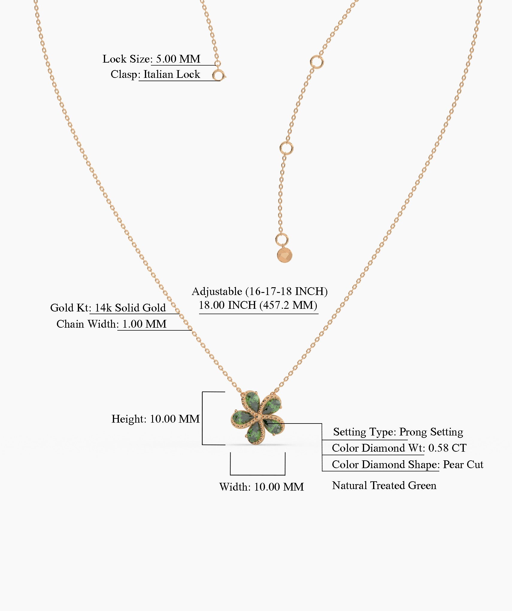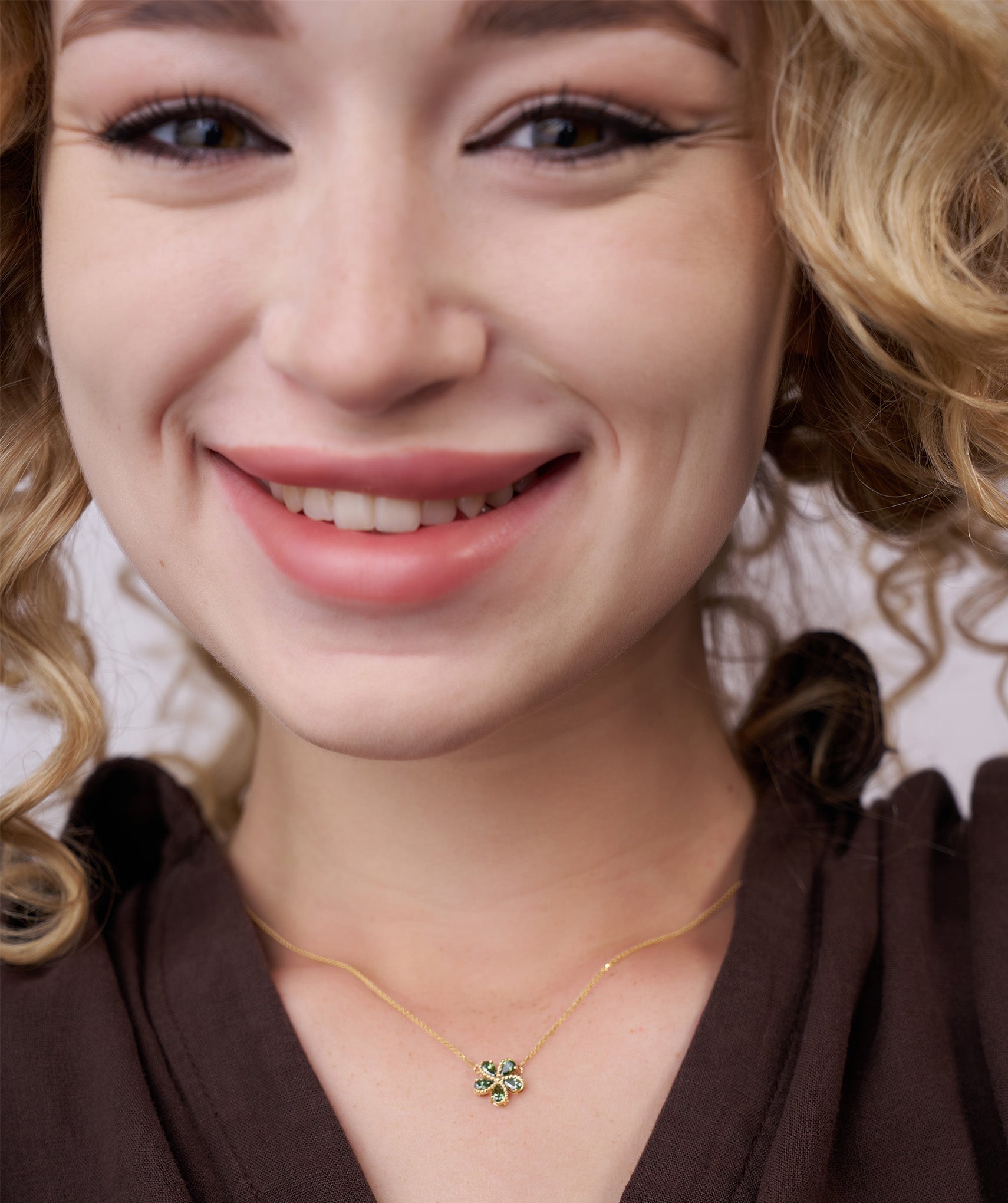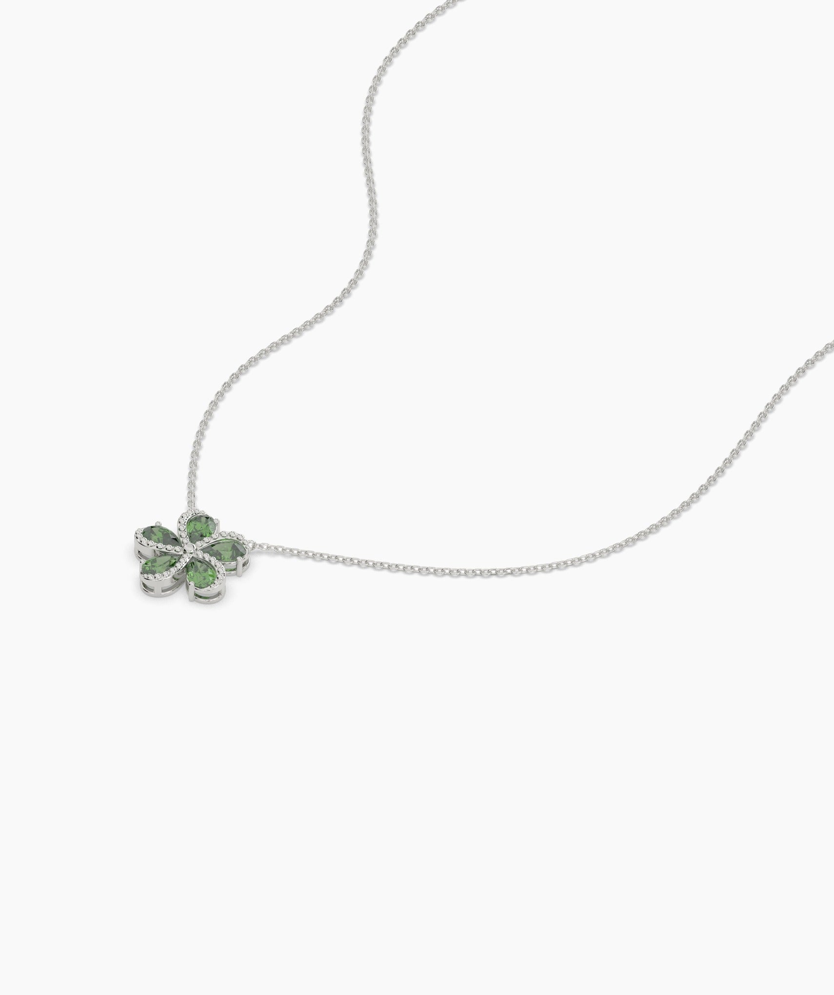 A nature-inspired floral pendant, crafted in solid 14K gold and adorned with vibrant green pear-cut gemstones, creating a timeless and elegant look.