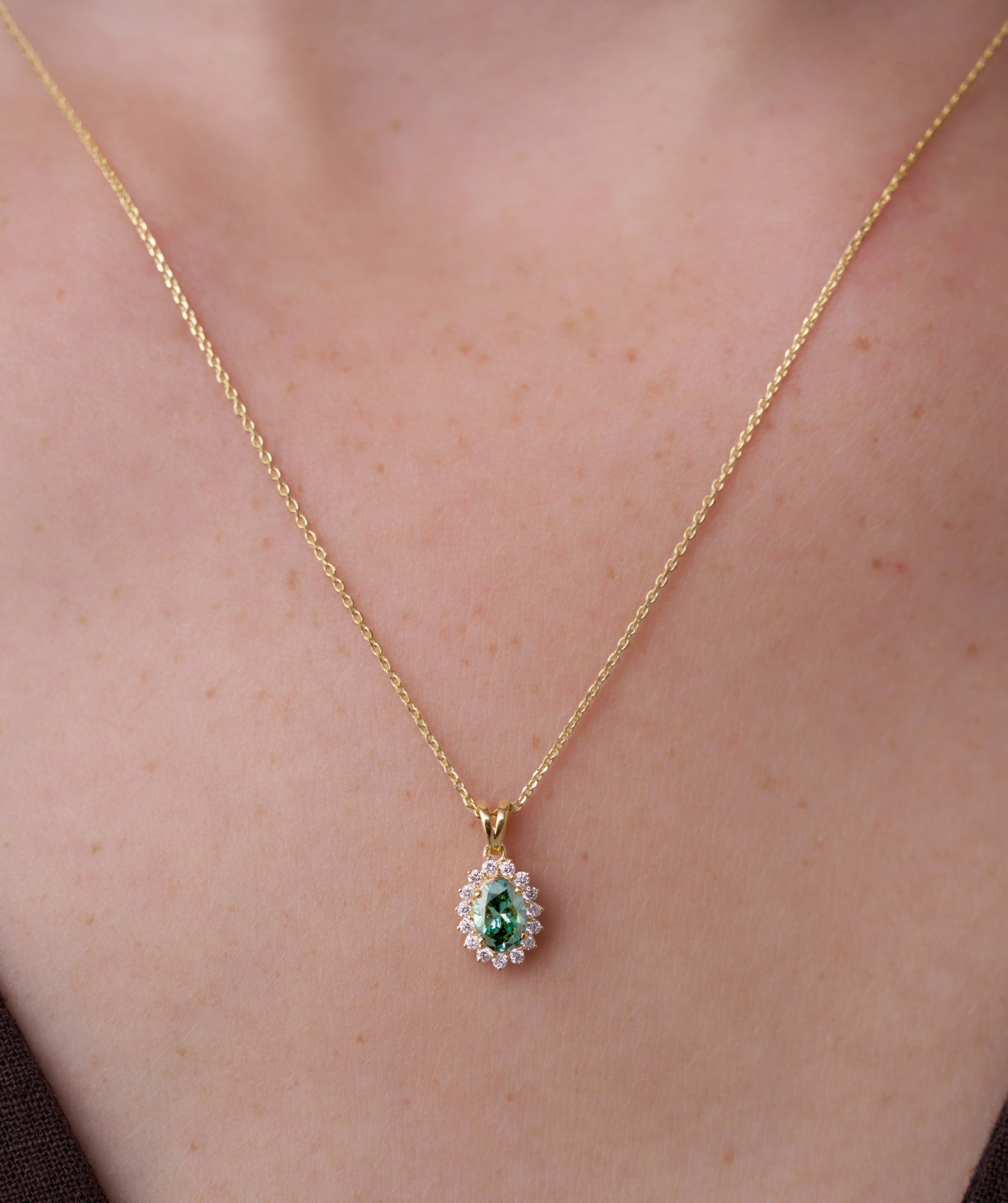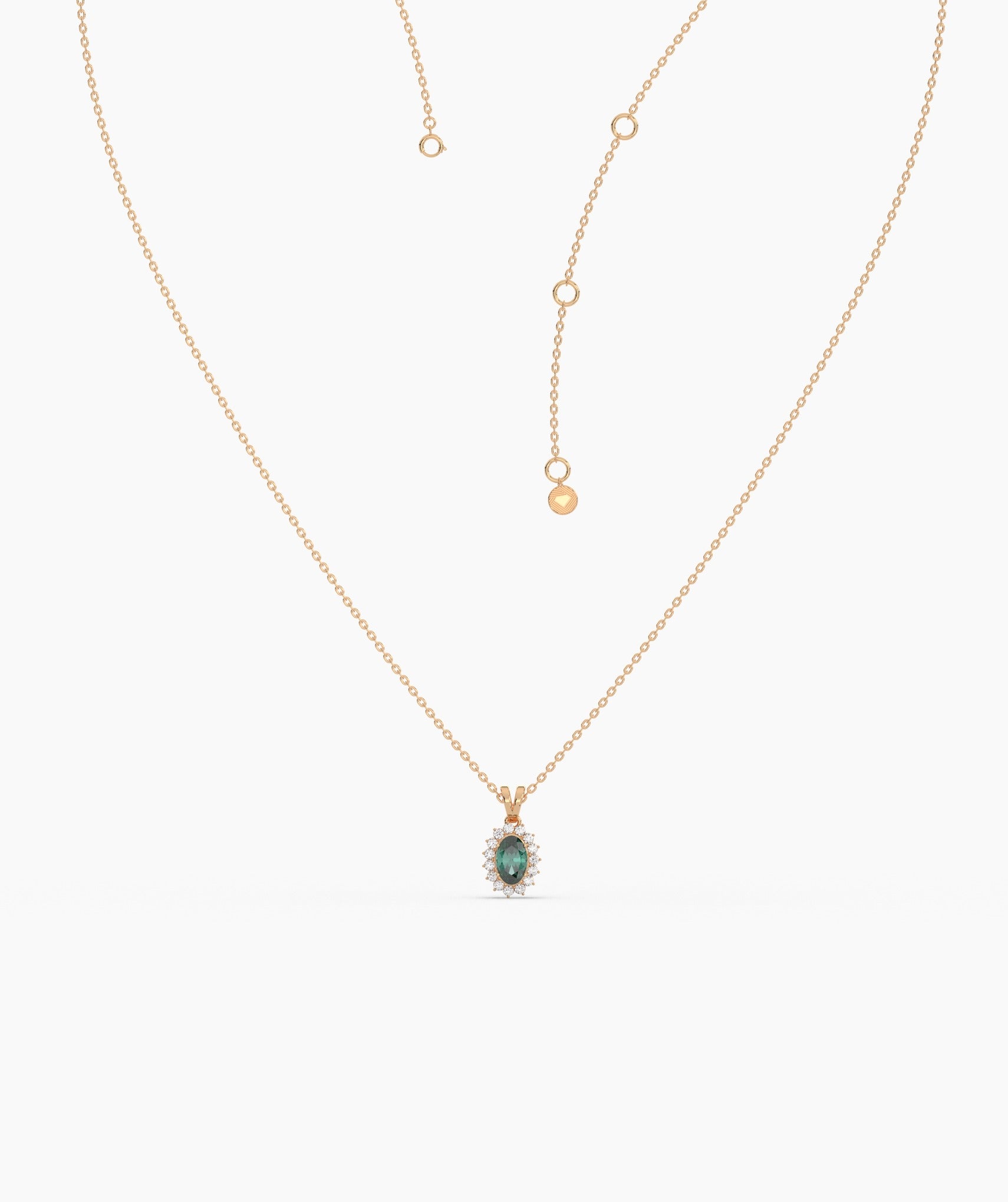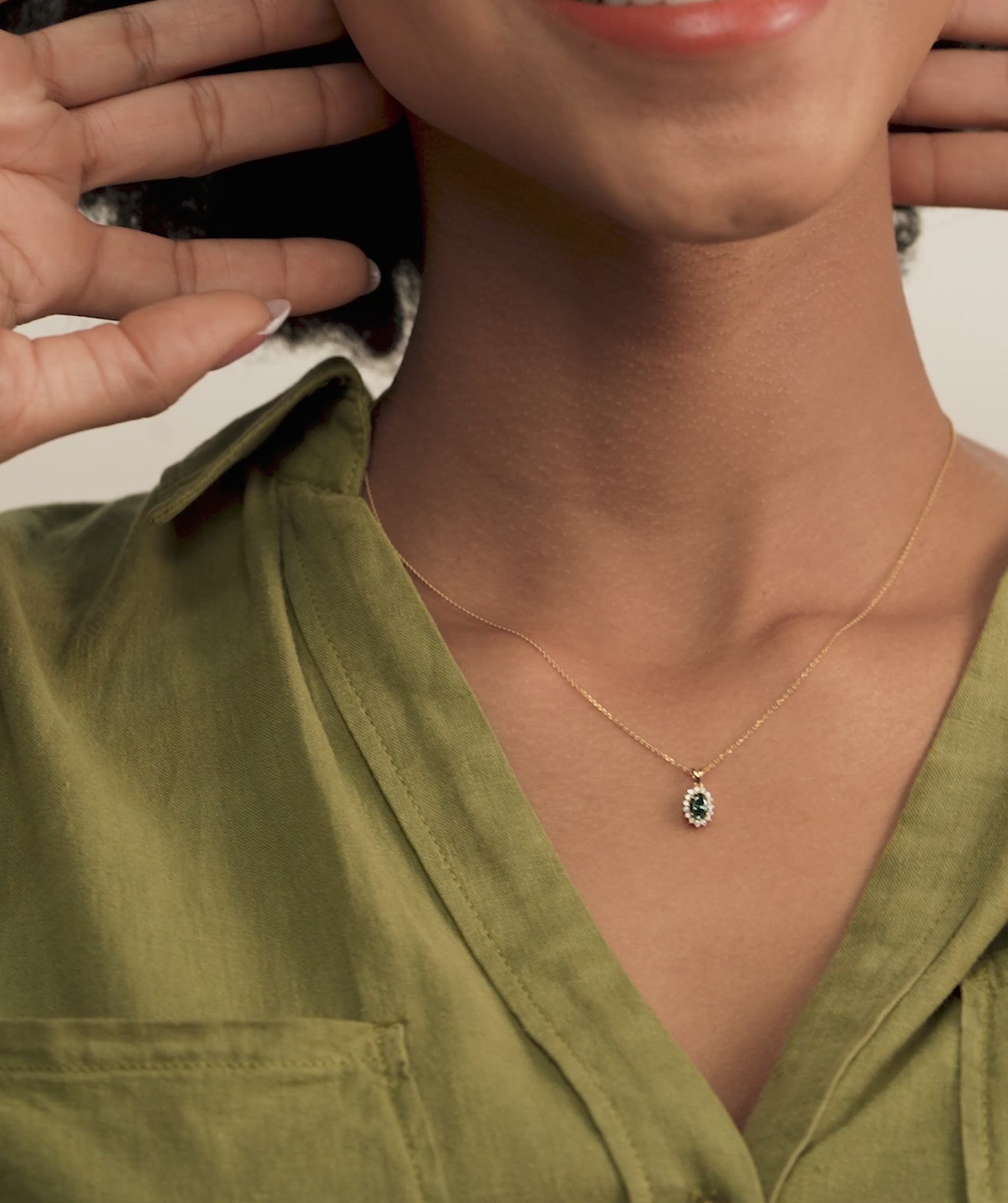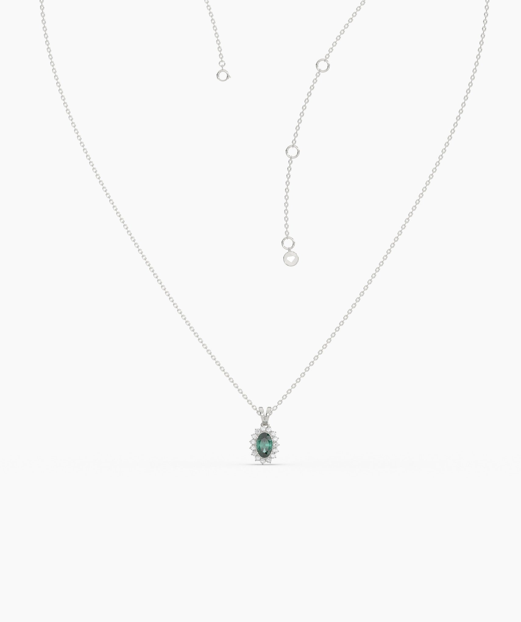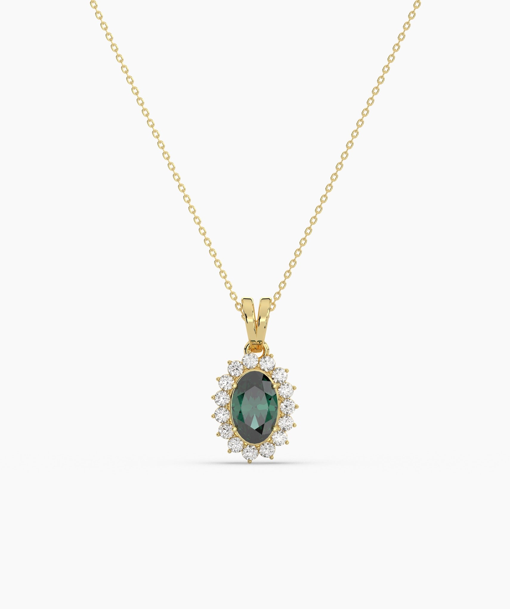 Elevate your style with this regal oval pendant, featuring a deep green centerpiece framed by luminous stones in a classic halo design.