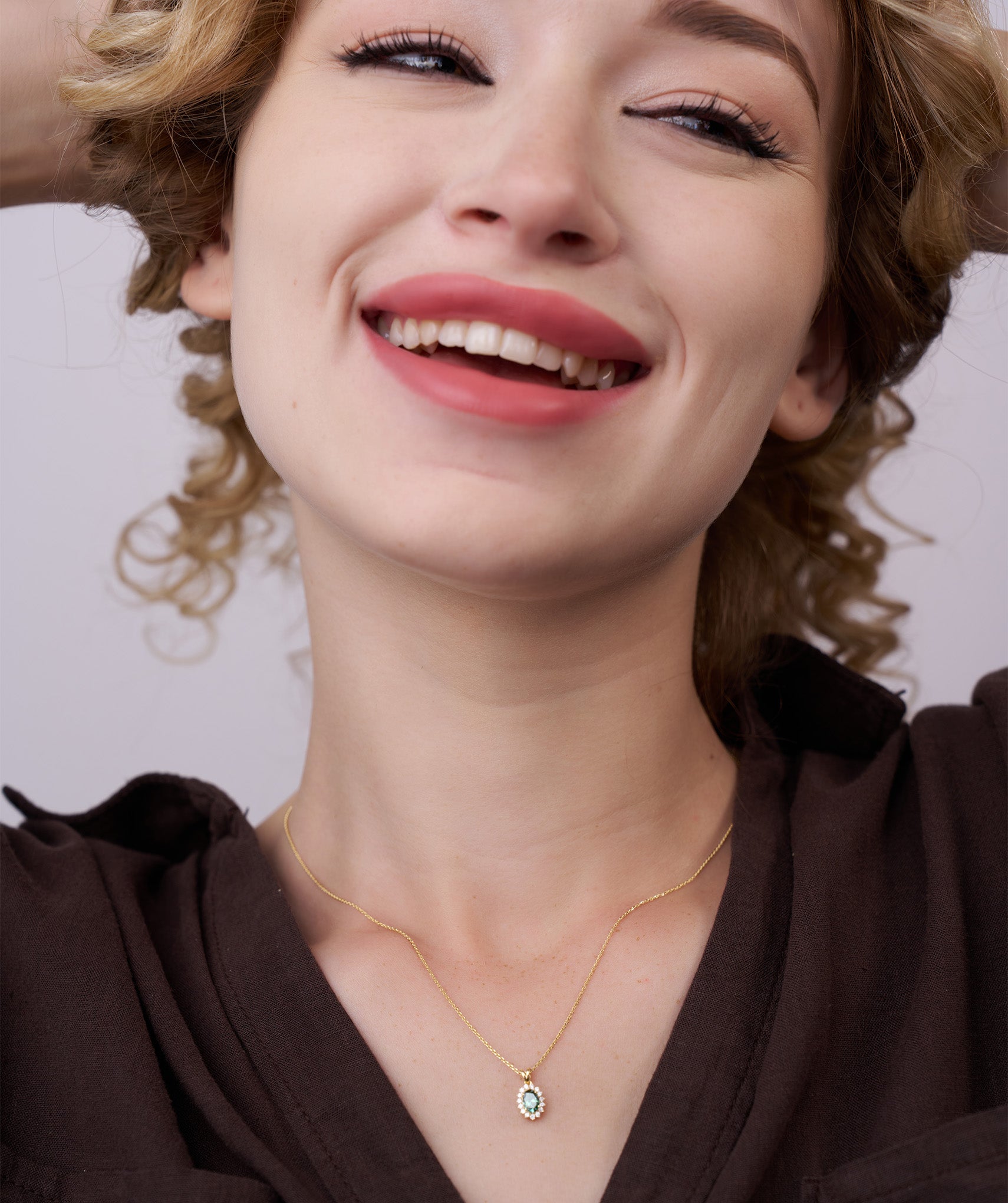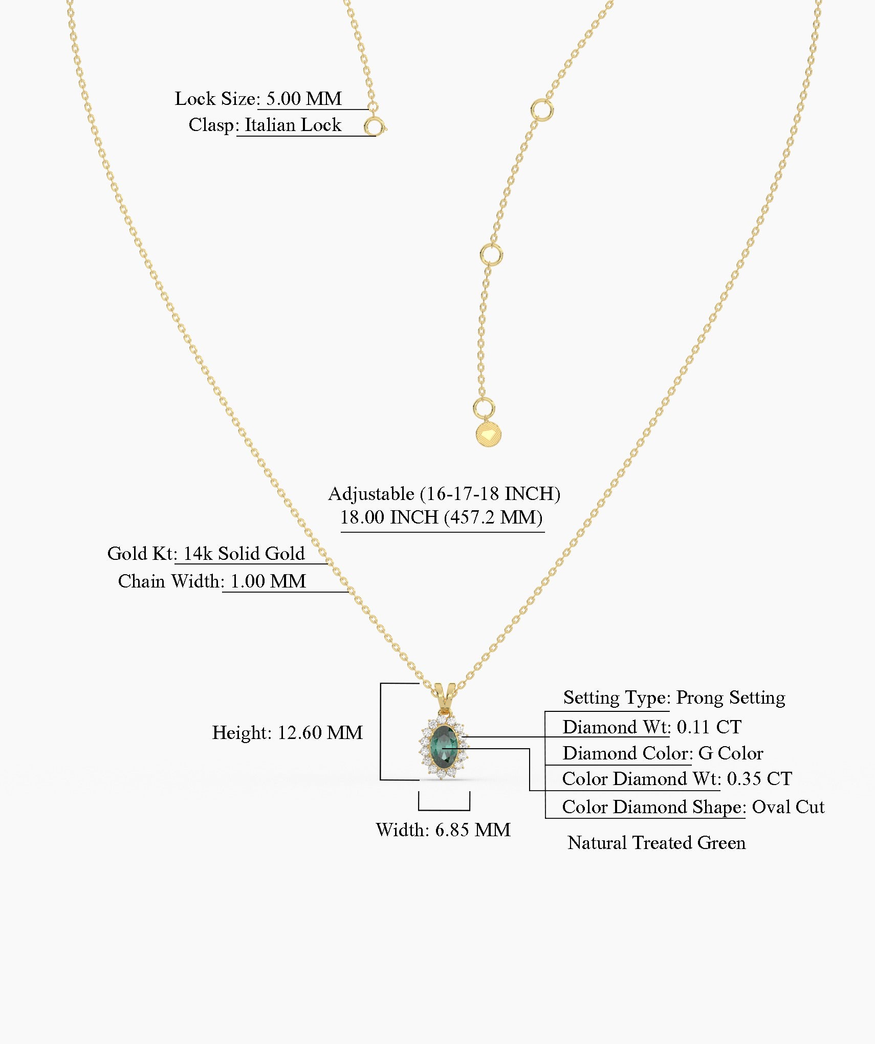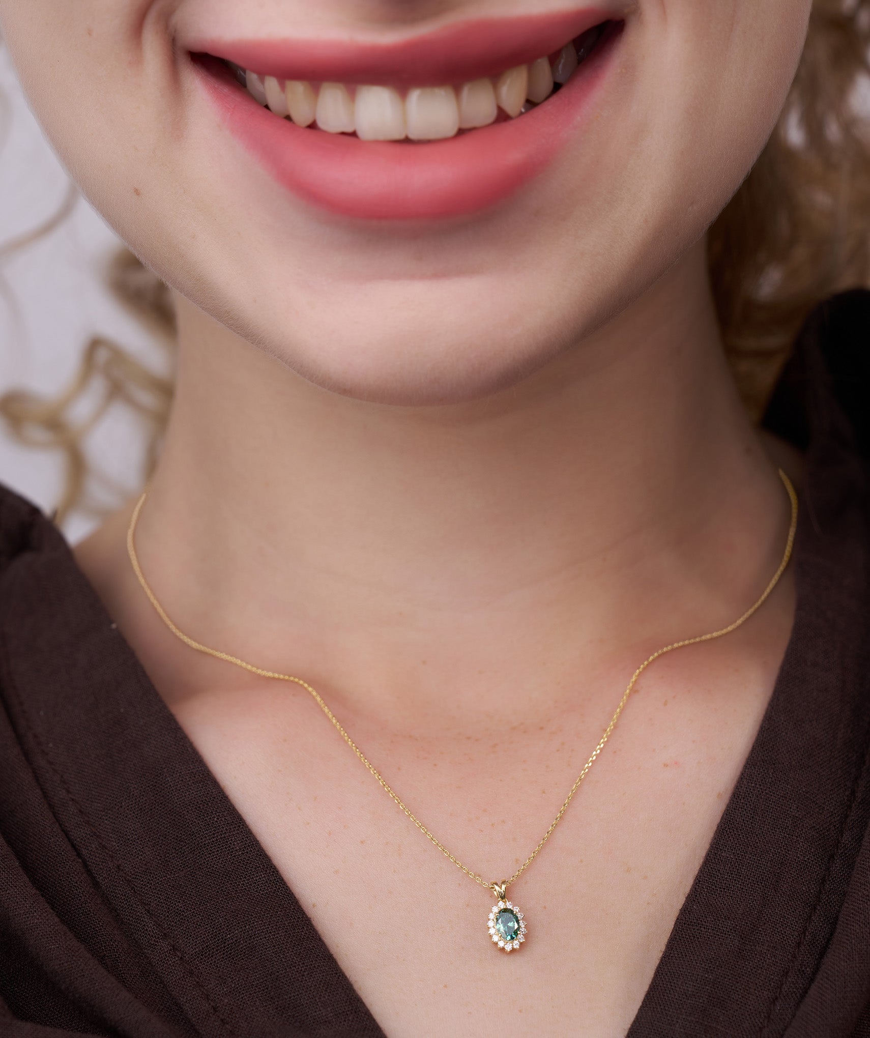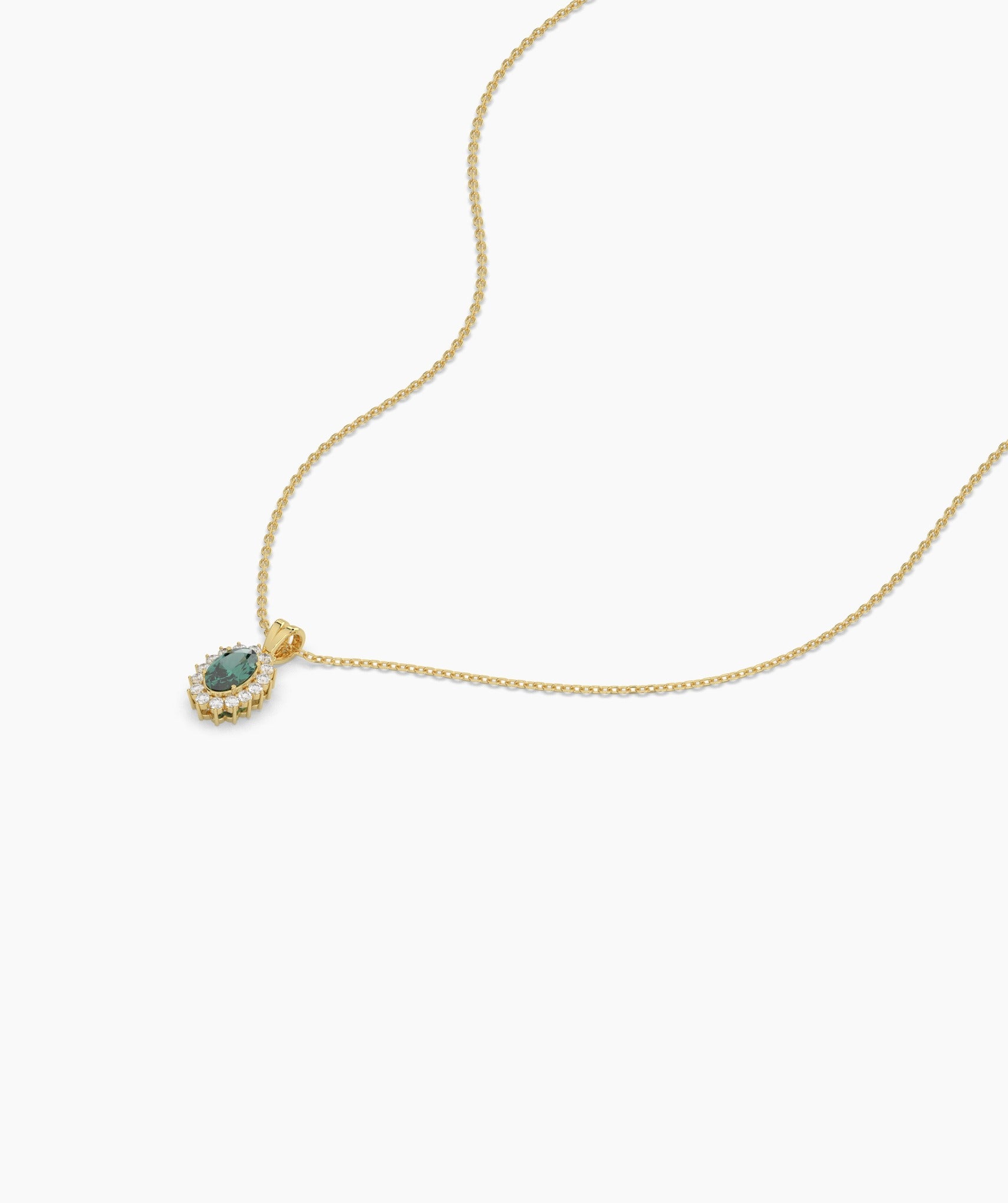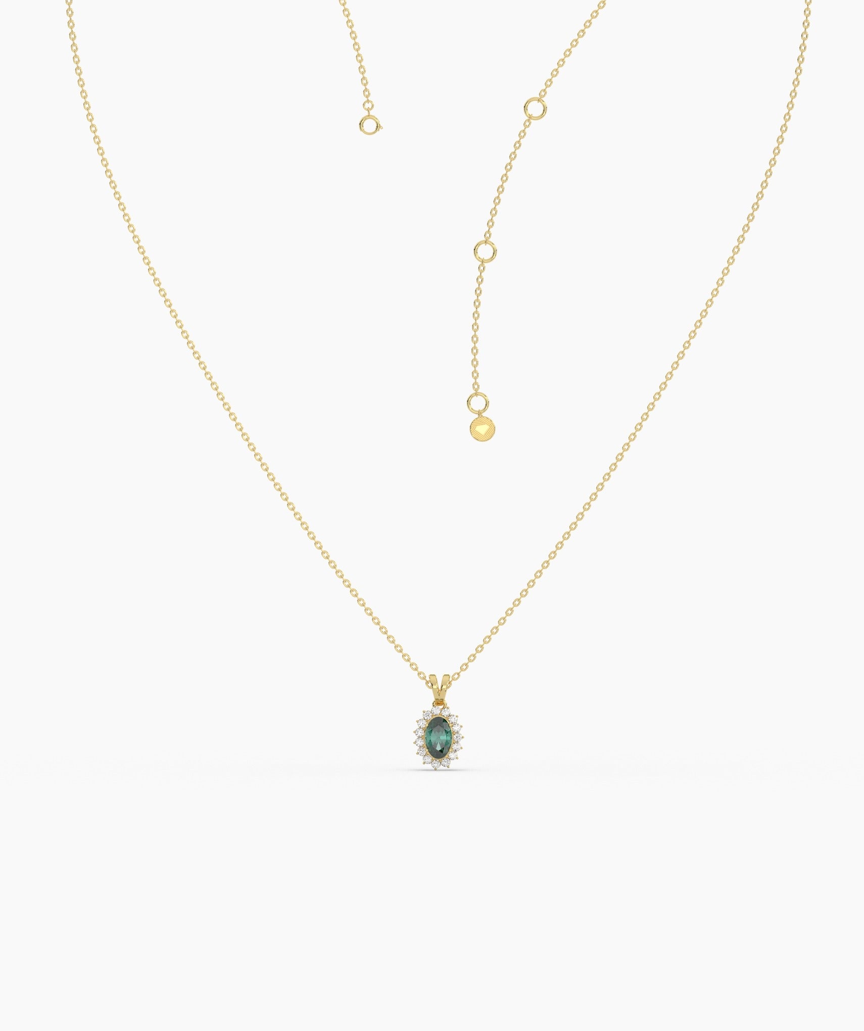 Elevate your style with this regal oval pendant, featuring a deep green centerpiece framed by luminous stones in a classic halo design.