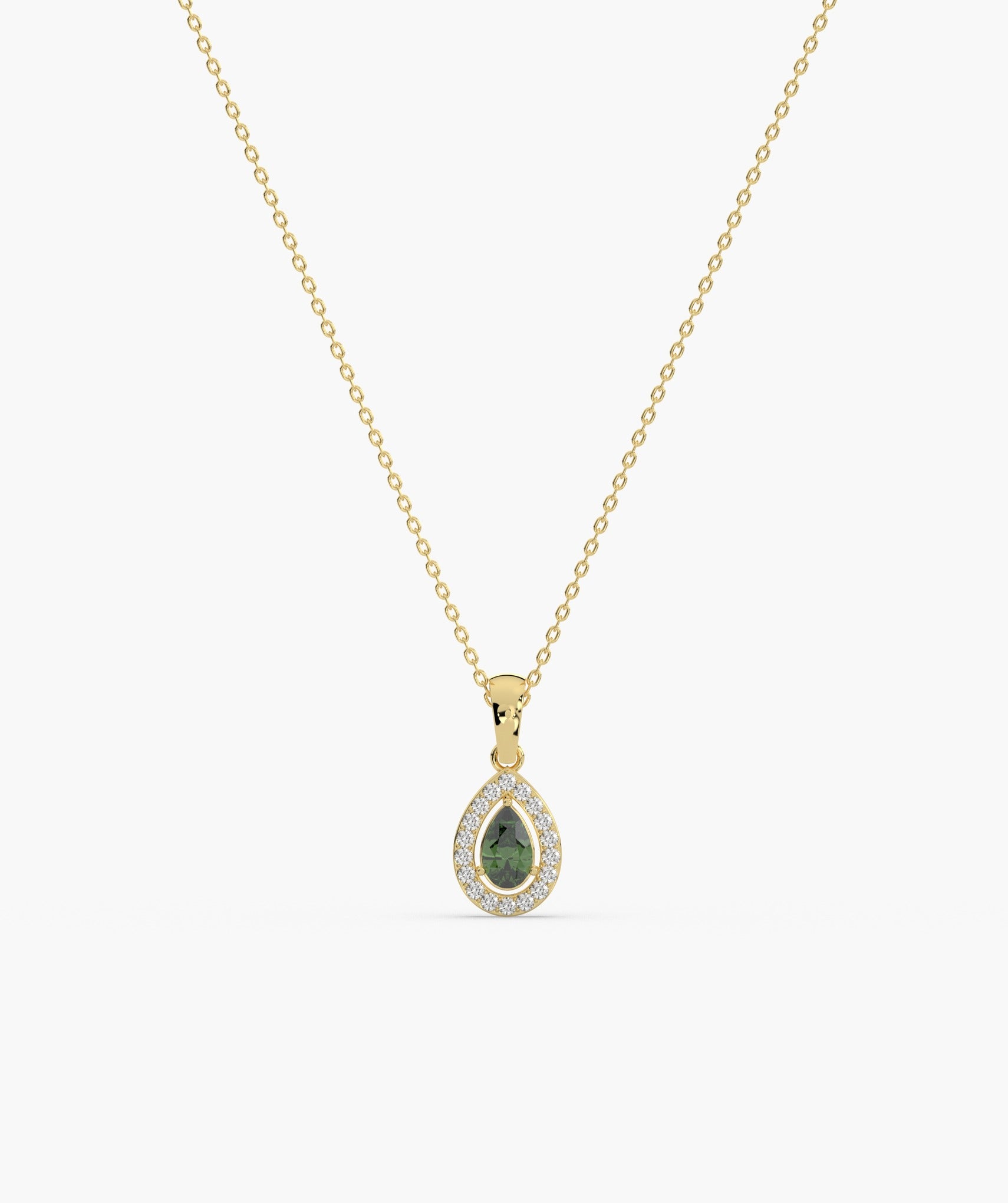Exquisite 14K gold necklace showcasing a teardrop emerald surrounded by a dazzling diamond halo, perfect for adding a touch of elegance to any ensemble.