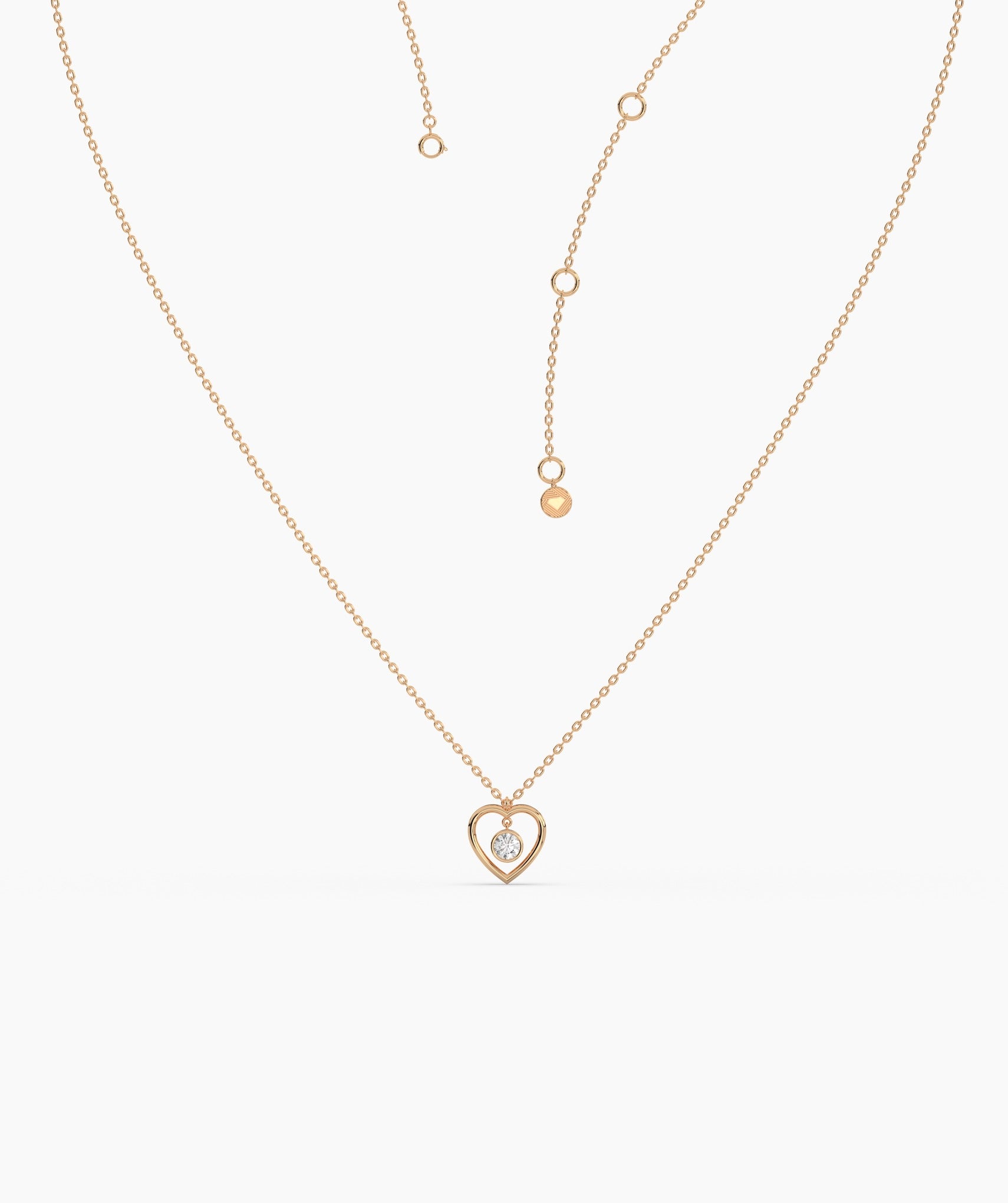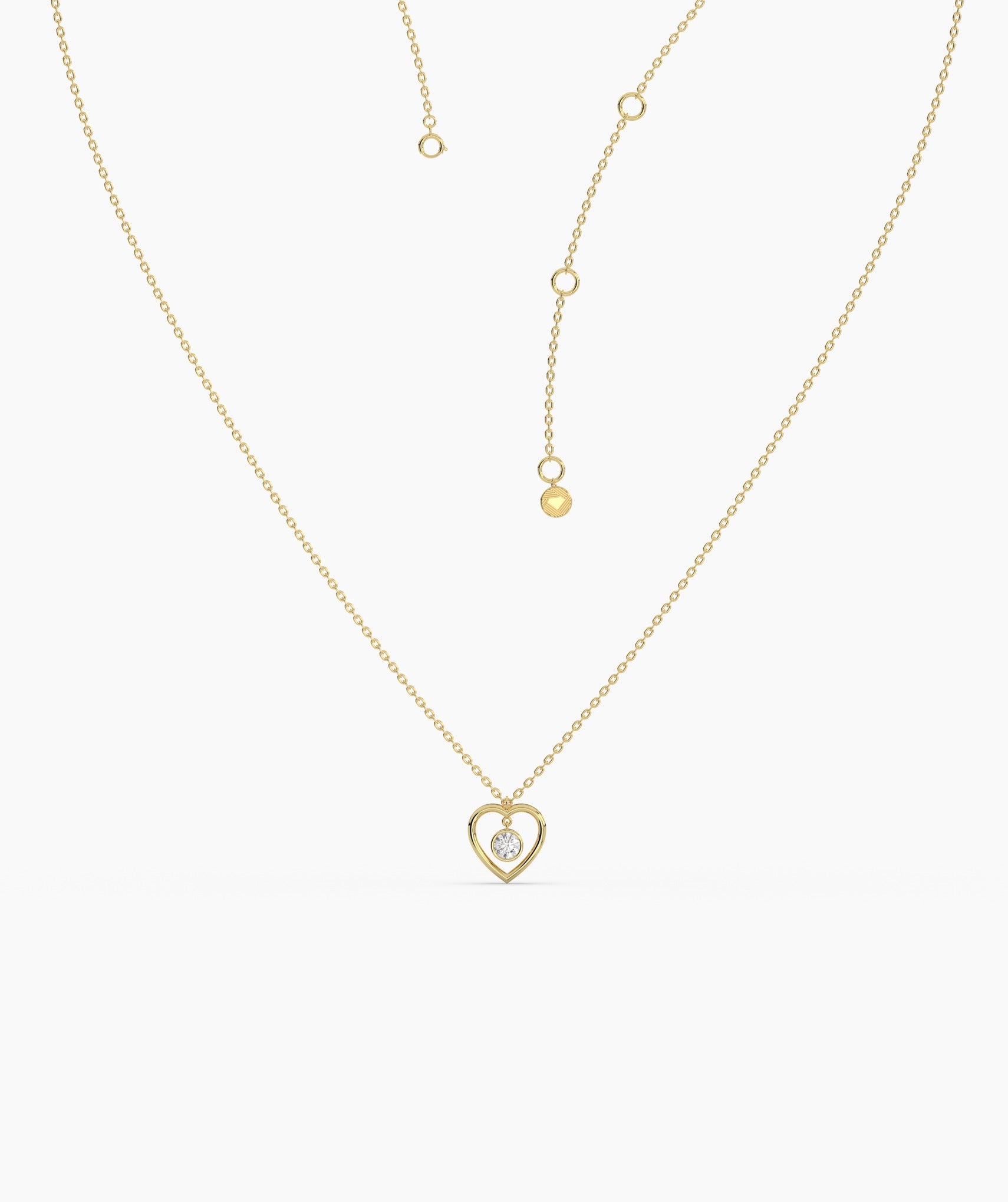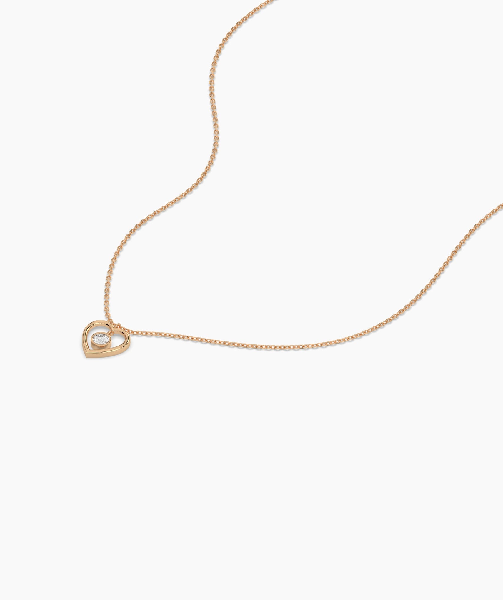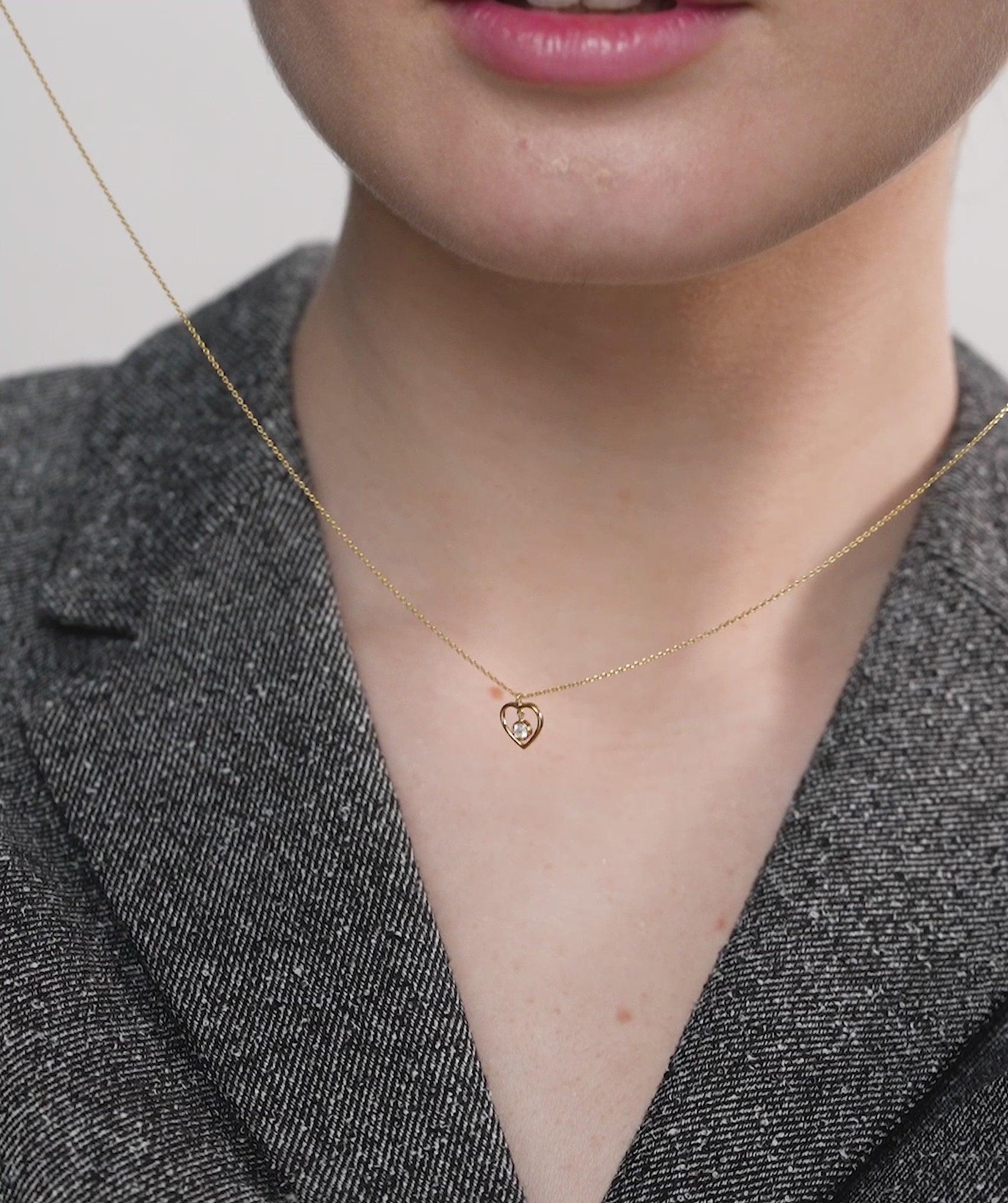 This delicate gold necklace showcases an open-heart design with a shimmering floating diamond at its center.