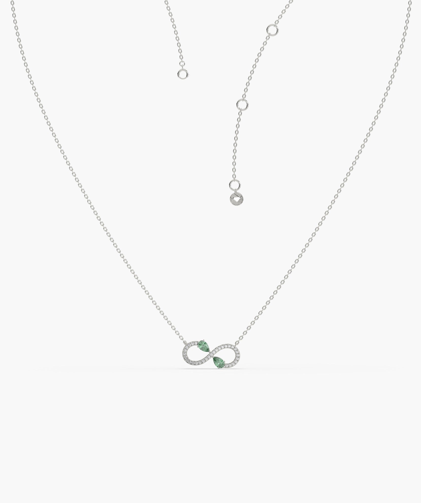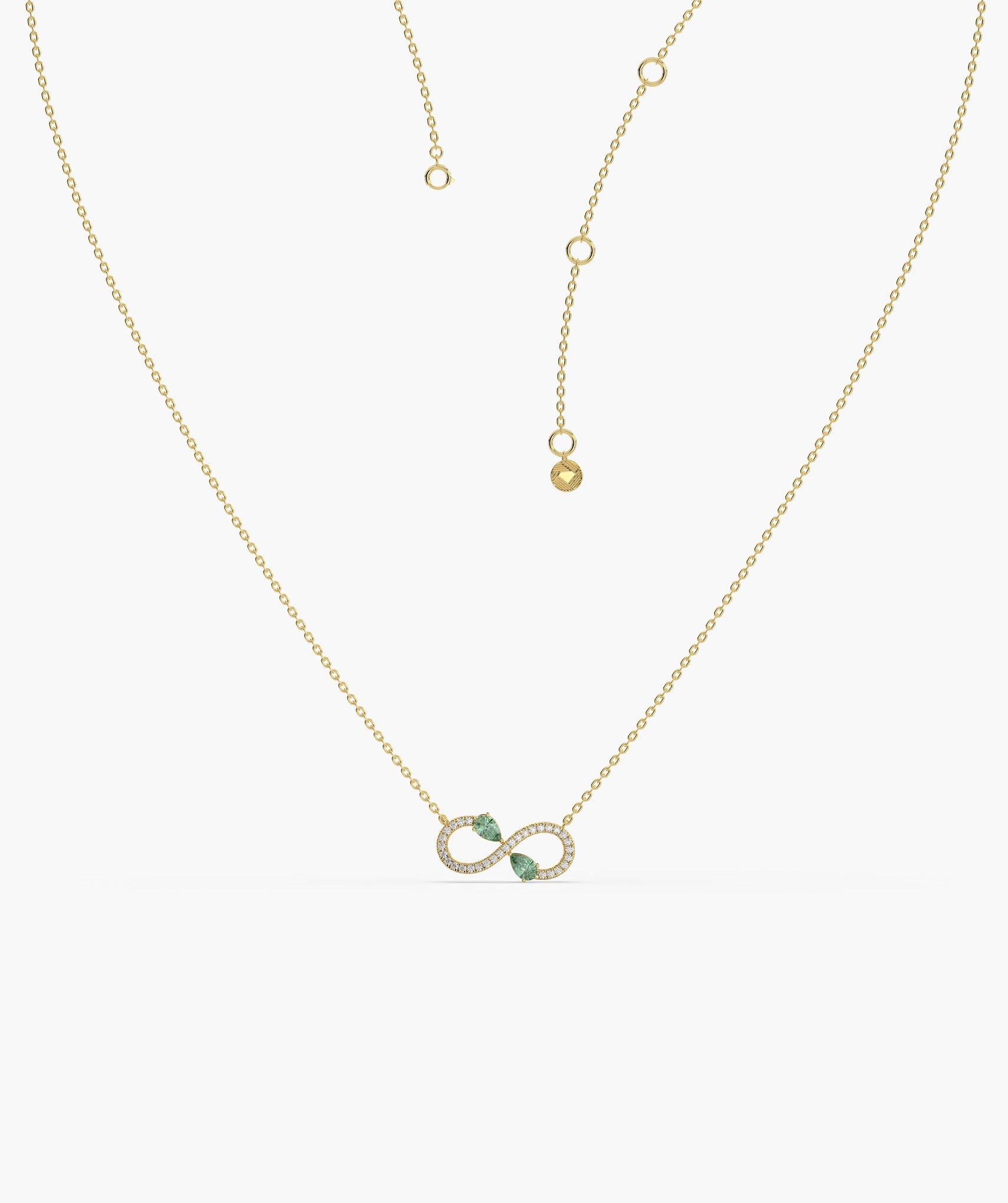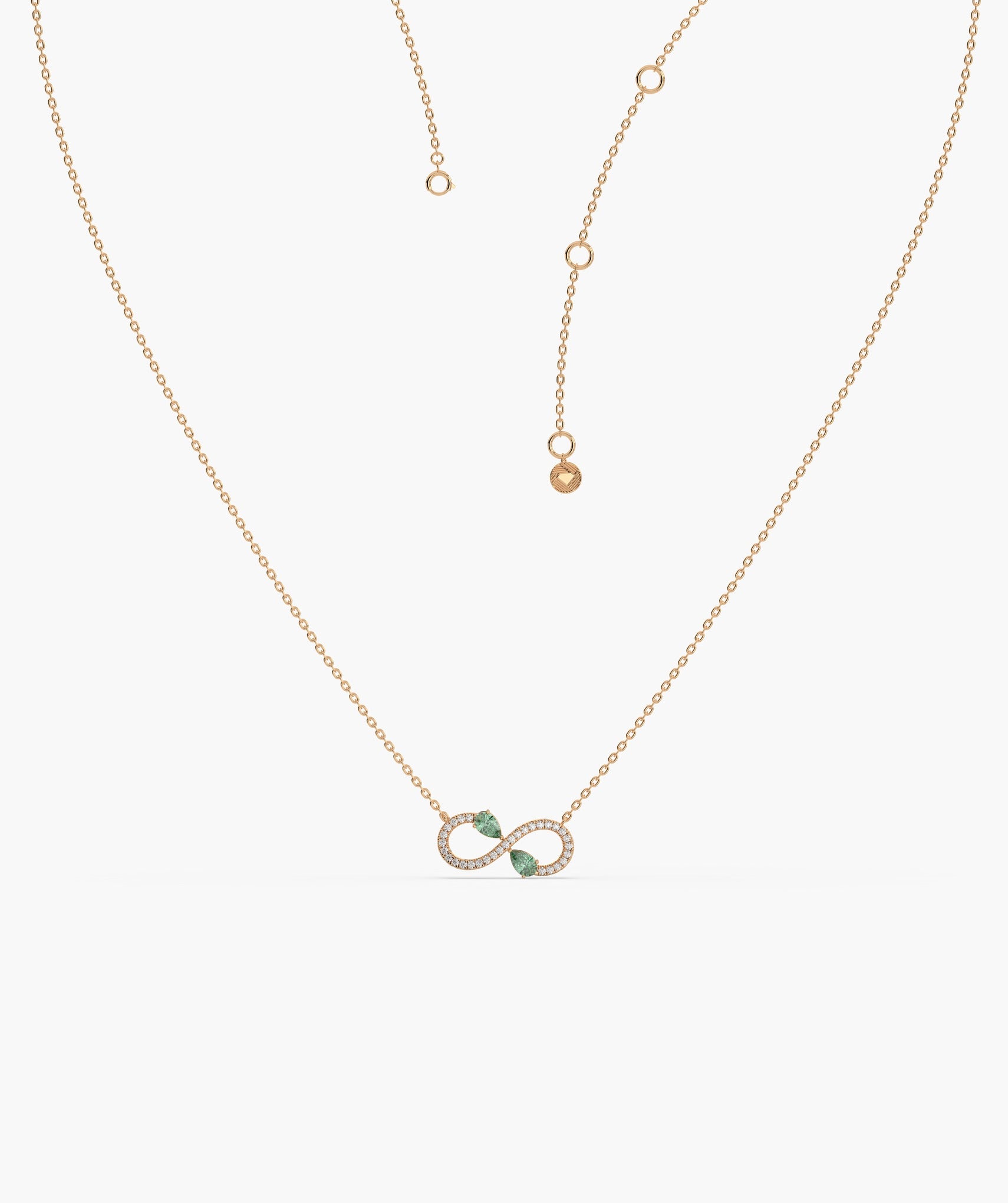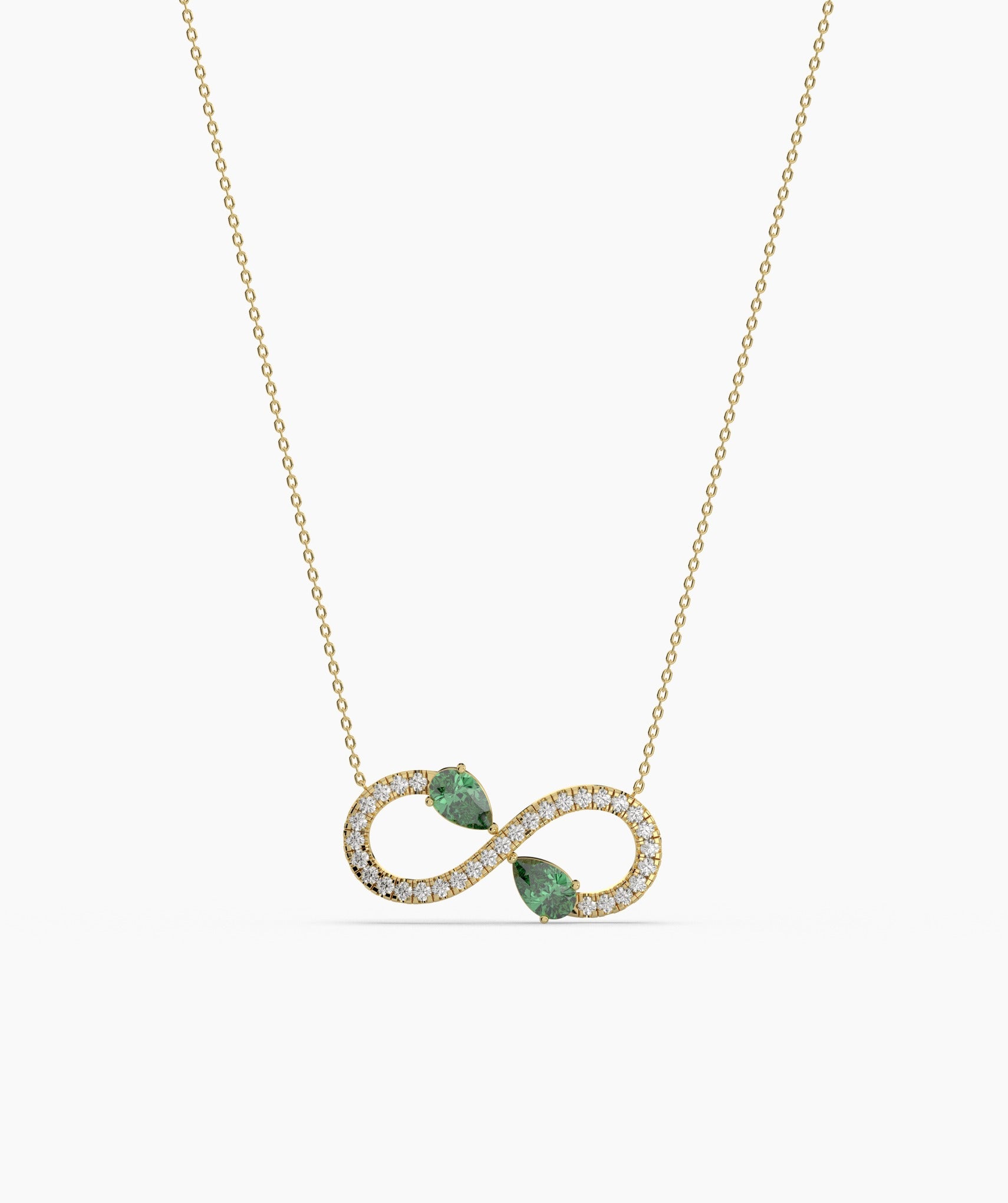 This 14K solid gold necklace features a diamond-studded infinity symbol adorned with vibrant pear-shaped diamond accents.