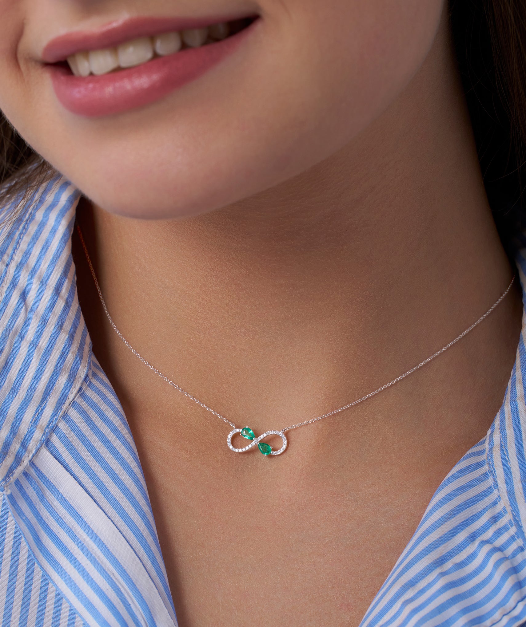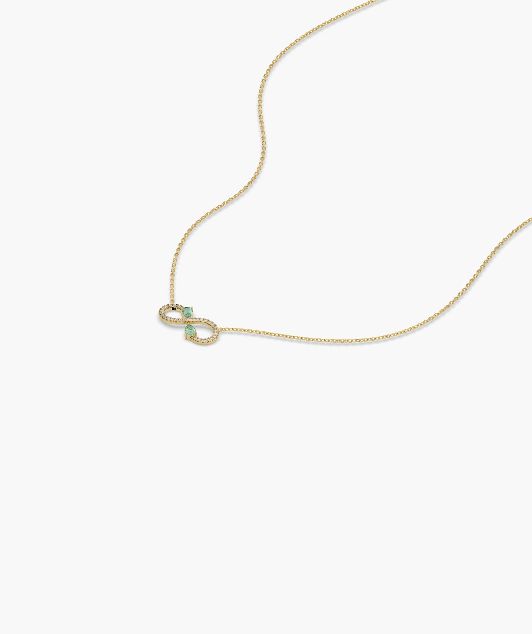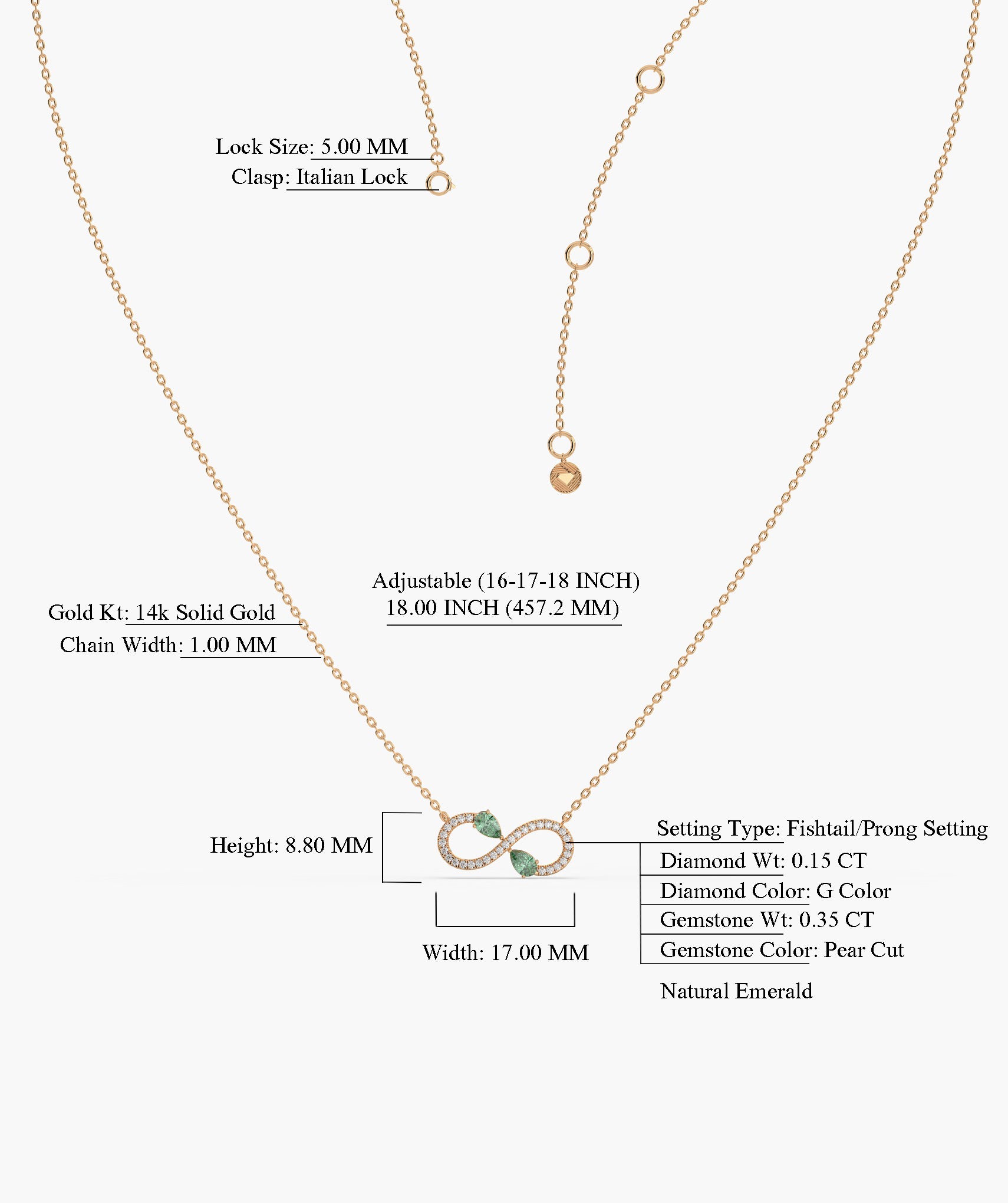 This 14K solid gold necklace features a diamond-studded infinity symbol adorned with vibrant pear-shaped diamond accents.