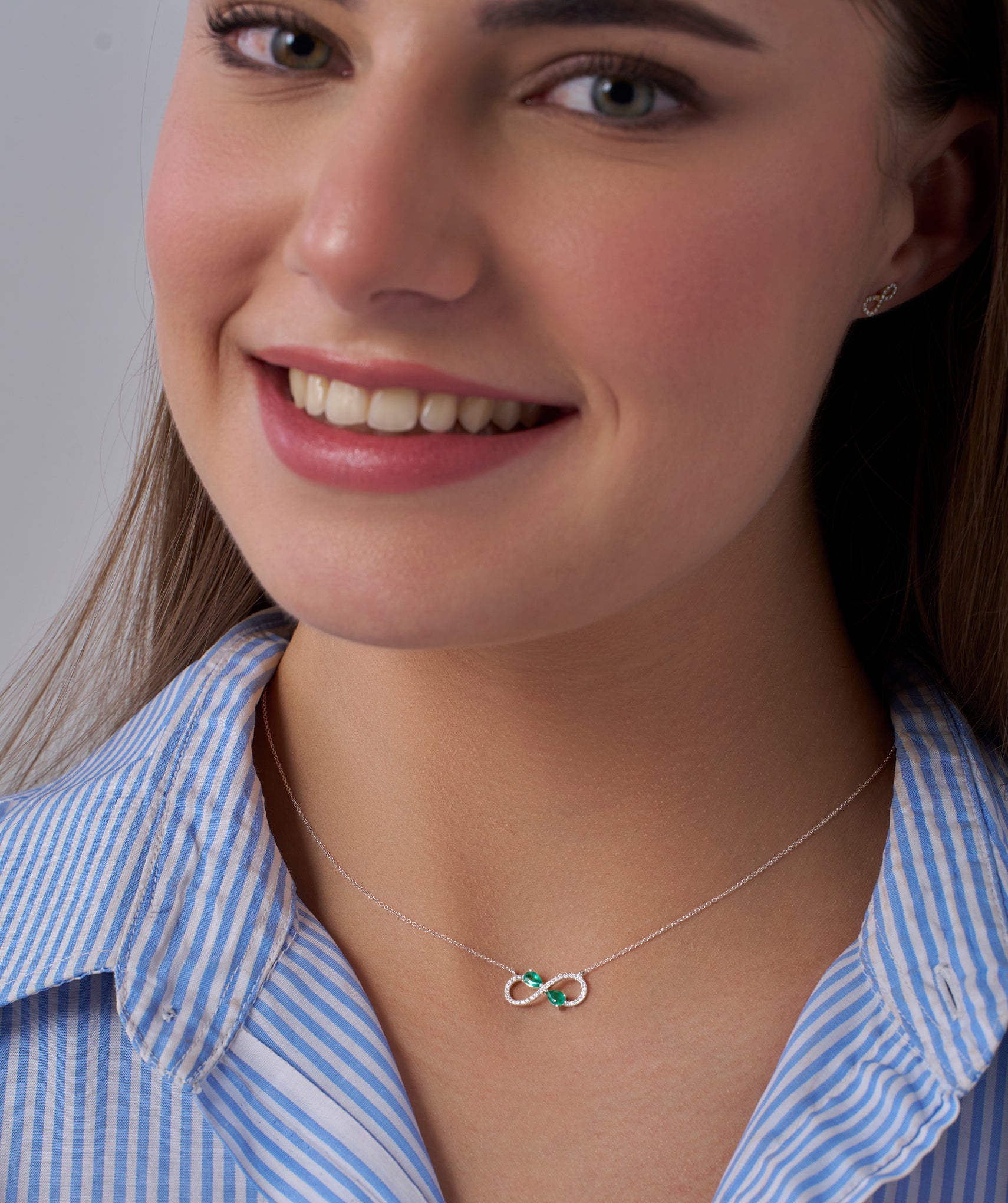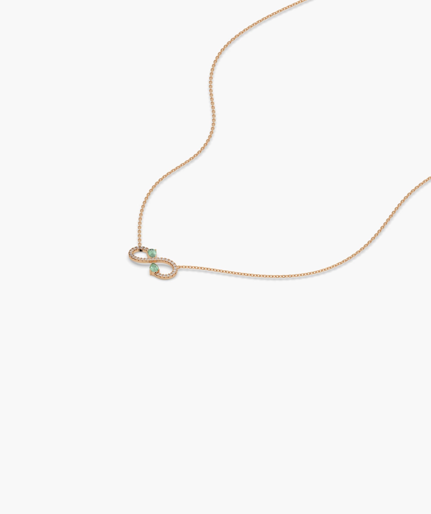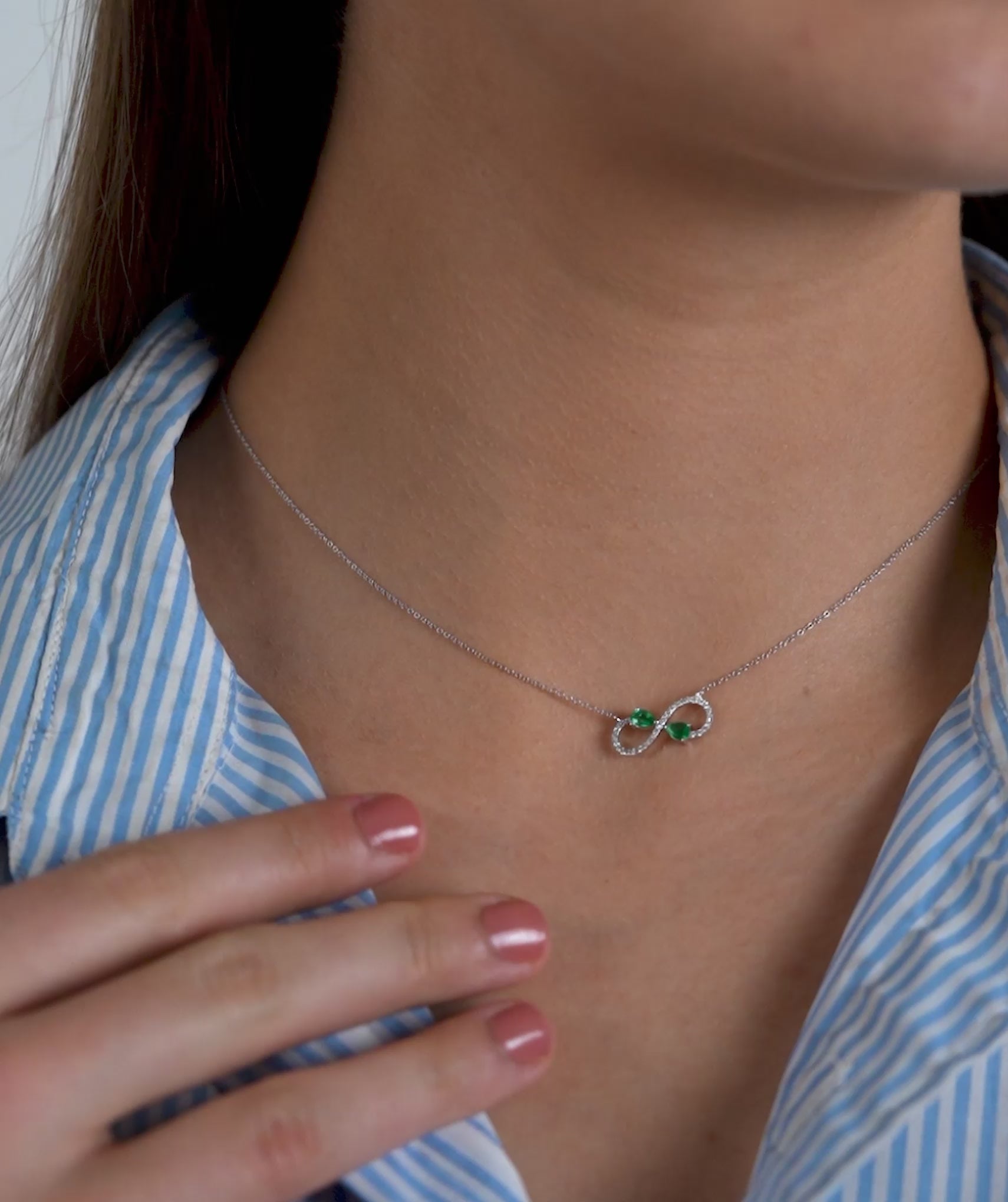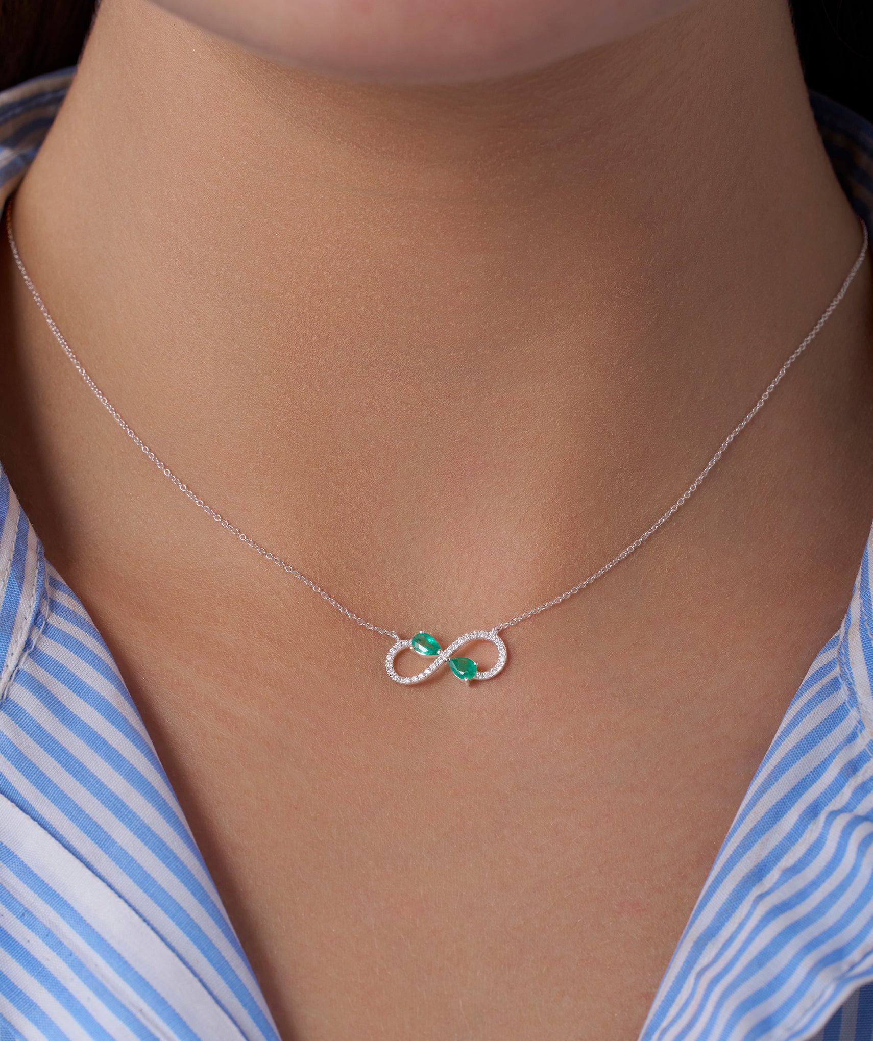 This 14K solid gold necklace features a diamond-studded infinity symbol adorned with vibrant pear-shaped diamond accents.