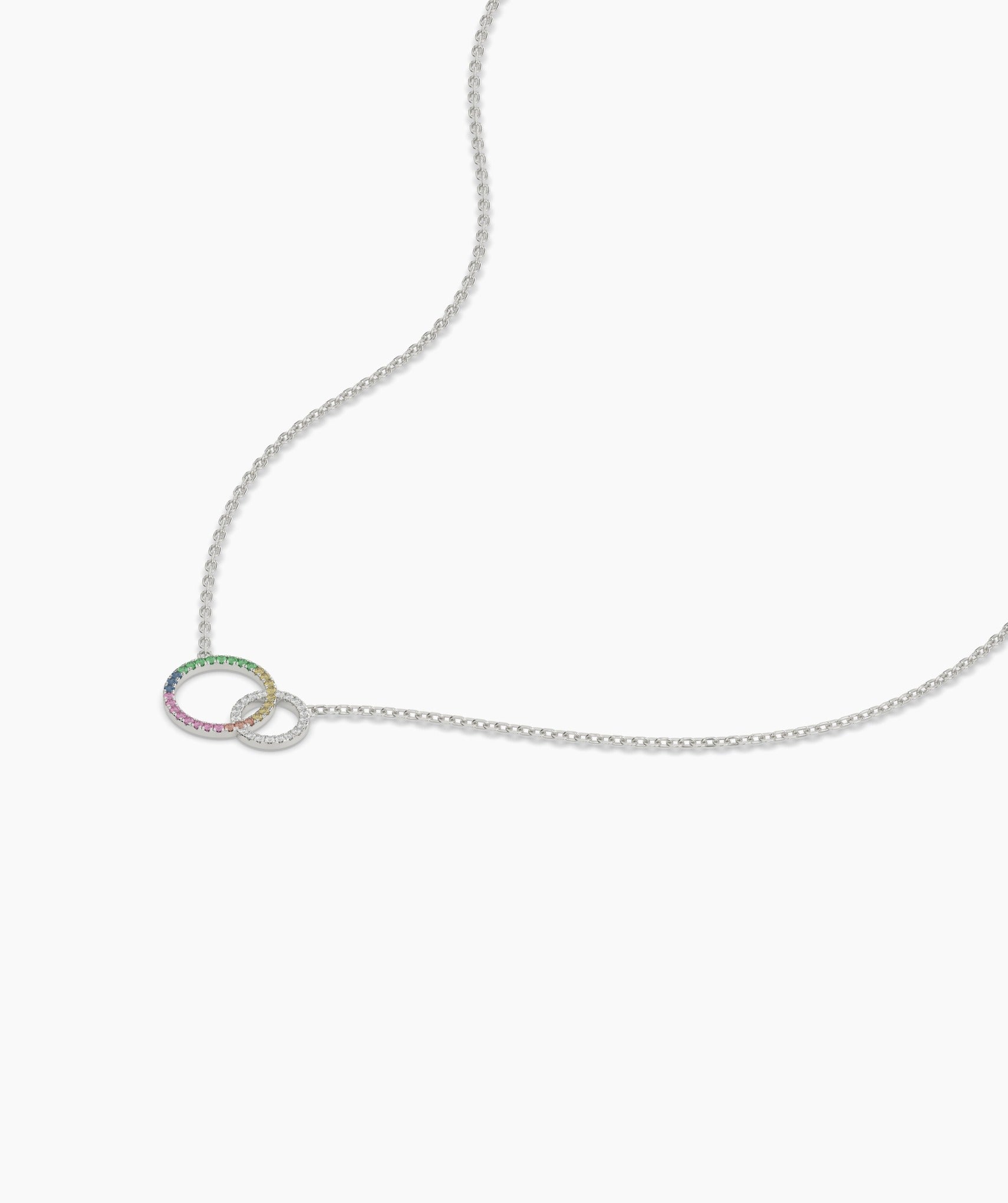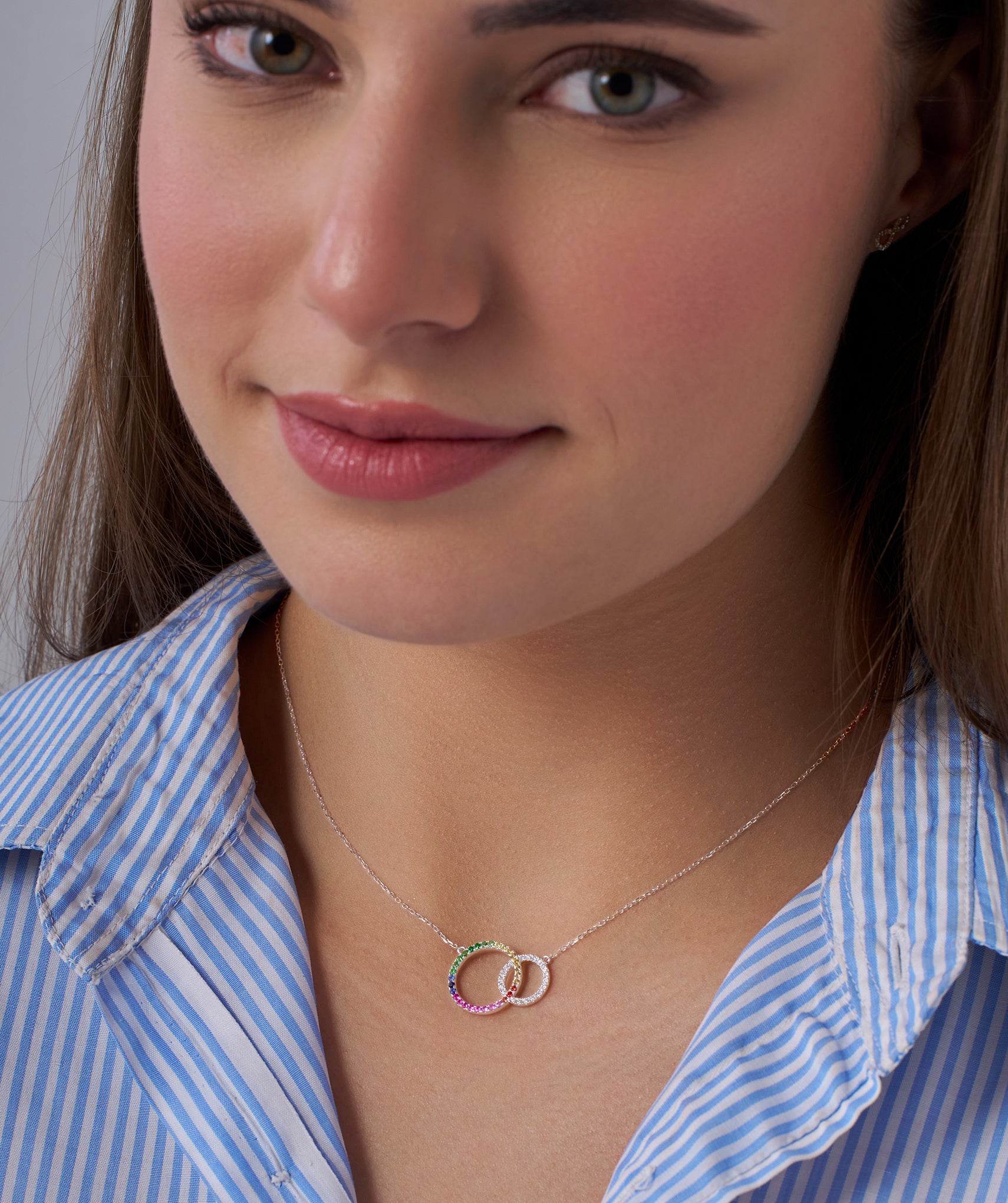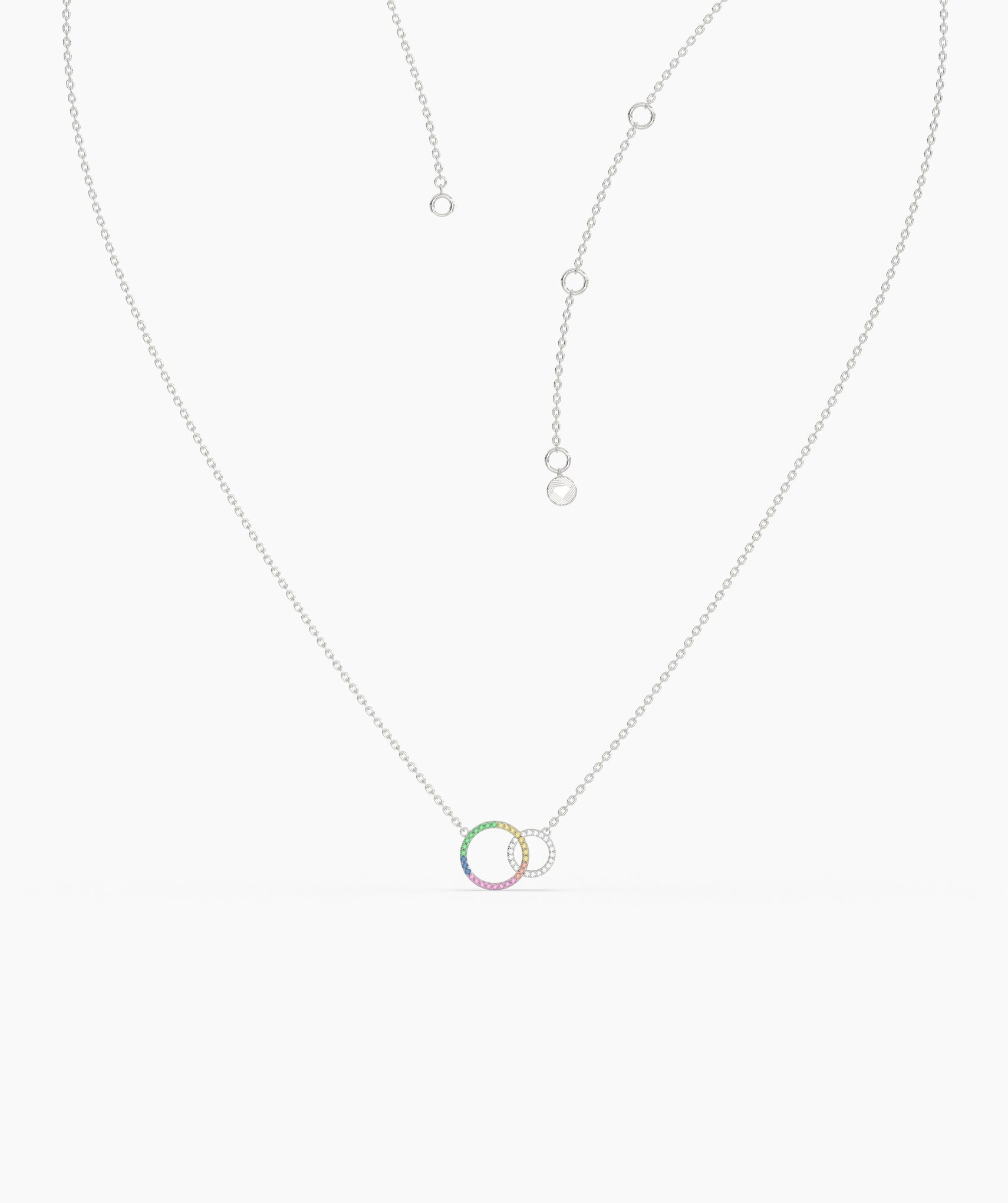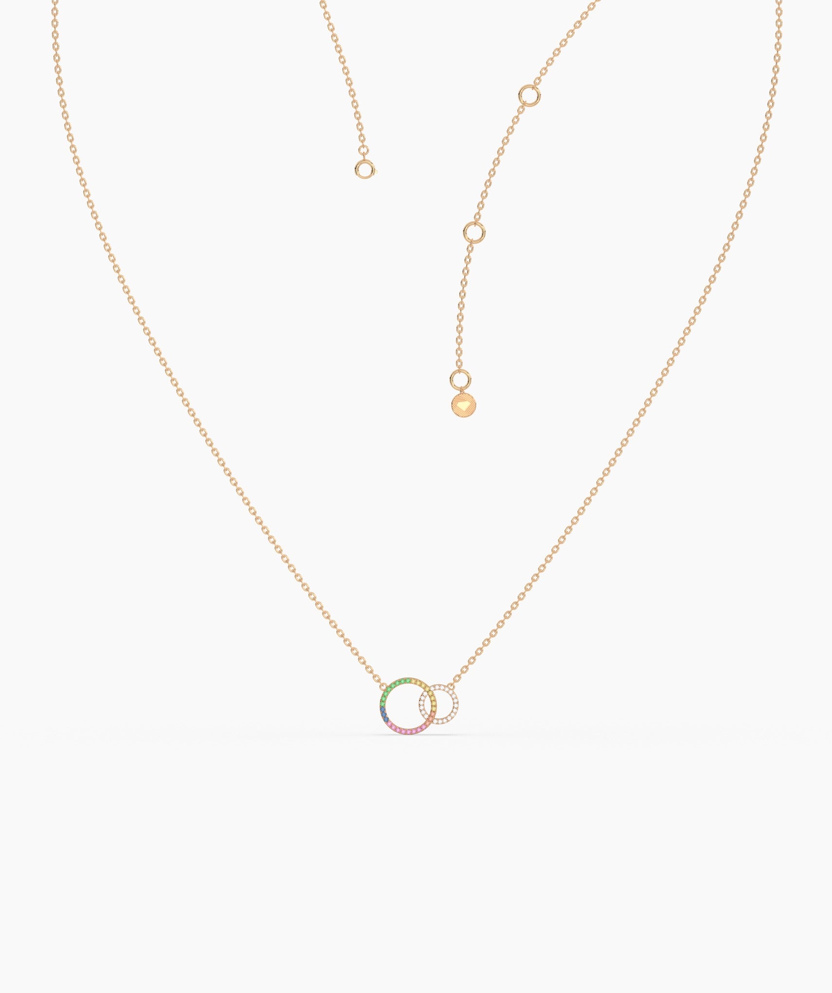 A vibrant 14K solid gold necklace featuring interlocking circles adorned with multicolored diamonds and sparkling diamonds.