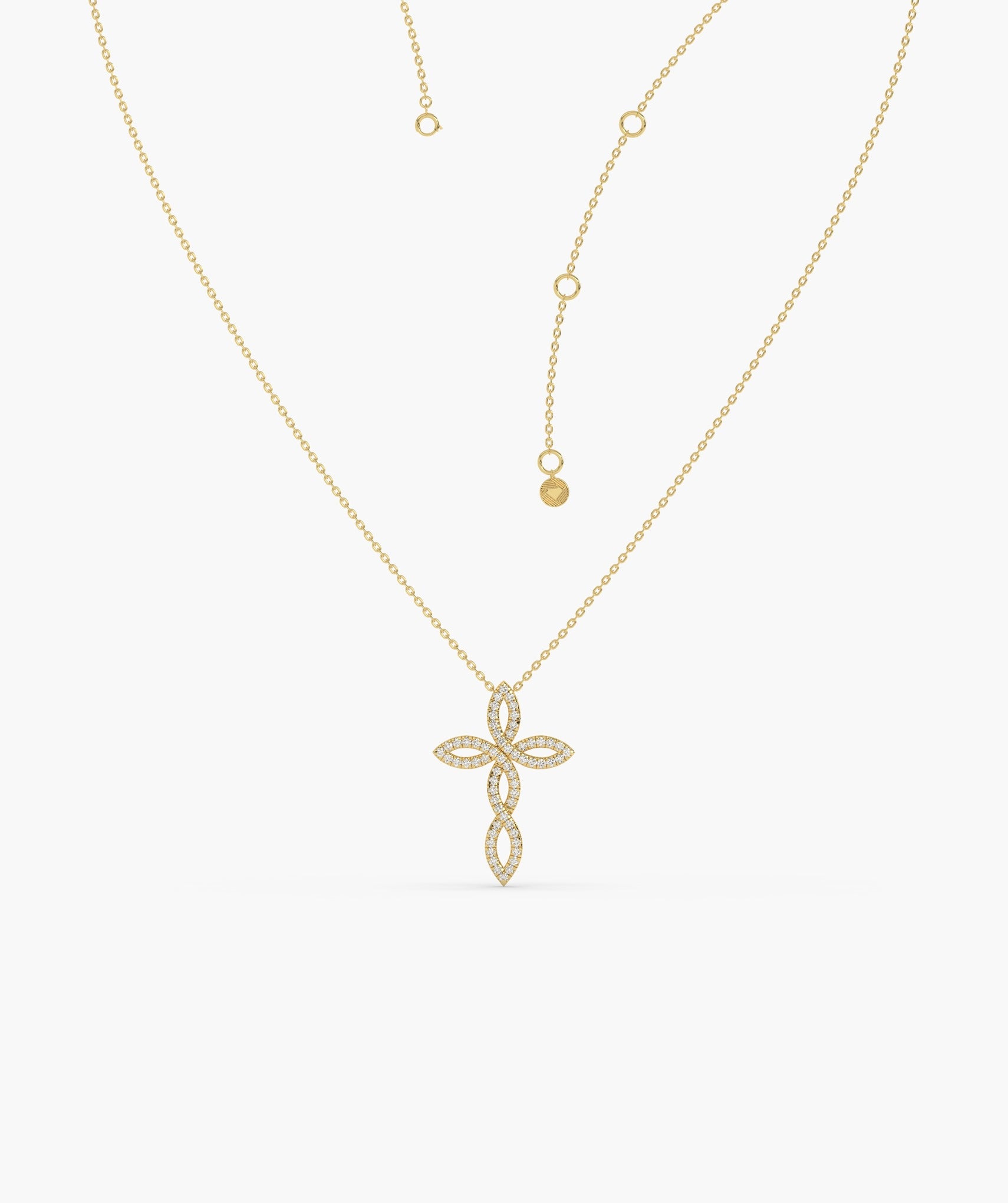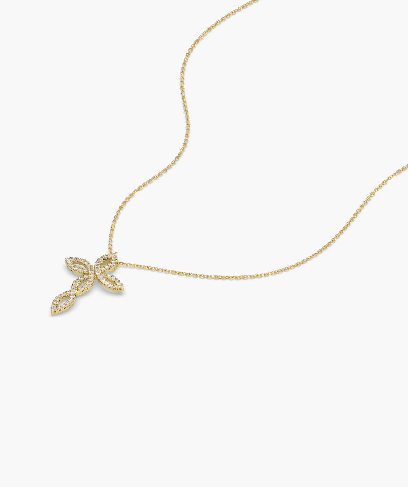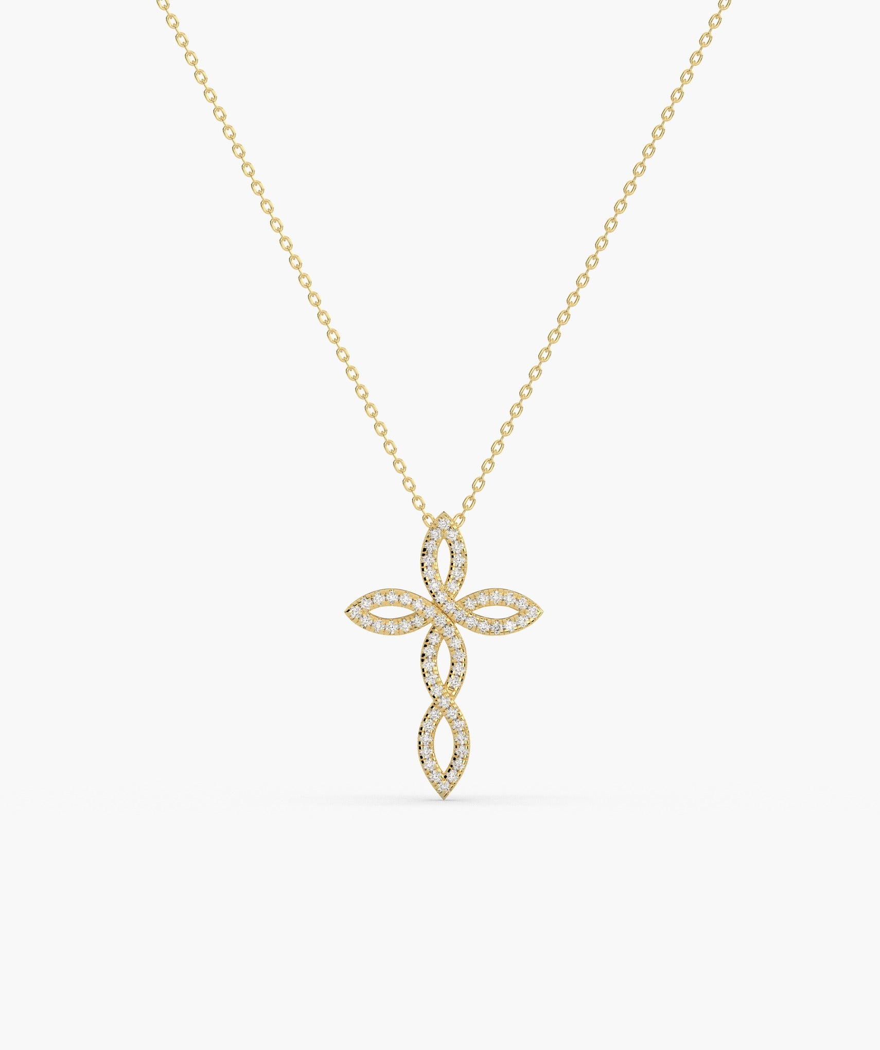 Exquisite 14K gold necklace featuring a diamond-studded floral cross pendant, blending timeless elegance with a touch of natural charm.
