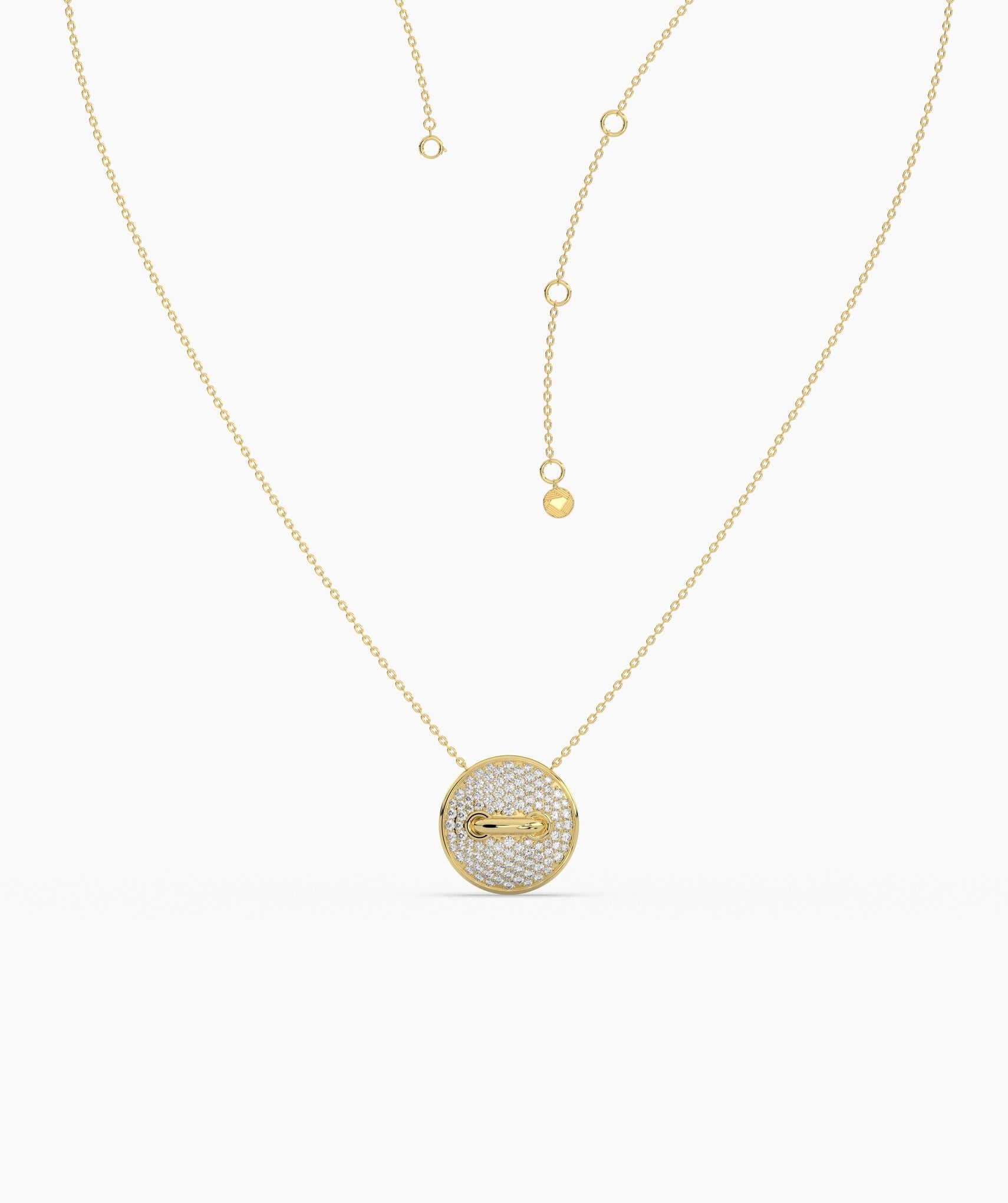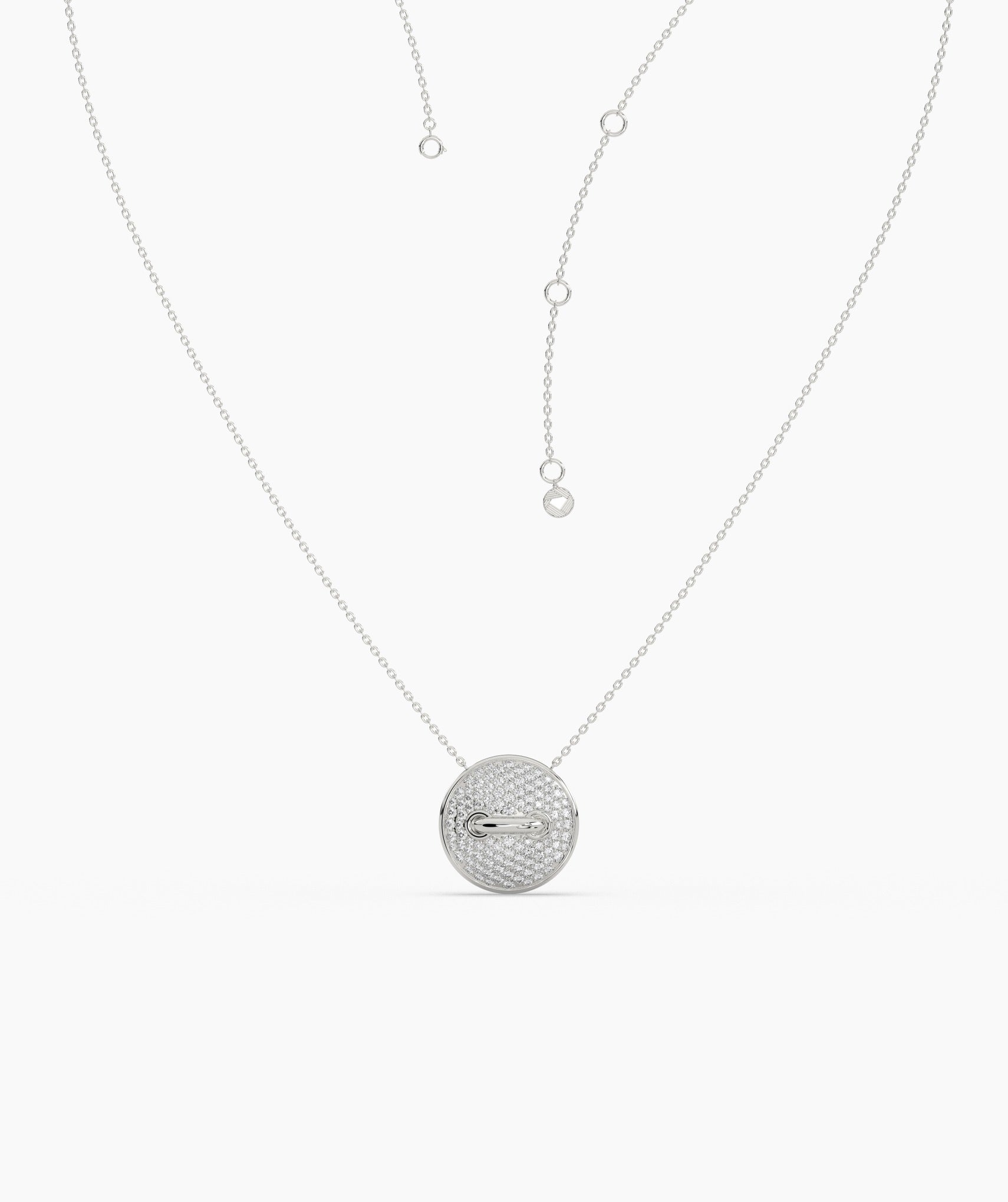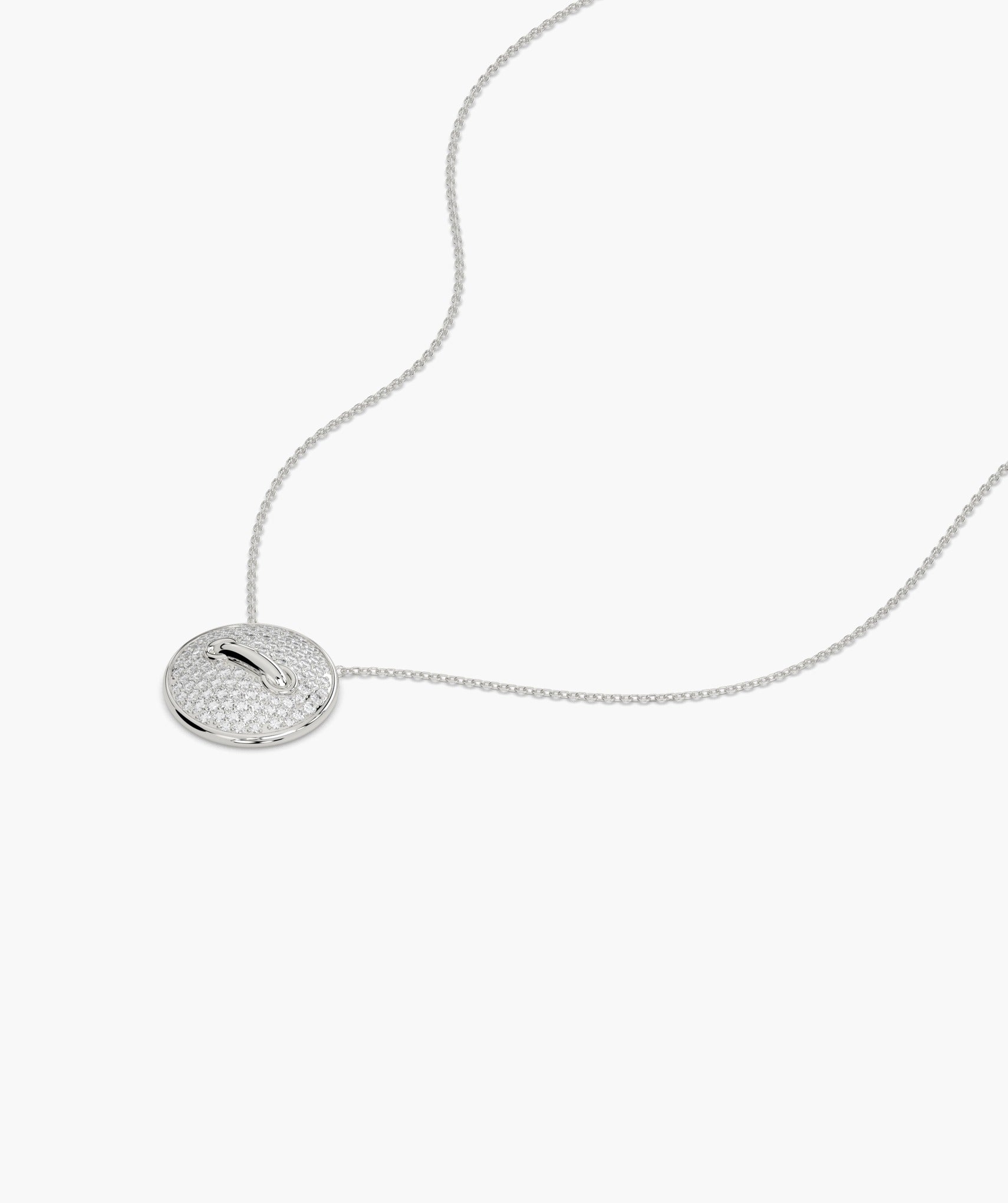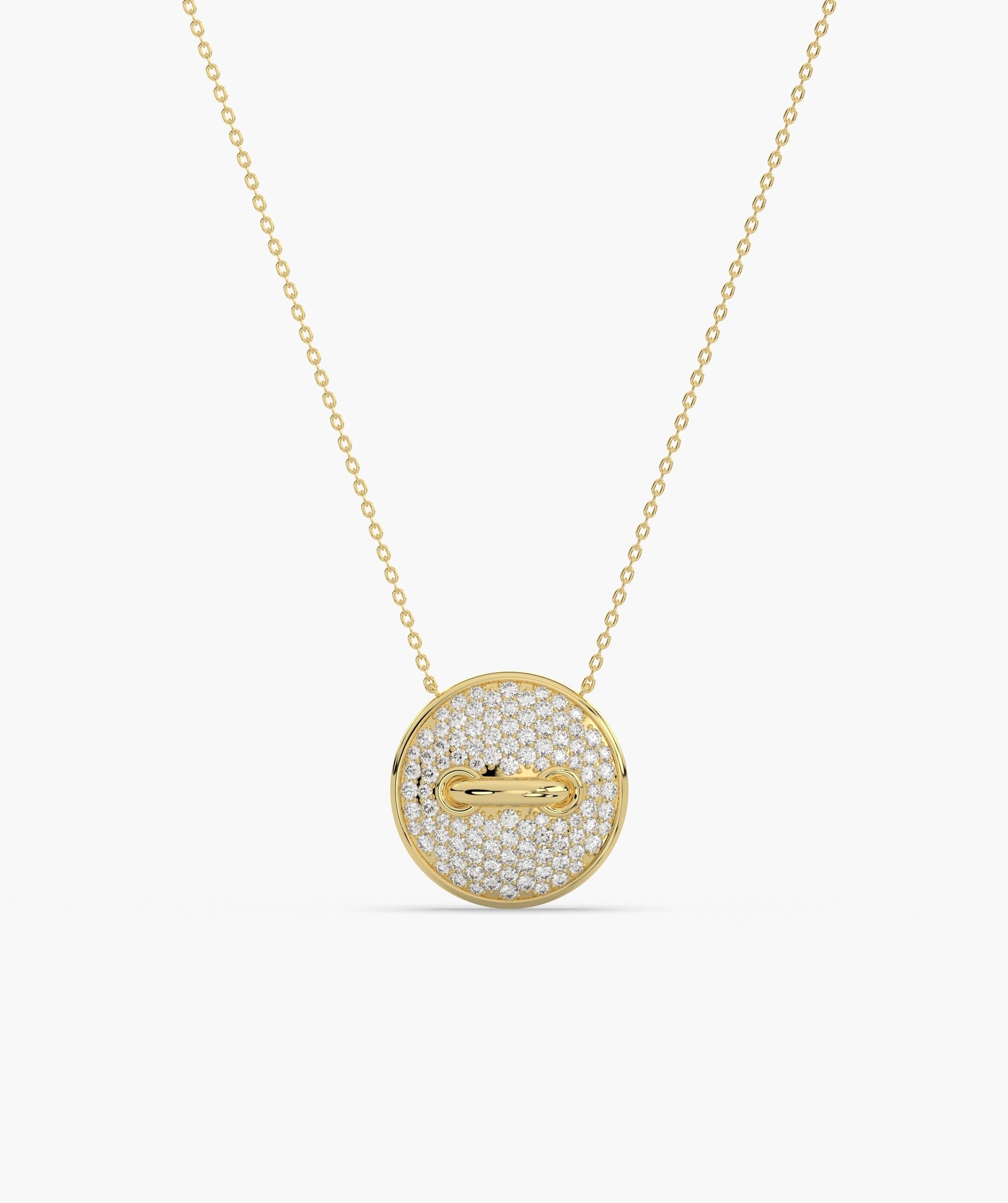 Featuring a round, diamond-encrusted pendant, this necklace exudes contemporary luxury.