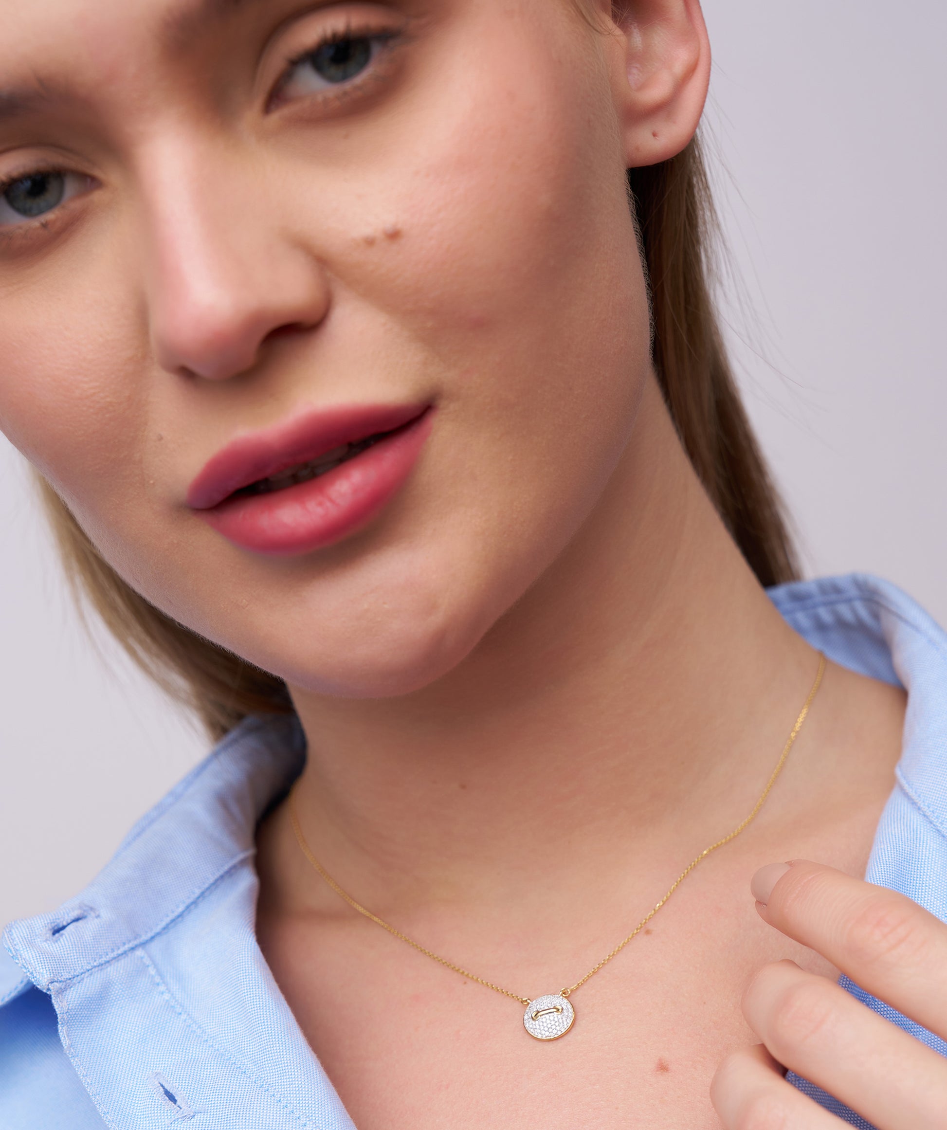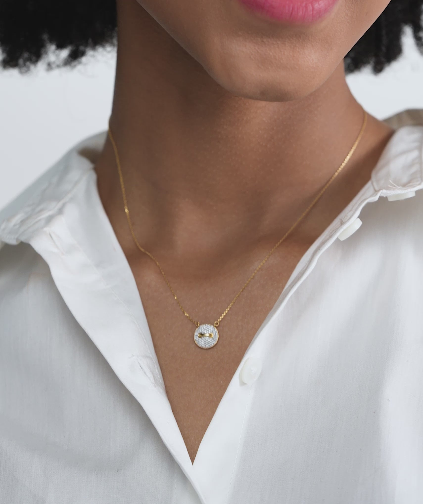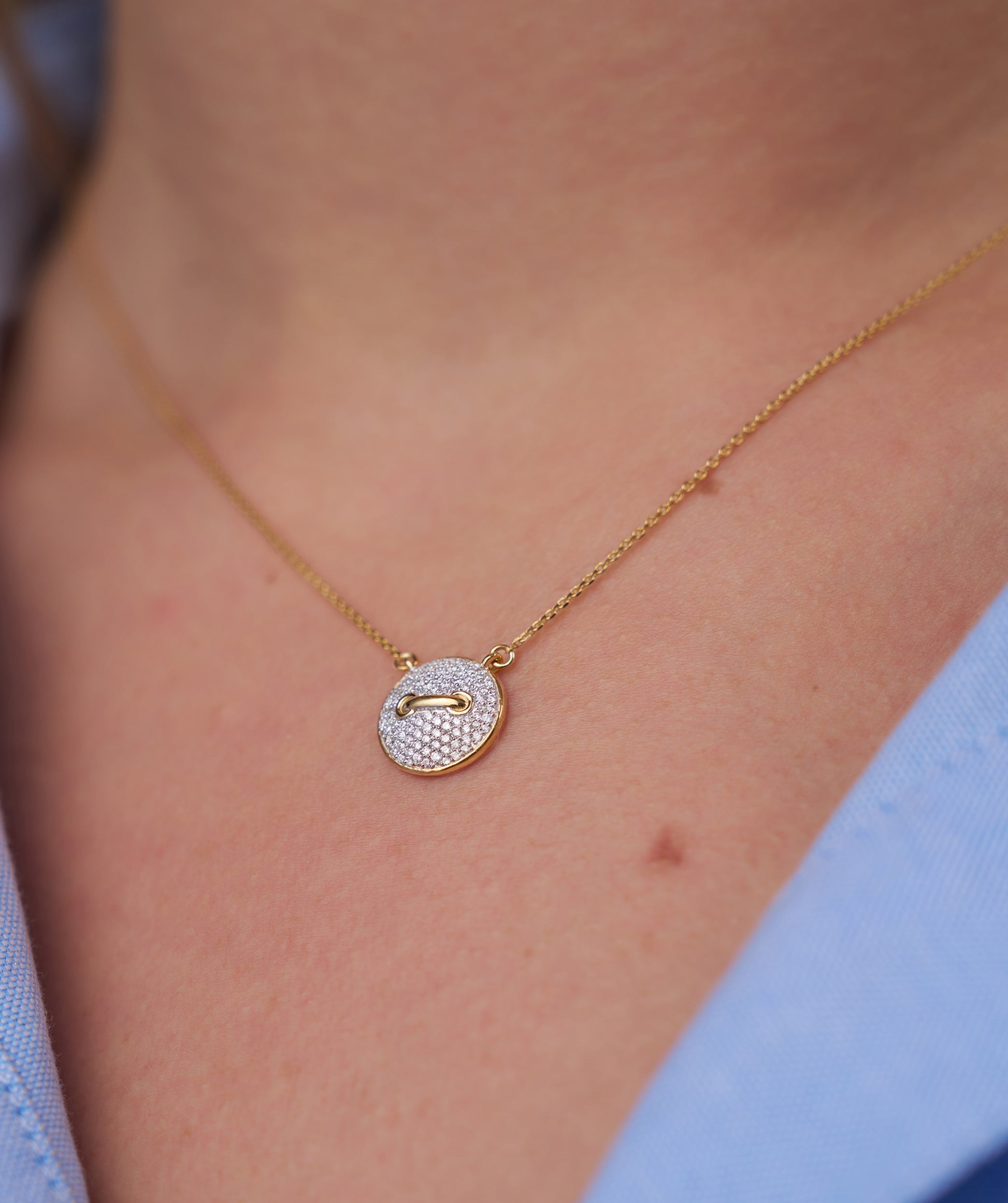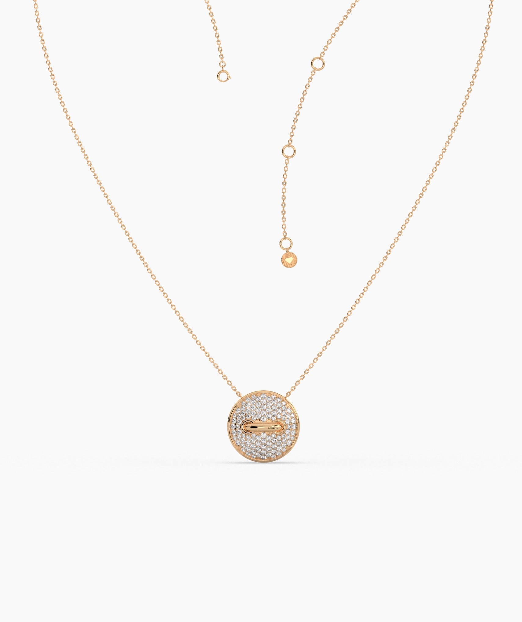 Featuring a round, diamond-encrusted pendant, this necklace exudes contemporary luxury.