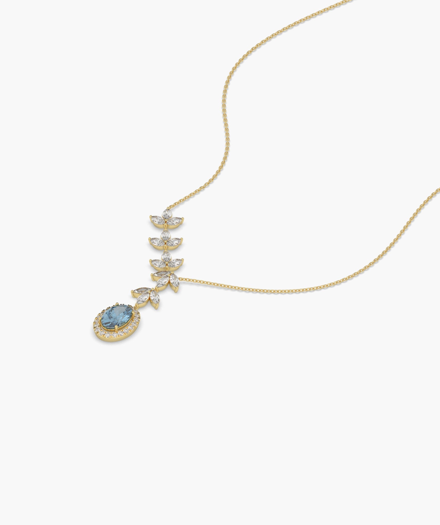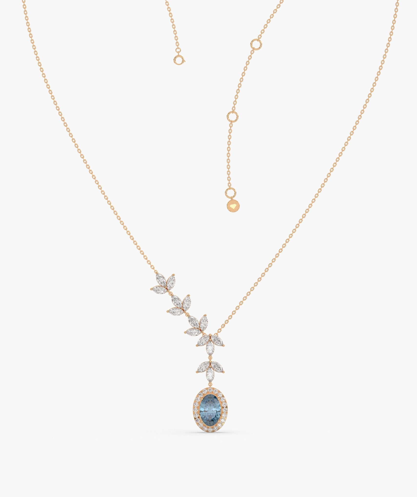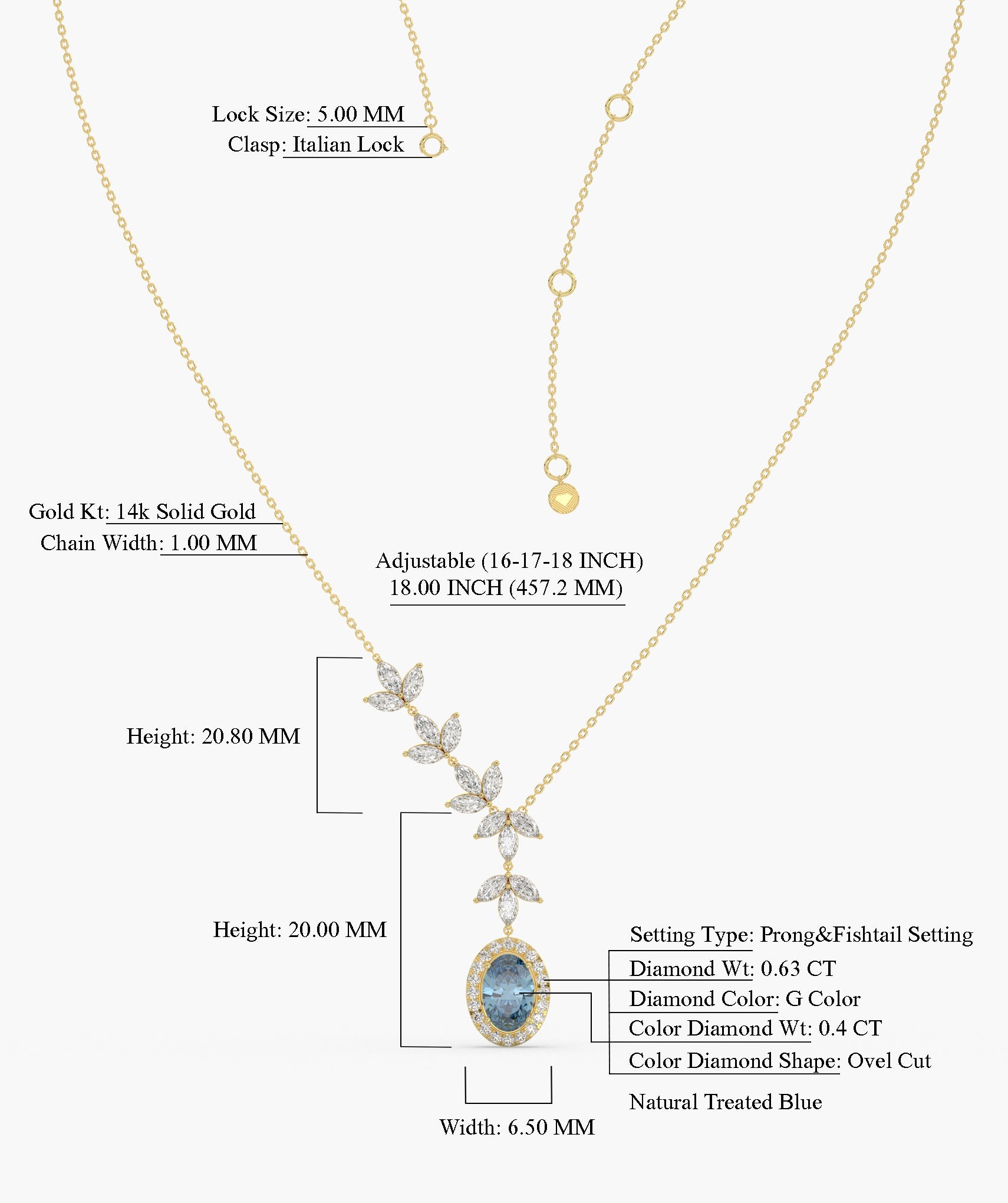 This 14K gold necklace boasts a sparkling oval sapphire pendant, framed by leaf-shaped diamonds, exuding elegance and charm perfect for any special occasion.
