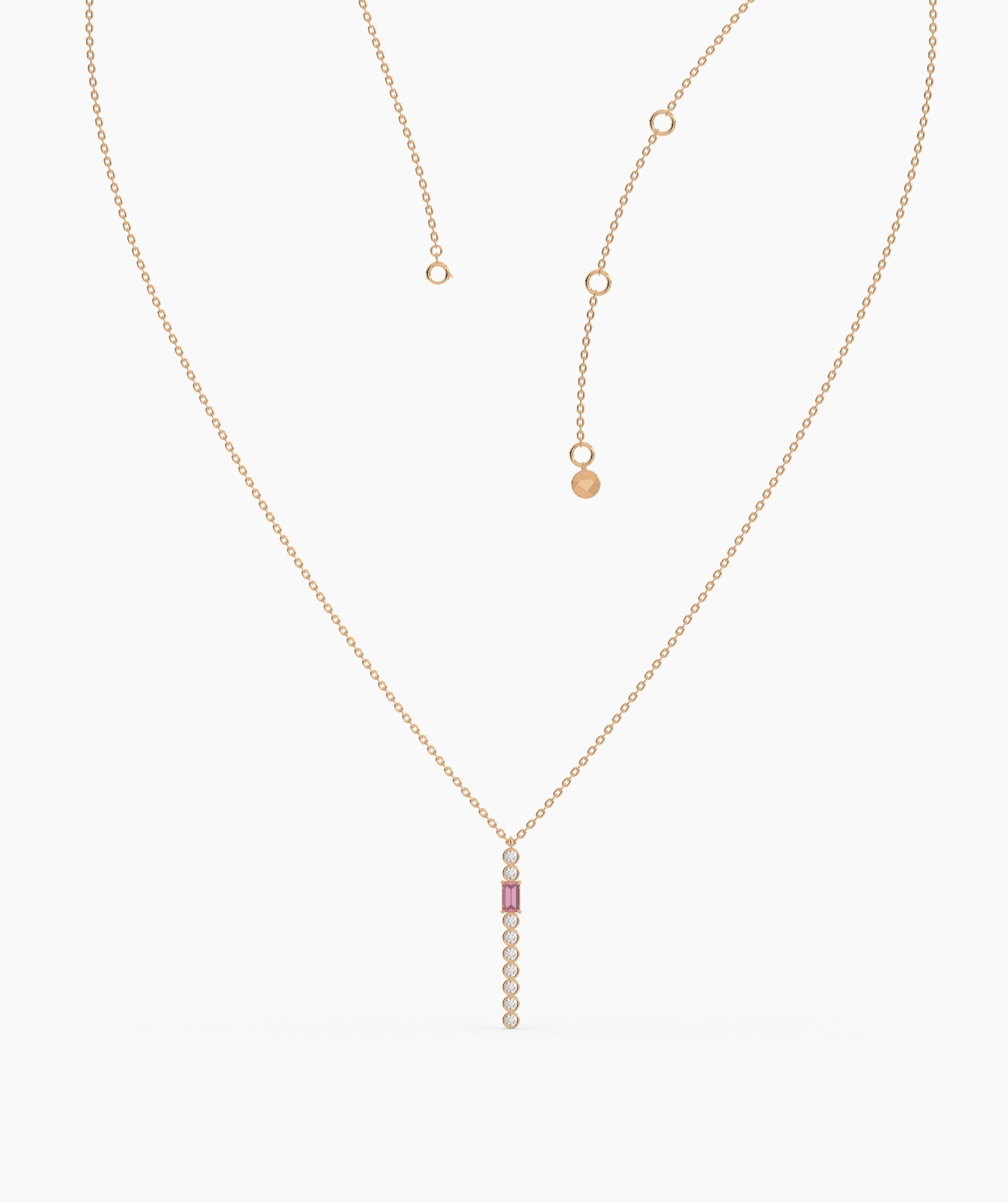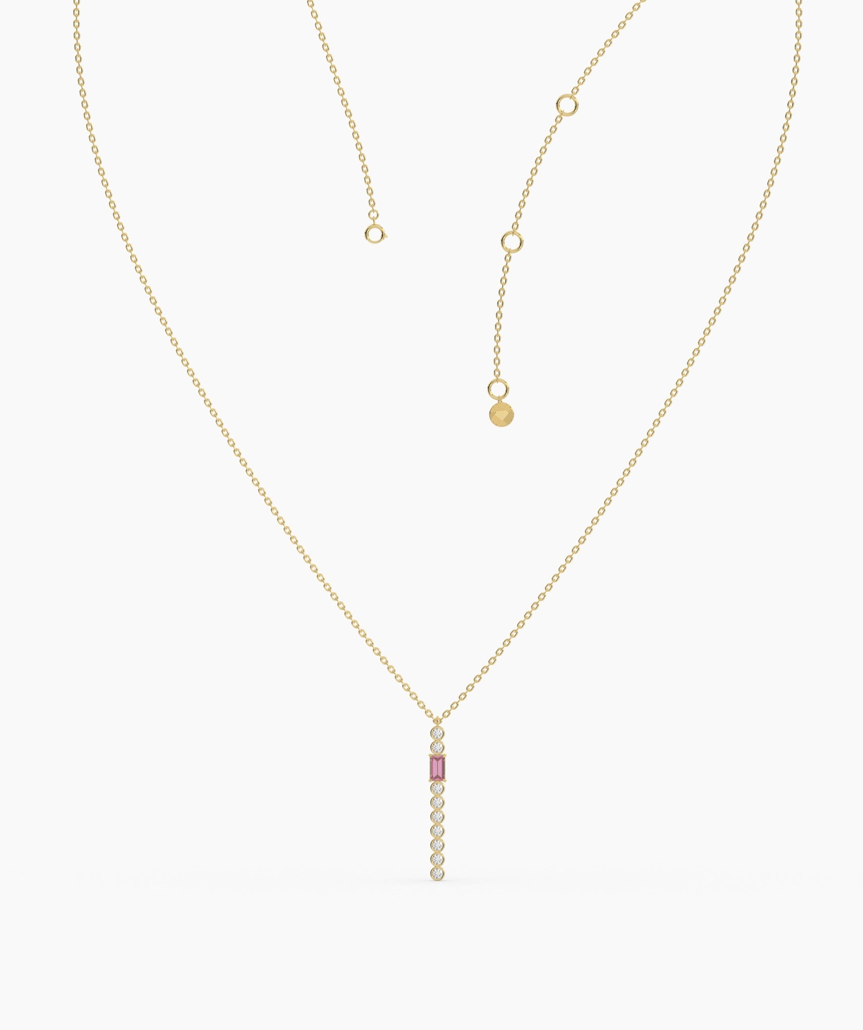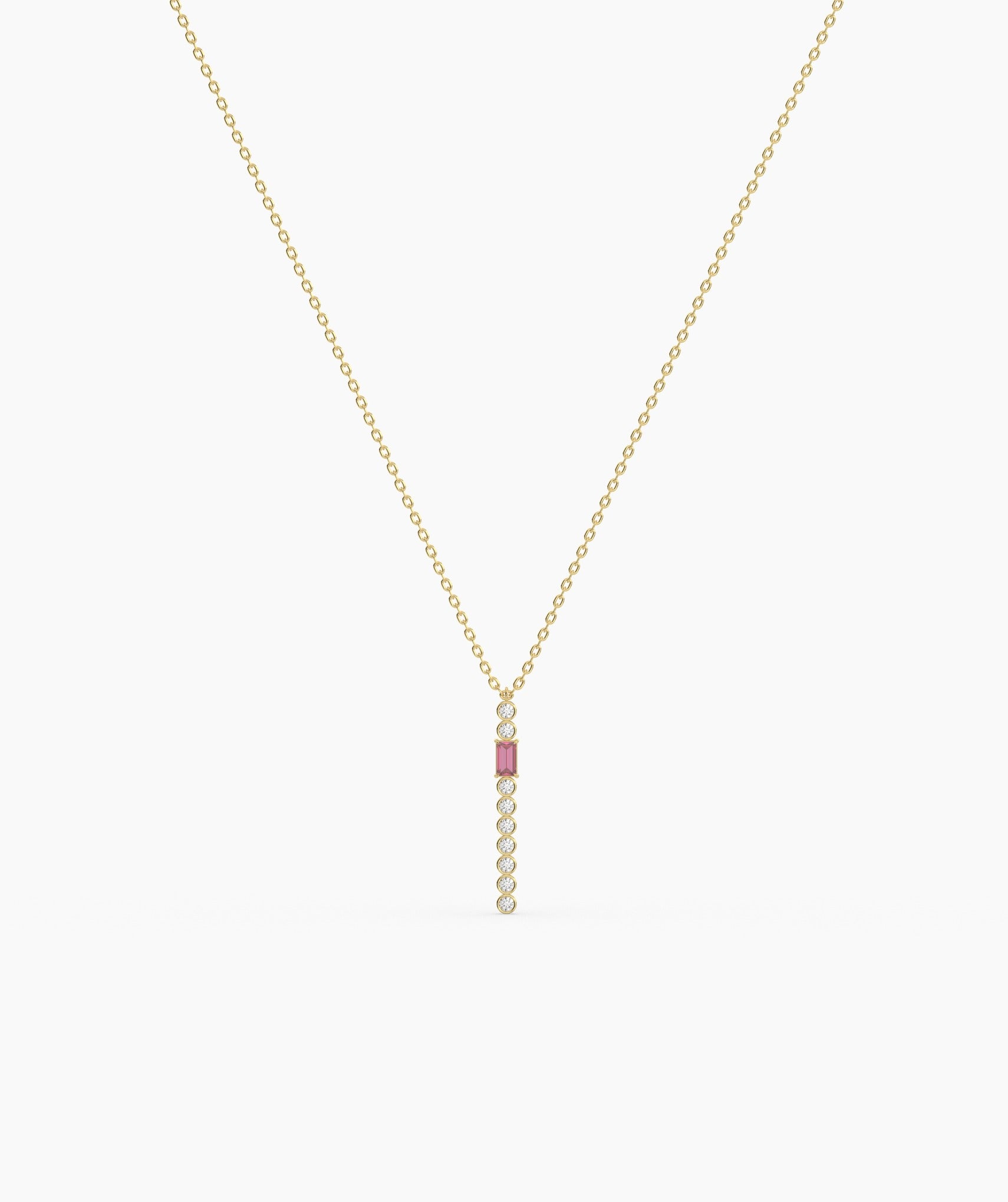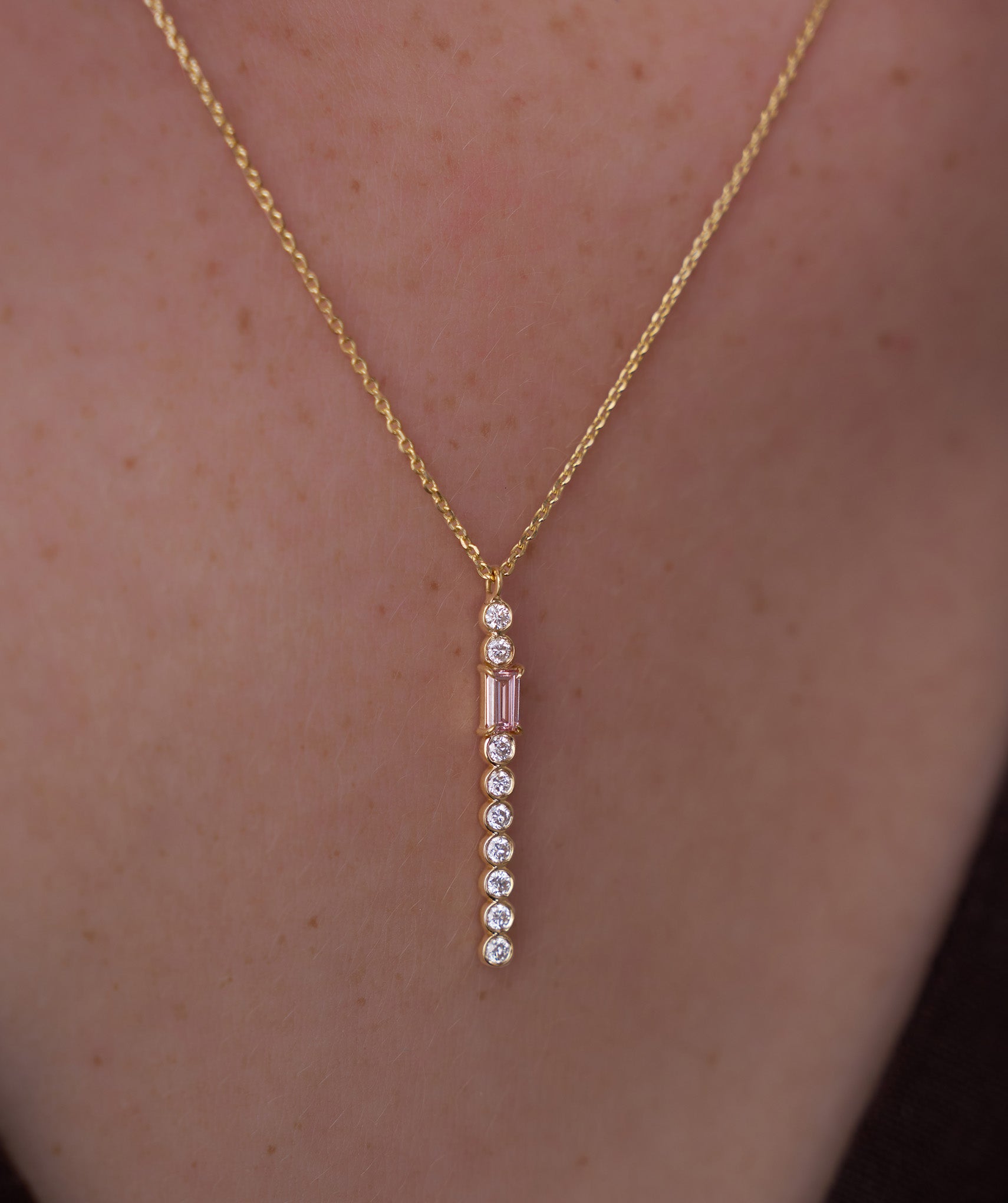A delicate statement piece, this gold bar pendant features glittering diamonds and a bold pink baguette stone, perfect for layering or wearing solo.