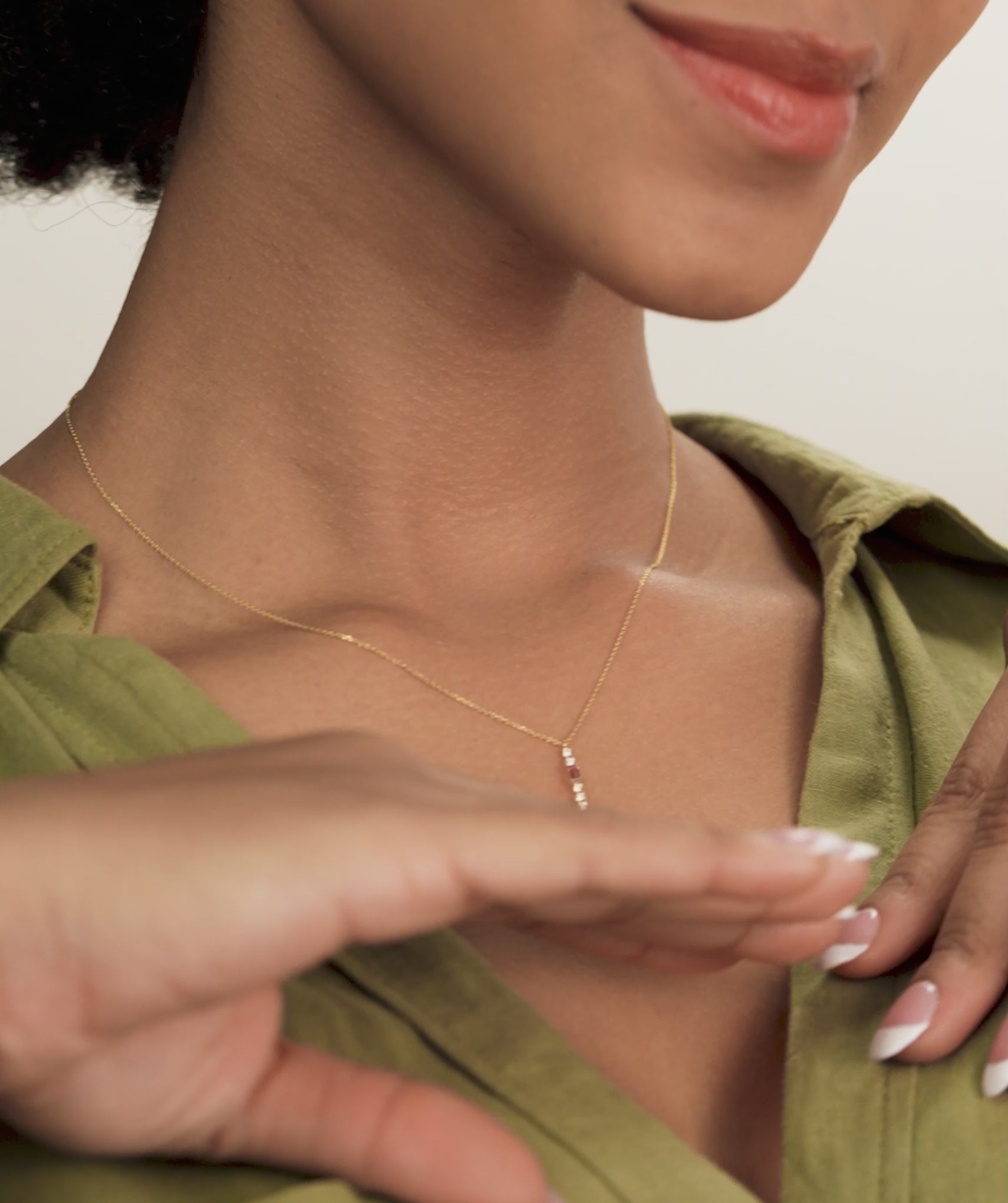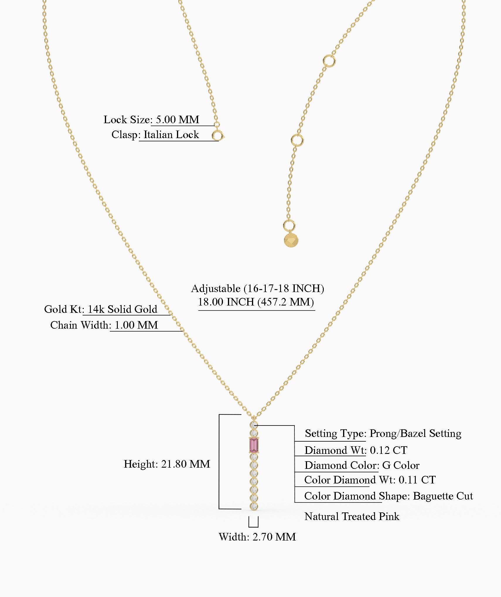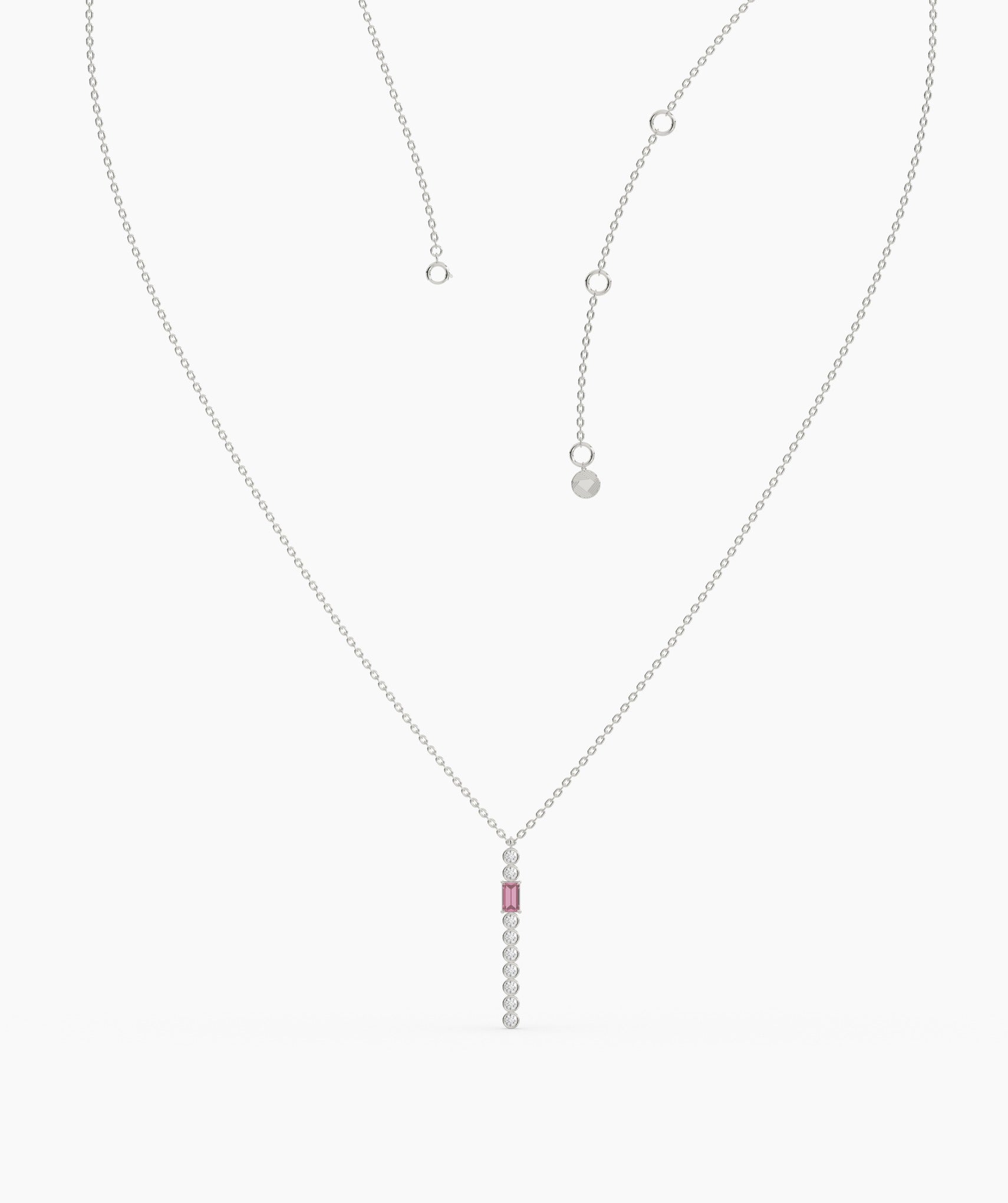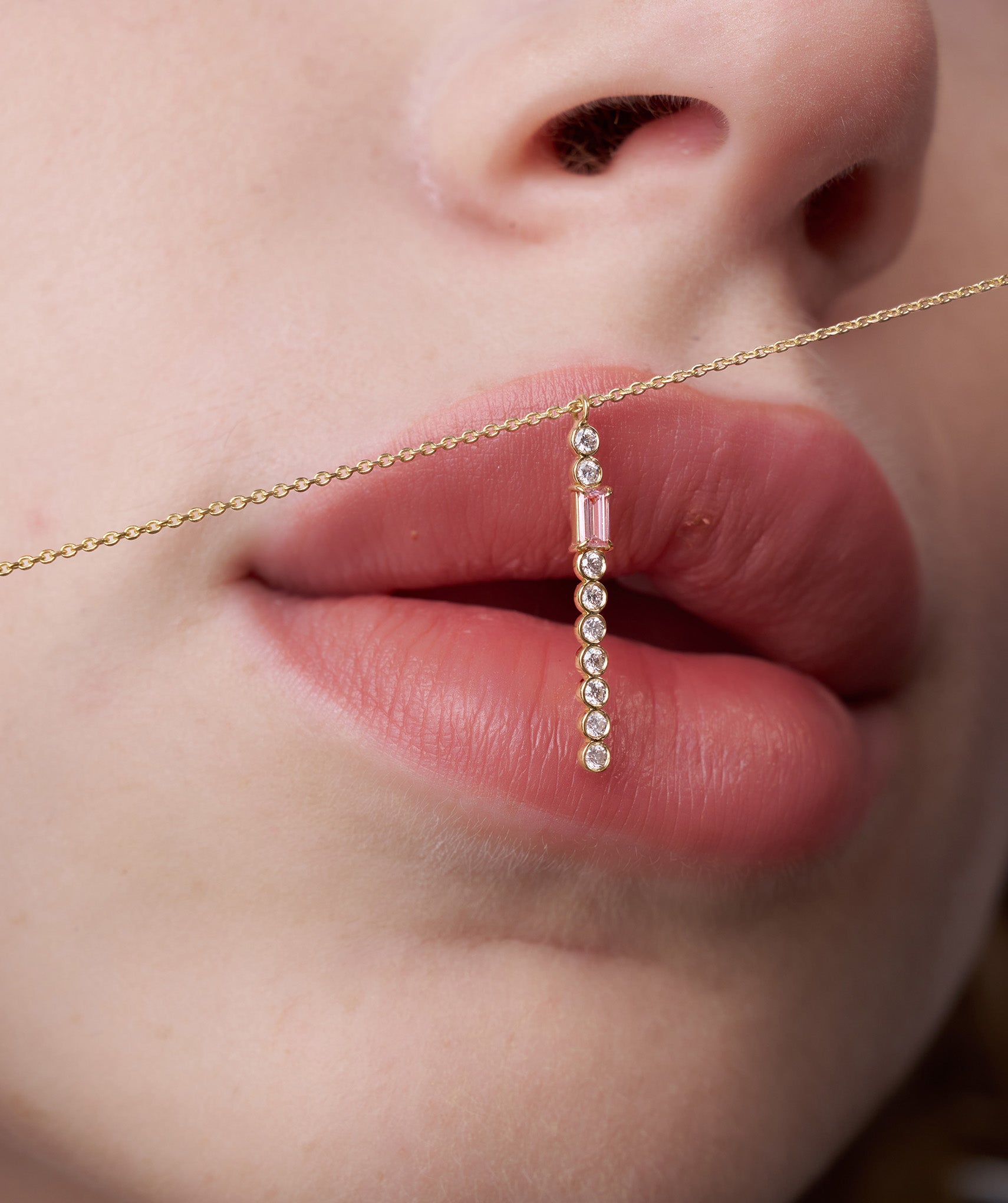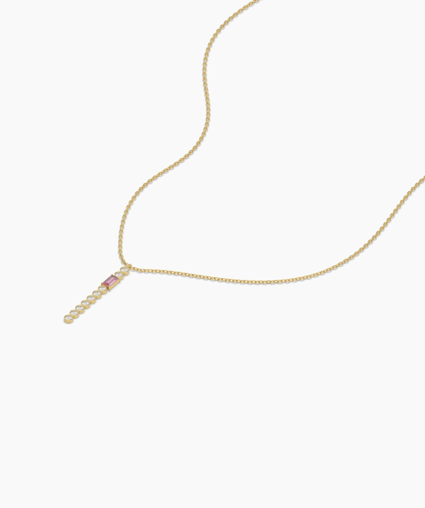A delicate statement piece, this gold bar pendant features glittering diamonds and a bold pink baguette stone, perfect for layering or wearing solo.