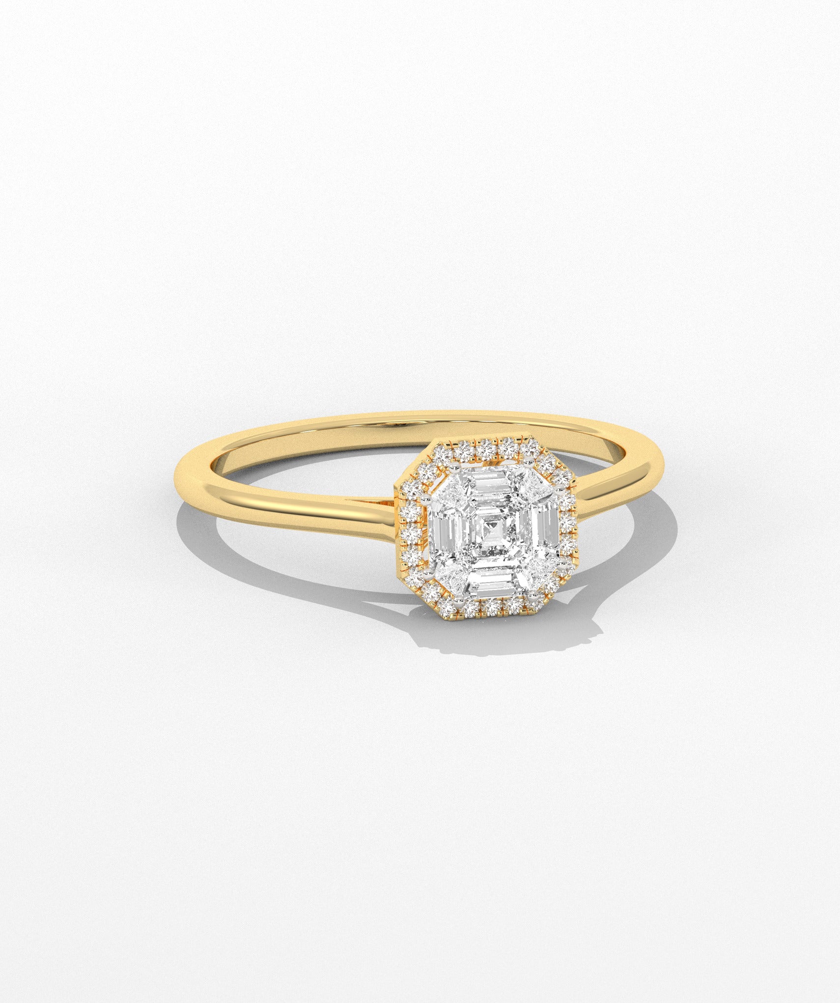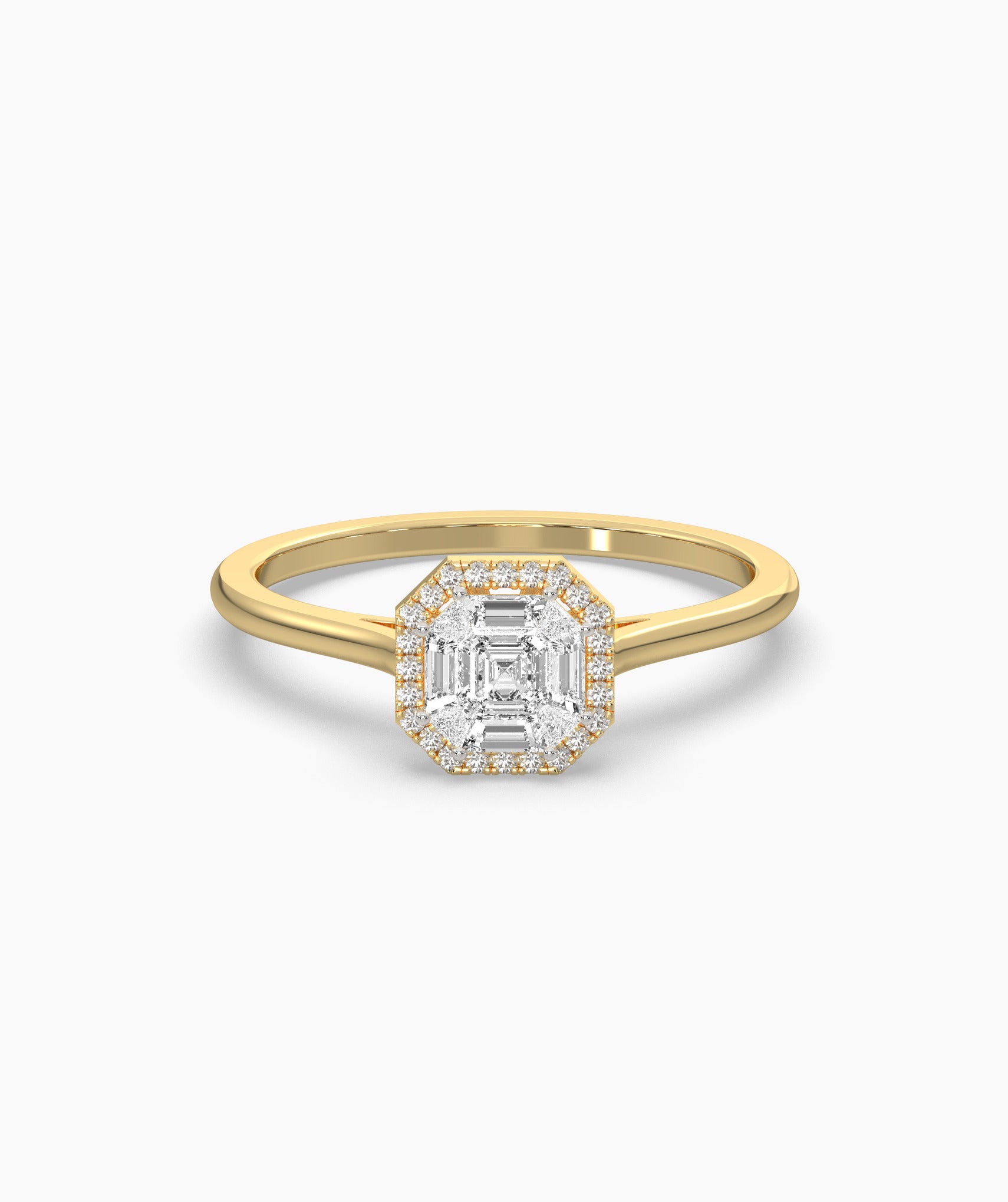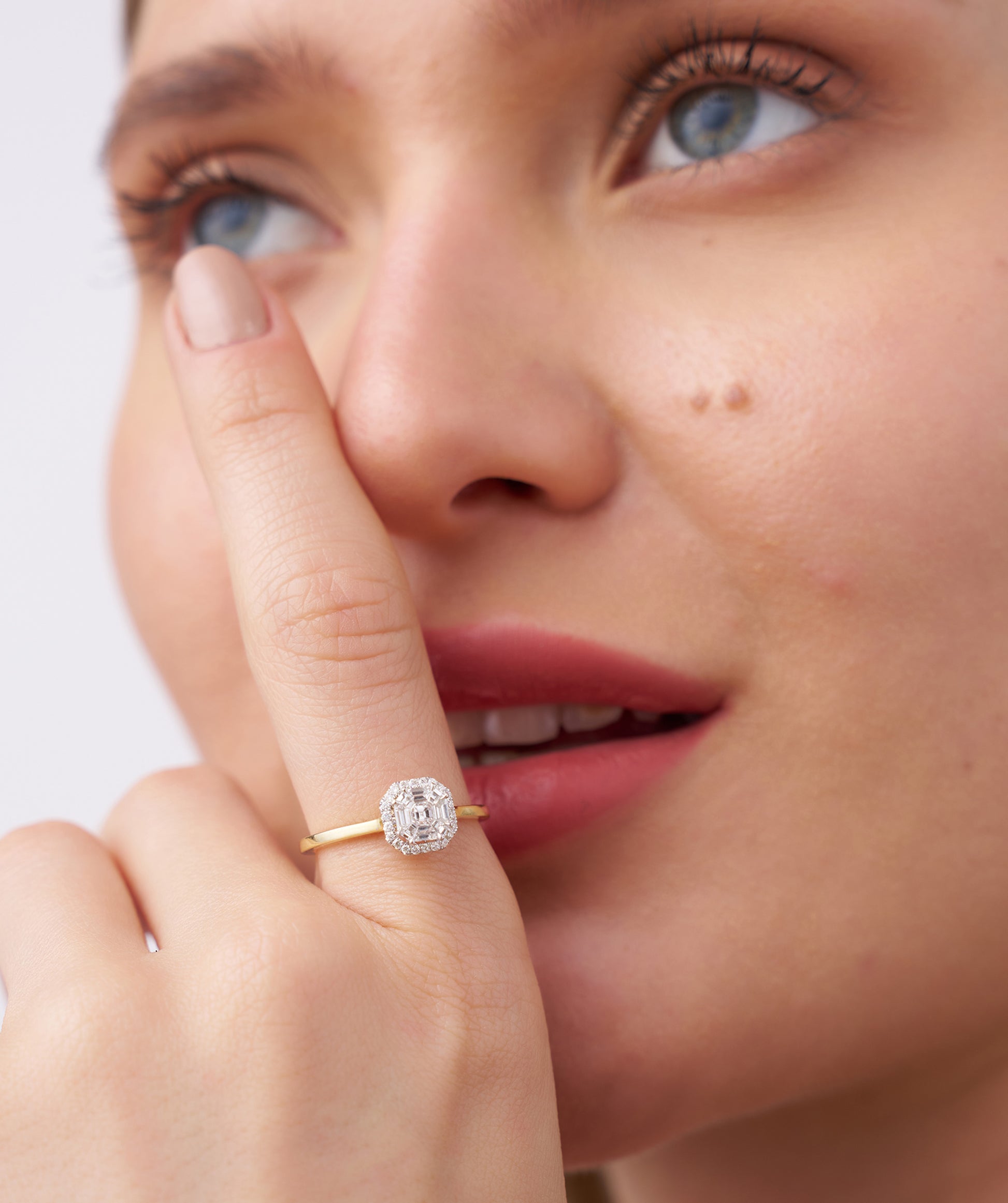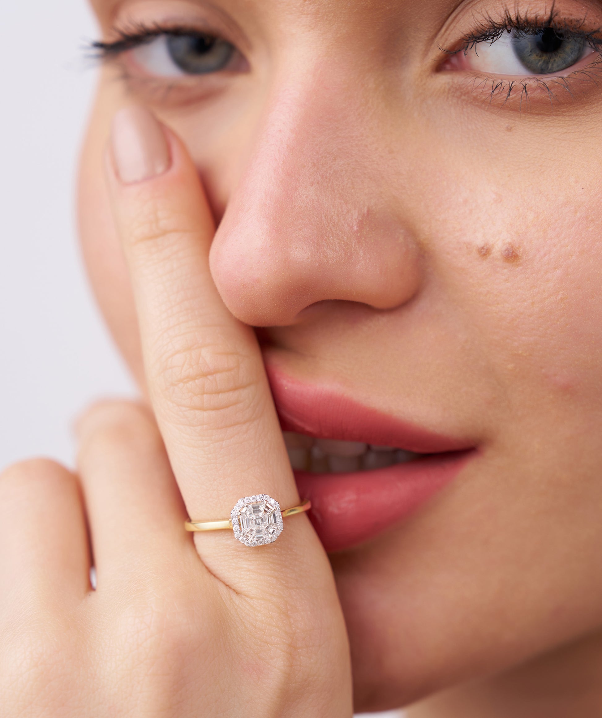 A refined nod to Art Deco elegance—this halo ring showcases an Asscher-cut diamond set in warm 14K gold.
