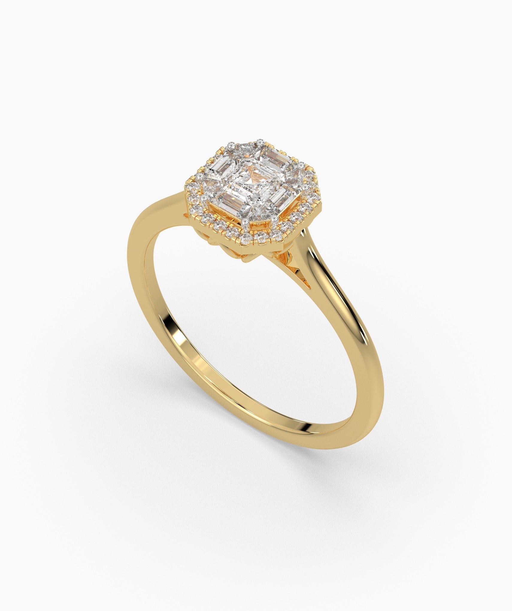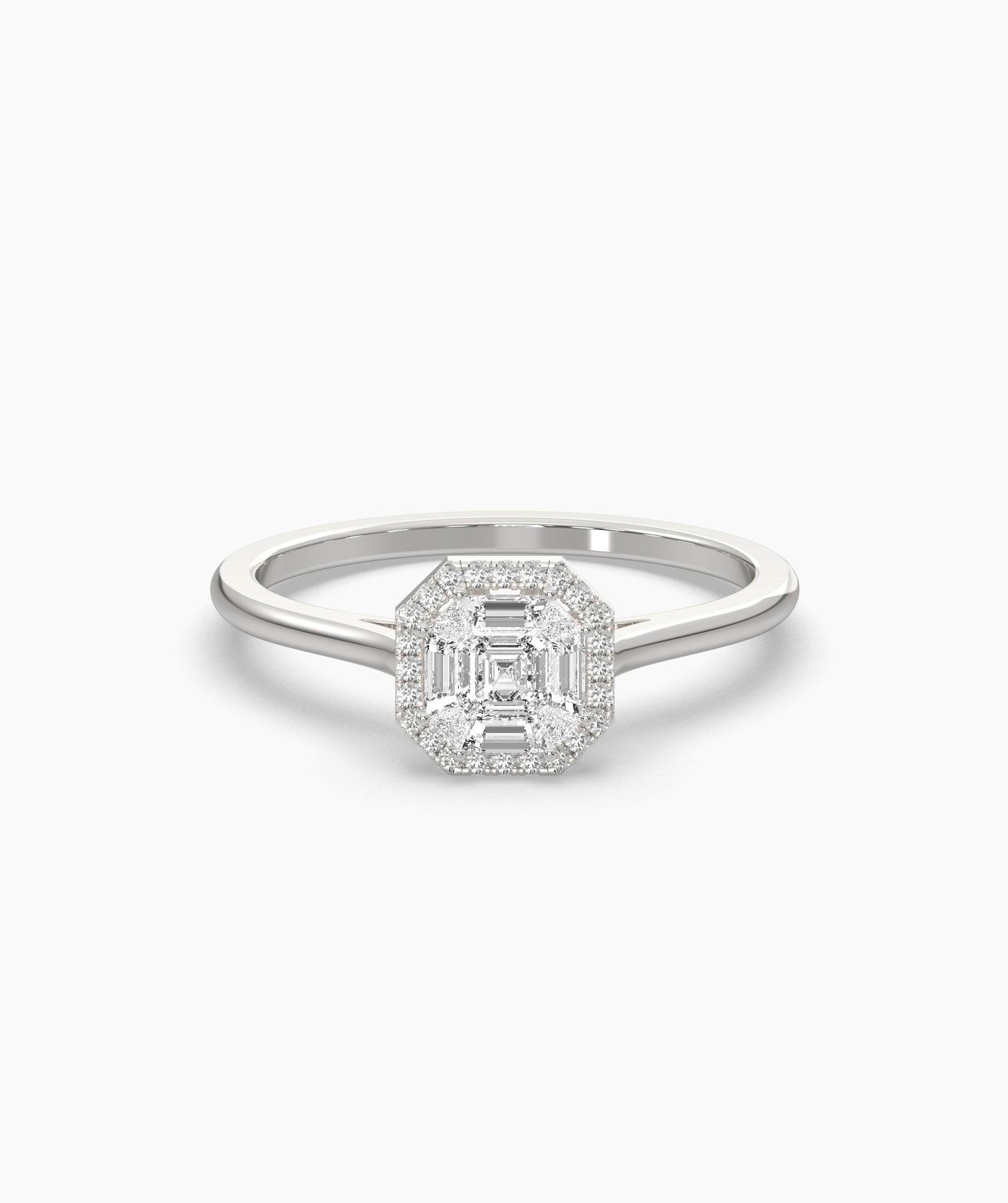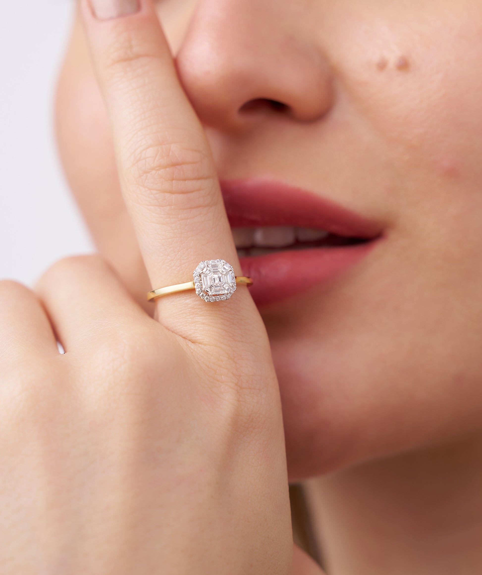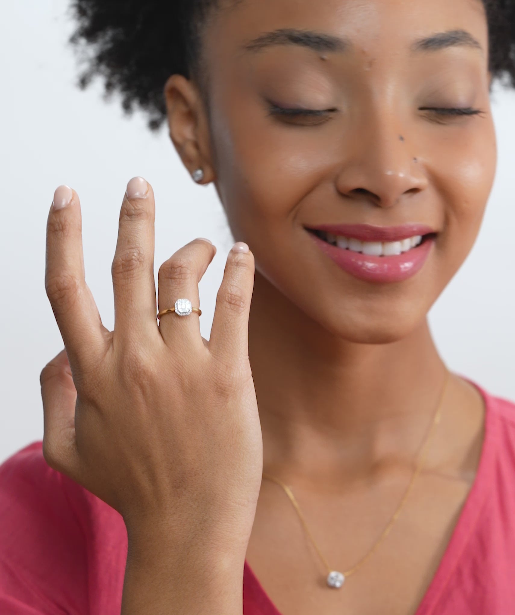 A refined nod to Art Deco elegance—this halo ring showcases an Asscher-cut diamond set in warm 14K gold.