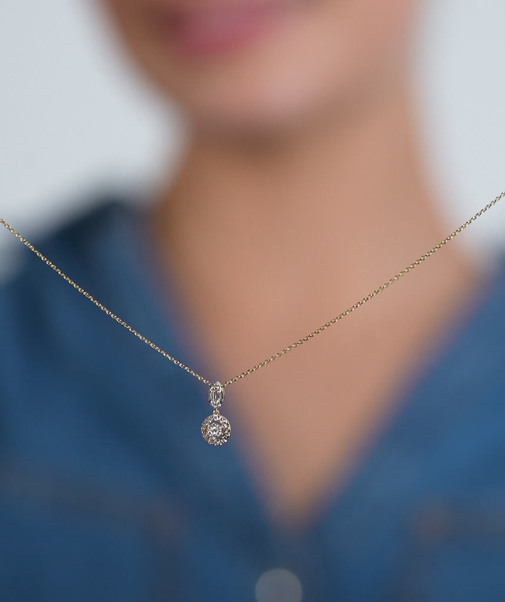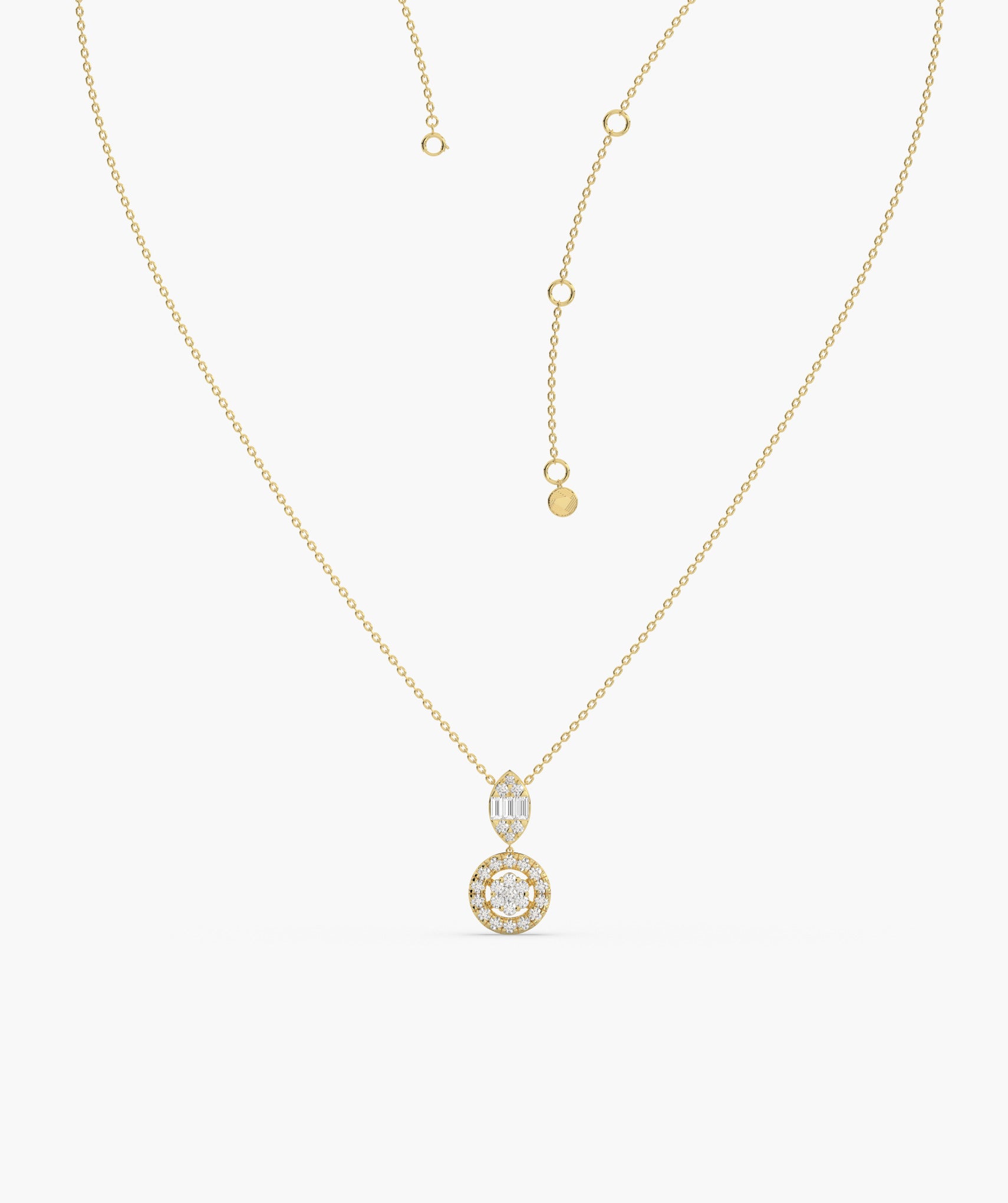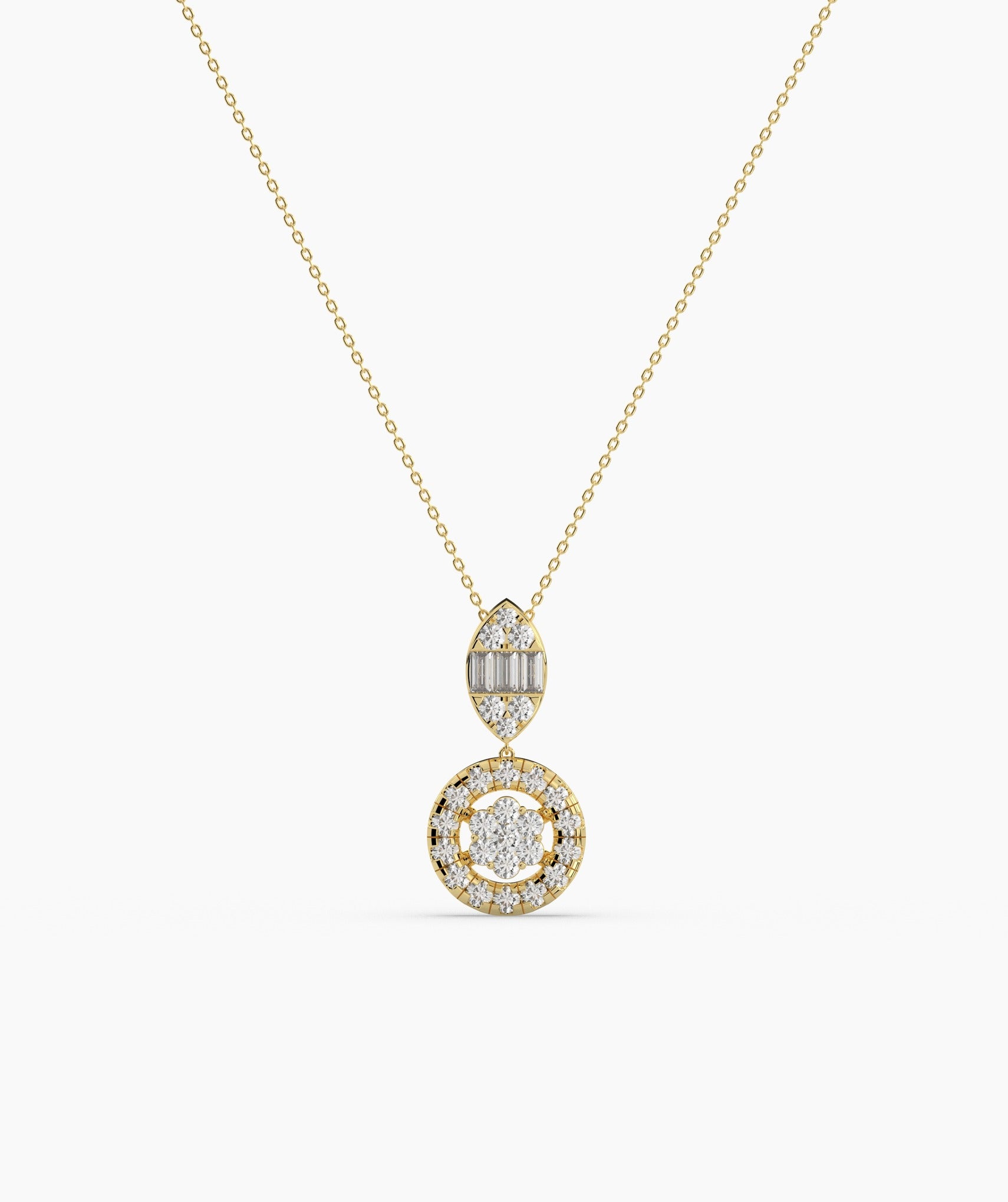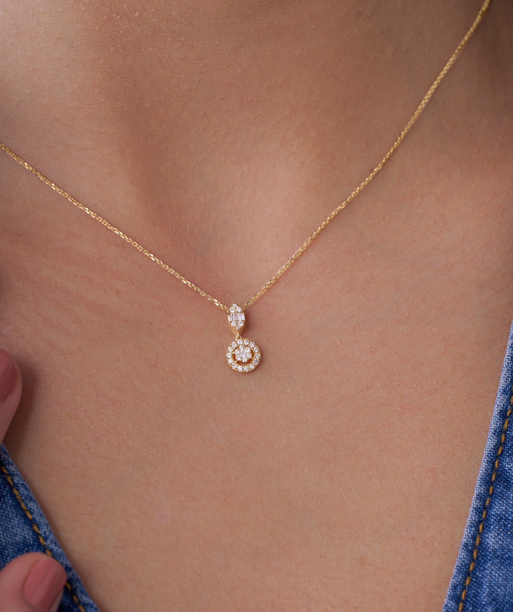 This 14K gold necklace features a distinctive pendant with a modern design, combining a unique blend of baguette and round-cut diamonds.