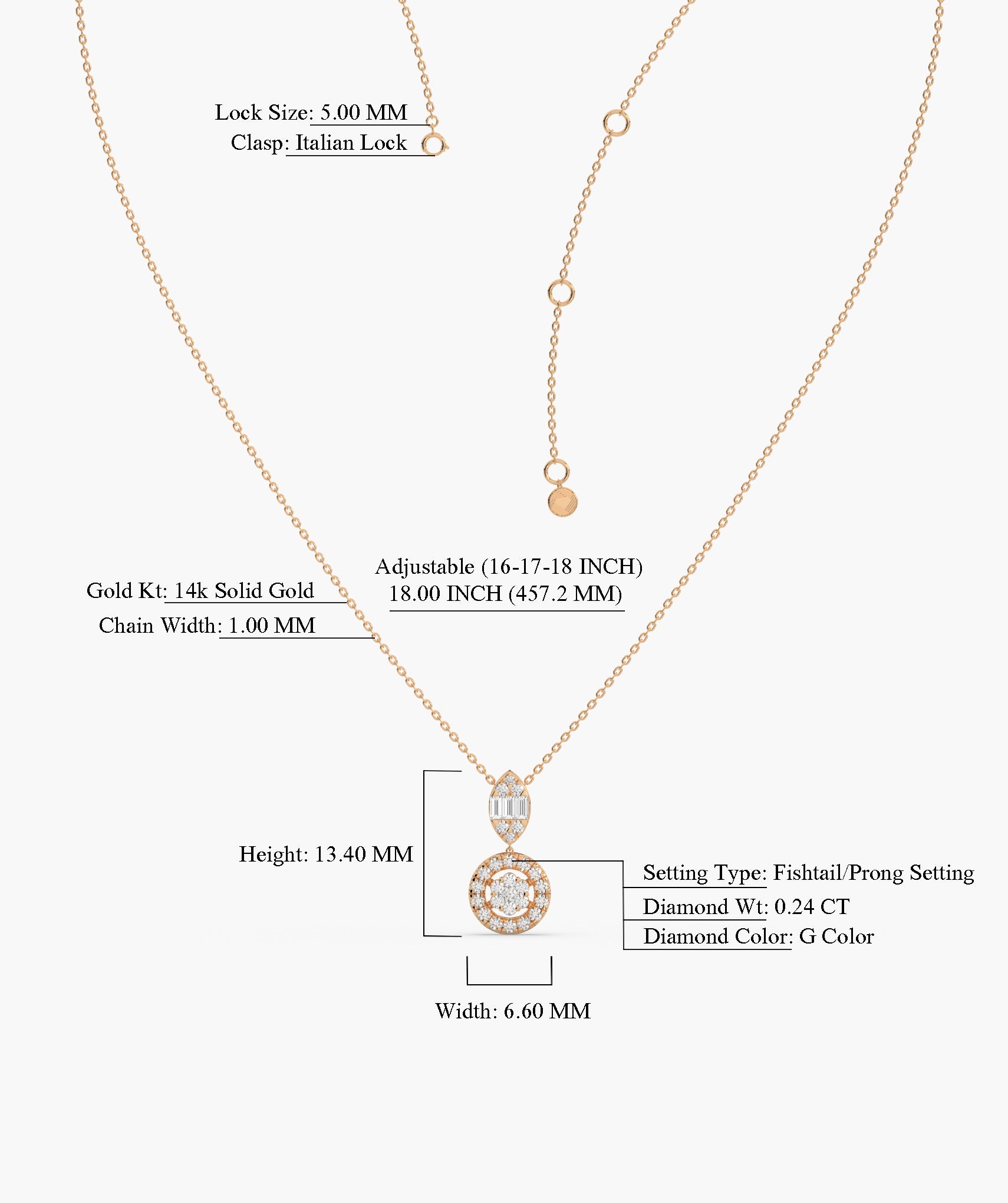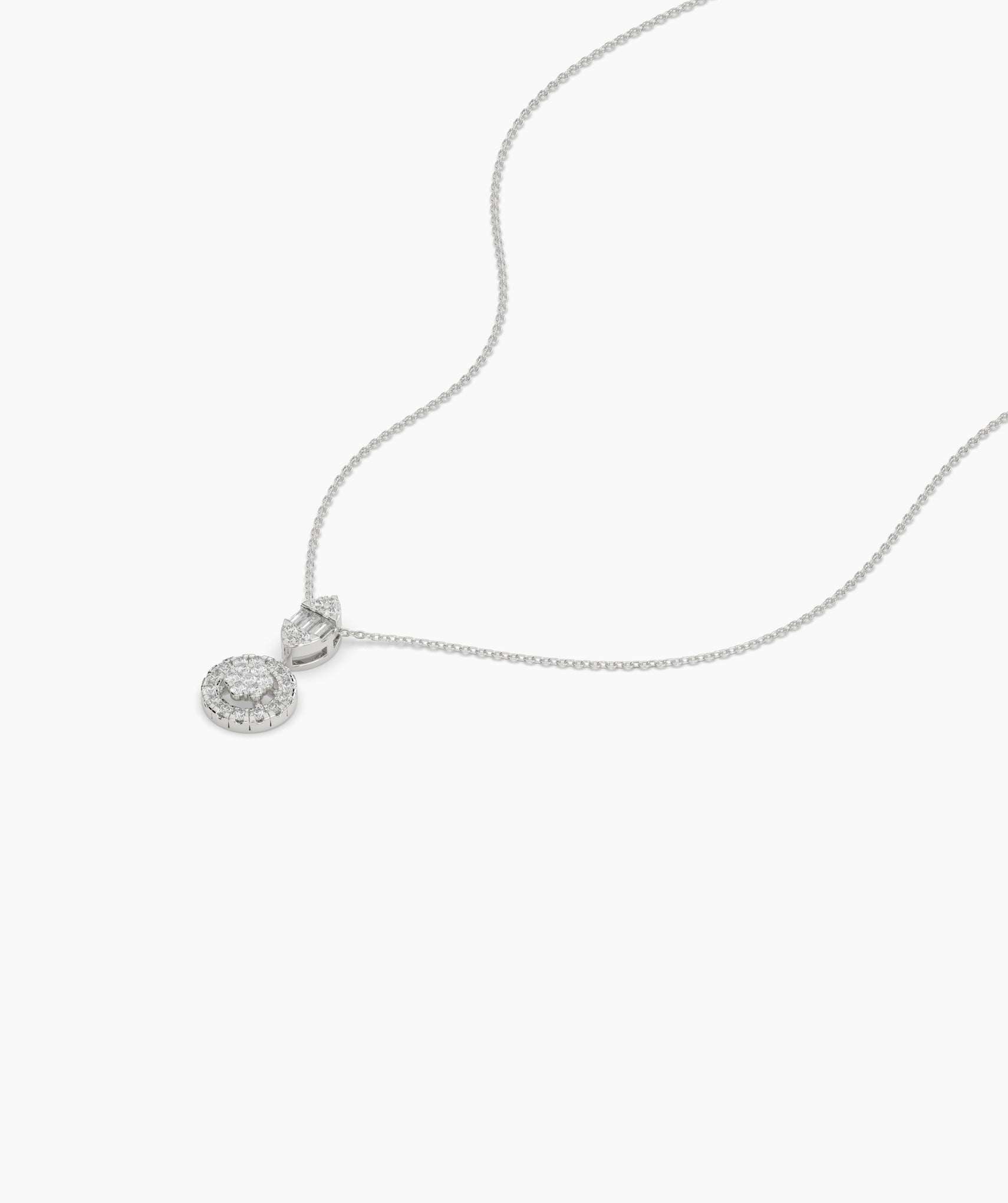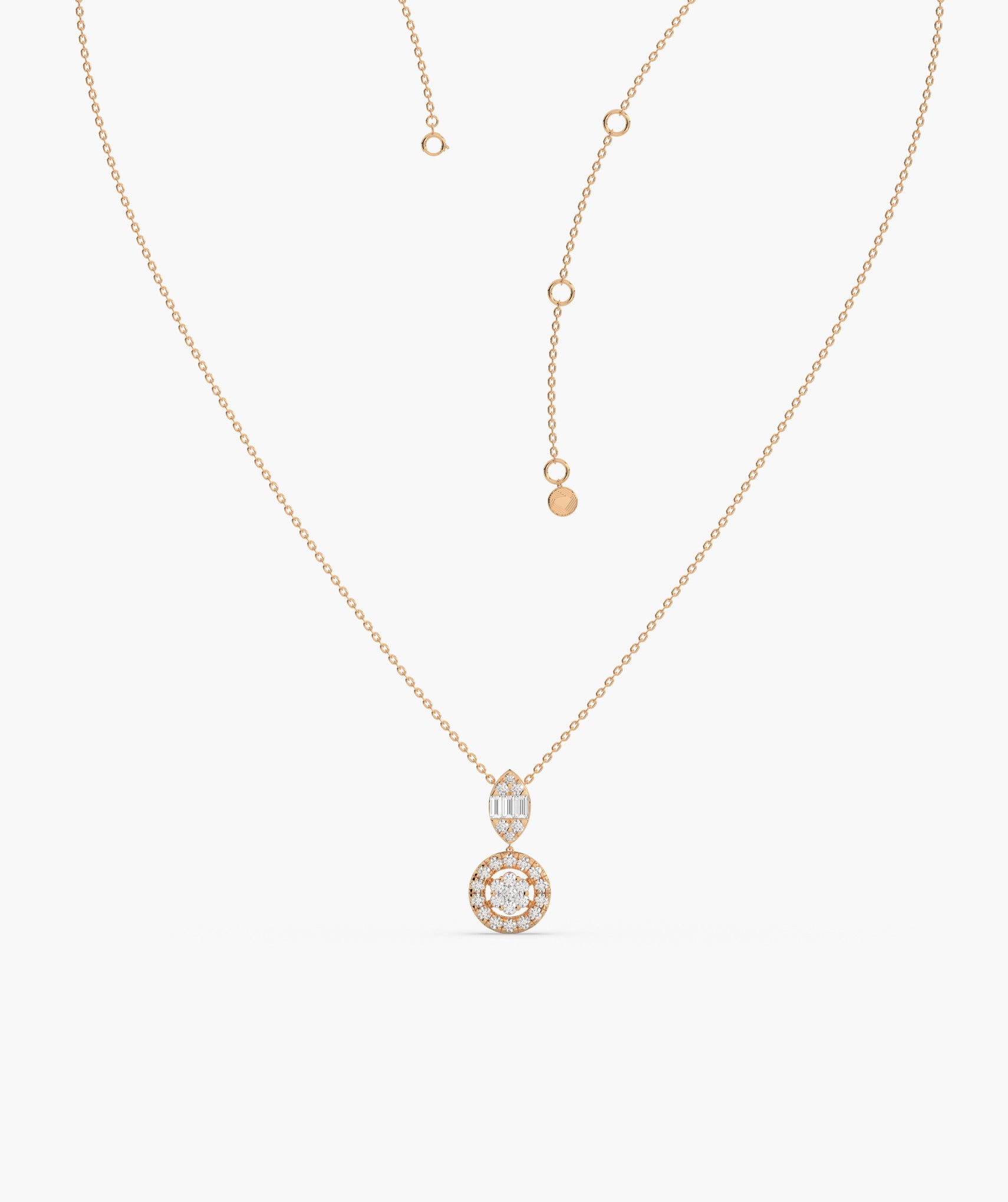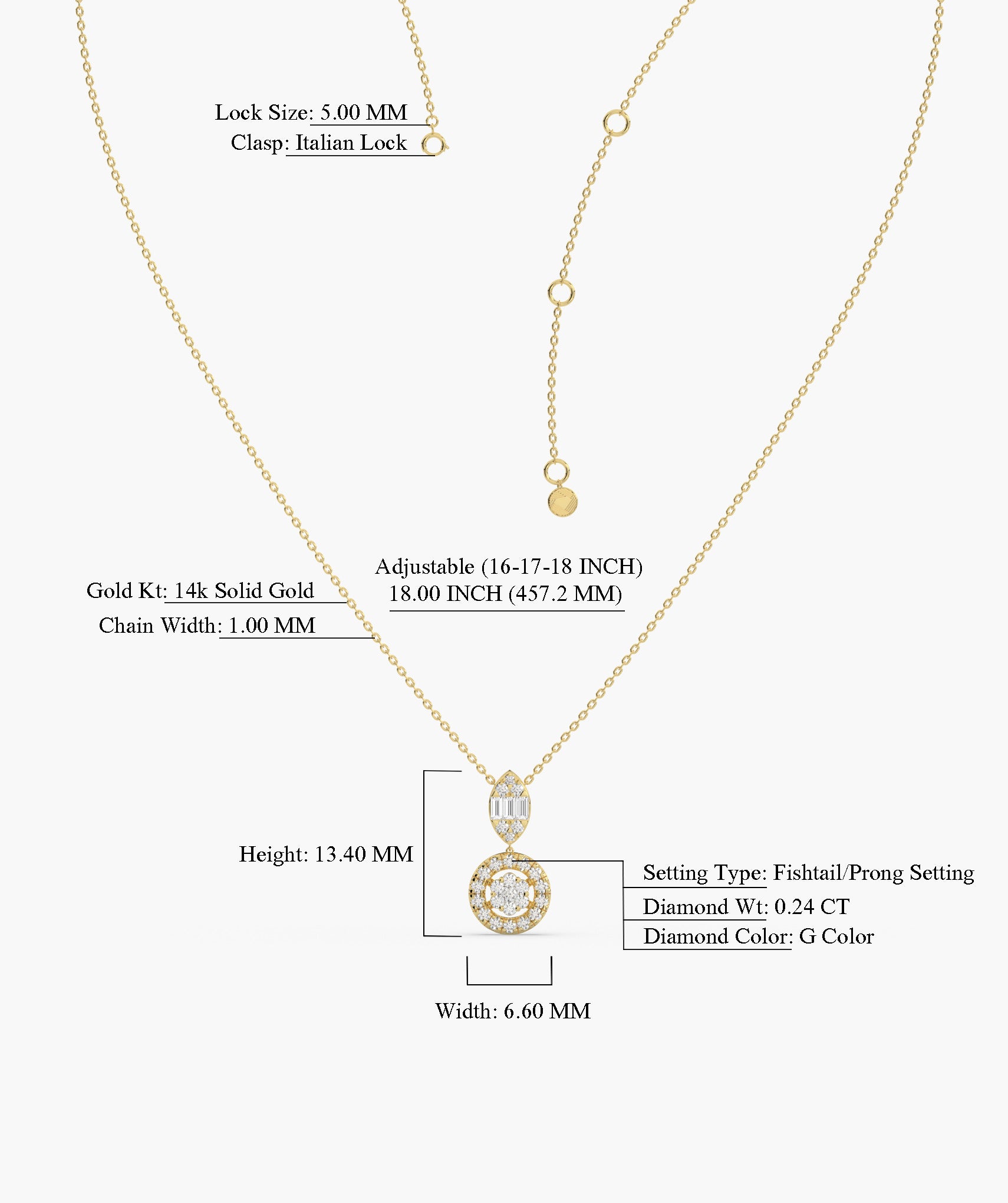 This 14K gold necklace features a distinctive pendant with a modern design, combining a unique blend of baguette and round-cut diamonds.