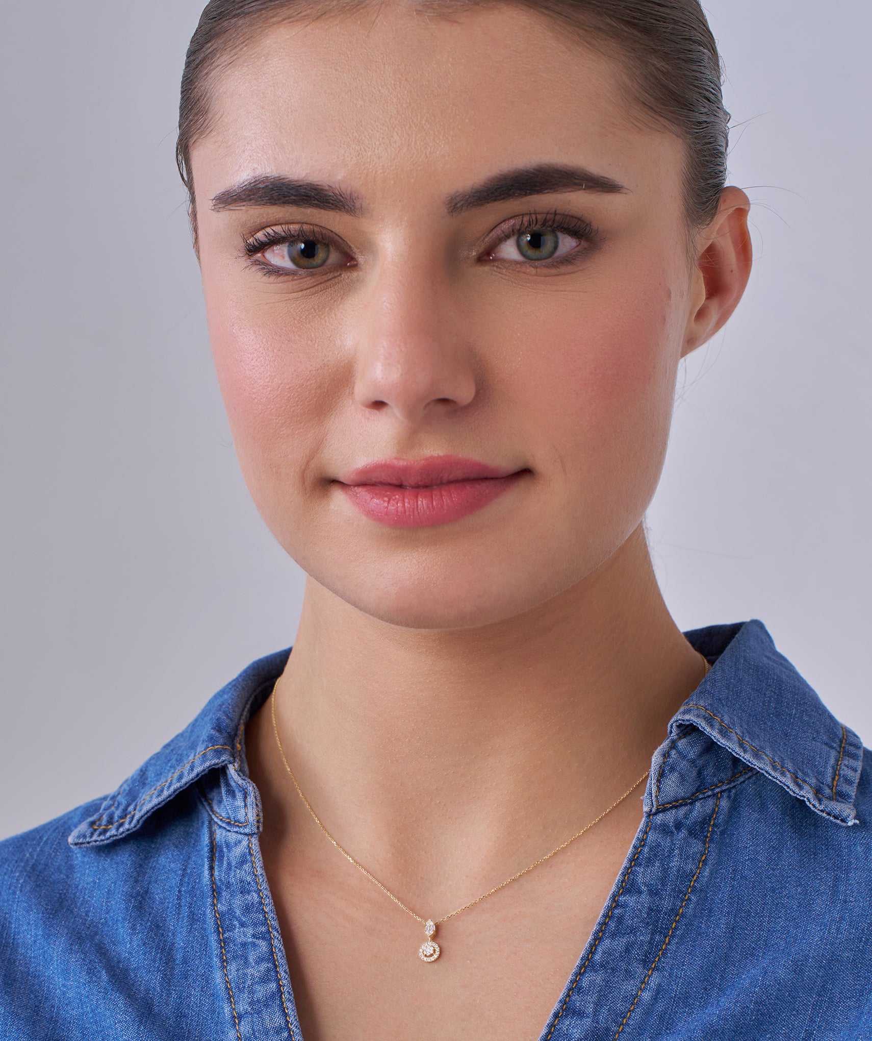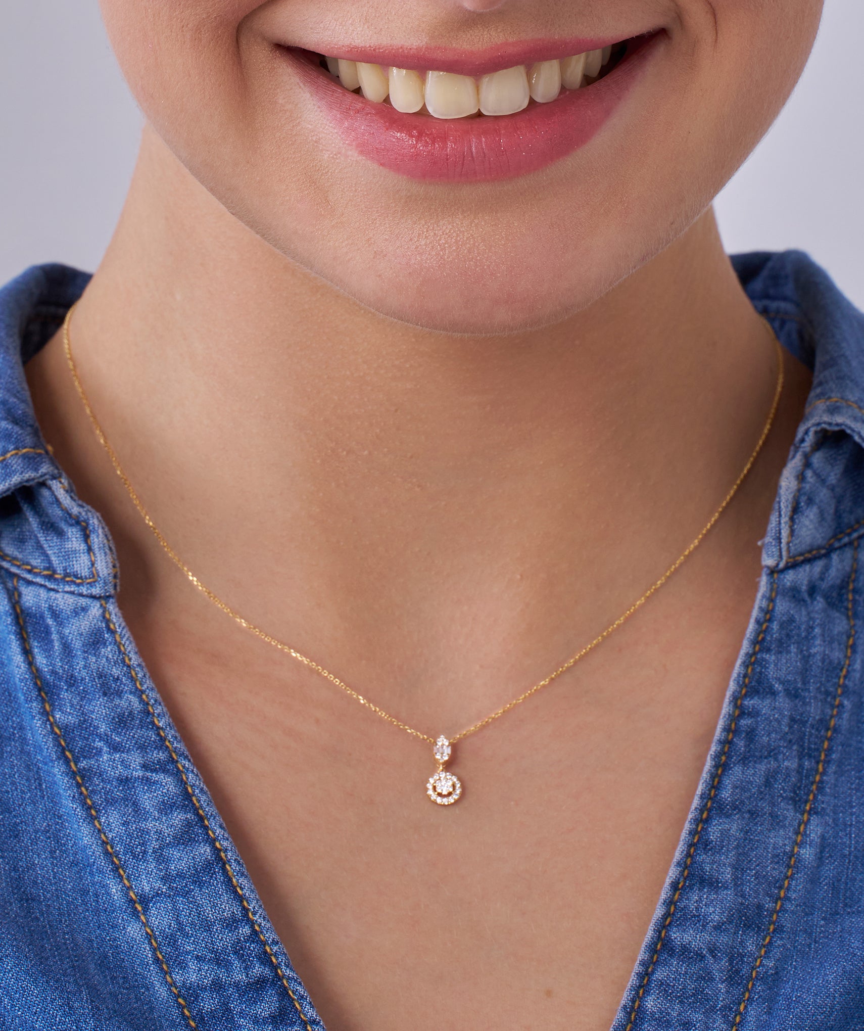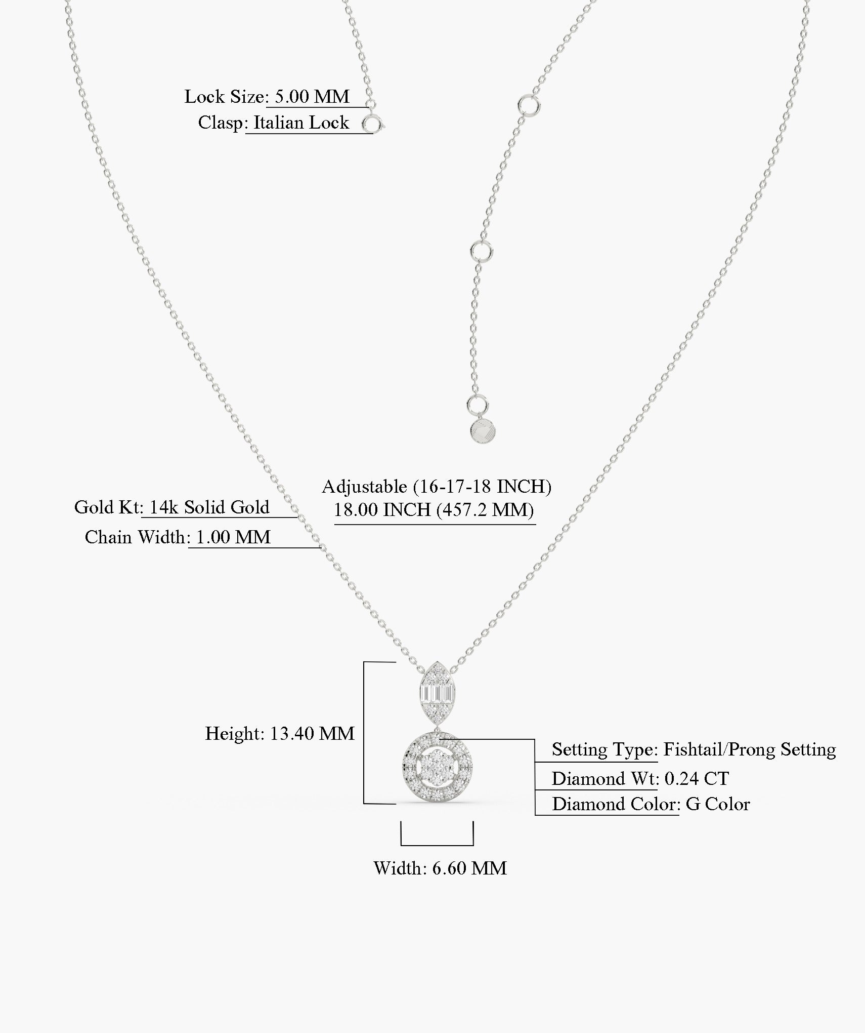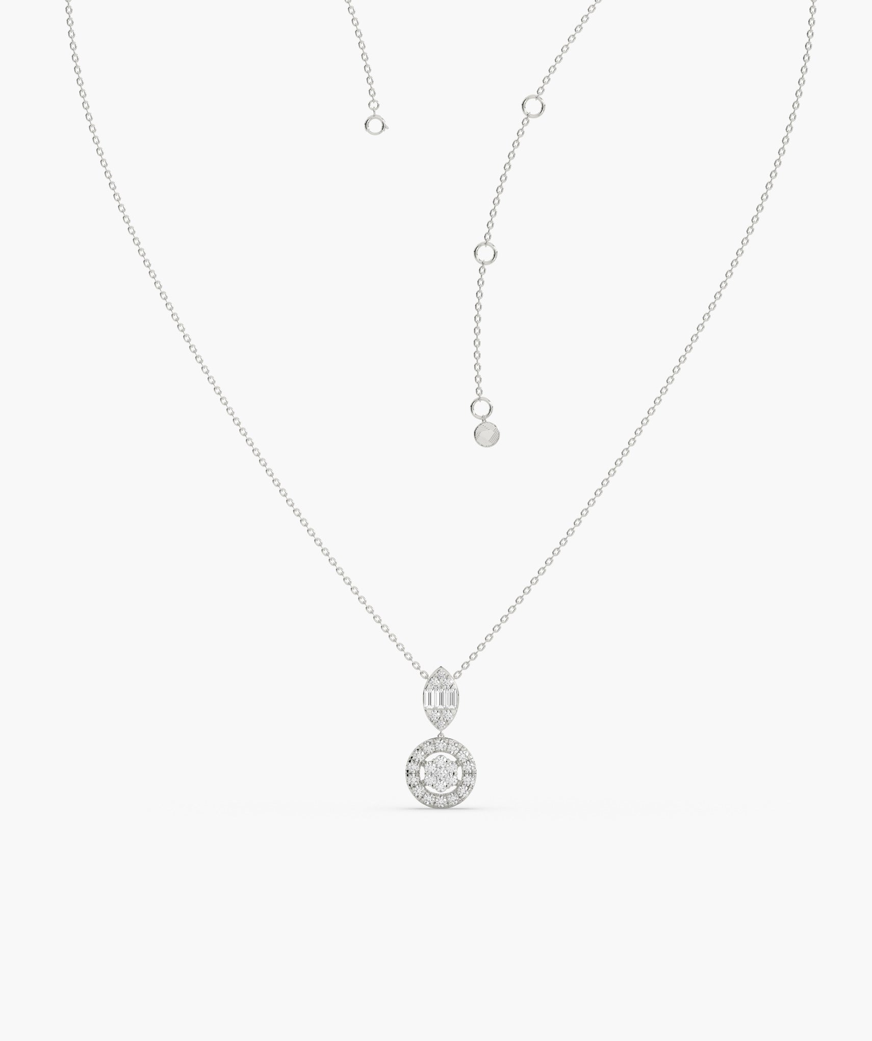 This 14K gold necklace features a distinctive pendant with a modern design, combining a unique blend of baguette and round-cut diamonds.