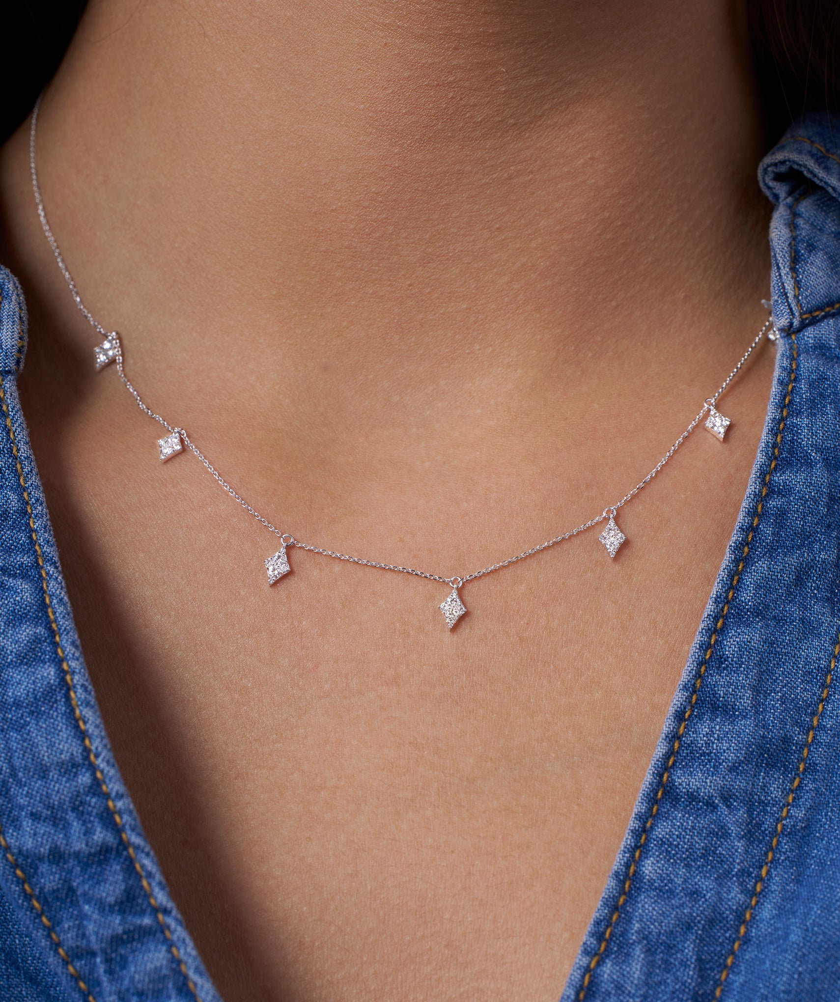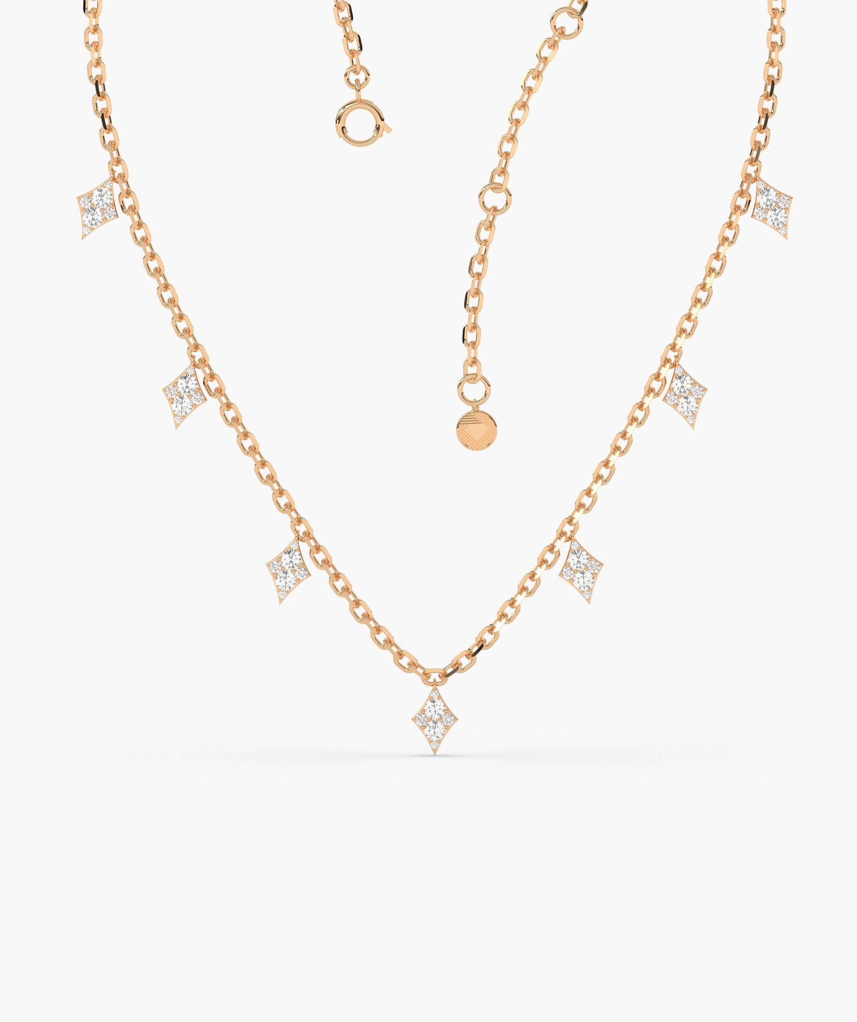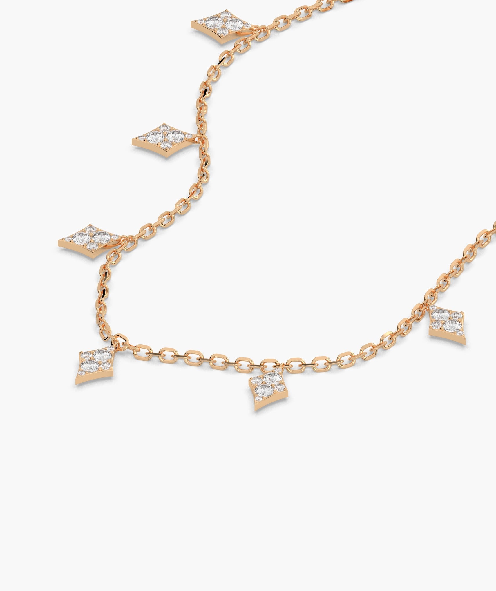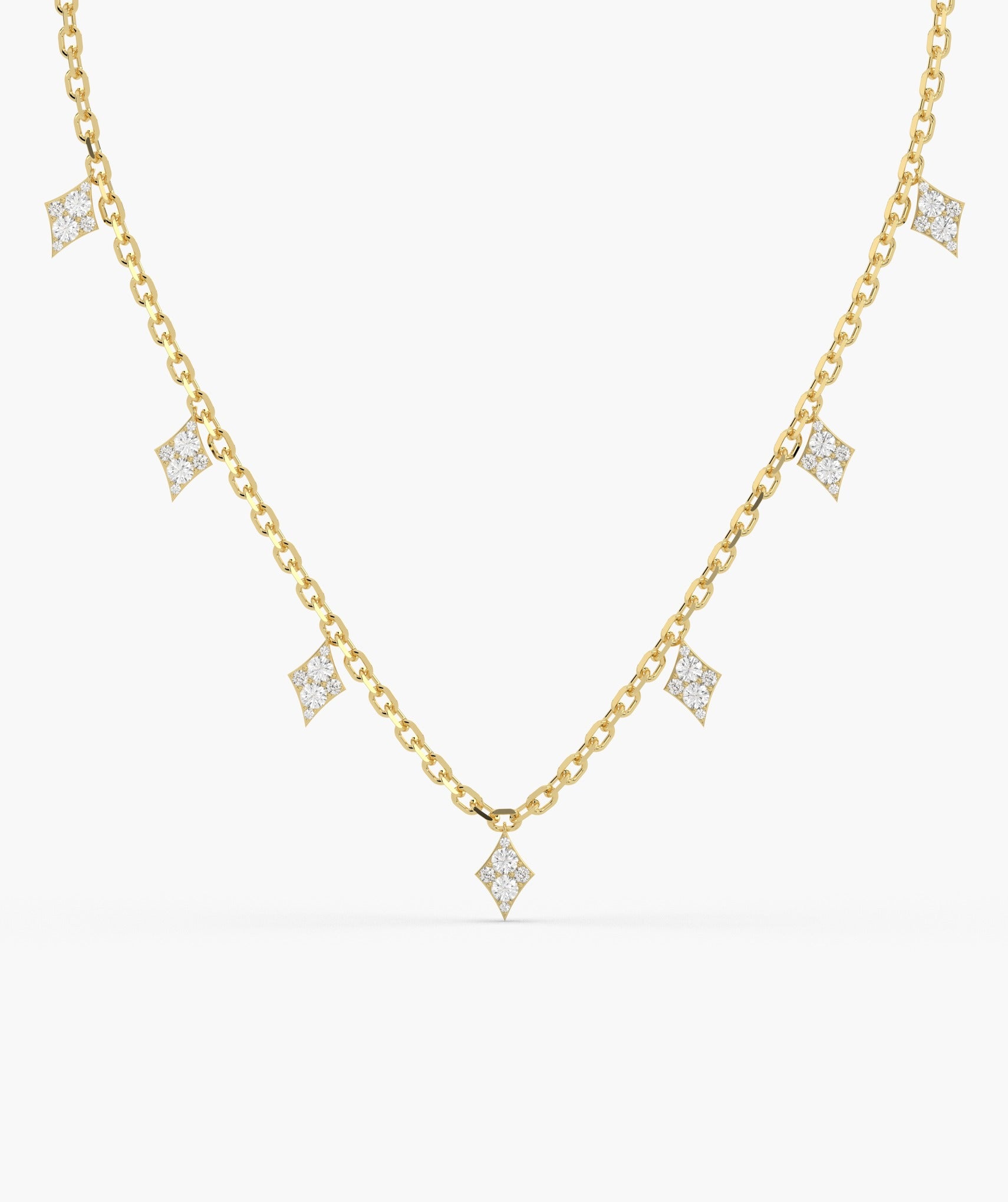 A chic 14K Gold gold chain adorned with crystal-encrusted diamond pendants, perfect for adding a geometric touch of glamour to any outfit.