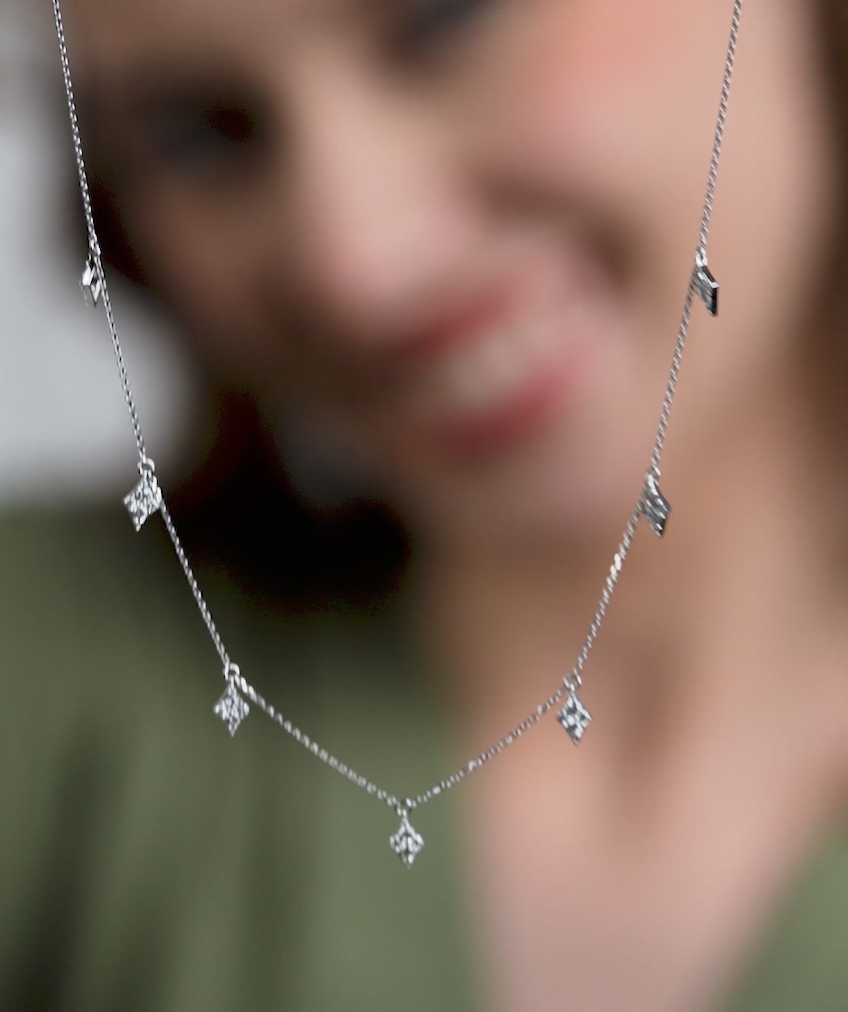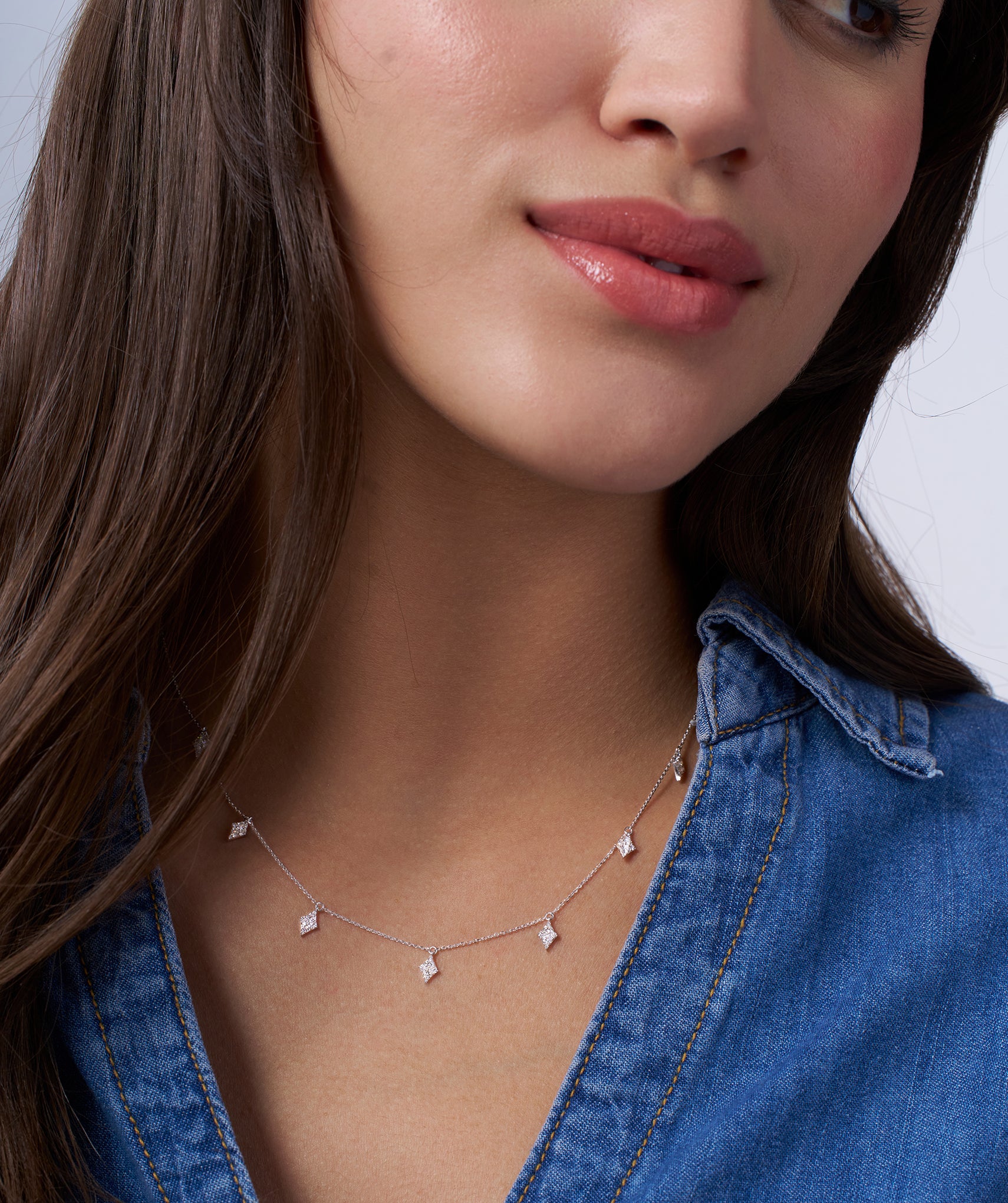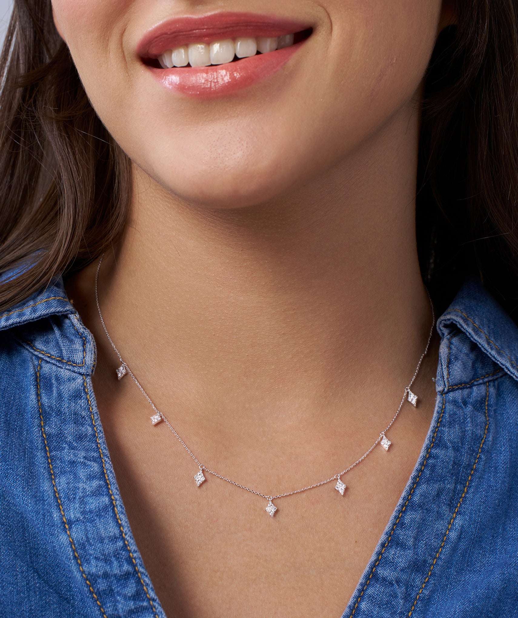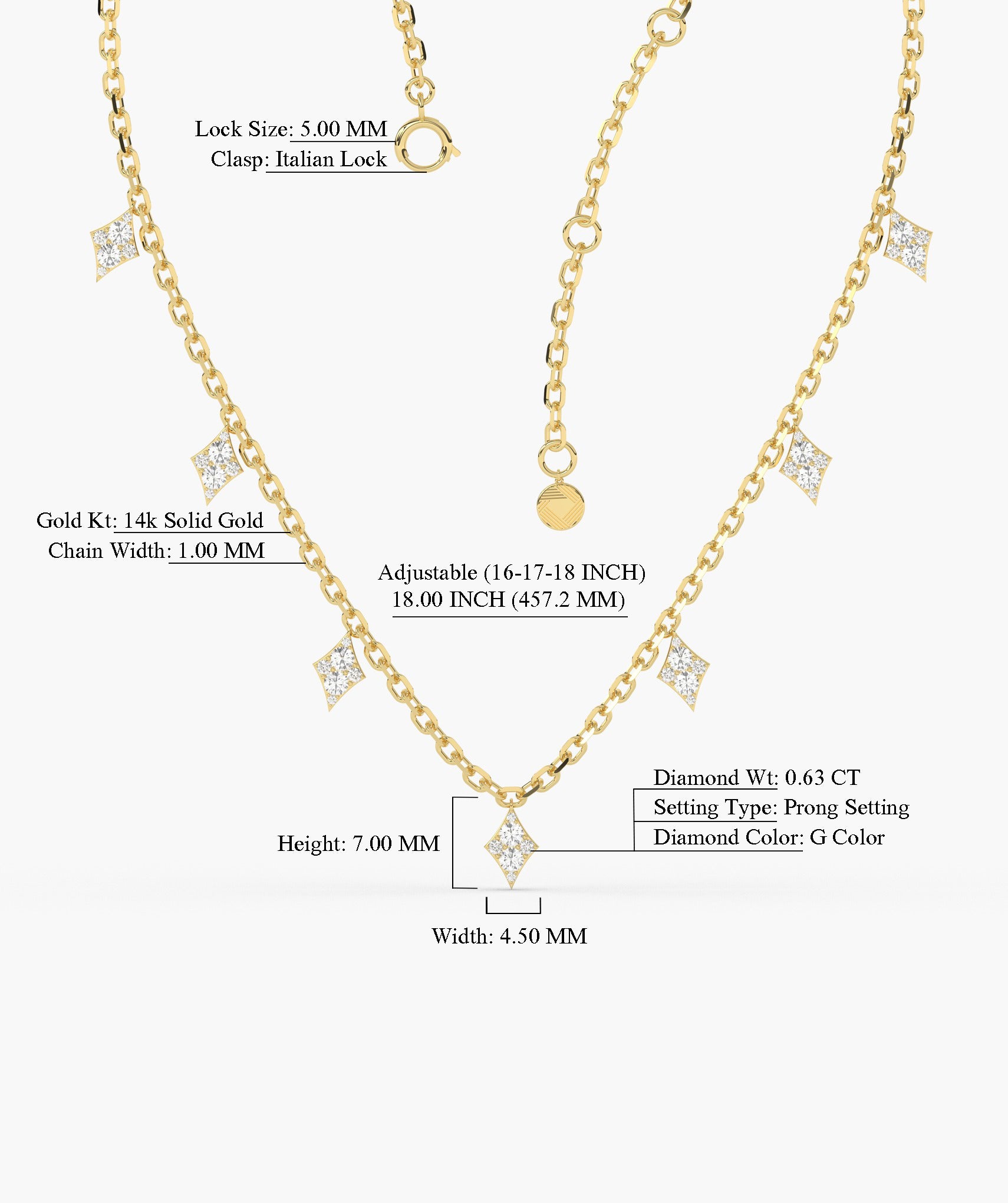 A chic 14K Gold gold chain adorned with crystal-encrusted diamond pendants, perfect for adding a geometric touch of glamour to any outfit.