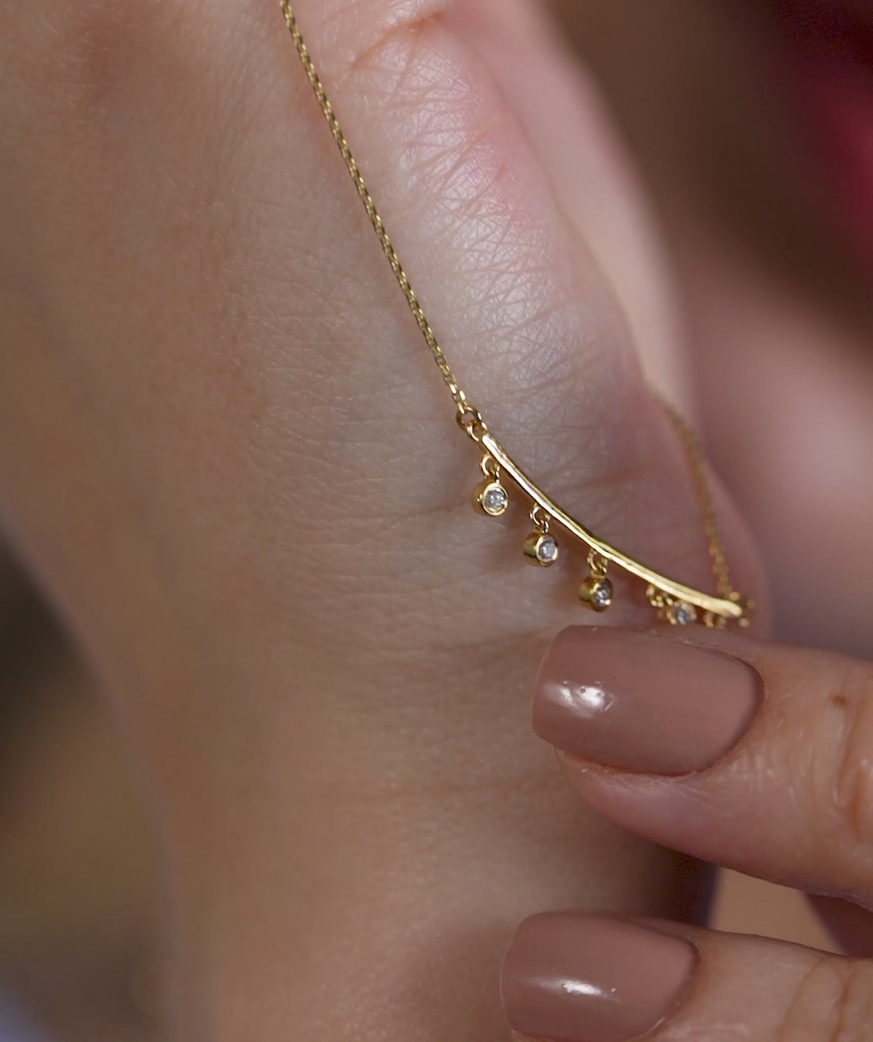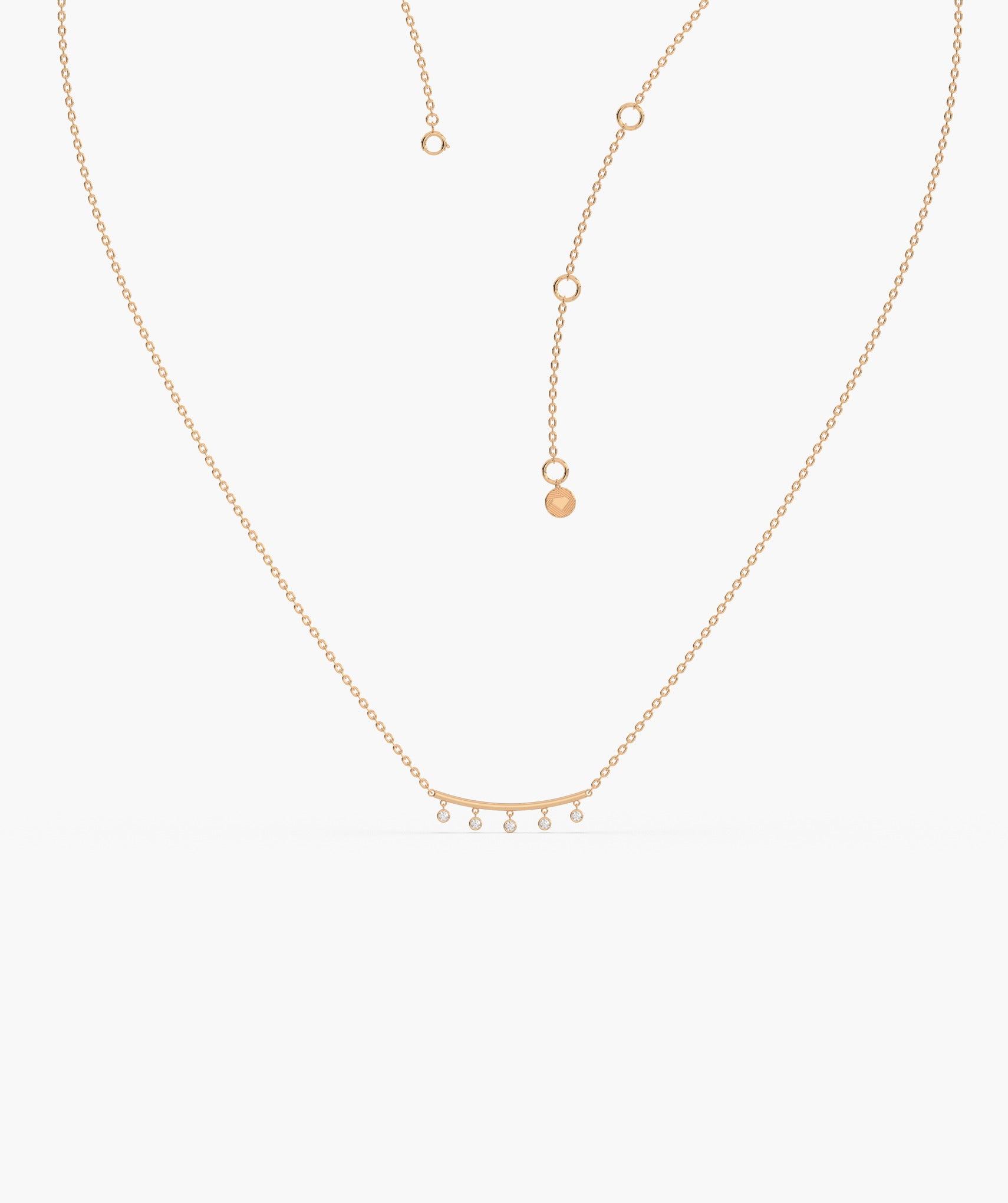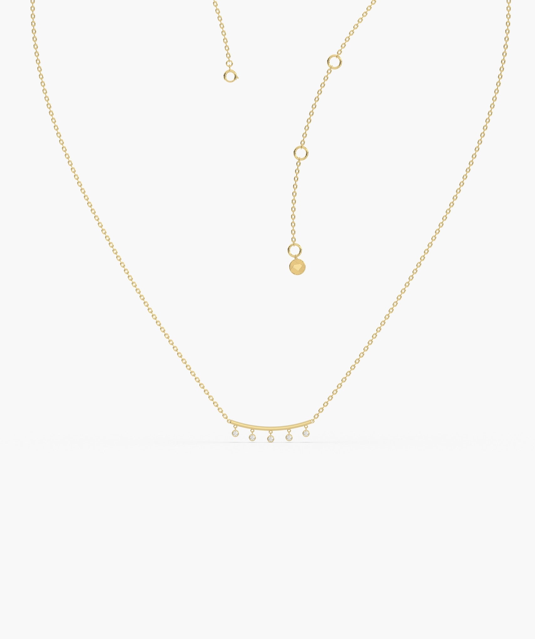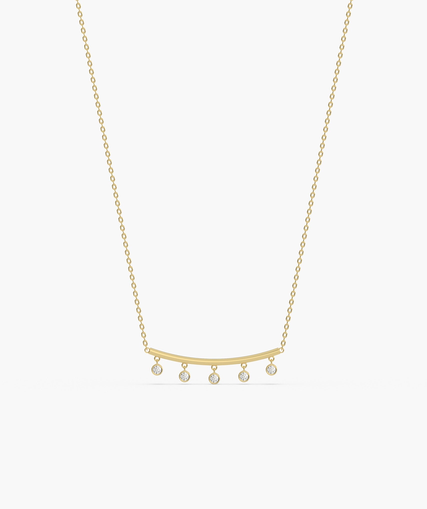 This 14K solid gold necklace elegantly suspends sparkling diamond charms on a sleek golden bar, perfect for adding a touch of sophistication to any outfit.