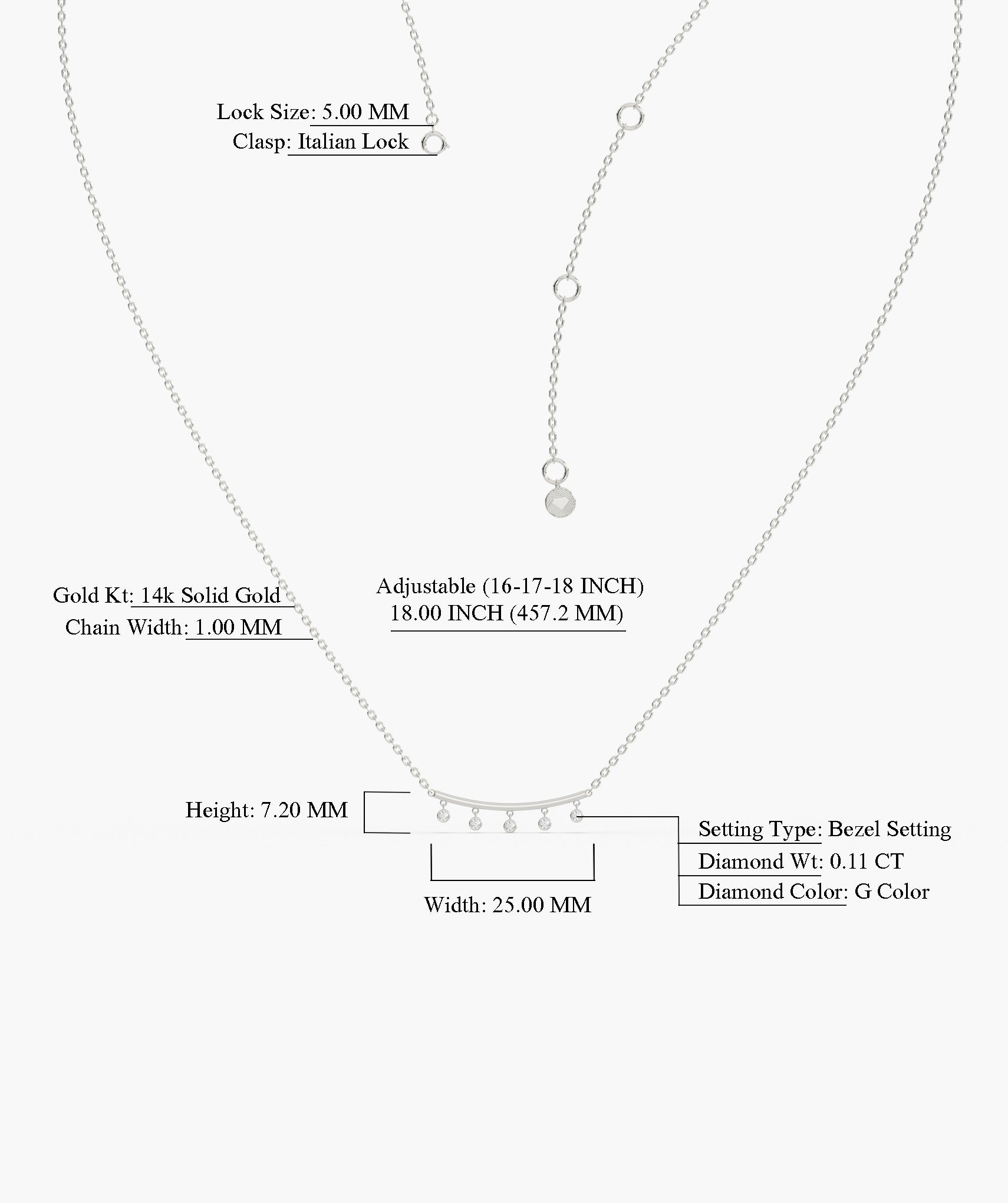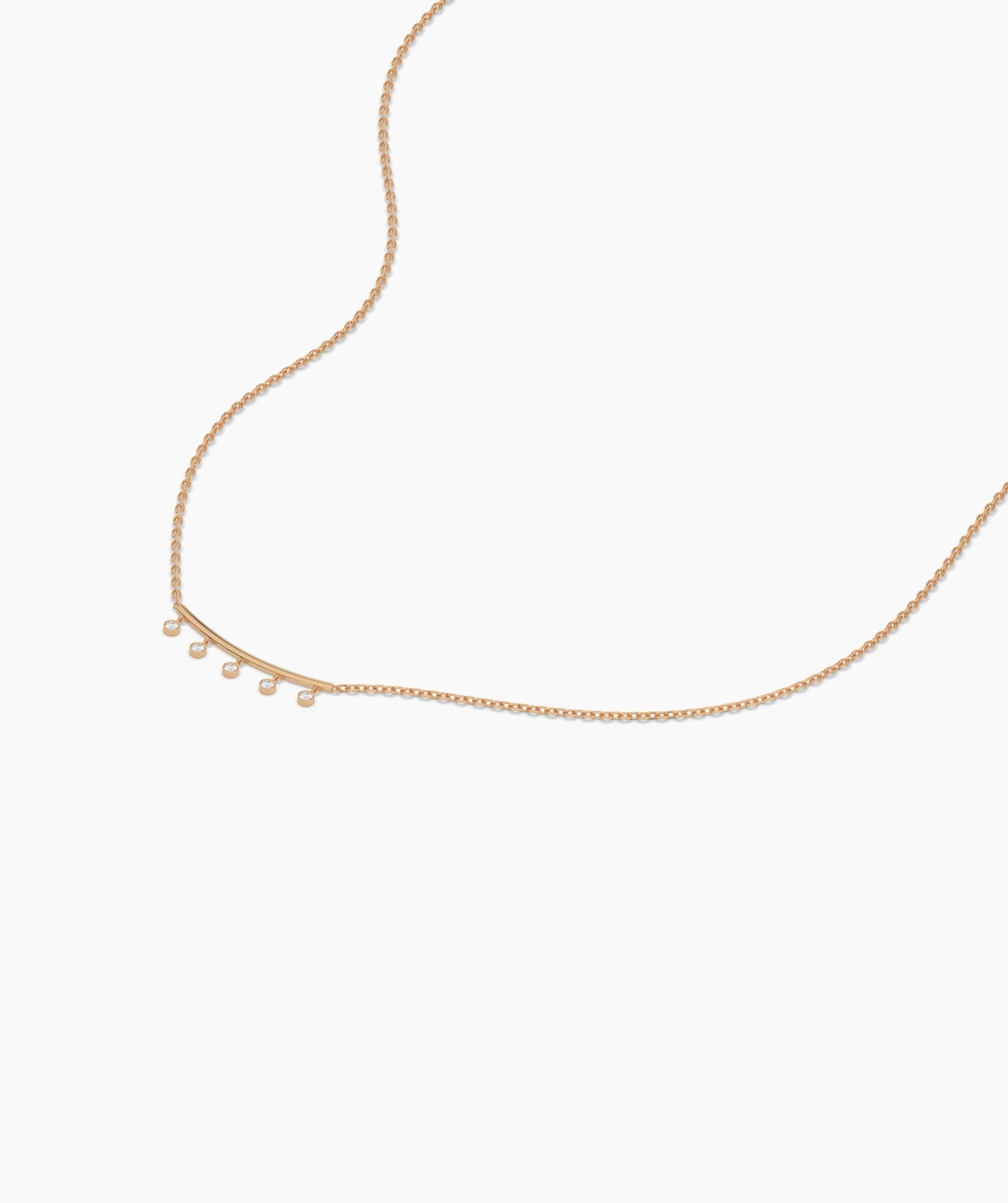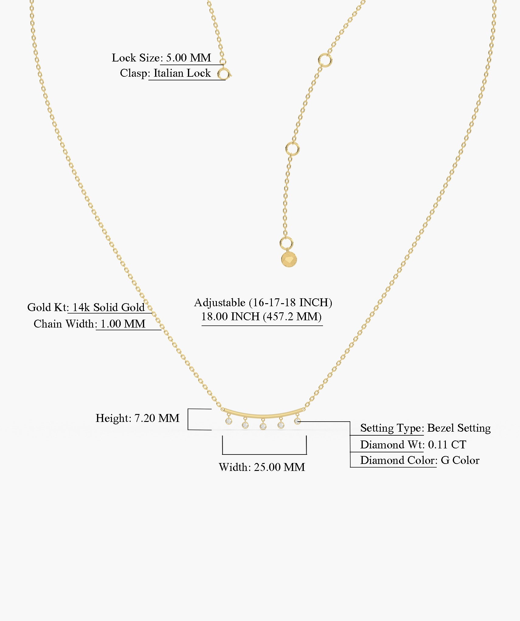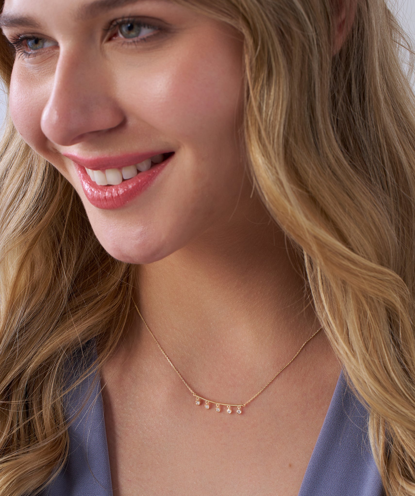 This 14K solid gold necklace elegantly suspends sparkling diamond charms on a sleek golden bar, perfect for adding a touch of sophistication to any outfit.