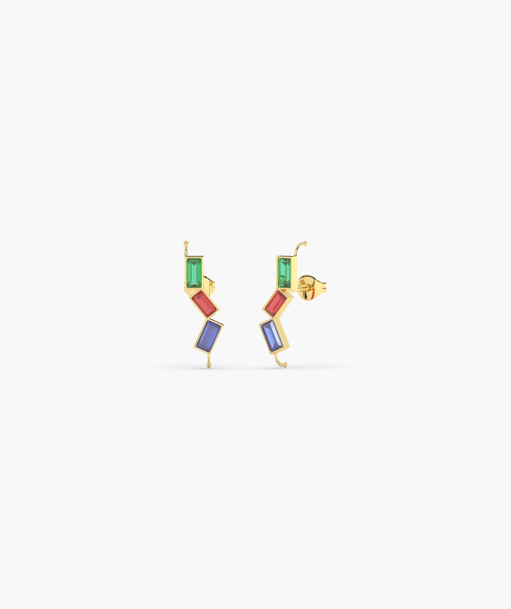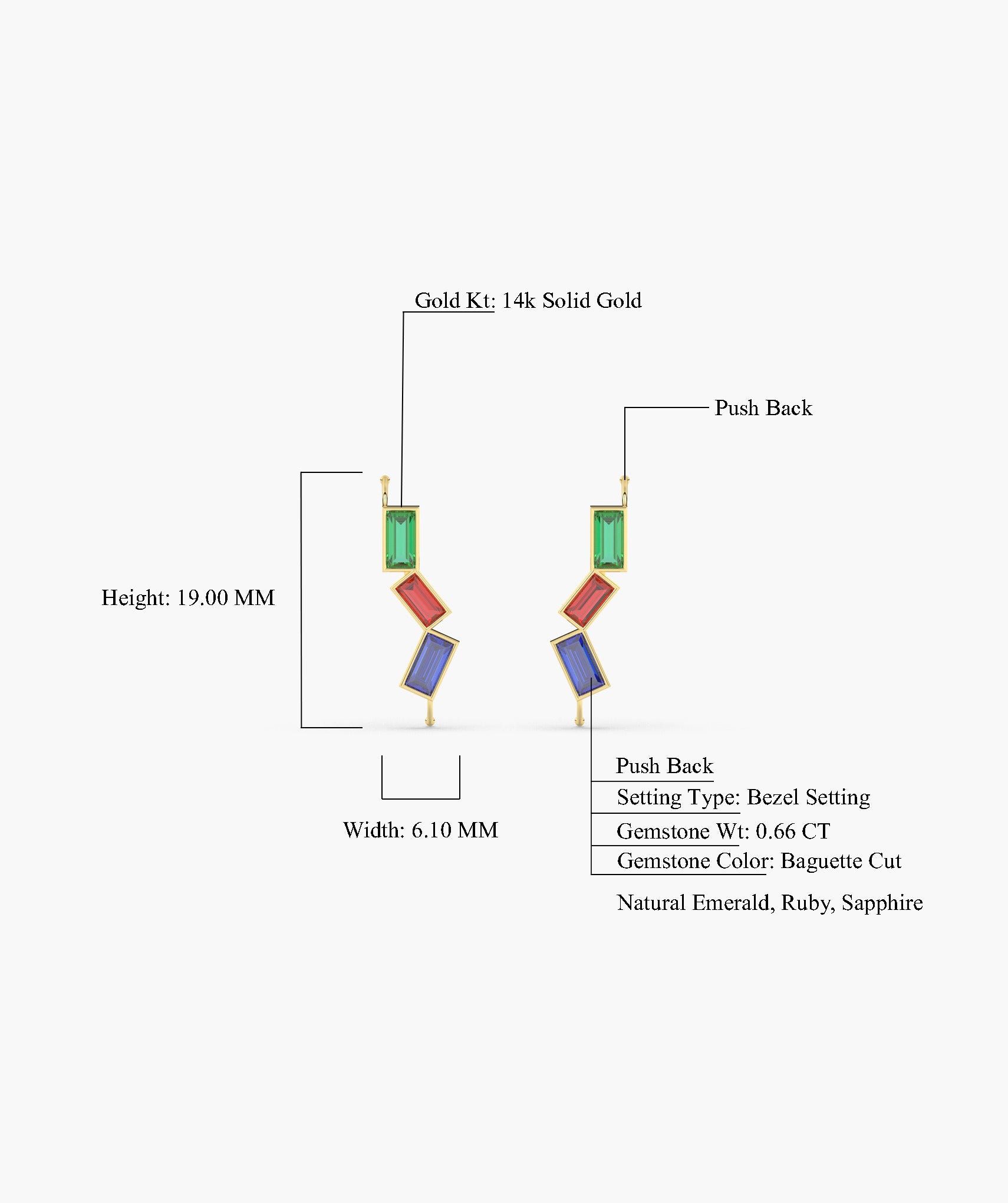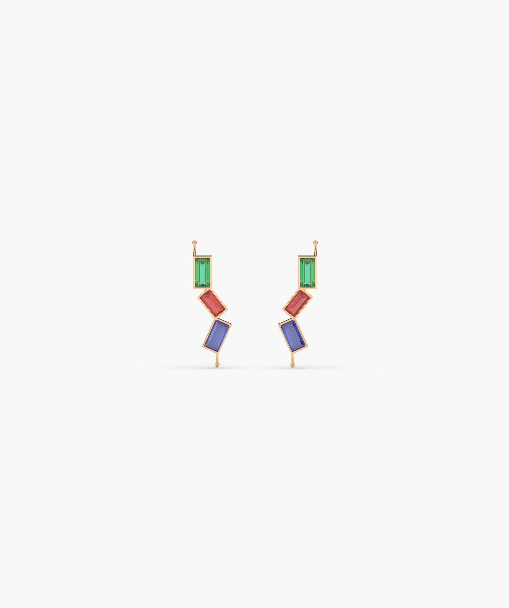 Elevate your style with these 14K solid gold earrings, designed with a unique sequence of multicolored gemstone inlays.
