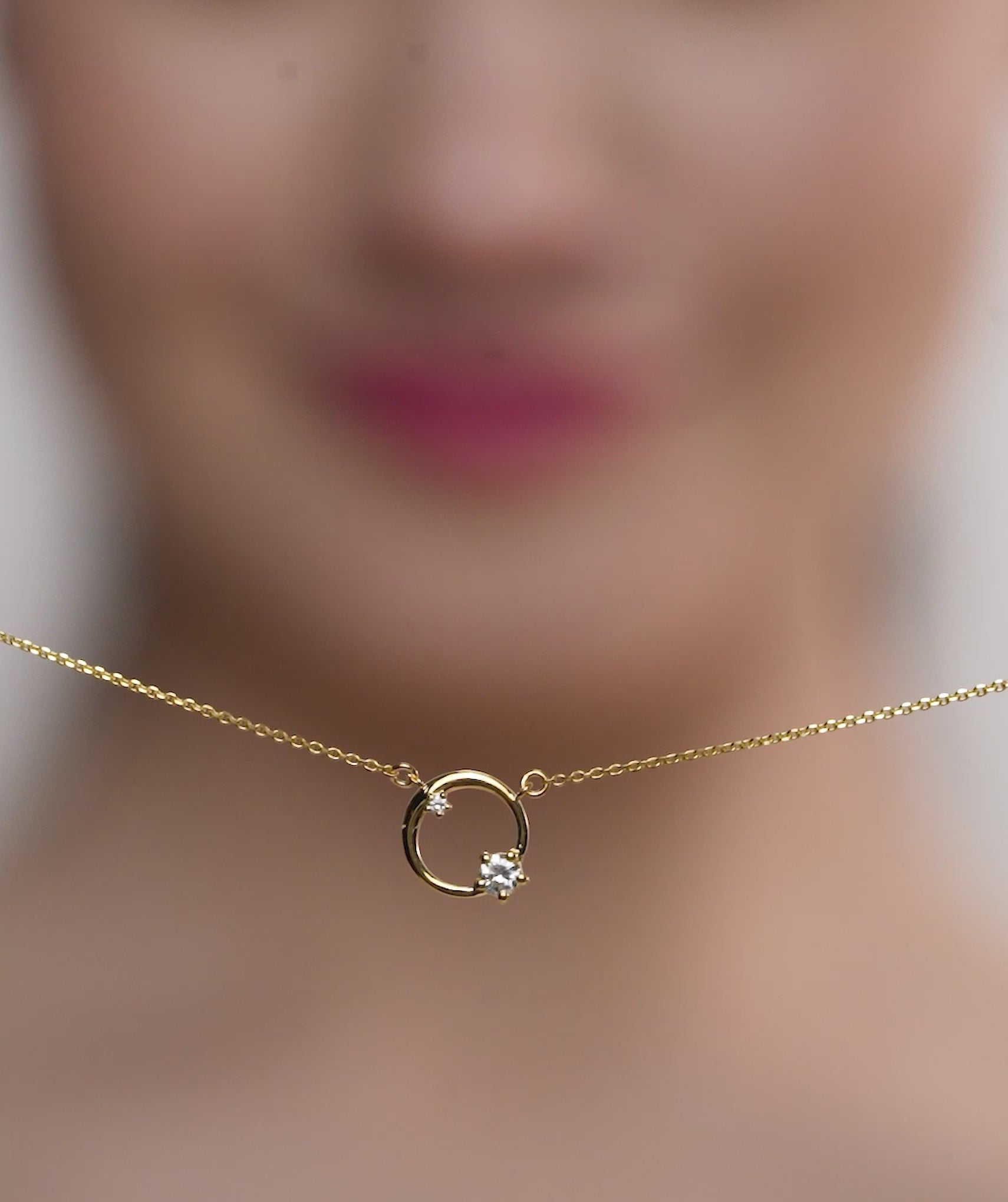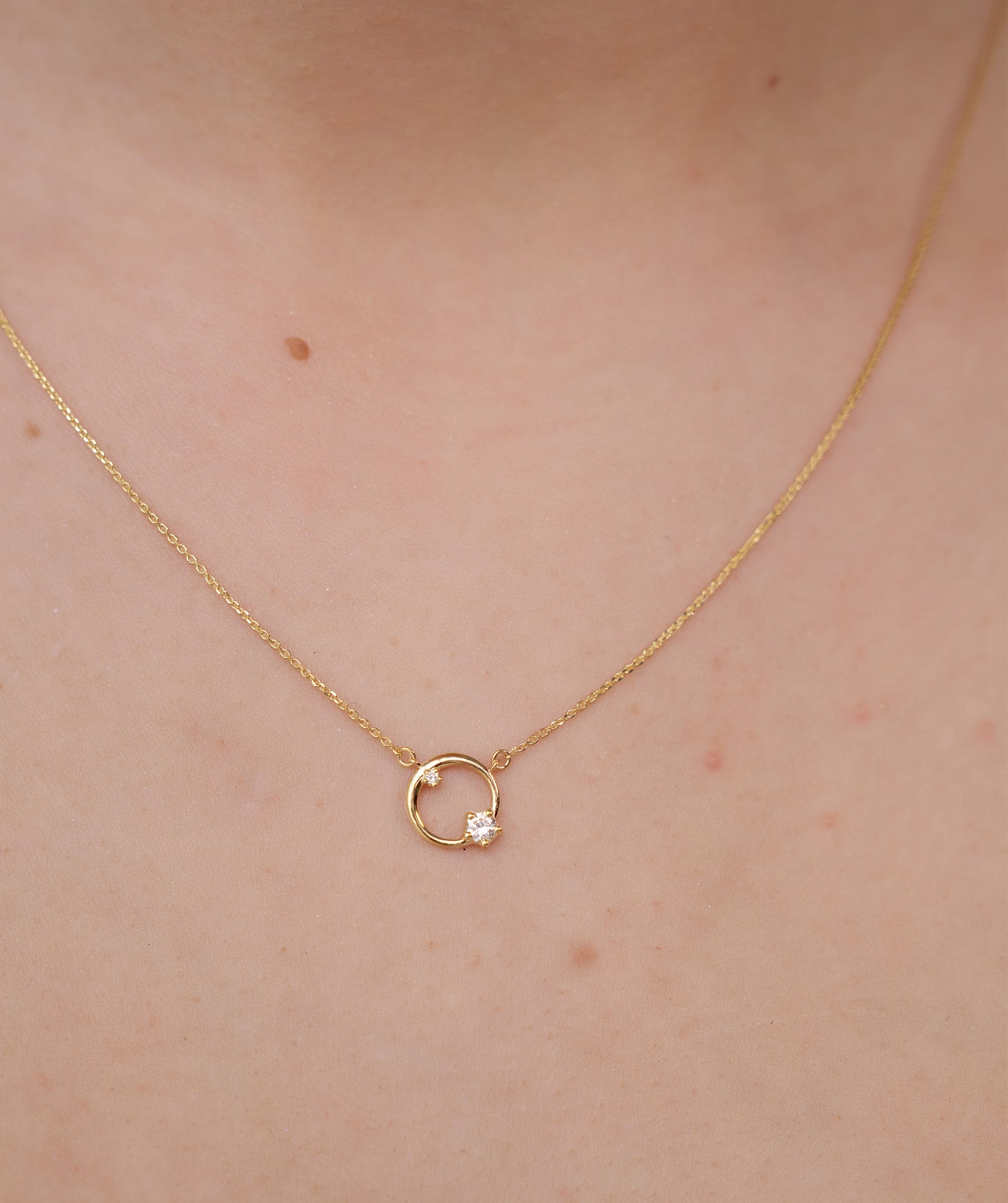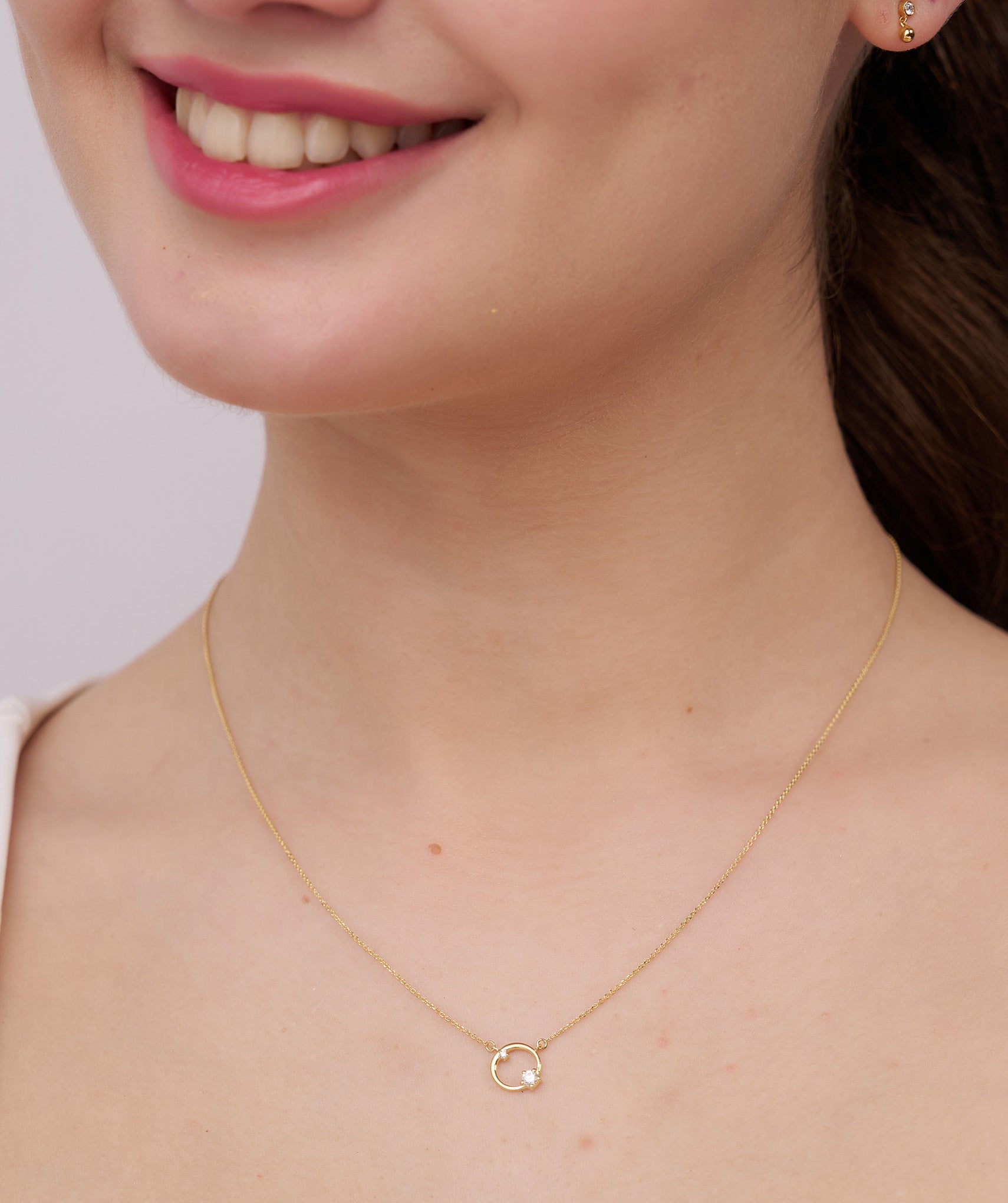 This minimalist gold circle pendant with sparkling diamonds is perfect for everyday elegance or a thoughtful gift.