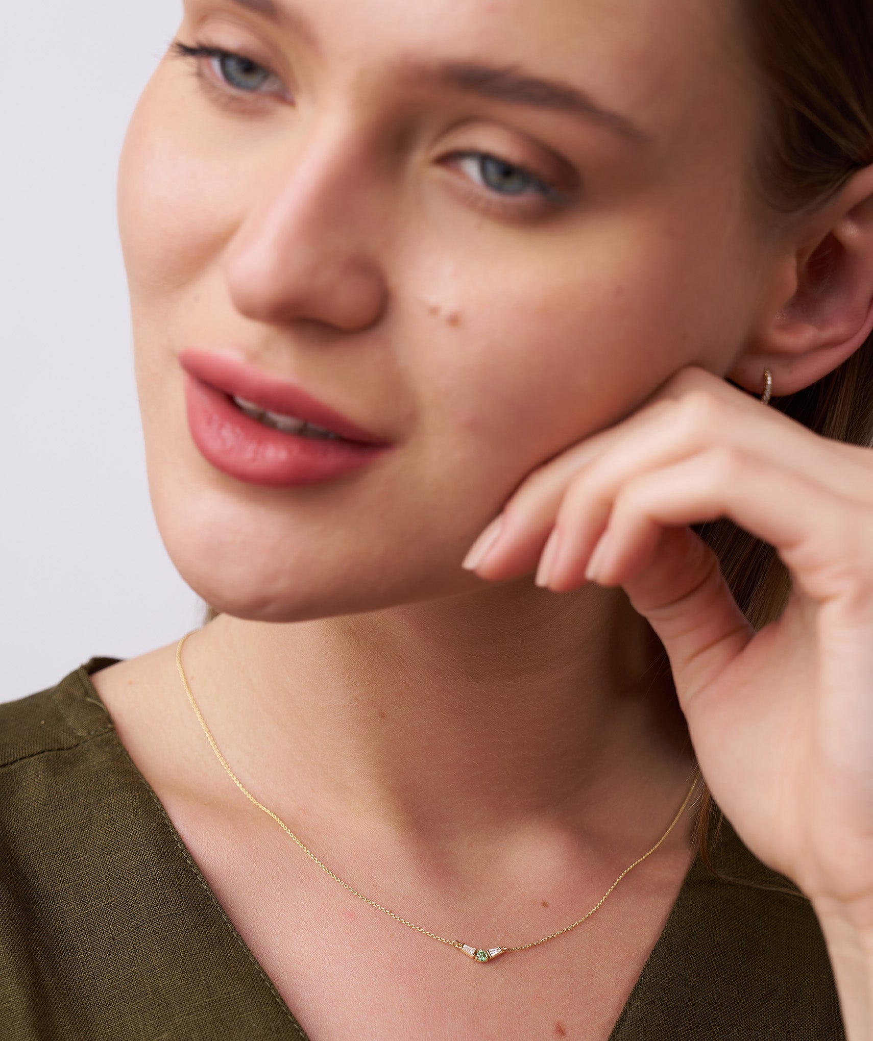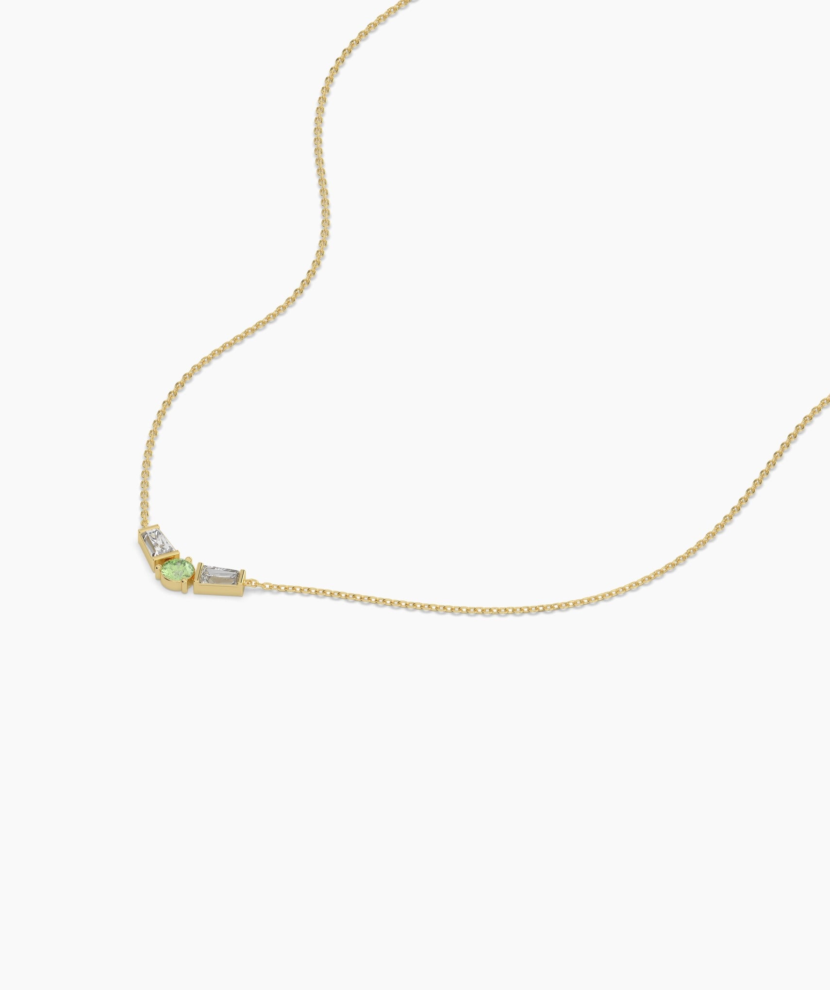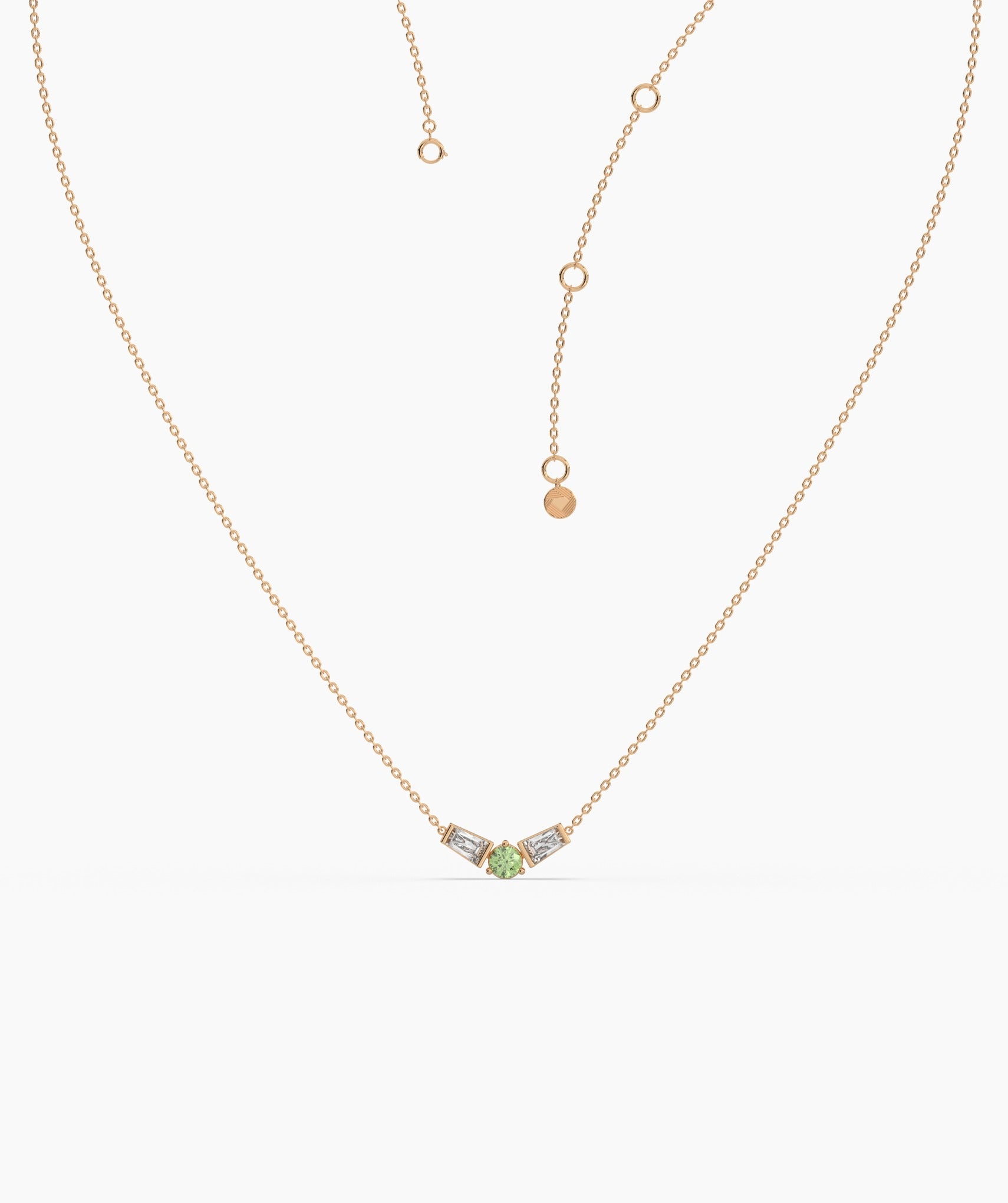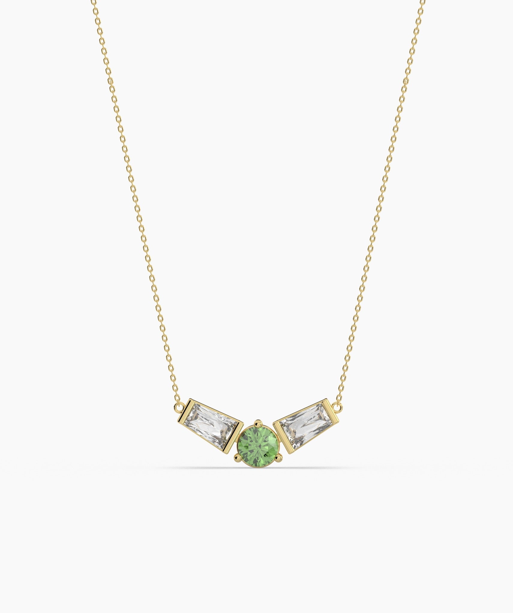 Elevate your style with this modern 14K gold necklace, featuring a bright green gem flanked by sleek, angular accents.