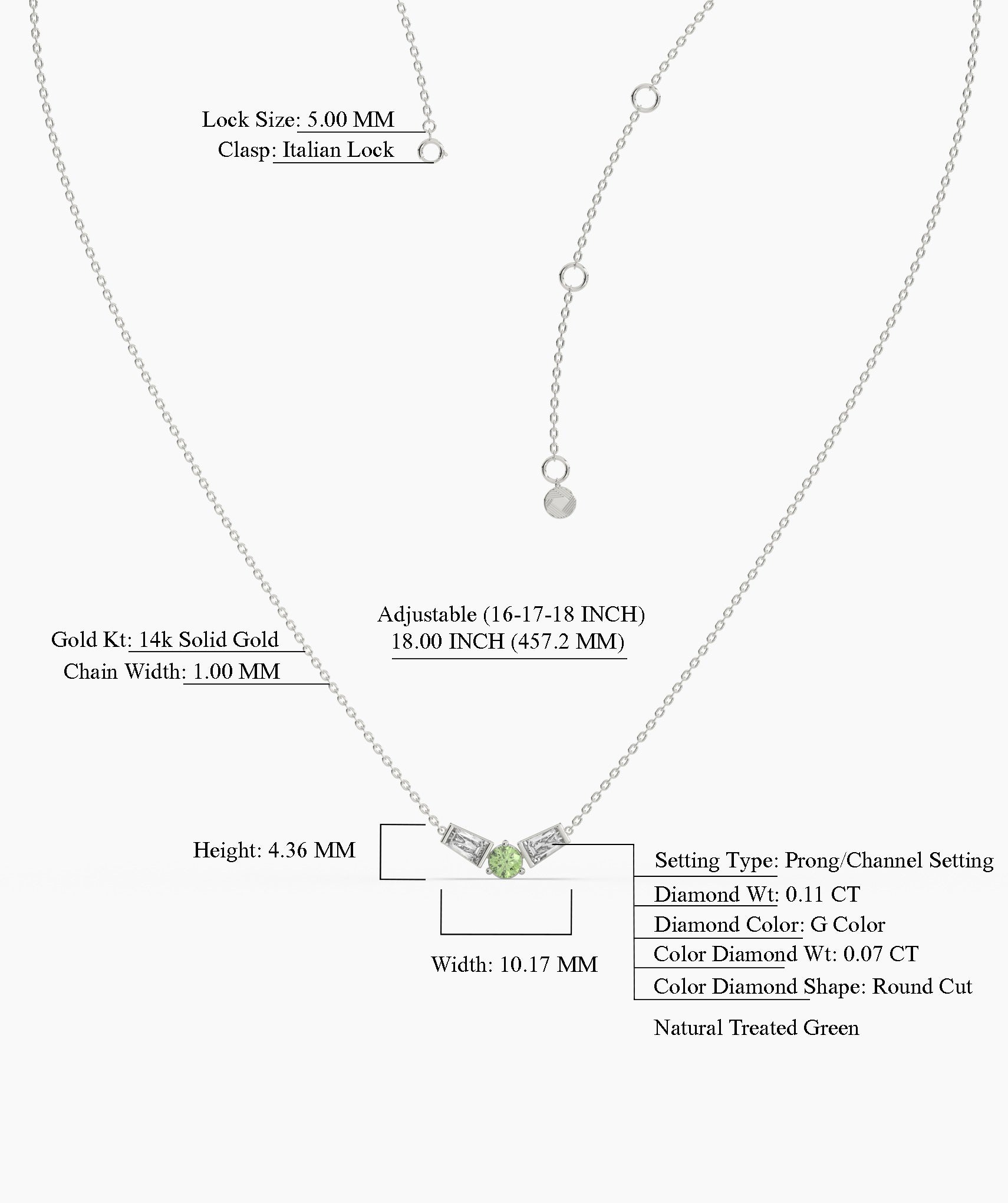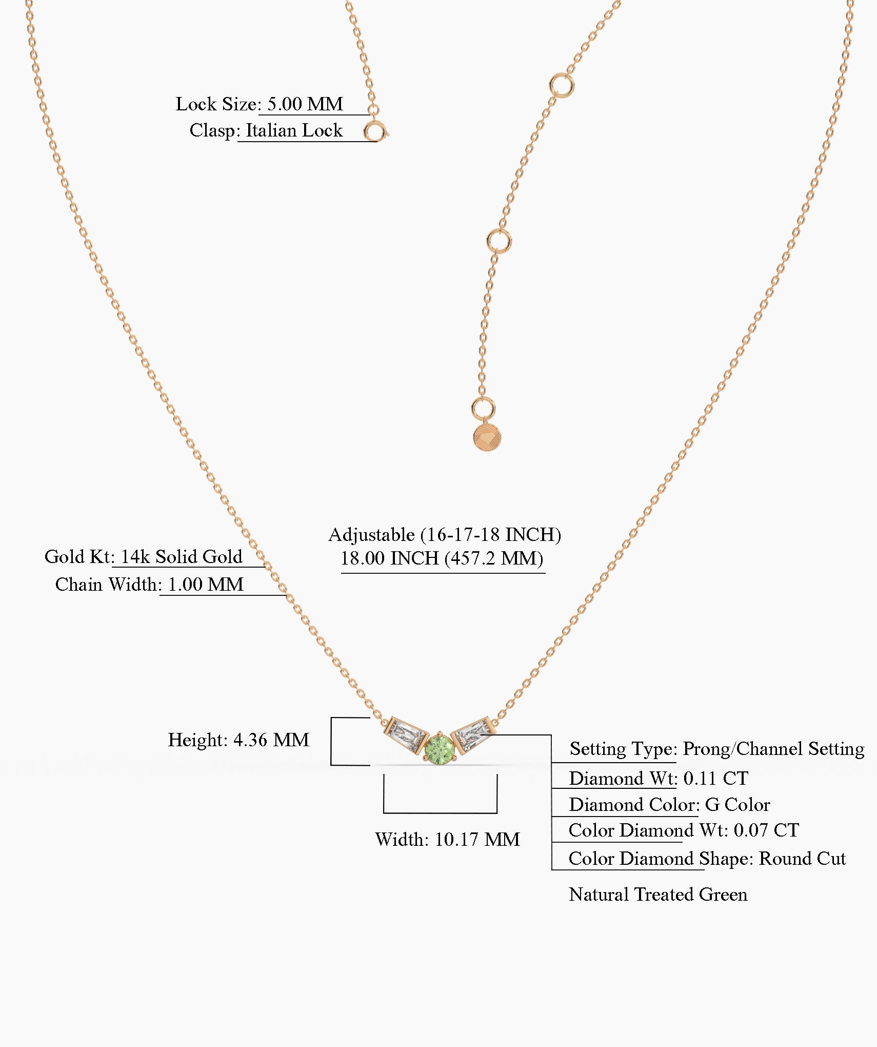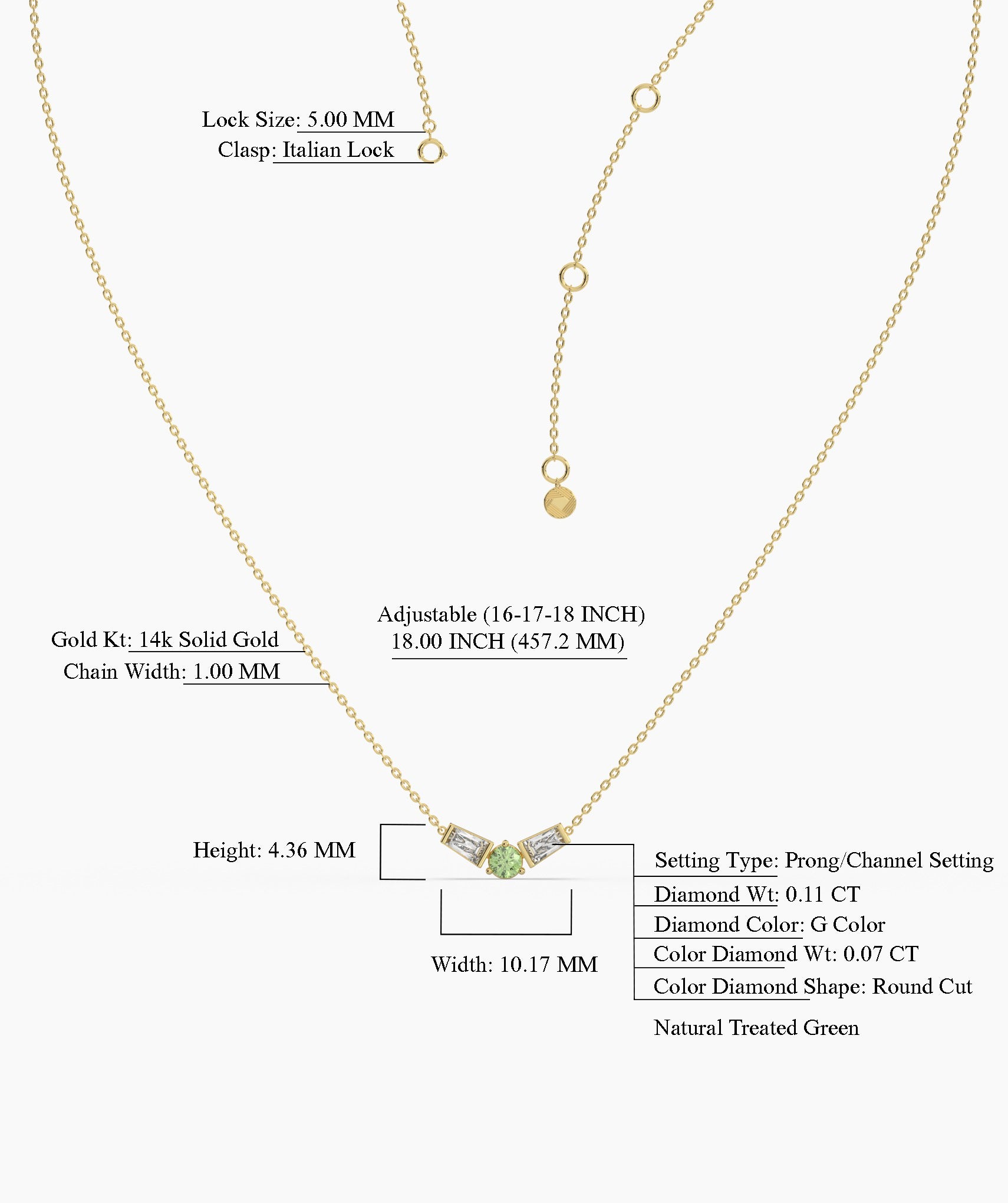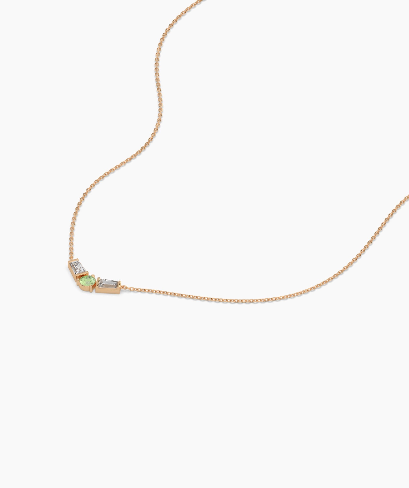 Elevate your style with this modern 14K gold necklace, featuring a bright green gem flanked by sleek, angular accents.